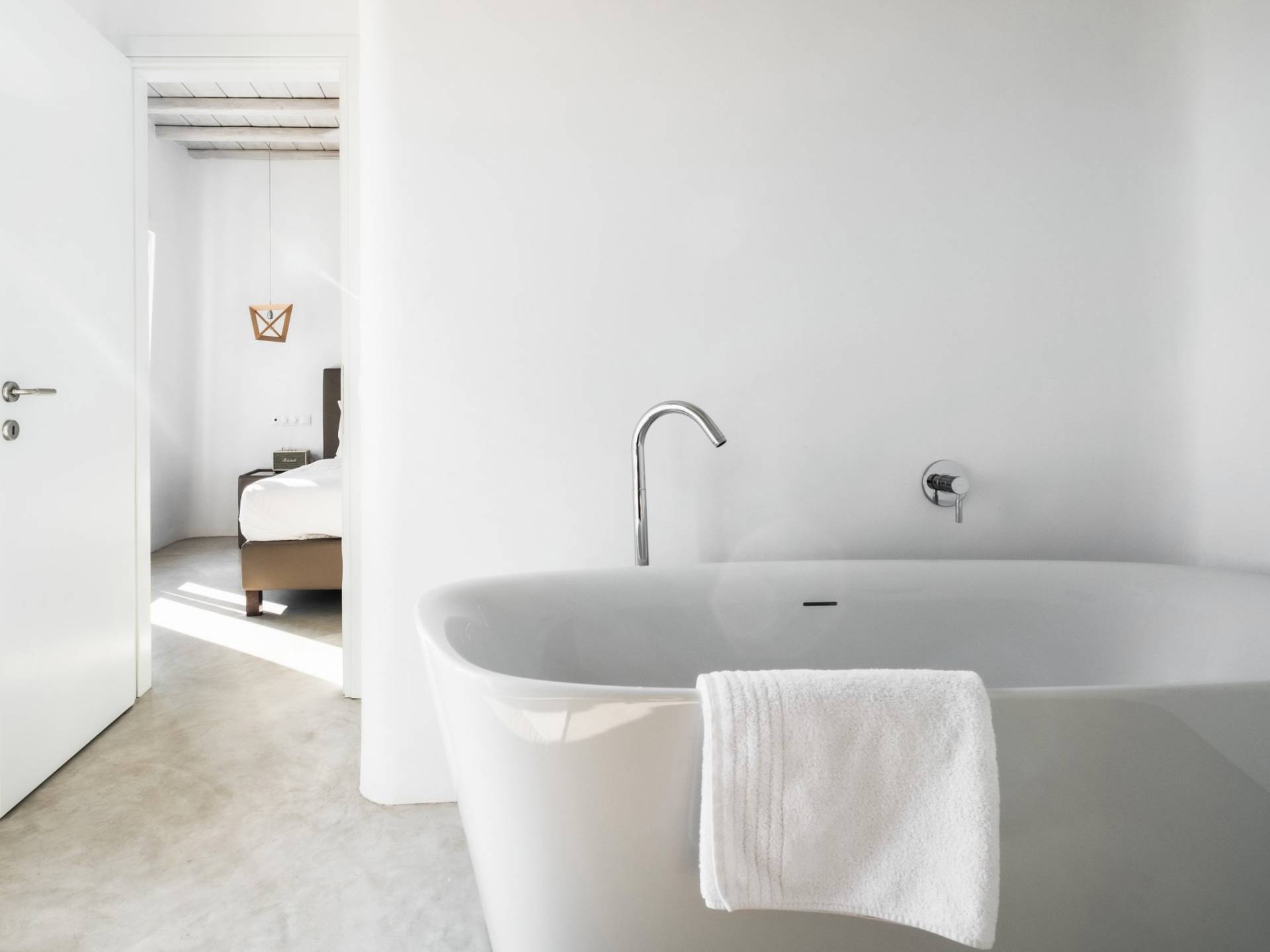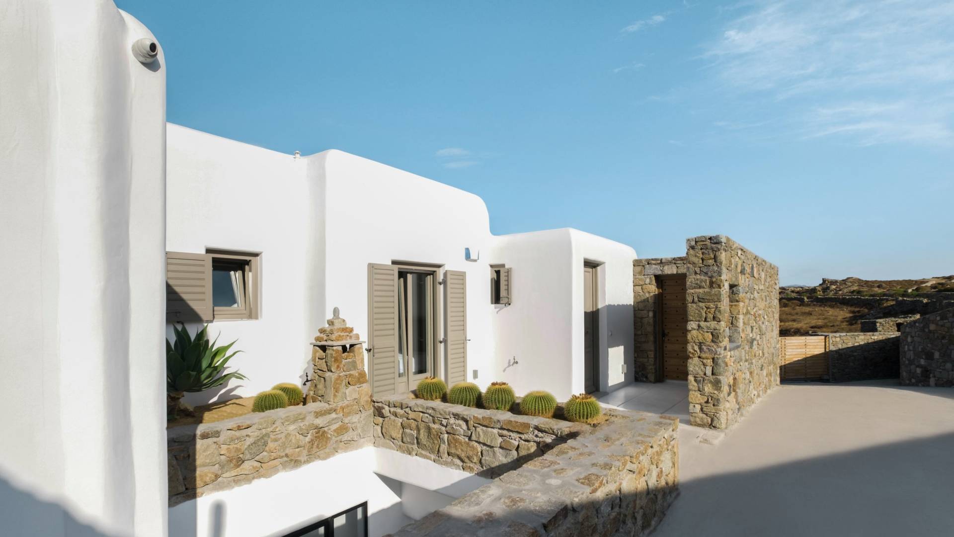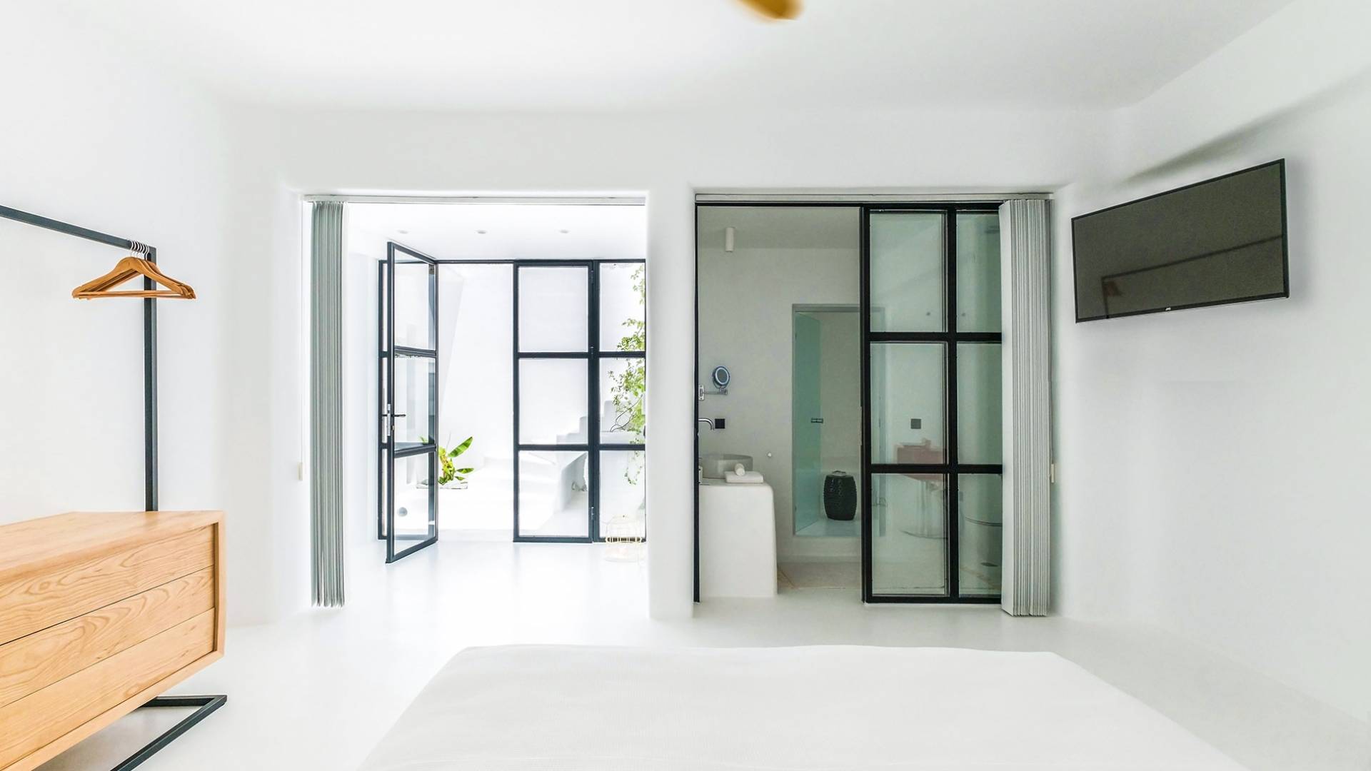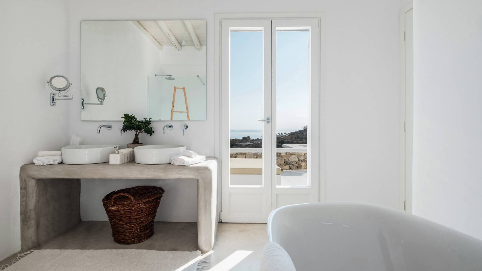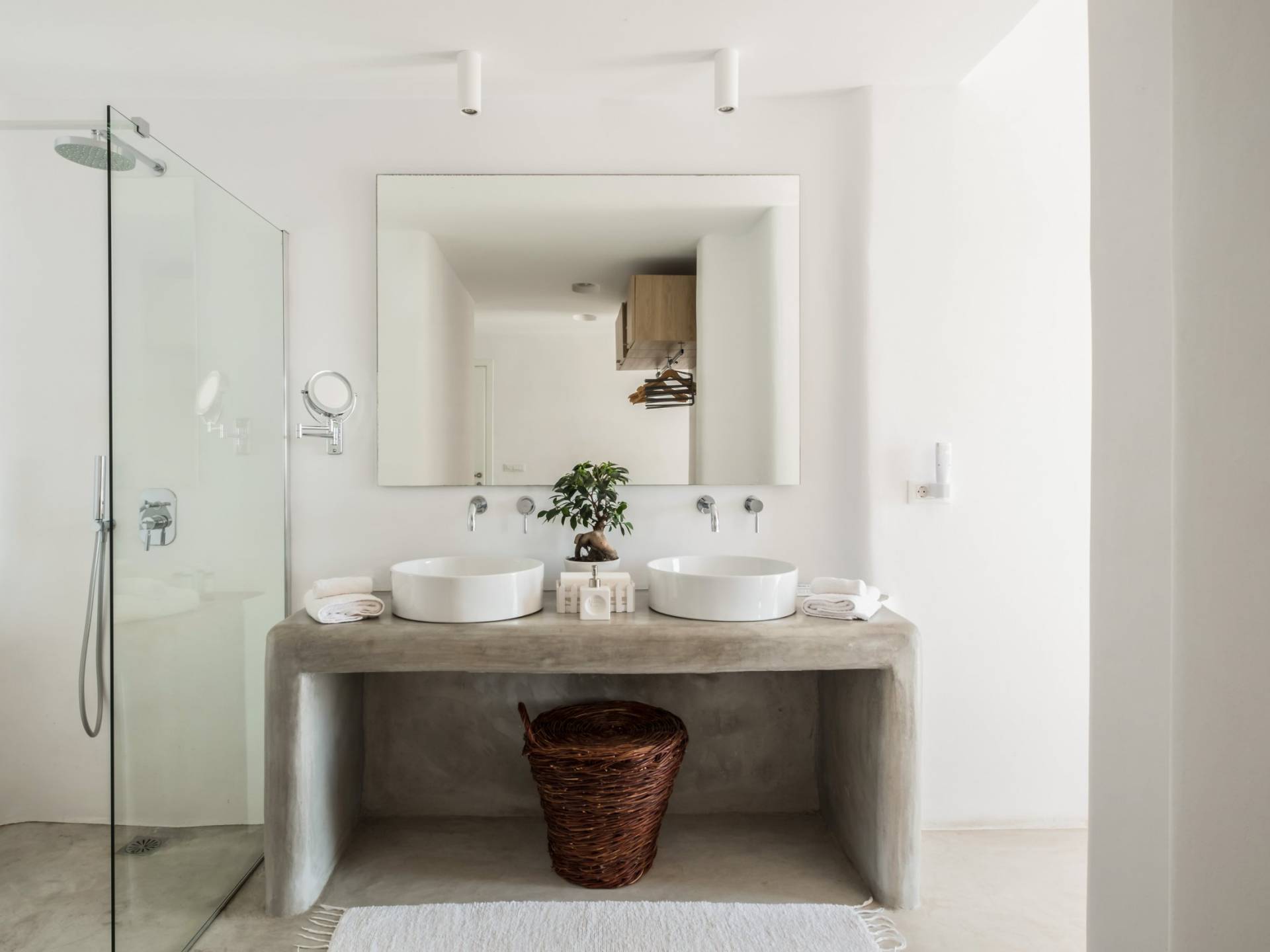 The Left Wing: First floor. Queen size bed. Sea view. TV Satellite. Air conditioning. Fan. Closet with a safe. Private bathroom. Double sink. Mykonian Shower. Quick room access to first-floor sunbeds. Size 19m2. The Back Side: First floor. Queen size bed.TV Satellite. Air conditioning. Closet with a safe. Private bathroom. Double sink. Mykonian shower. Quick room access to hammock room and rooftop stairs. Size 14m2.