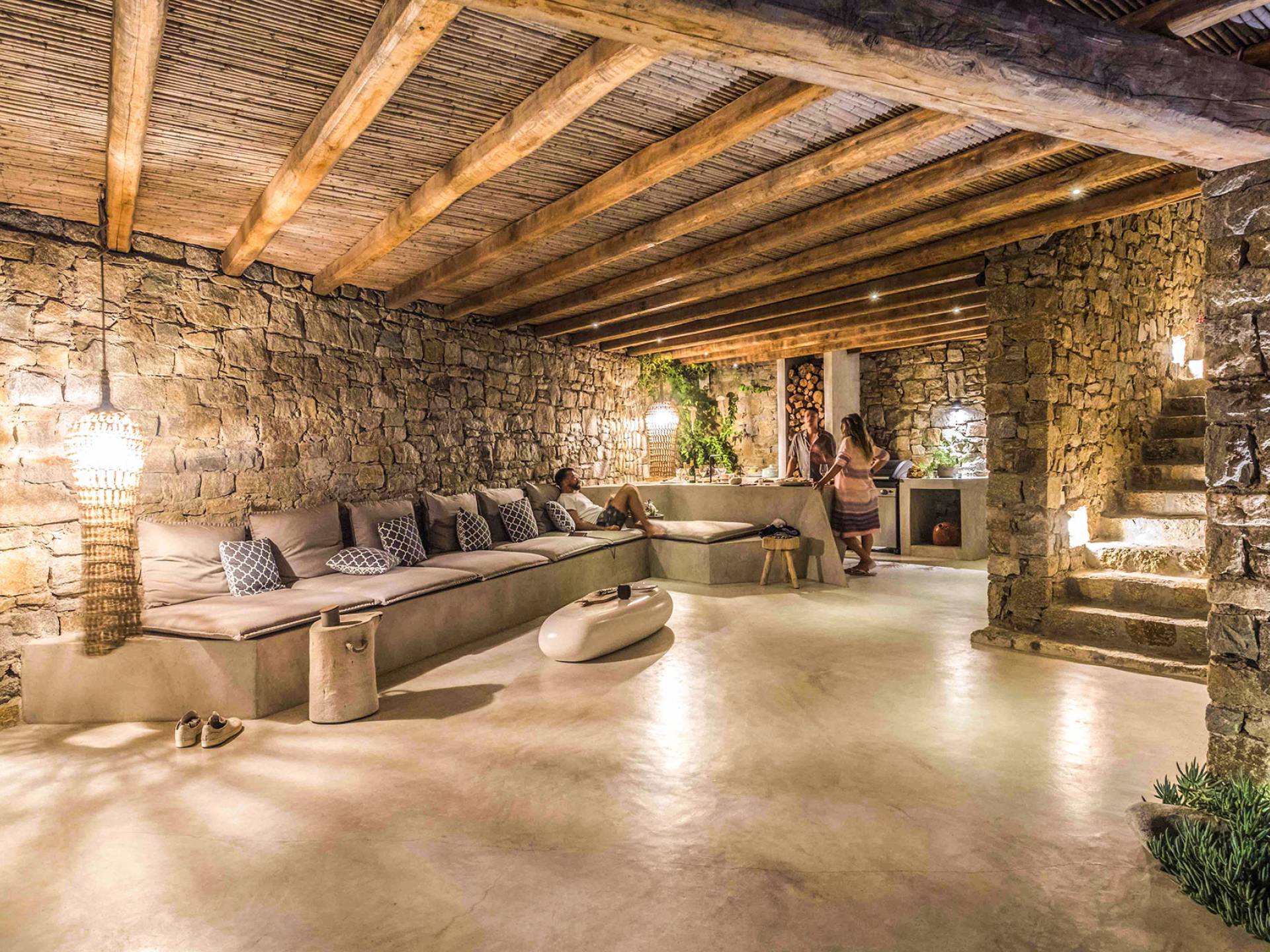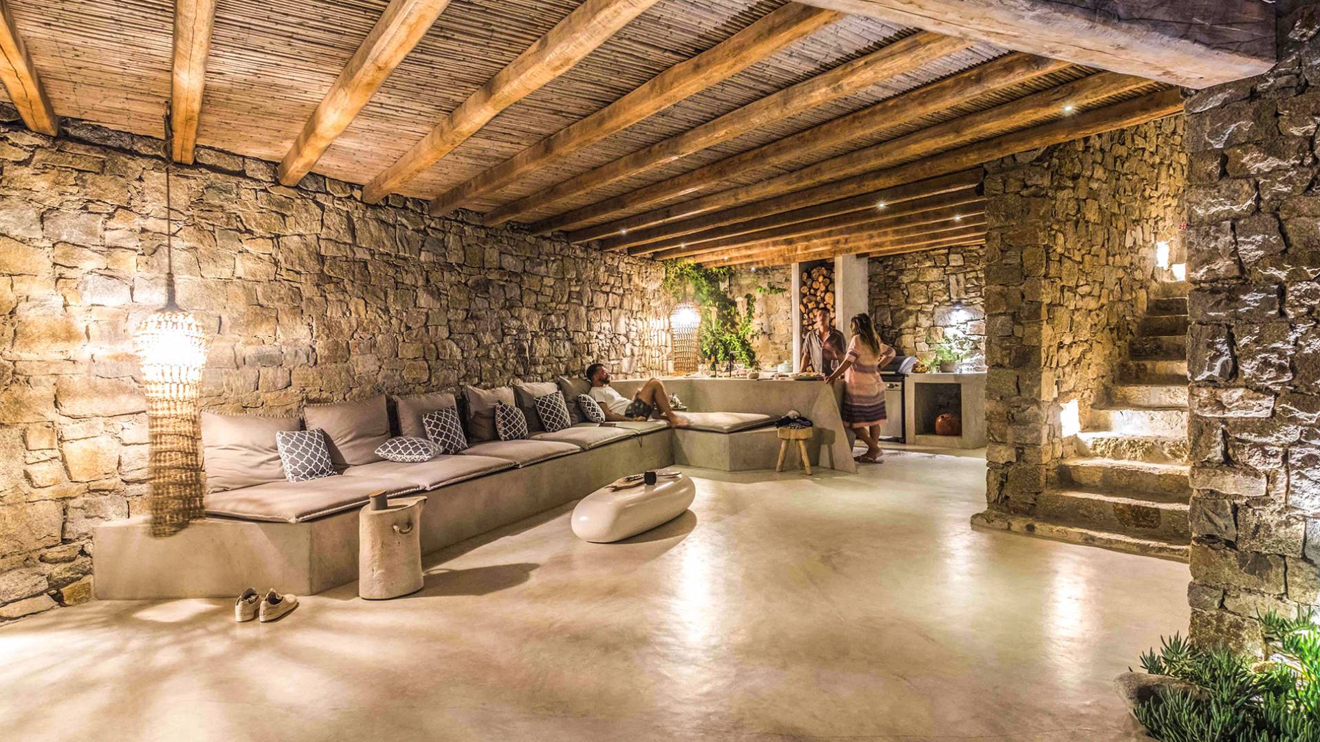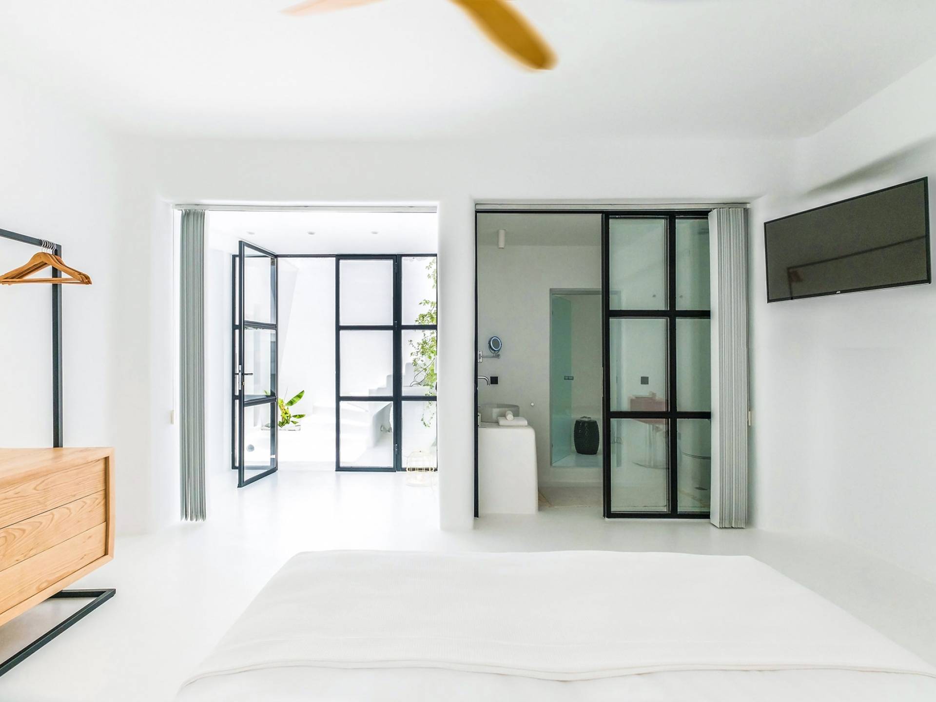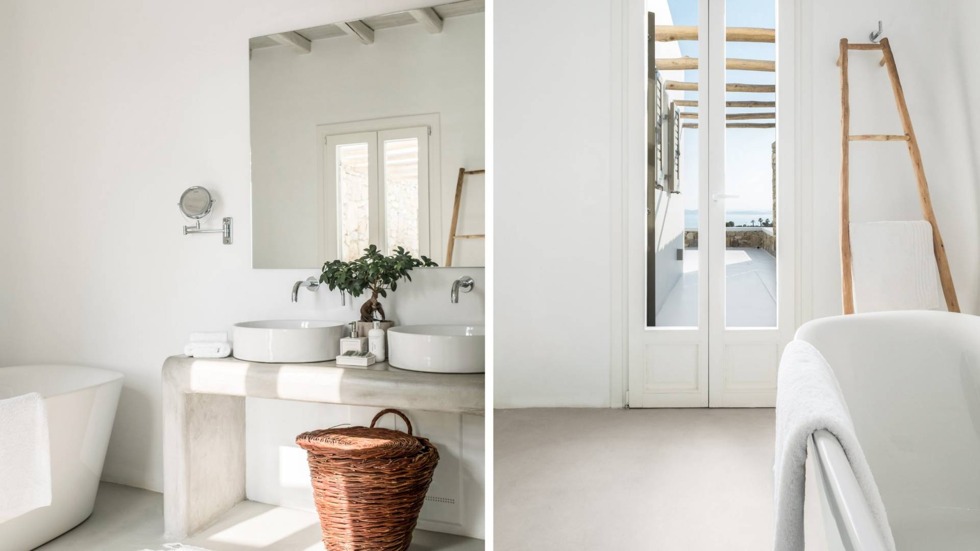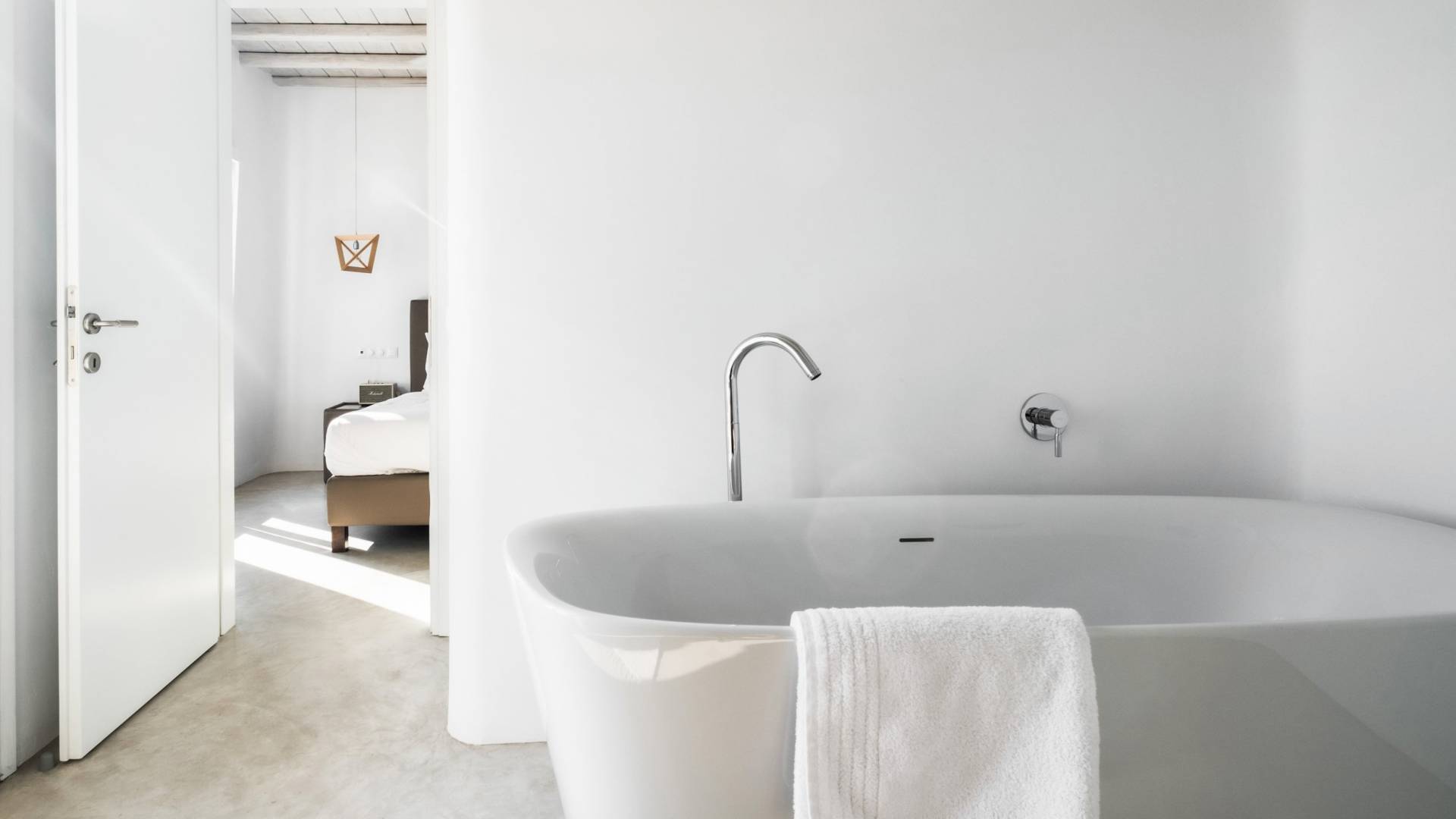 The Left Wing: First floor. Queen size bed. Sea view. TV Satellite. Air conditioning. Fan. Closet with a safe. Private bathroom. Double sink. Mykonian Shower. Quick room access to first-floor sunbeds. Size 19m2. The Back Side: First floor. Queen size bed.TV Satellite. Air conditioning. Closet with a safe. Private bathroom. Double sink. Mykonian shower. Quick room access to hammock room and rooftop stairs. Size 14m2.