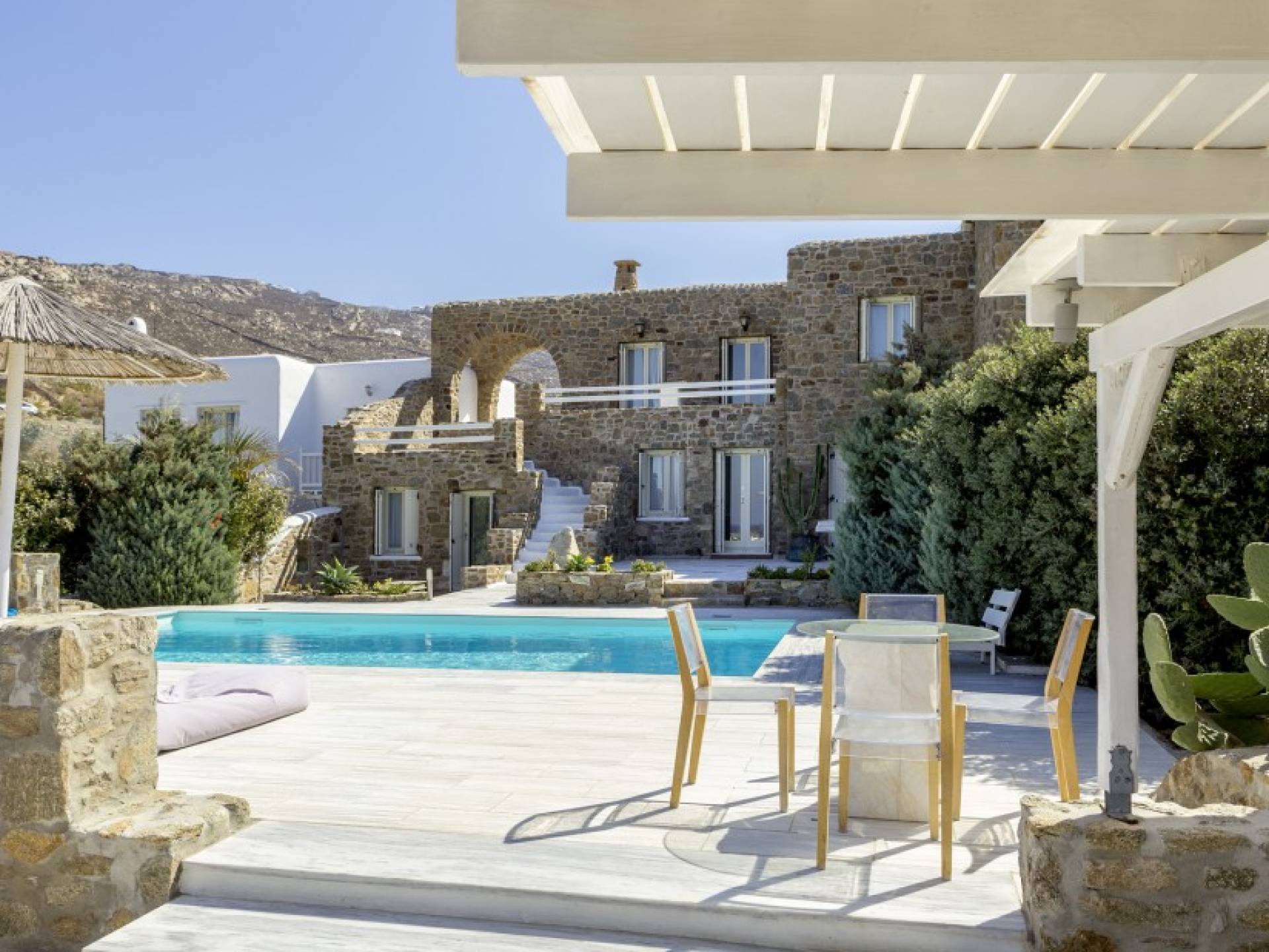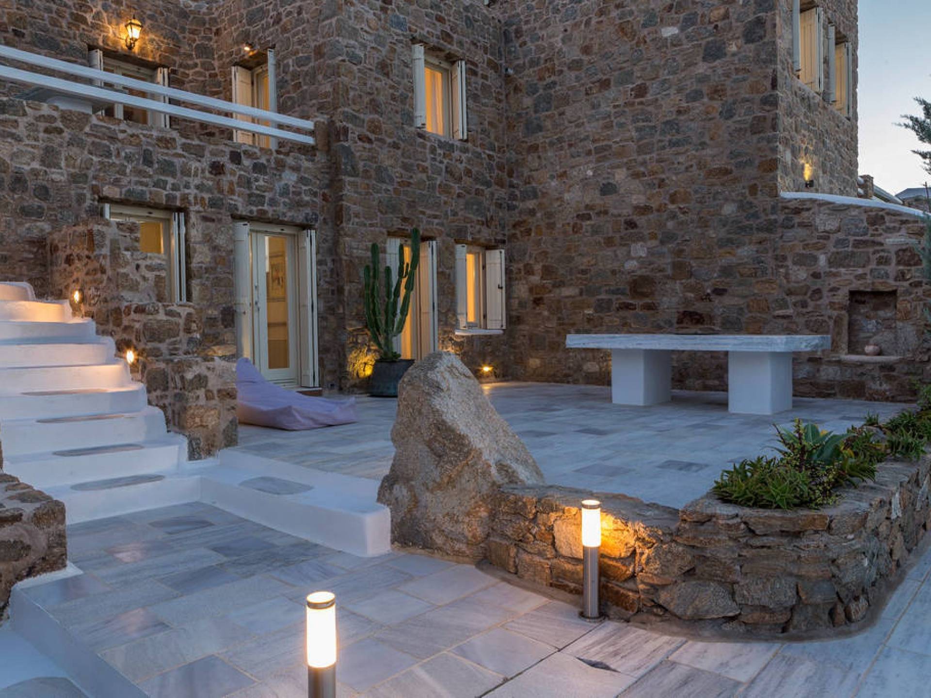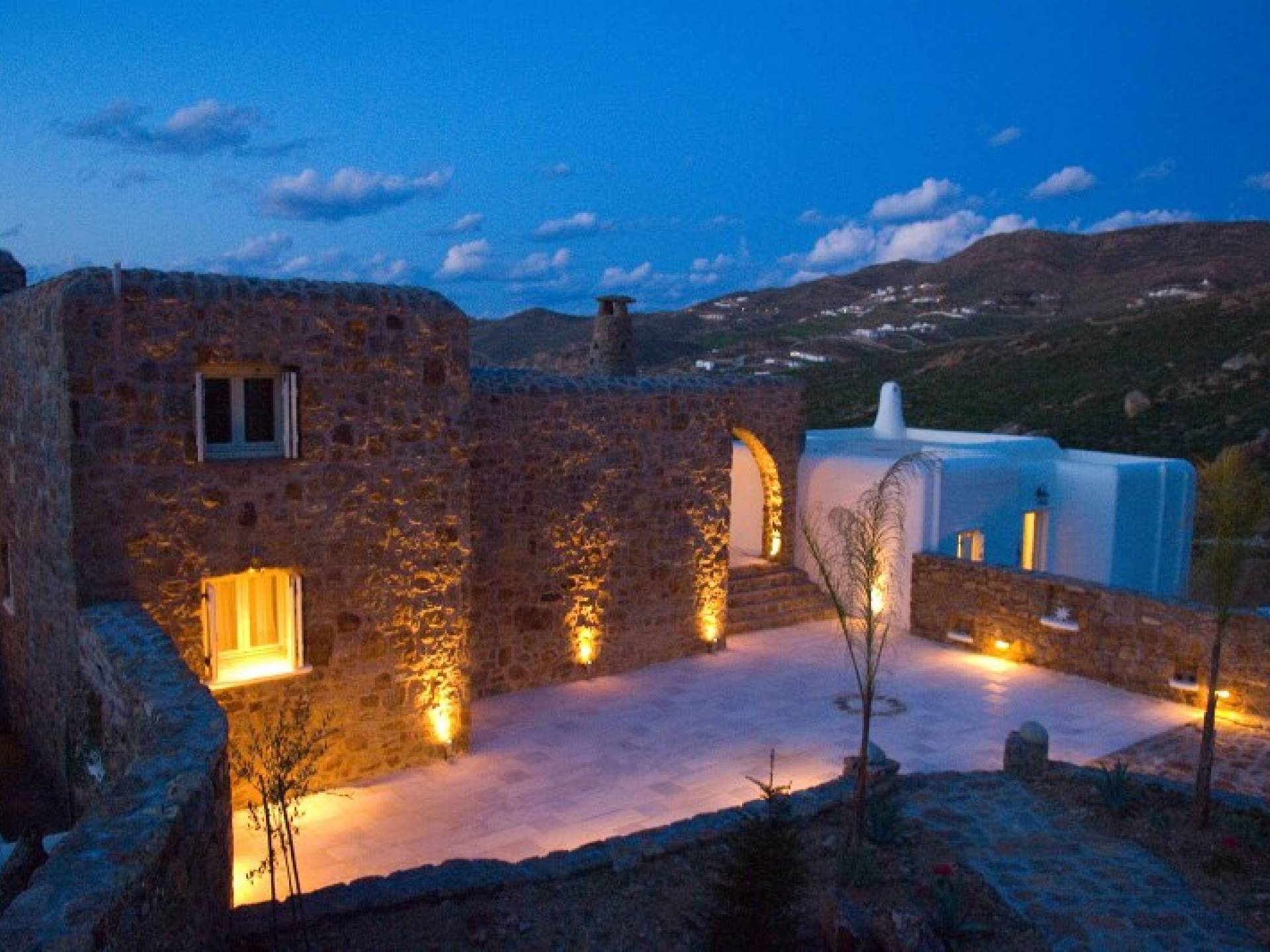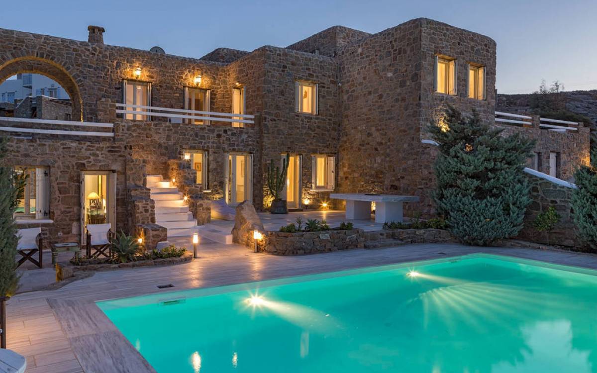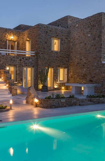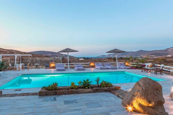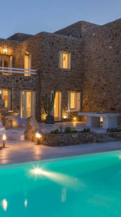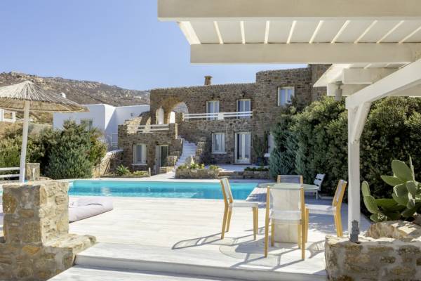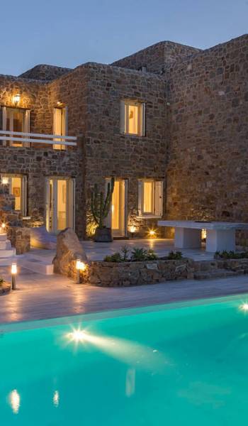 Located among fields above Ftelia Beach, Mykonos Dream Villas-three secluded, very large brand new 2009 built modern villas-offer fantastic sea & countryside views with guaranteed tranquility. The harmonious composition of stone, marble & wood creates the unique atmosphere of the outdoor area. Stone sills provide a certain degree of privacy among villas and residents. Inside, beautiful antique pieces, paintings, arches, and silk-lined curtains decorate the many rooms with harmony and charm.