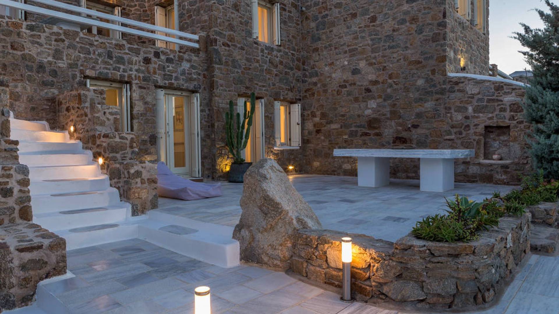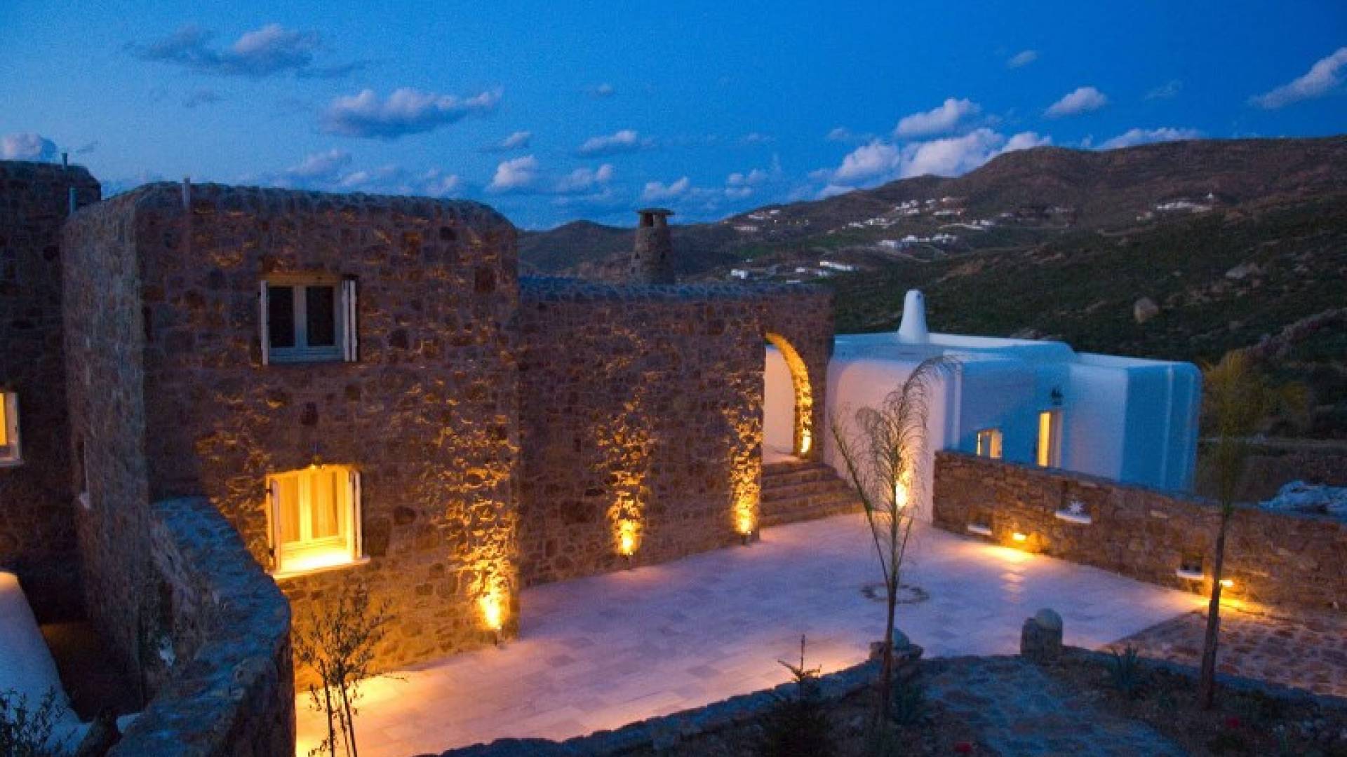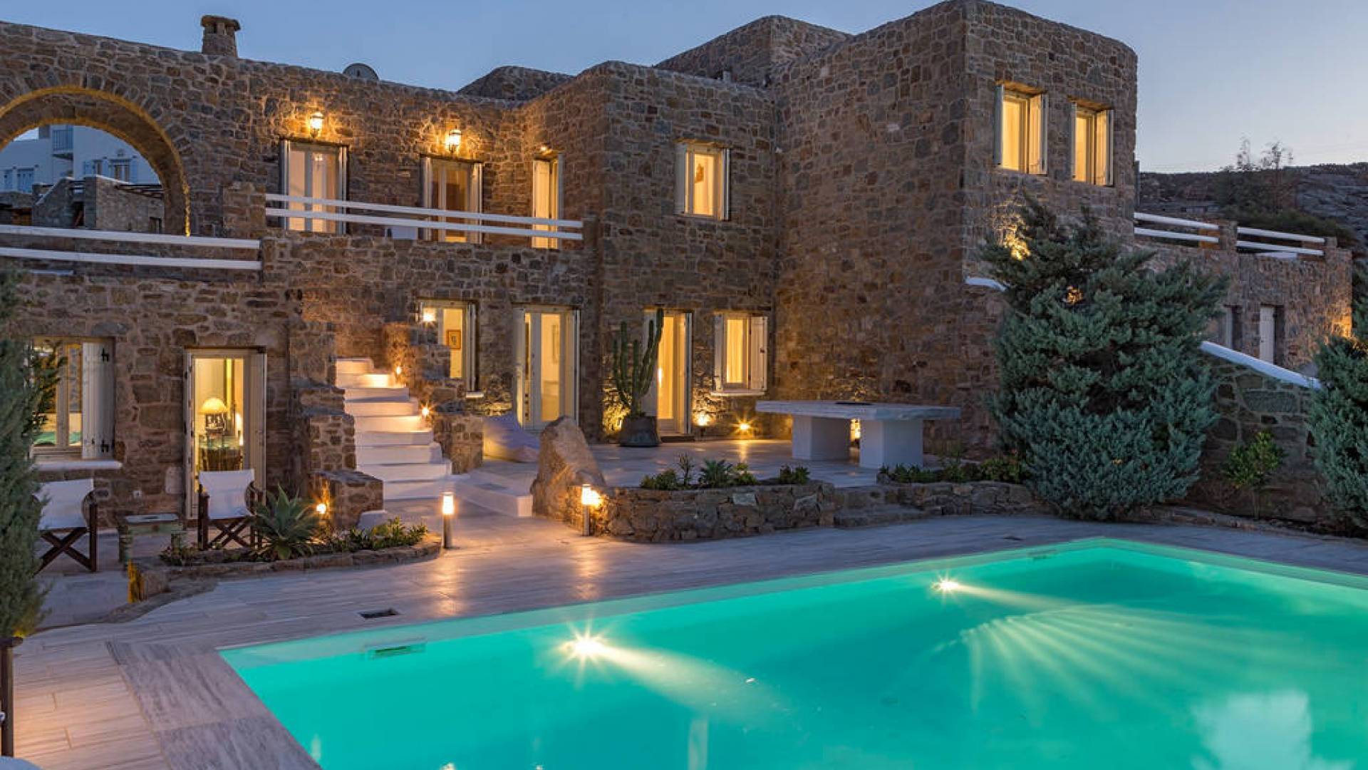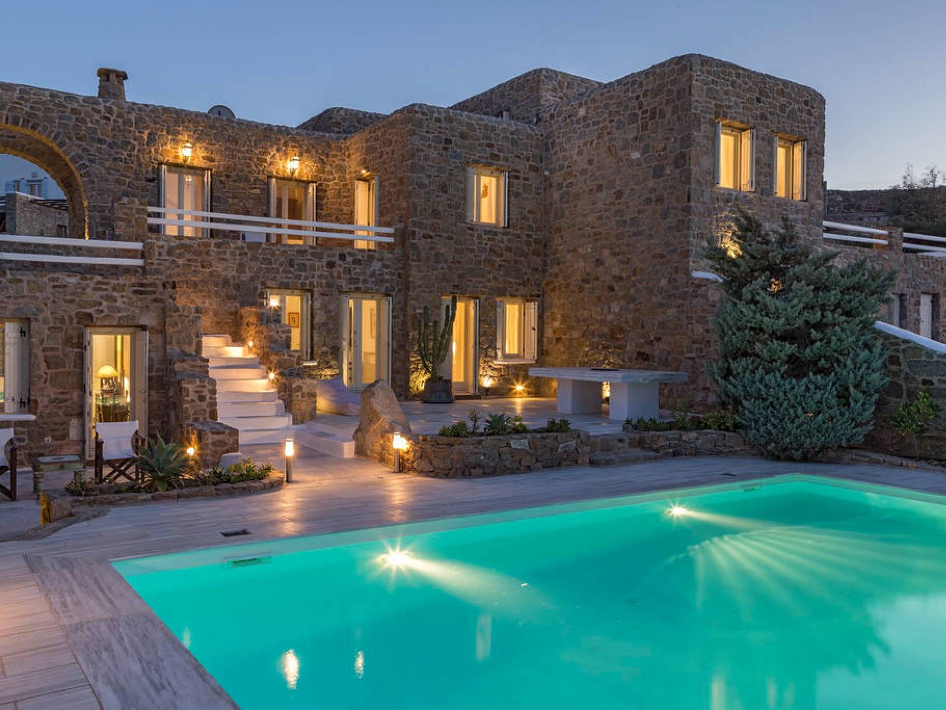 Located among fields above Ftelia Beach, Mykonos Dream Villas-three secluded, very large brand new 2009 built modern villas-offer fantastic sea & countryside views with guaranteed tranquility. The harmonious composition of stone, marble & wood creates the unique atmosphere of the outdoor area. Stone sills provide a certain degree of privacy among villas and residents. Inside, beautiful antique pieces, paintings, arches, and silk-lined curtains decorate the many rooms with harmony and charm.