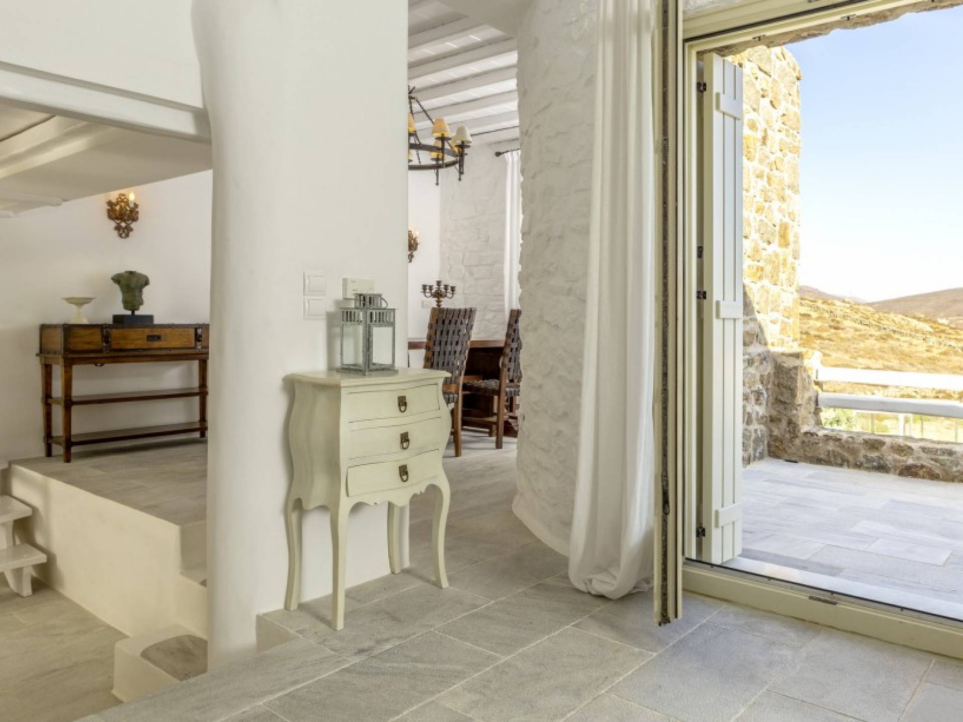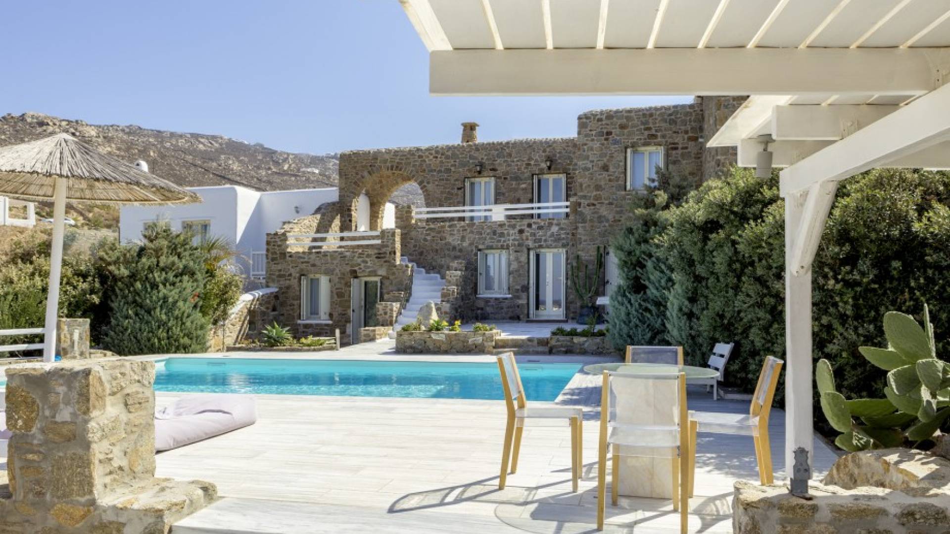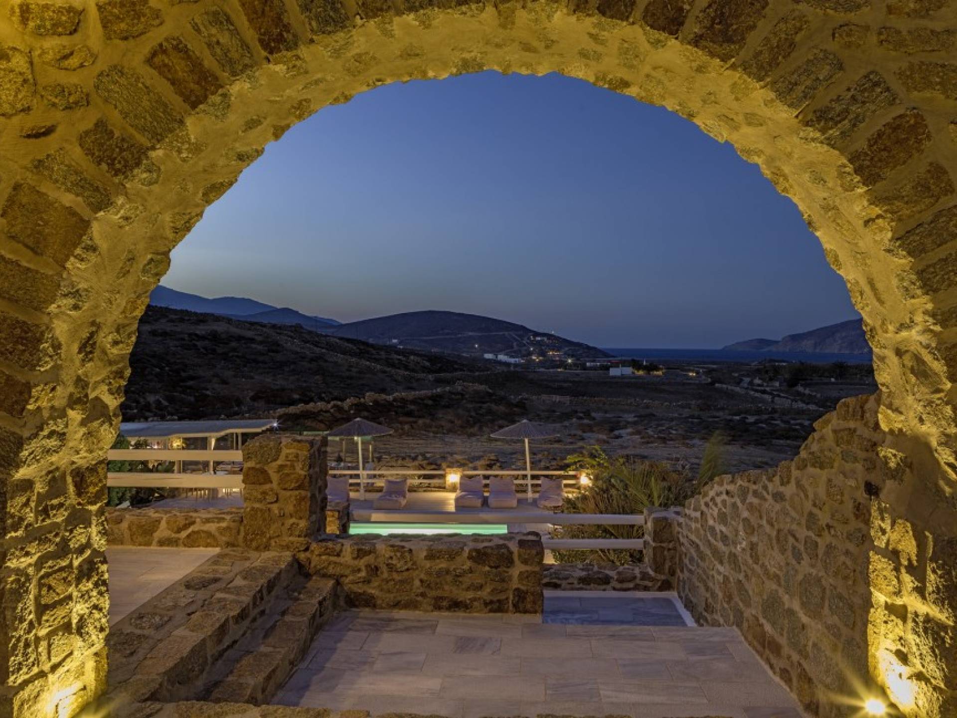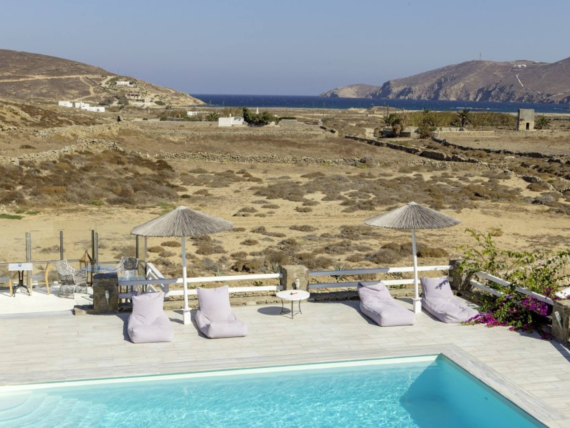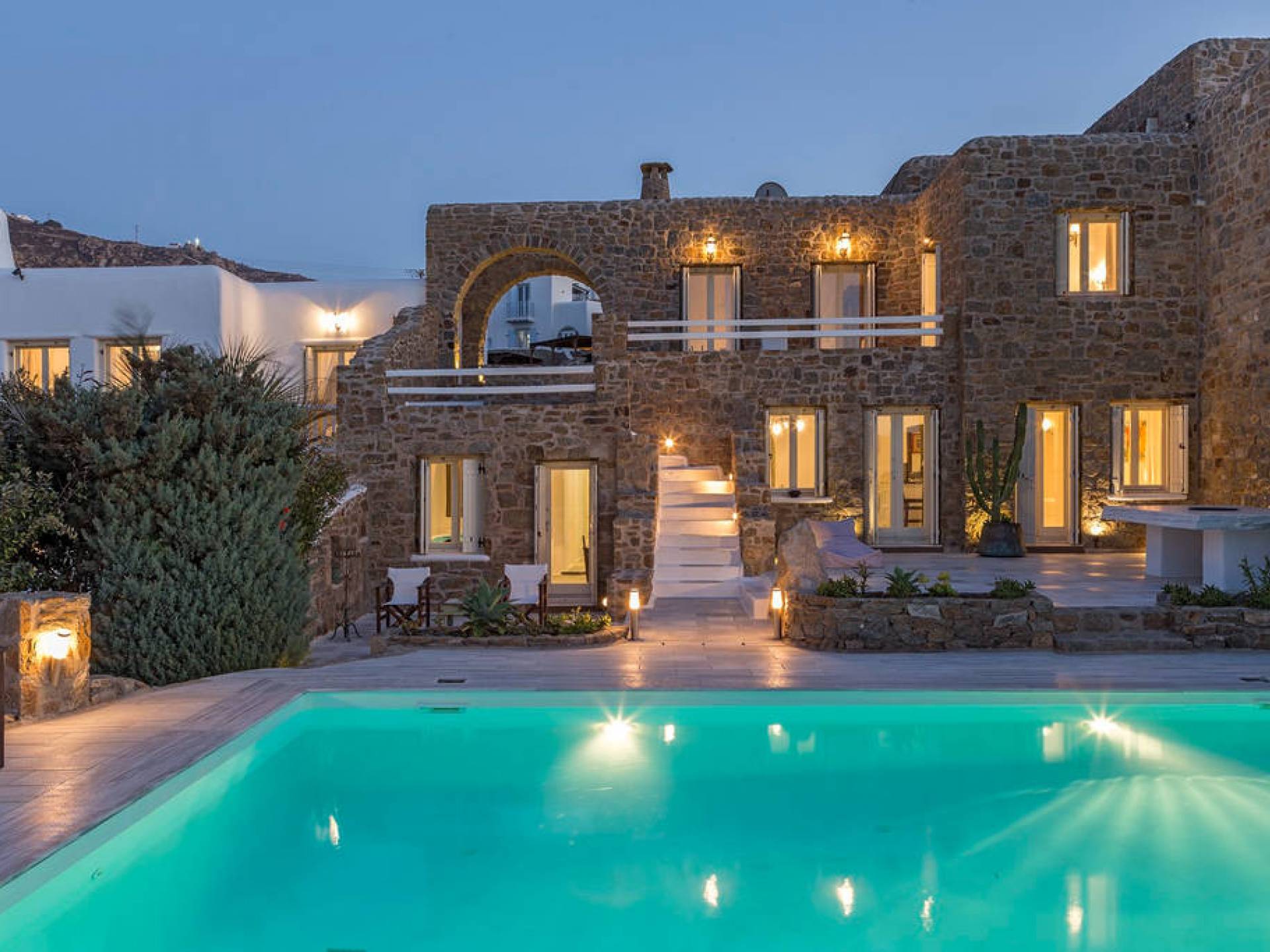 Located among fields above Ftelia Beach, Mykonos Dream Villas-three secluded, very large brand new 2009 built modern villas-offer fantastic sea & countryside views with guaranteed tranquility. The harmonious composition of stone, marble & wood creates the unique atmosphere of the outdoor area. Stone sills provide a certain degree of privacy among villas and residents. Inside, beautiful antique pieces, paintings, arches, and silk-lined curtains decorate the many rooms with harmony and charm.