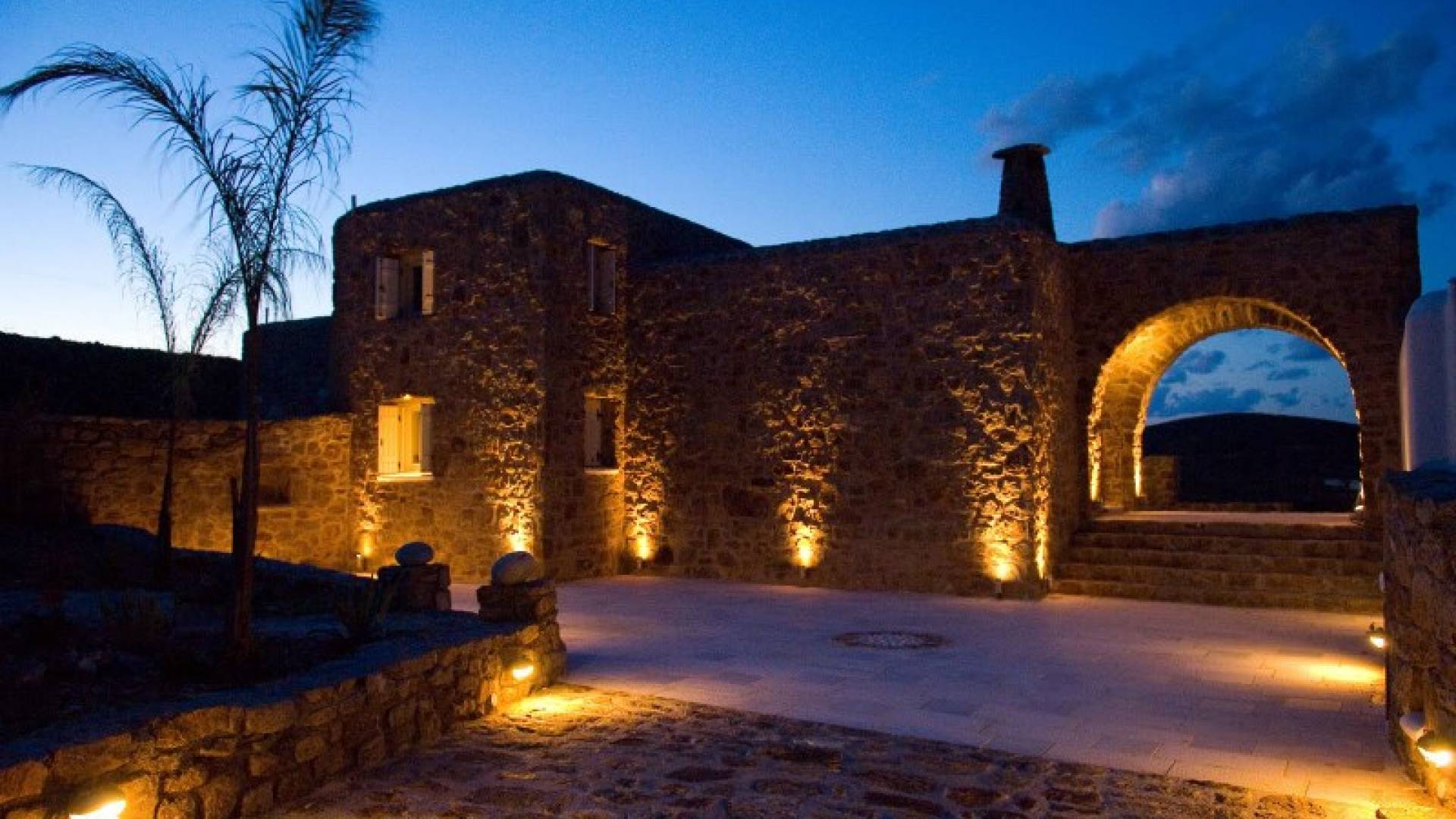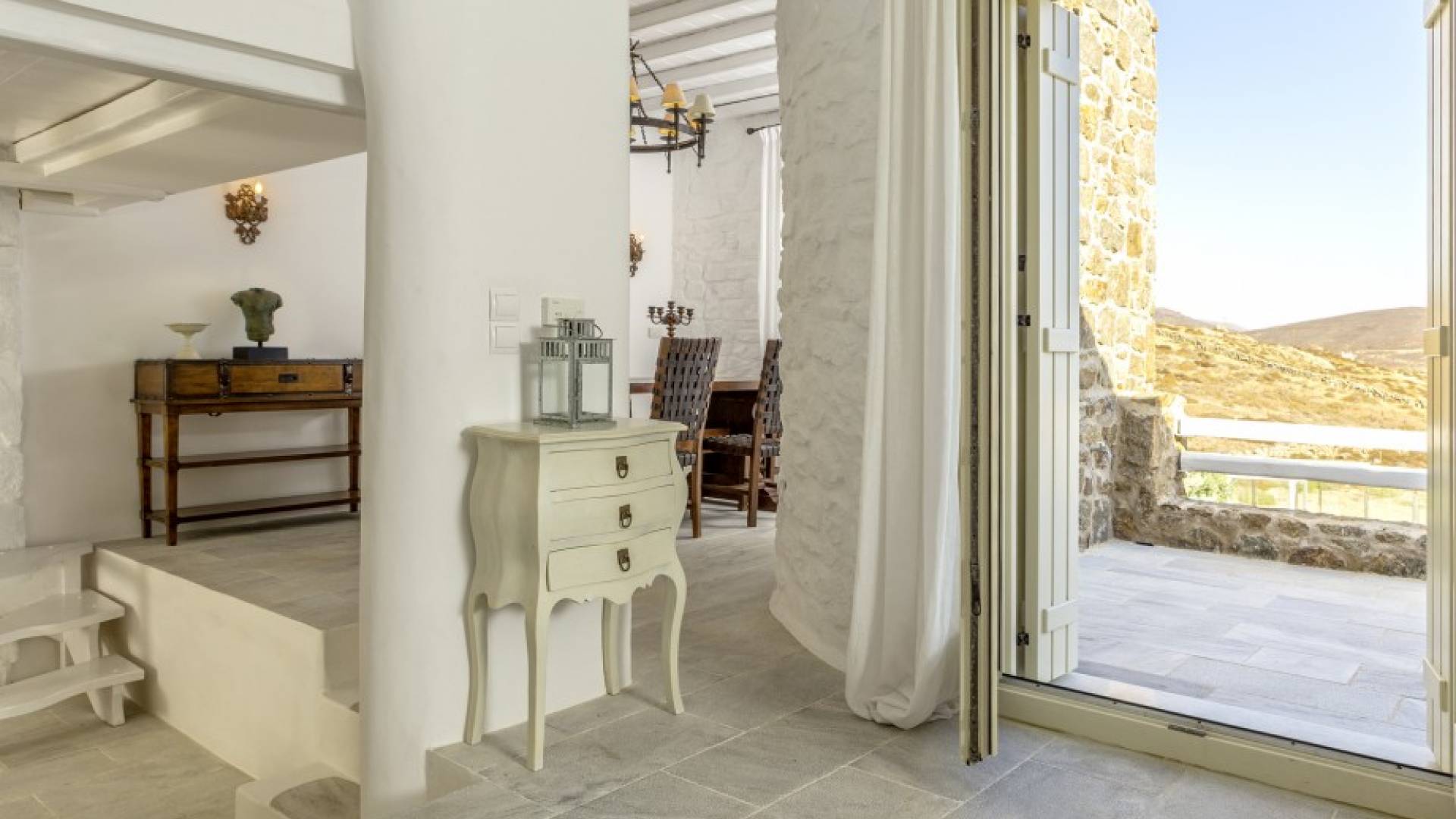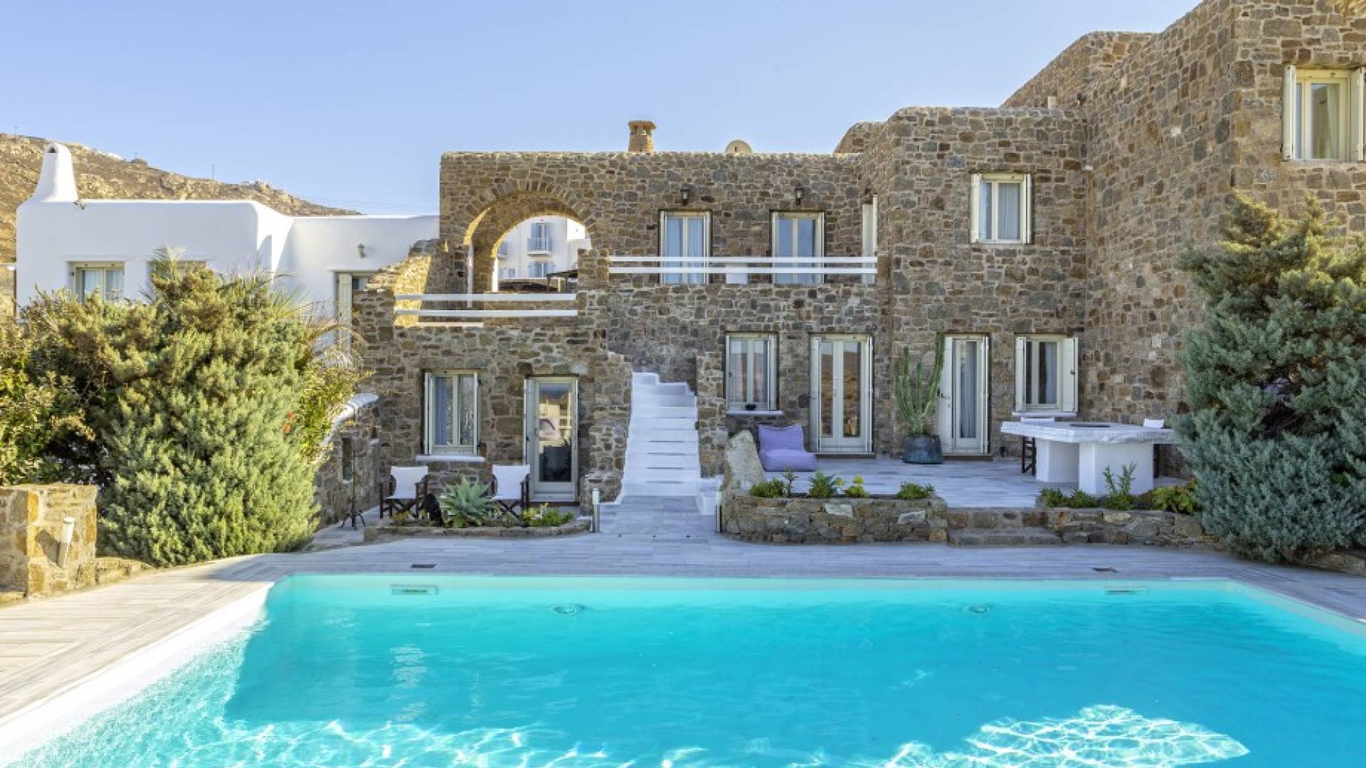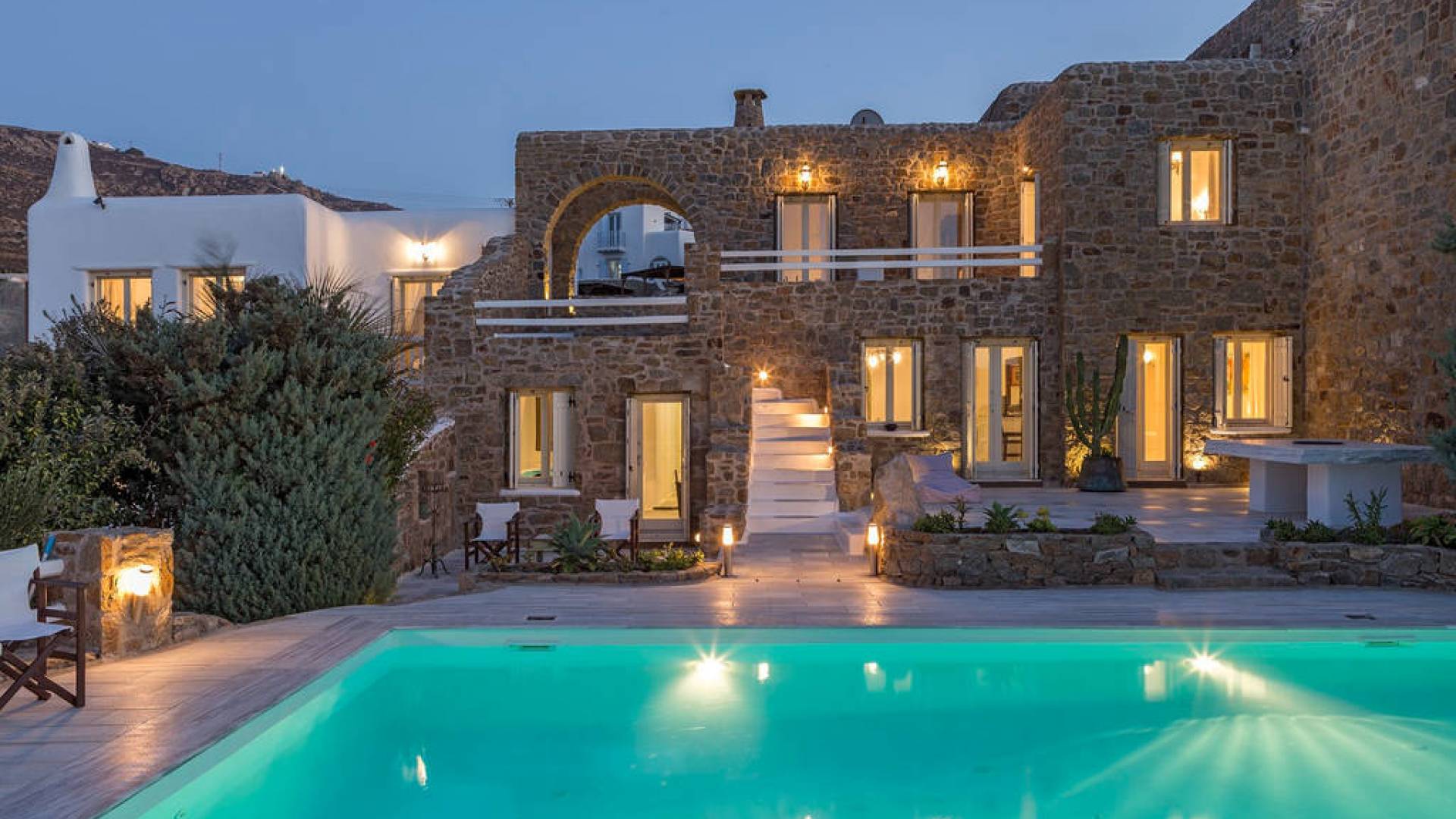 Located among fields above Ftelia Beach, Mykonos Dream Villas-three secluded, very large brand new 2009 built modern villas-offer fantastic sea & countryside views with guaranteed tranquility. The harmonious composition of stone, marble & wood creates the unique atmosphere of the outdoor area. Stone sills provide a certain degree of privacy among villas and residents. Inside, beautiful antique pieces, paintings, arches, and silk-lined curtains decorate the many rooms with harmony and charm.