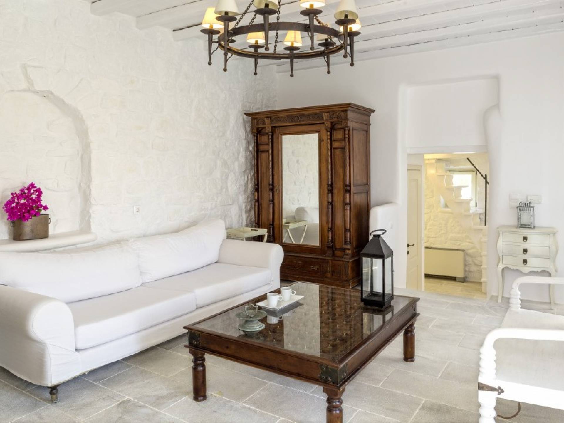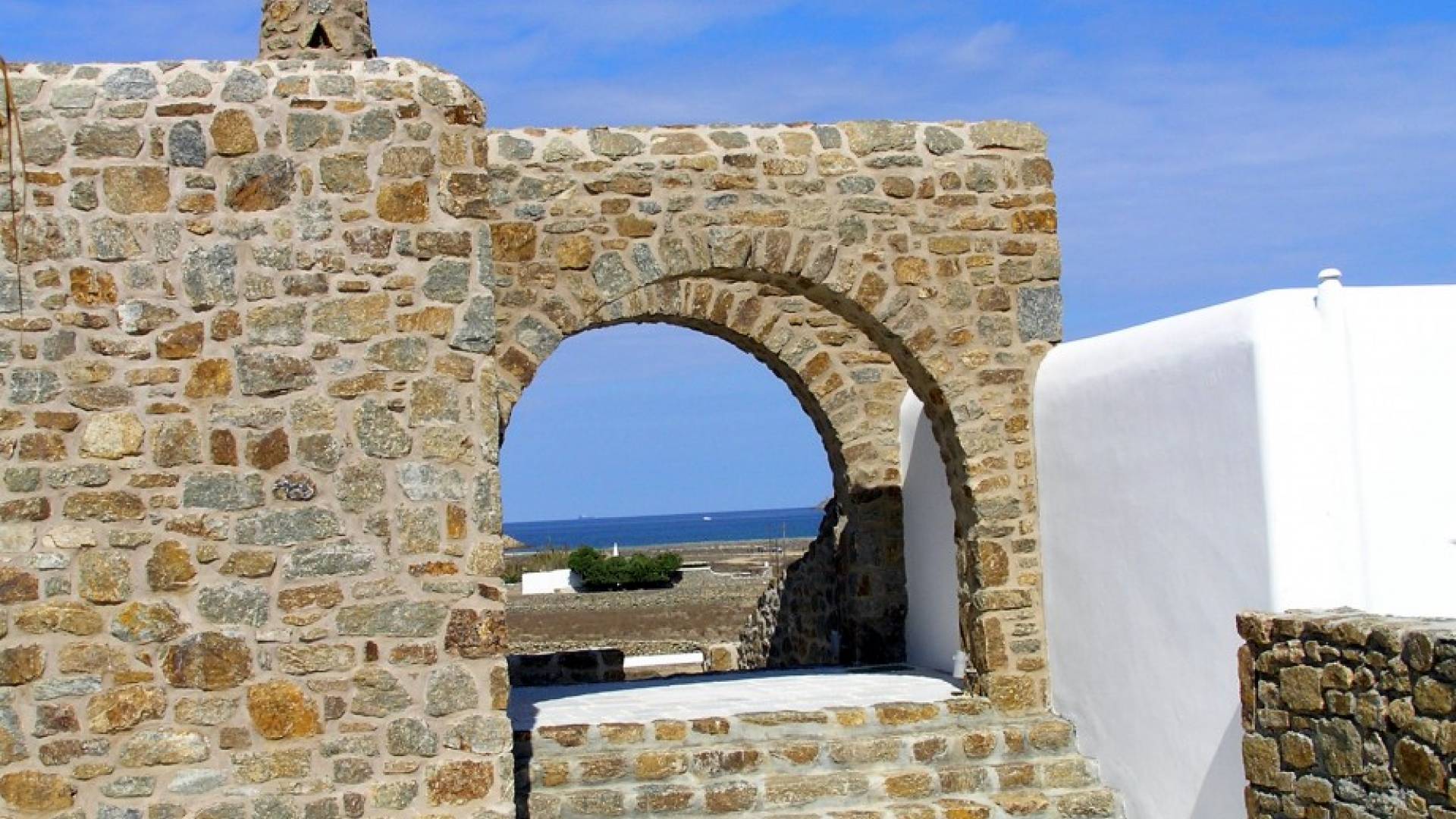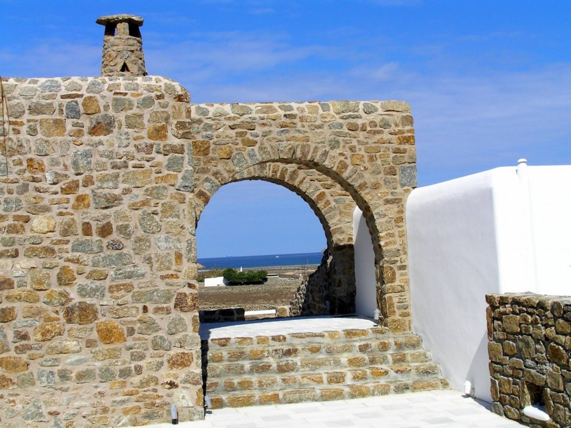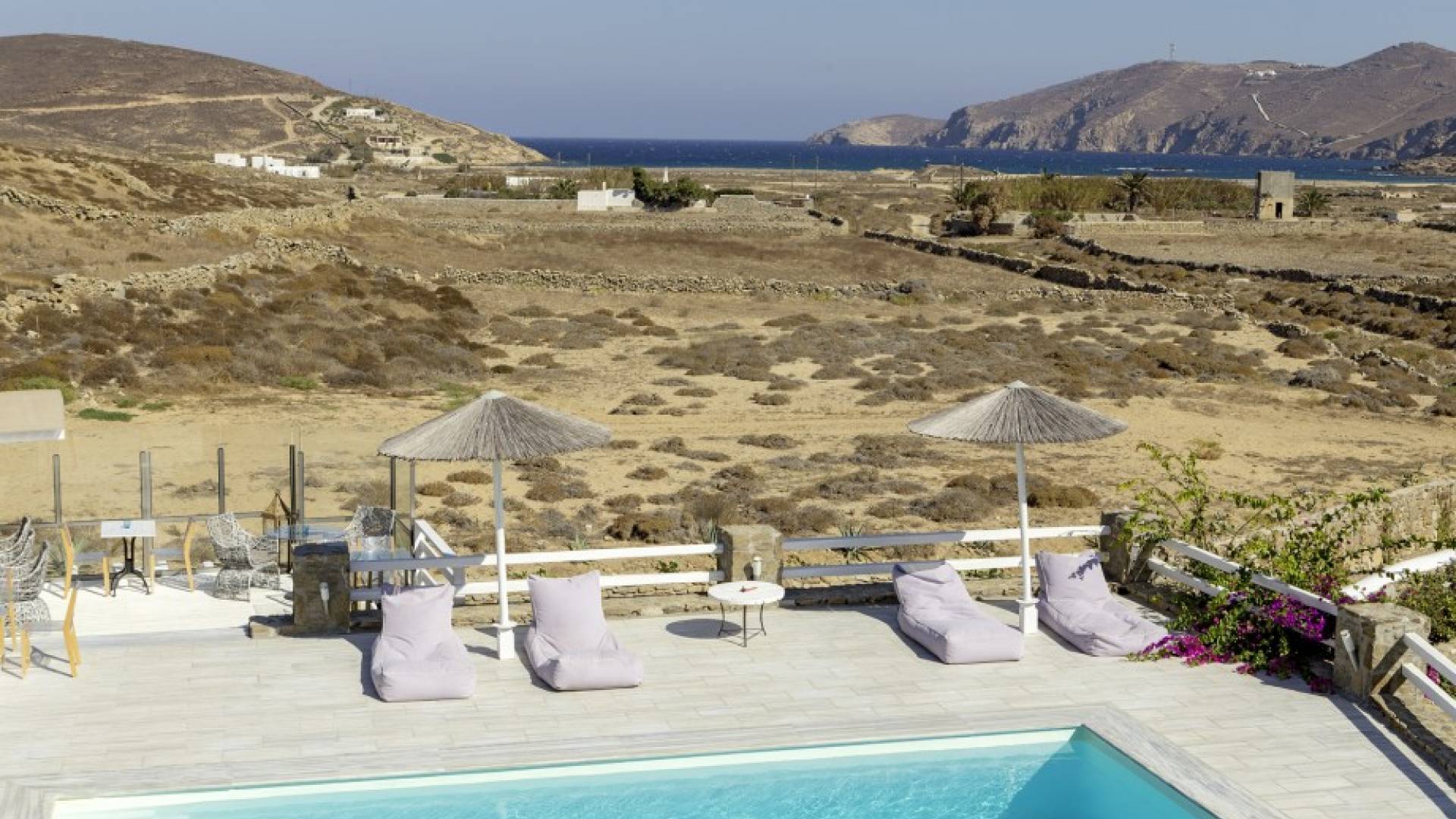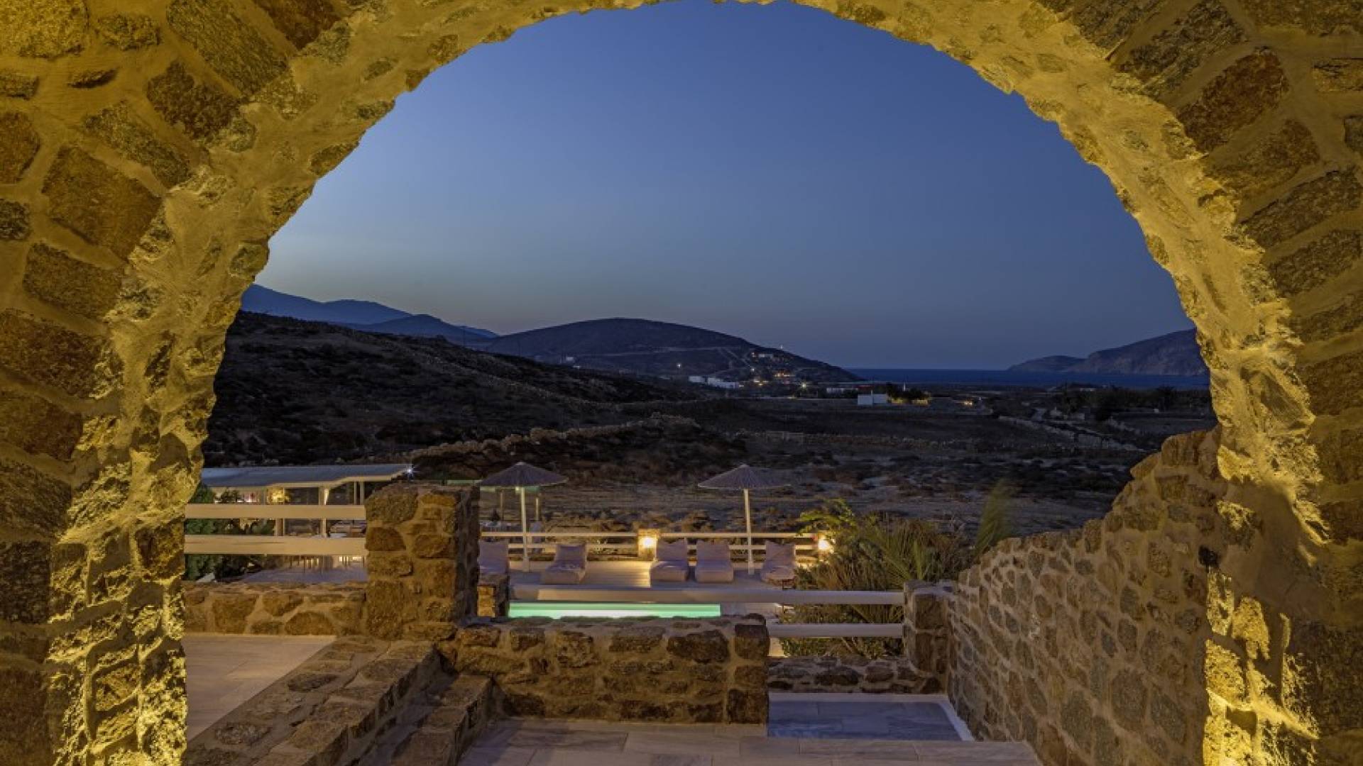 Located among fields above Ftelia Beach, Mykonos Dream Villas-three secluded, very large brand new 2009 built modern villas-offer fantastic sea & countryside views with guaranteed tranquility. The harmonious composition of stone, marble & wood creates the unique atmosphere of the outdoor area. Stone sills provide a certain degree of privacy among villas and residents. Inside, beautiful antique pieces, paintings, arches, and silk-lined curtains decorate the many rooms with harmony and charm.