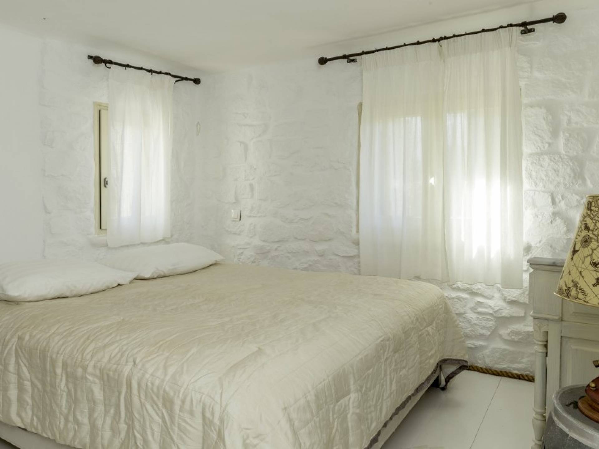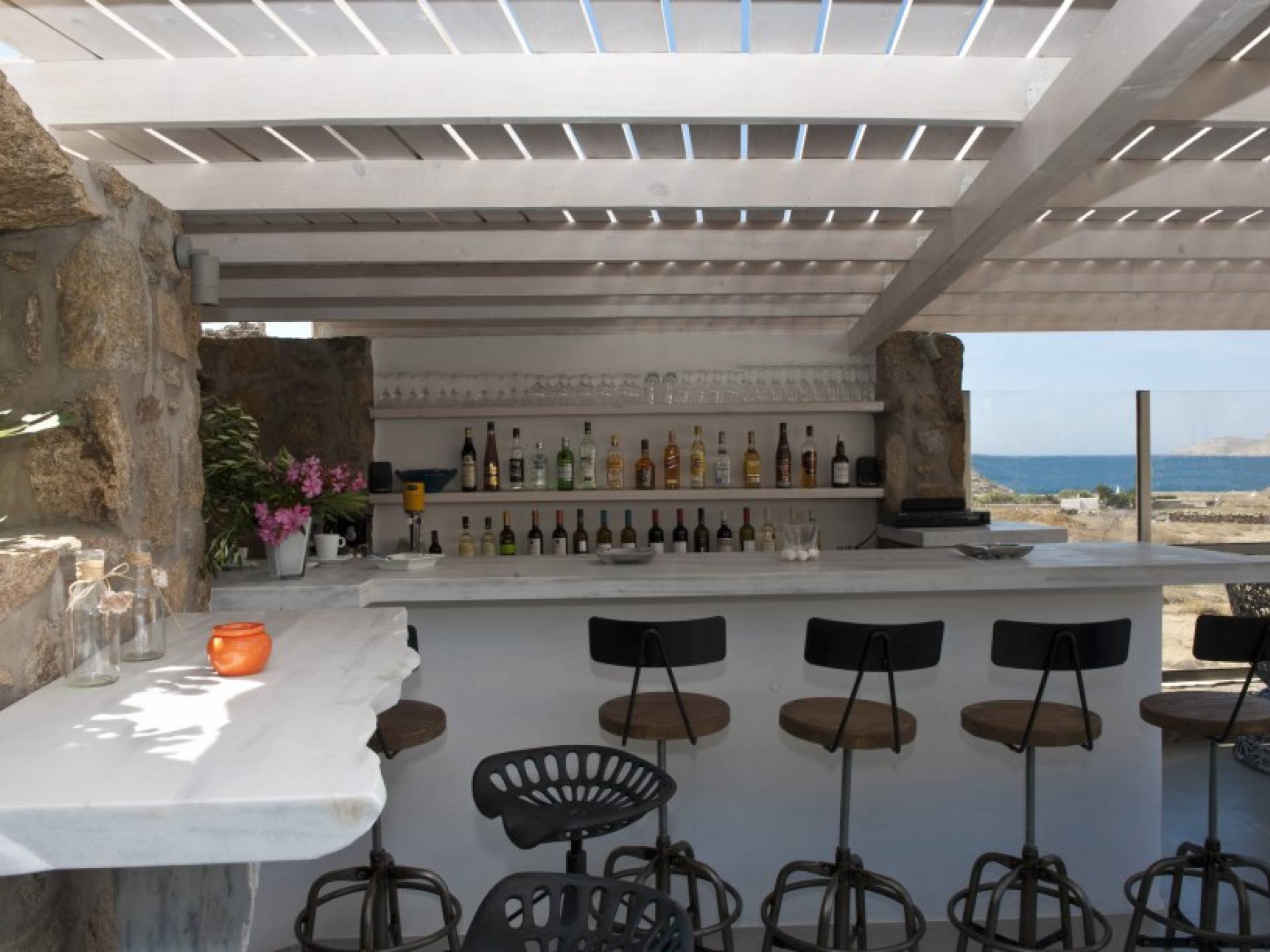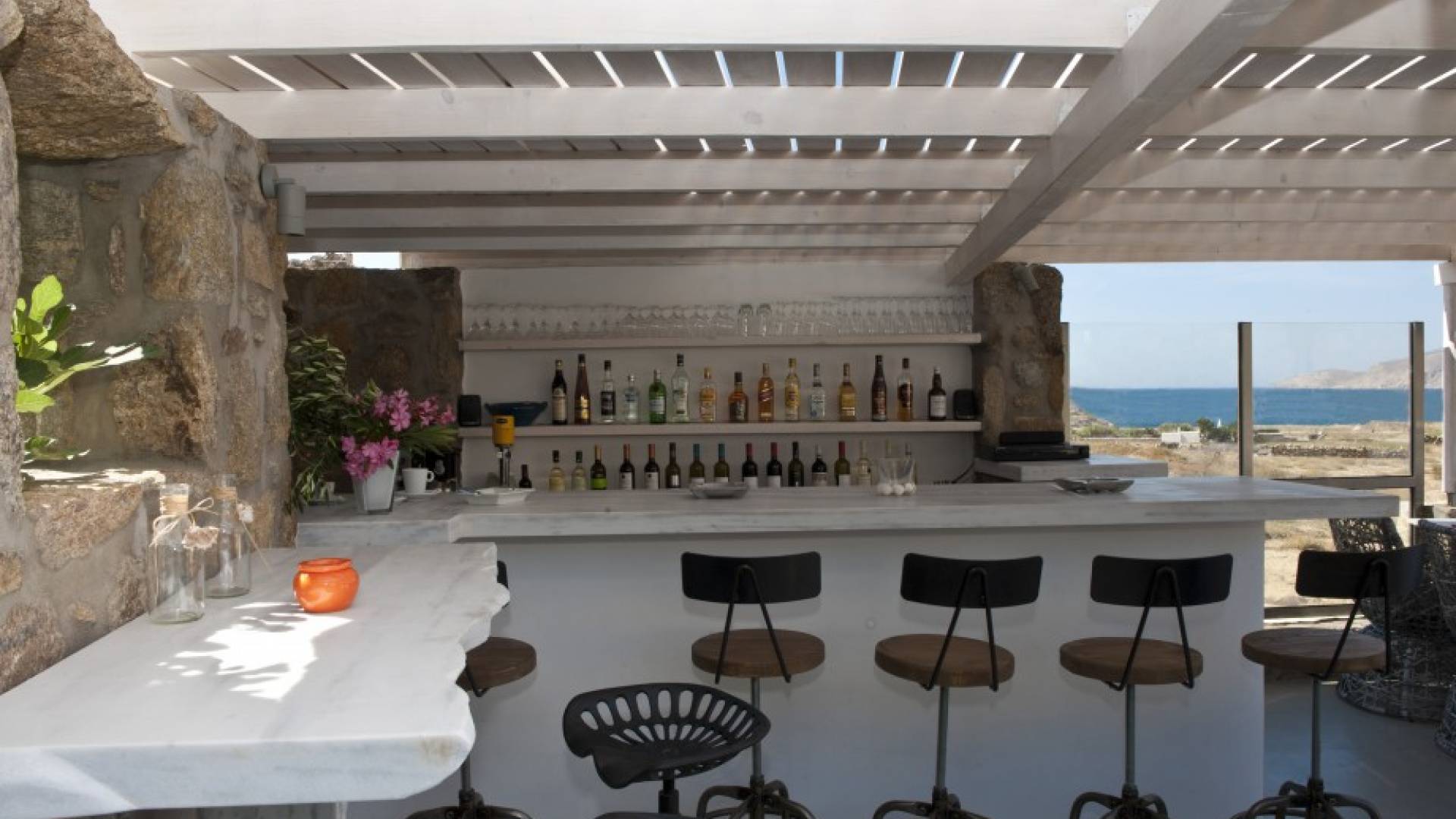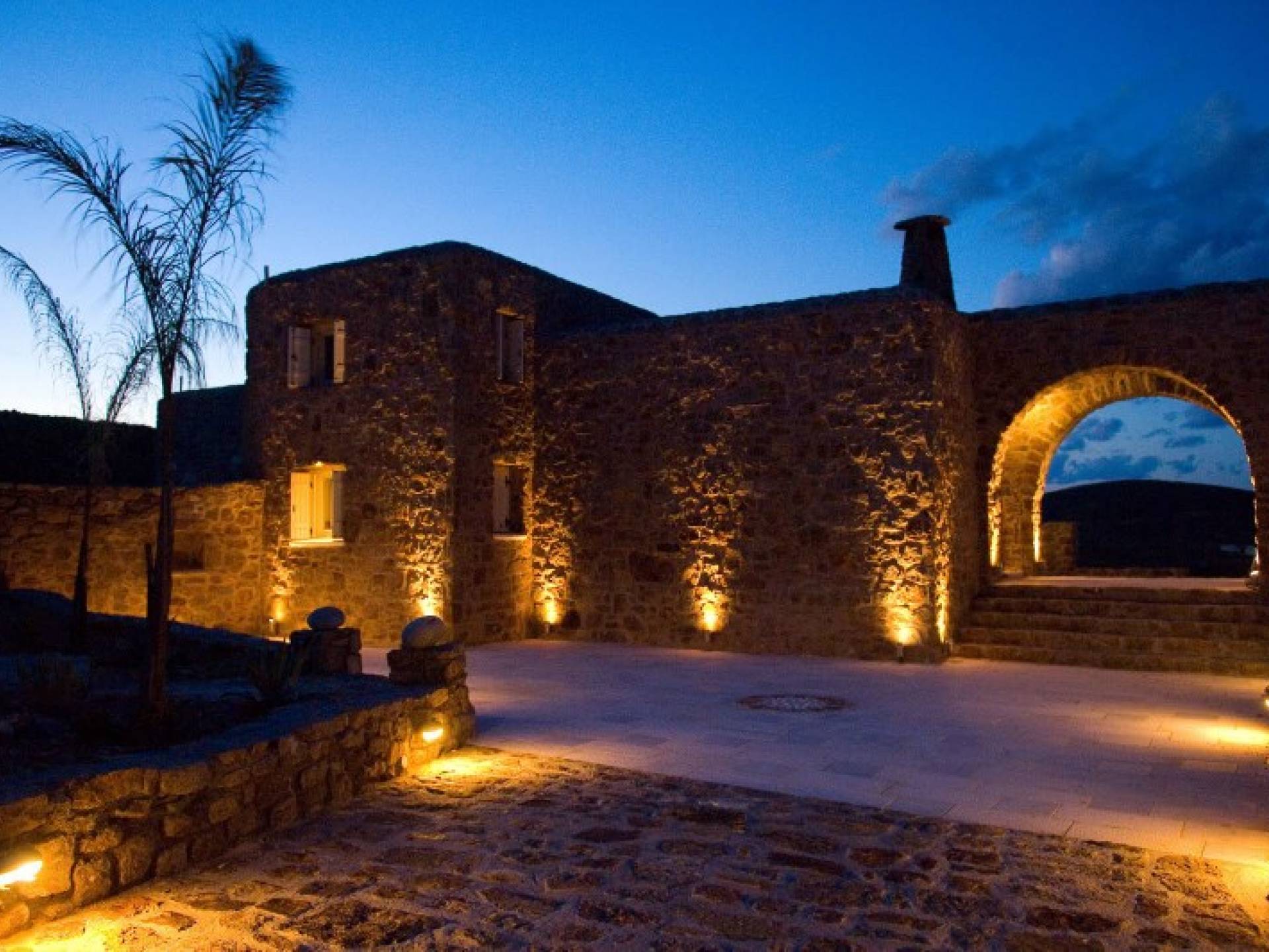 Best suited to a mature lifestyle and refined taste, villa Castella Rossa offers guests marvelous moments of relaxation and pure inspiration. This private Villa consists of 3 floors. The ground floor comprises 2 triple bedrooms with walk-in wardrobes and impressive en-suite marble bathrooms with bathtubs, one of them with hydro-massage. In the first floor, you may find the spacious dining room with a fireplace and a fully equipped kitchen, as well as the living room and a marble bathroom. The dining and living areas are divided by a few steps giving a more individual layout. Upstairs you meet a wooden-floor double bedroom with its en-suite bathroom. The luxurious marble patio located at the back of the house is one of its treasures: ideal for entertaining during dinner parties, as well as a fresh and peaceful courtyard during hot days. Three more different levels of marble terraces are accessible via a sumptuous marble staircase in the front of the house offering spacious outdoor dining areas with spectacular sea views.