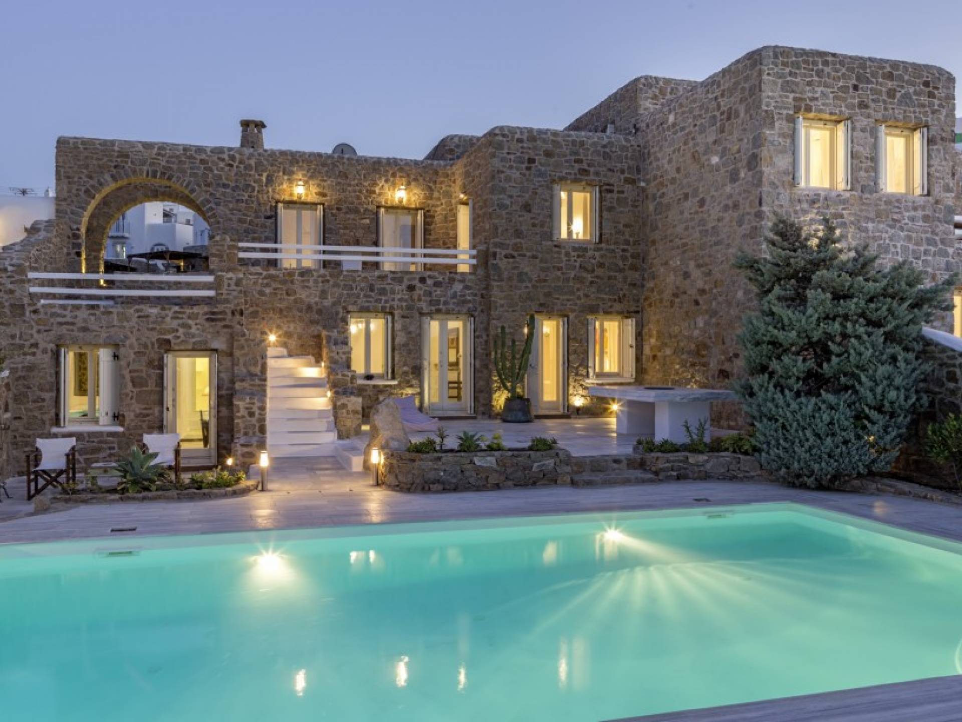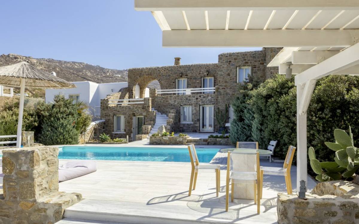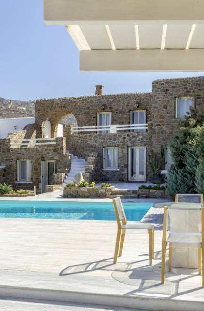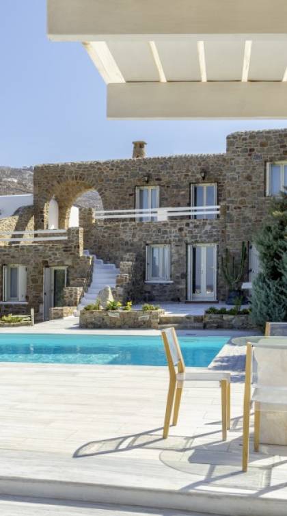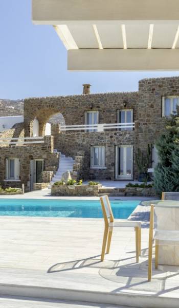 Located among fields above Ftelia Beach, Mykonos Dream Villas-three secluded, very large brand new 2009 built modern villas - offer fantastic sea & countryside views with guaranteed tranquility. The harmonious composition of stone, marble & wood creates the unique atmosphere of the outdoor area. Stone sills provide a certain degree of privacy among villas and residents. Inside, beautiful antique pieces, paintings, arches, and silk-lined curtains decorate the many rooms with harmony and charm.
