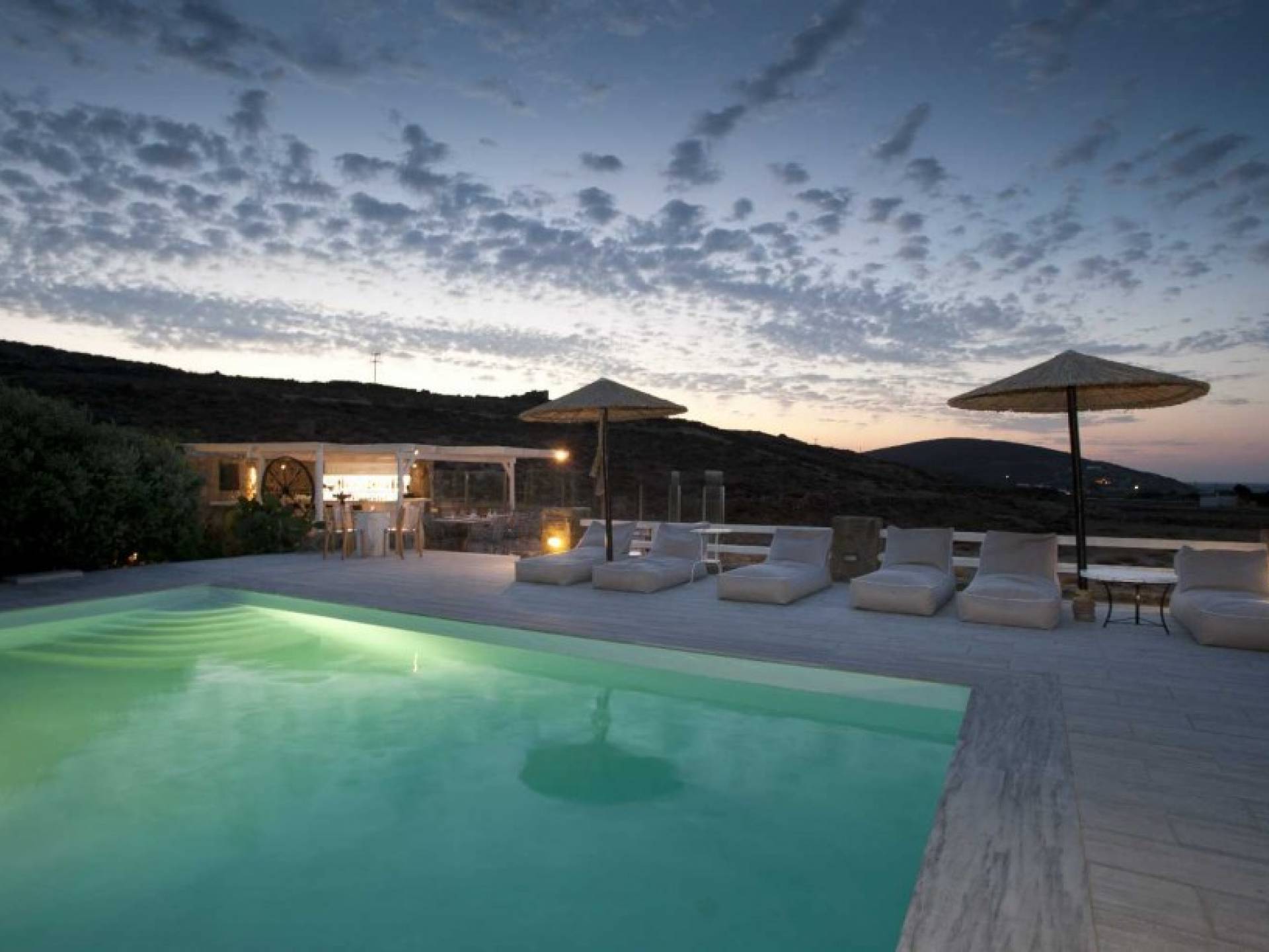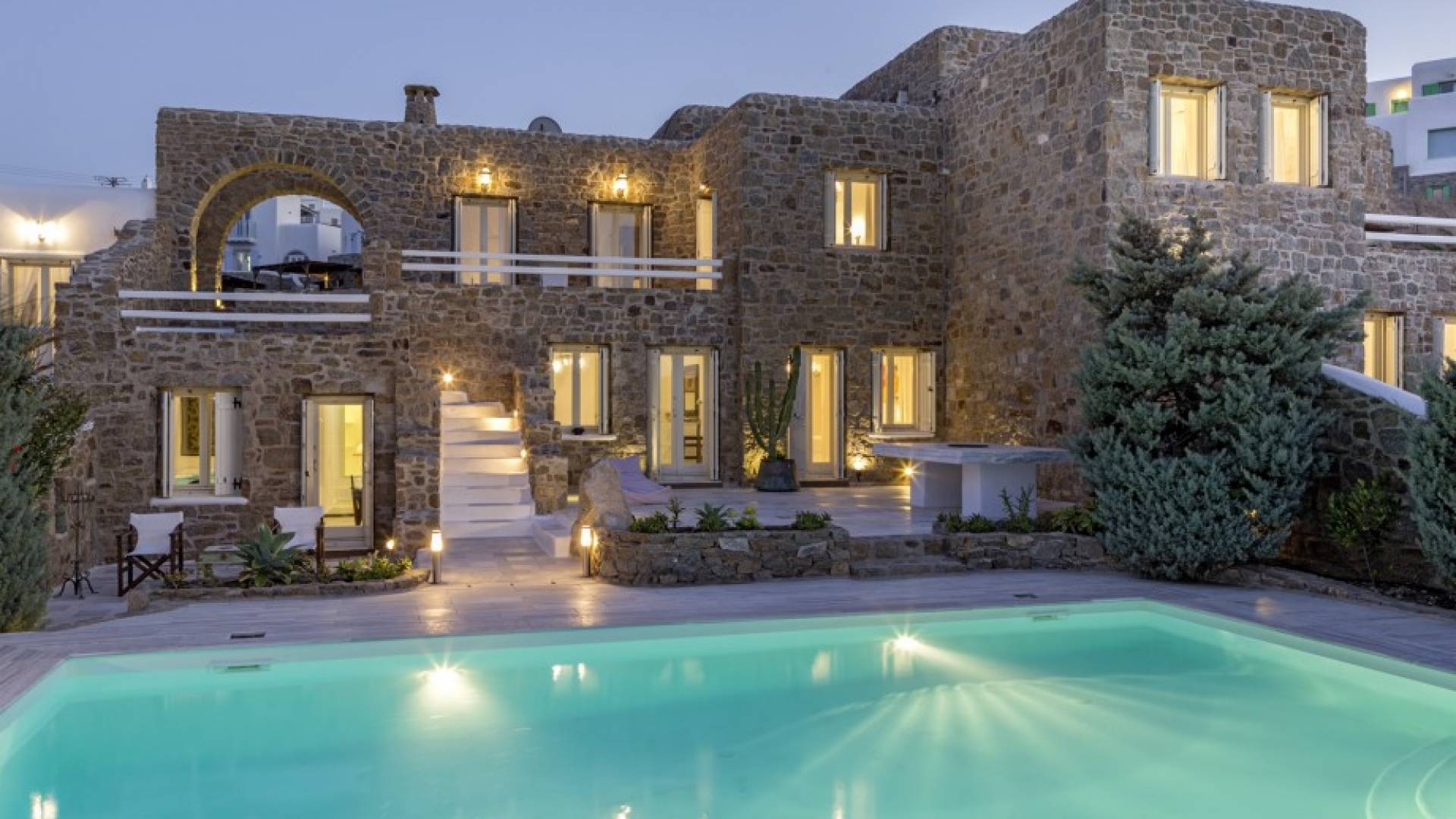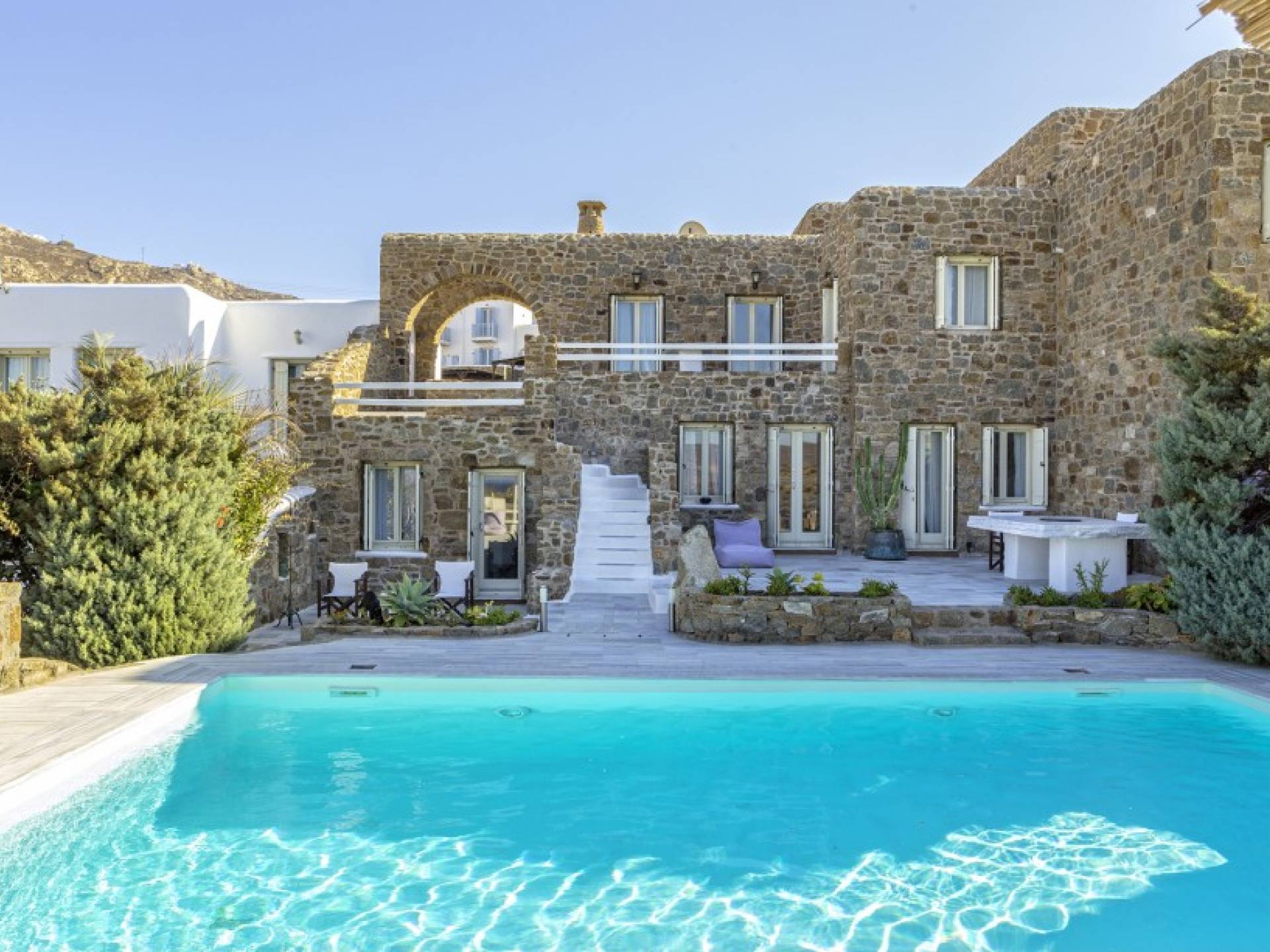 Located among fields above Ftelia Beach, Mykonos Dream Villas-three secluded, very large brand new 2009 built modern villas - offer fantastic sea & countryside views with guaranteed tranquility. The harmonious composition of stone, marble & wood creates the unique atmosphere of the outdoor area. Stone sills provide a certain degree of privacy among villas and residents. Inside, beautiful antique pieces, paintings, arches, and silk-lined curtains decorate the many rooms with harmony and charm.