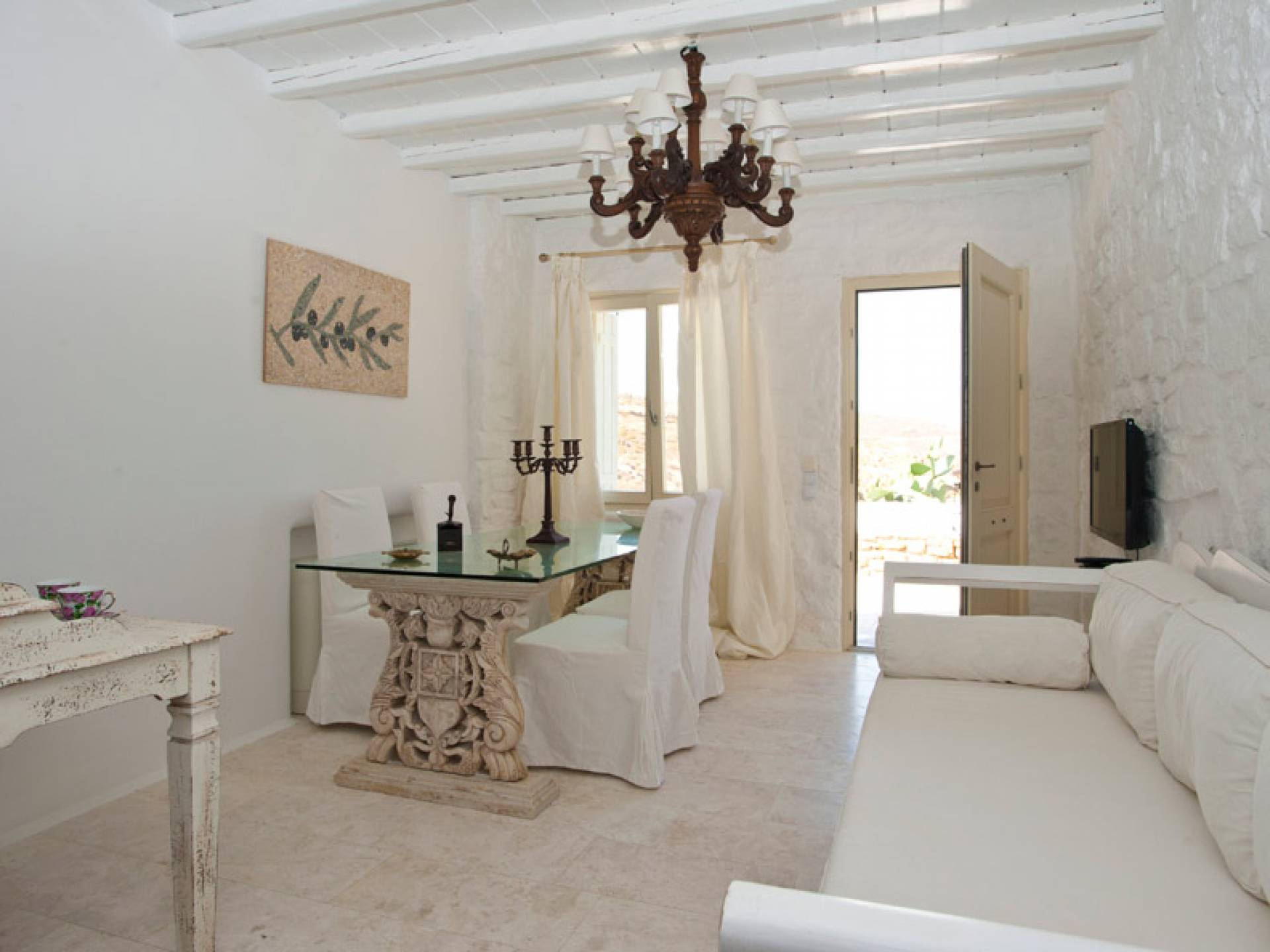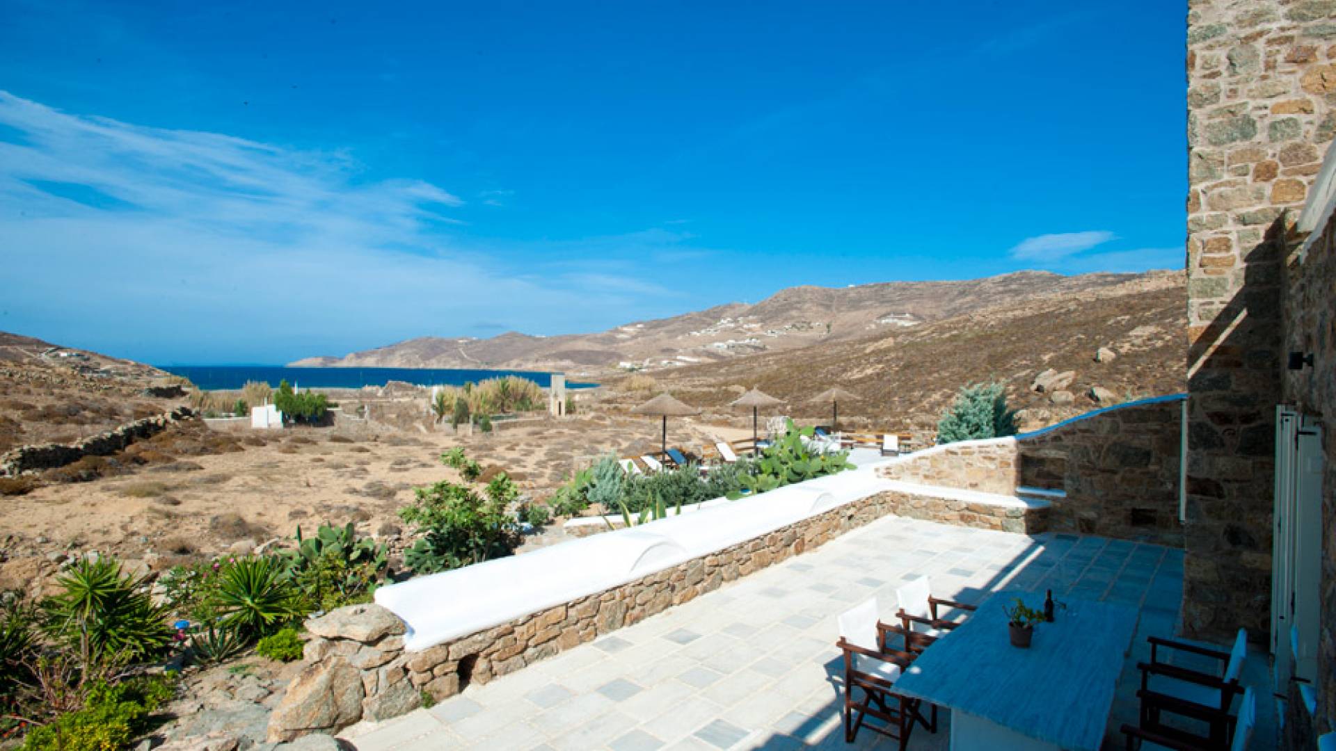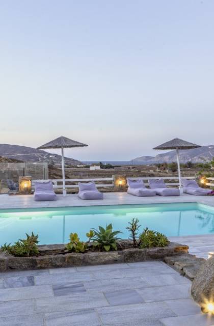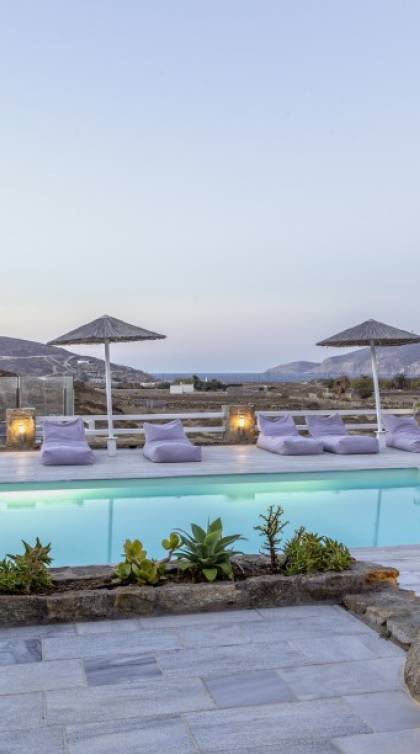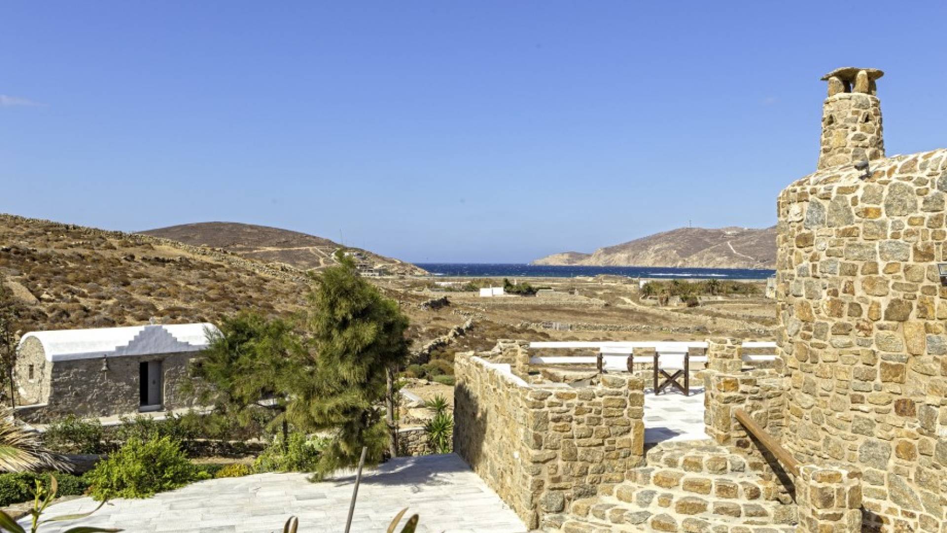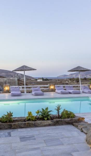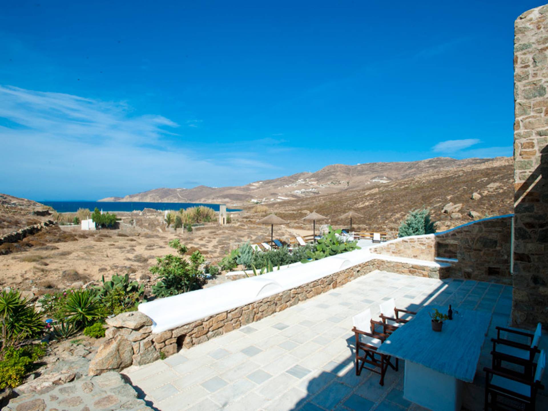 Located among fields above Ftelia Beach, Mykonos Dream Villas-three secluded, very large brand new 2009 built modern villas - offer fantastic sea & countryside views with guaranteed tranquility. The harmonious composition of stone, marble & wood creates the unique atmosphere of the outdoor area. Stone sills provide a certain degree of privacy among villas and residents. Inside, beautiful antique pieces, paintings, arches, and silk-lined curtains decorate the many rooms with harmony and charm.