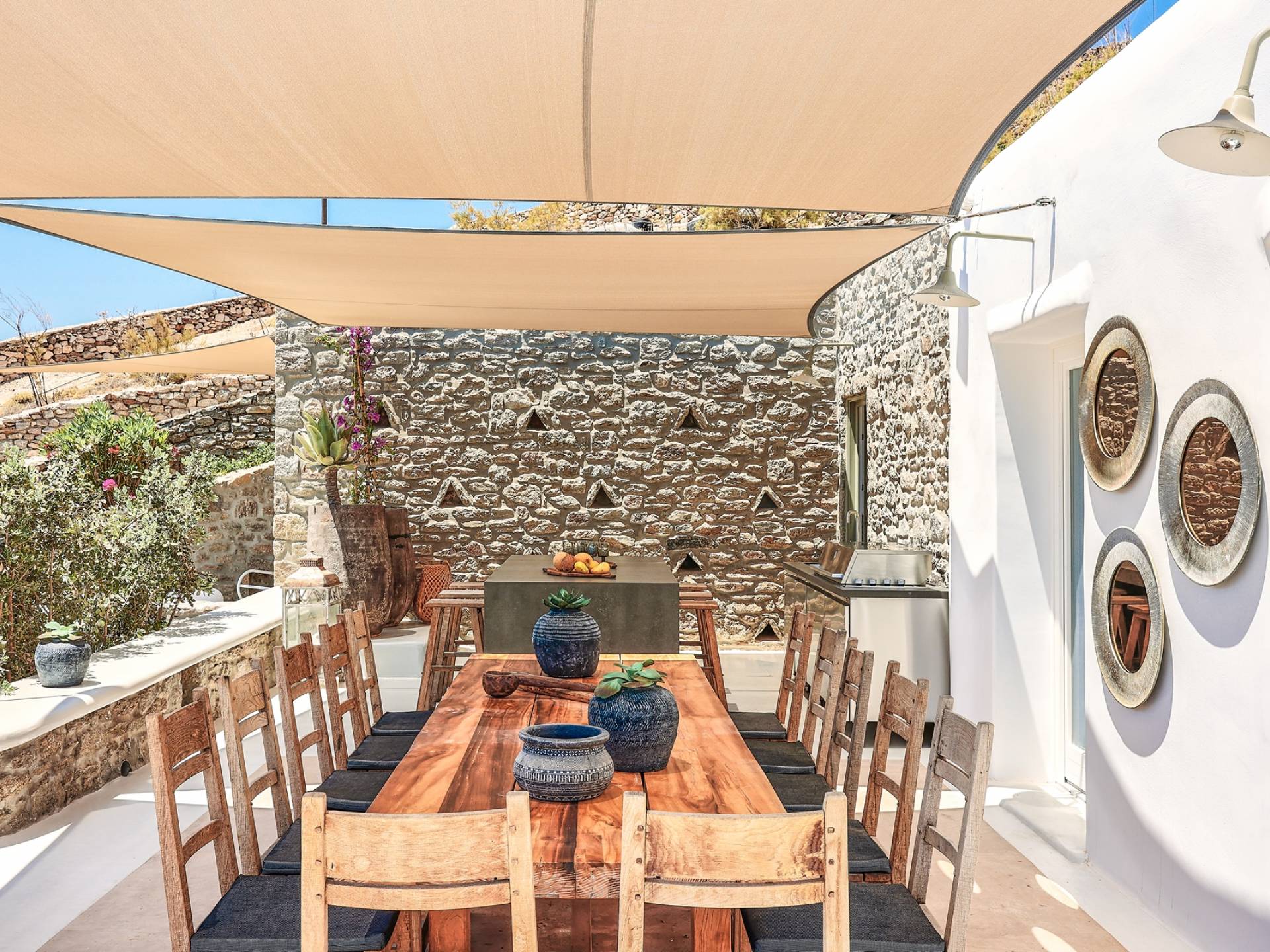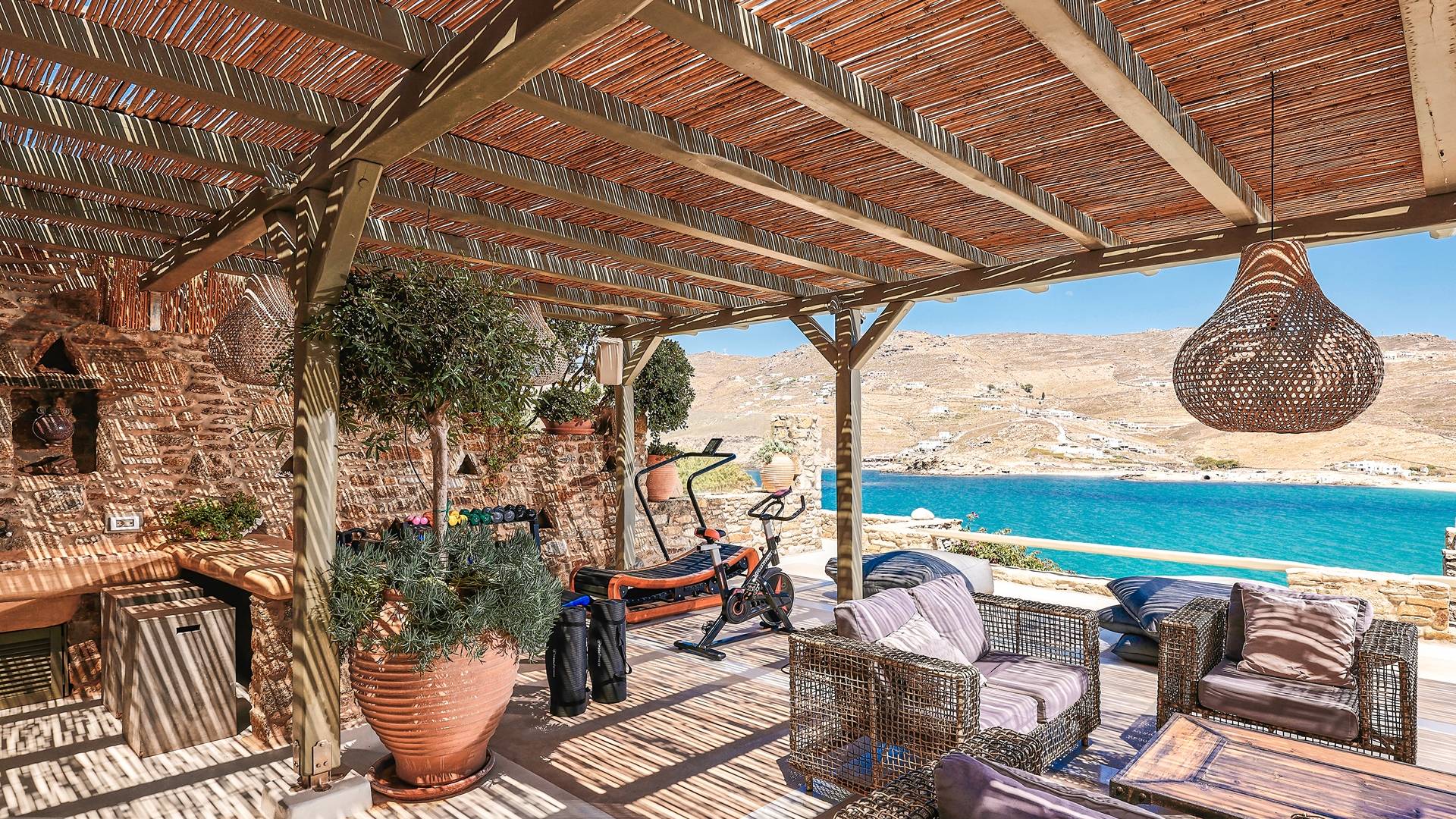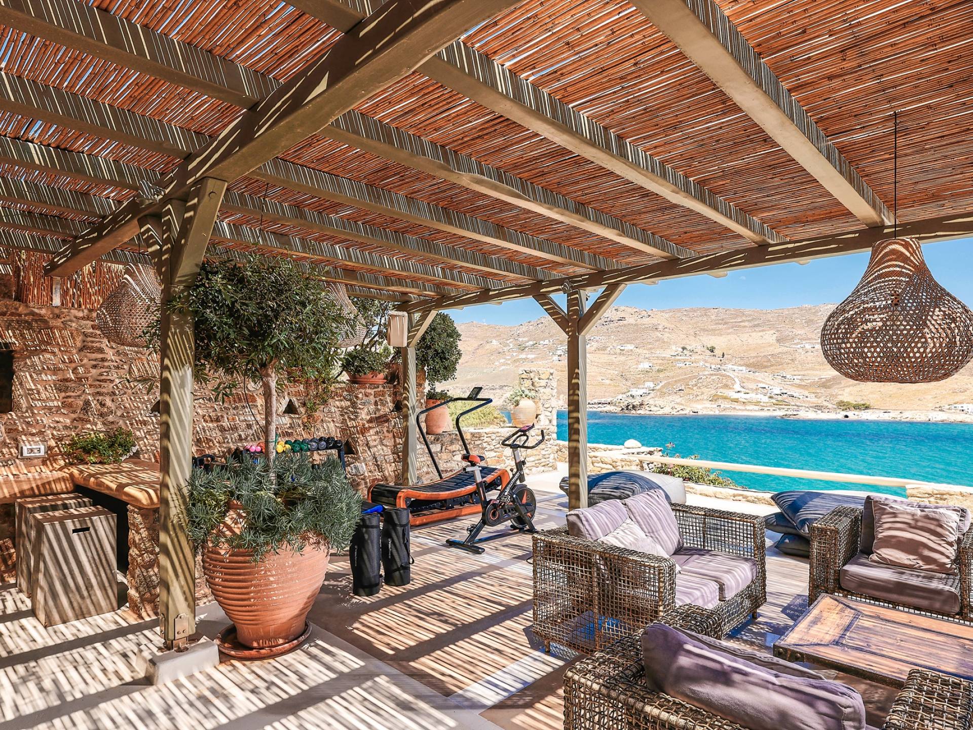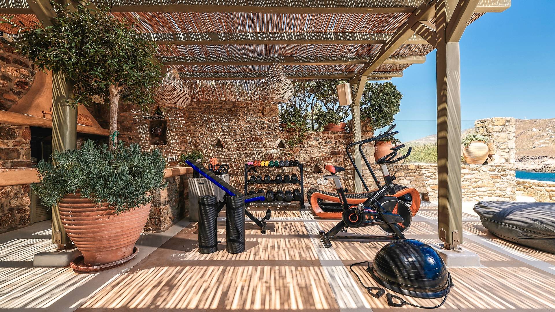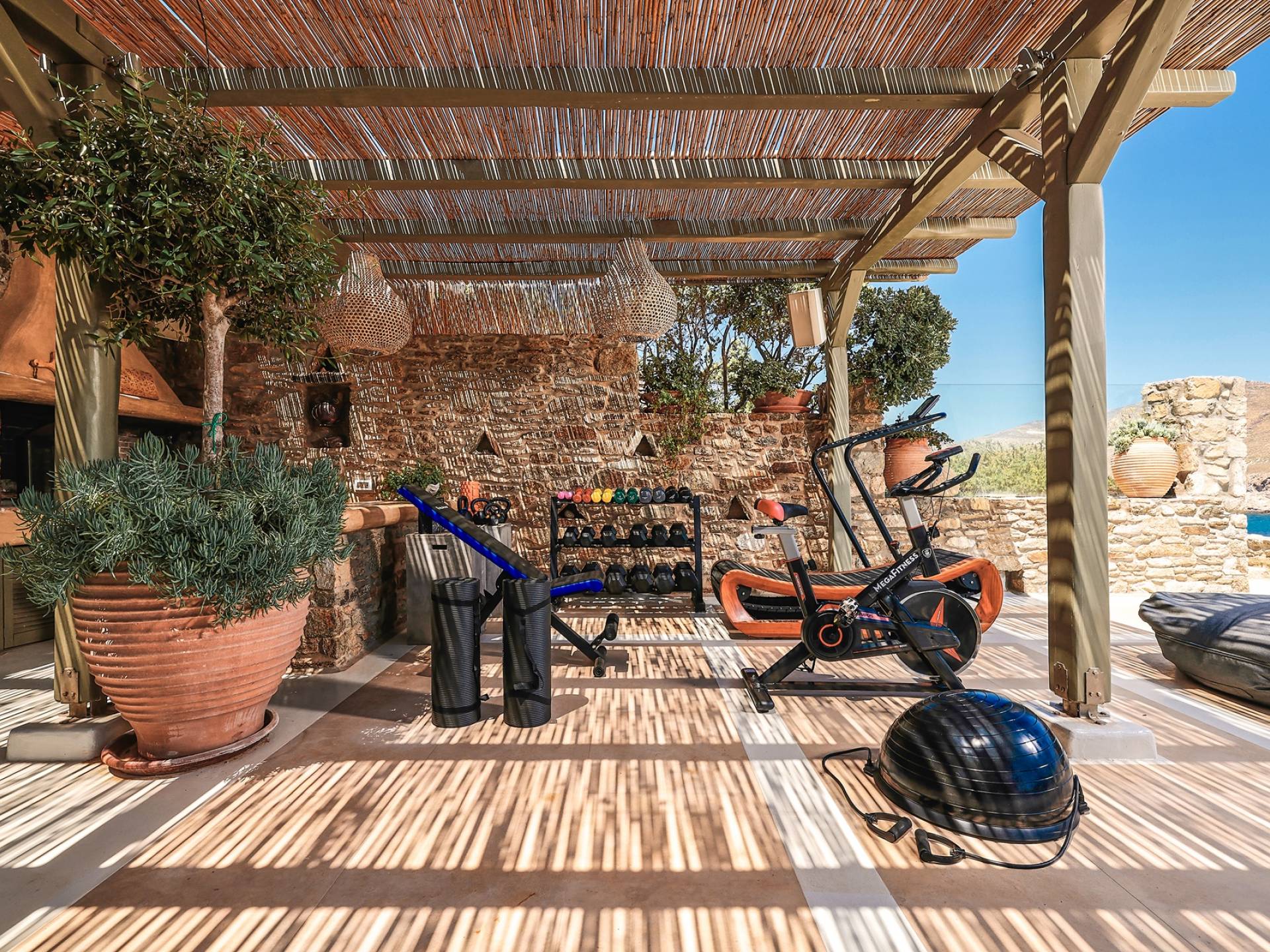 The villa praises traditional architecture, incorporating a mixture of stone and concrete, and is tastefully decorated with warm colors. At the same time, it invites guests to unwind in the multiple lounge areas and the BBQ/dining area of the expansive terrace and gives the opportunity to the most athletic ones to remain active at the outdoor gym area, while gazing at the crystal-clear Aegean waters.