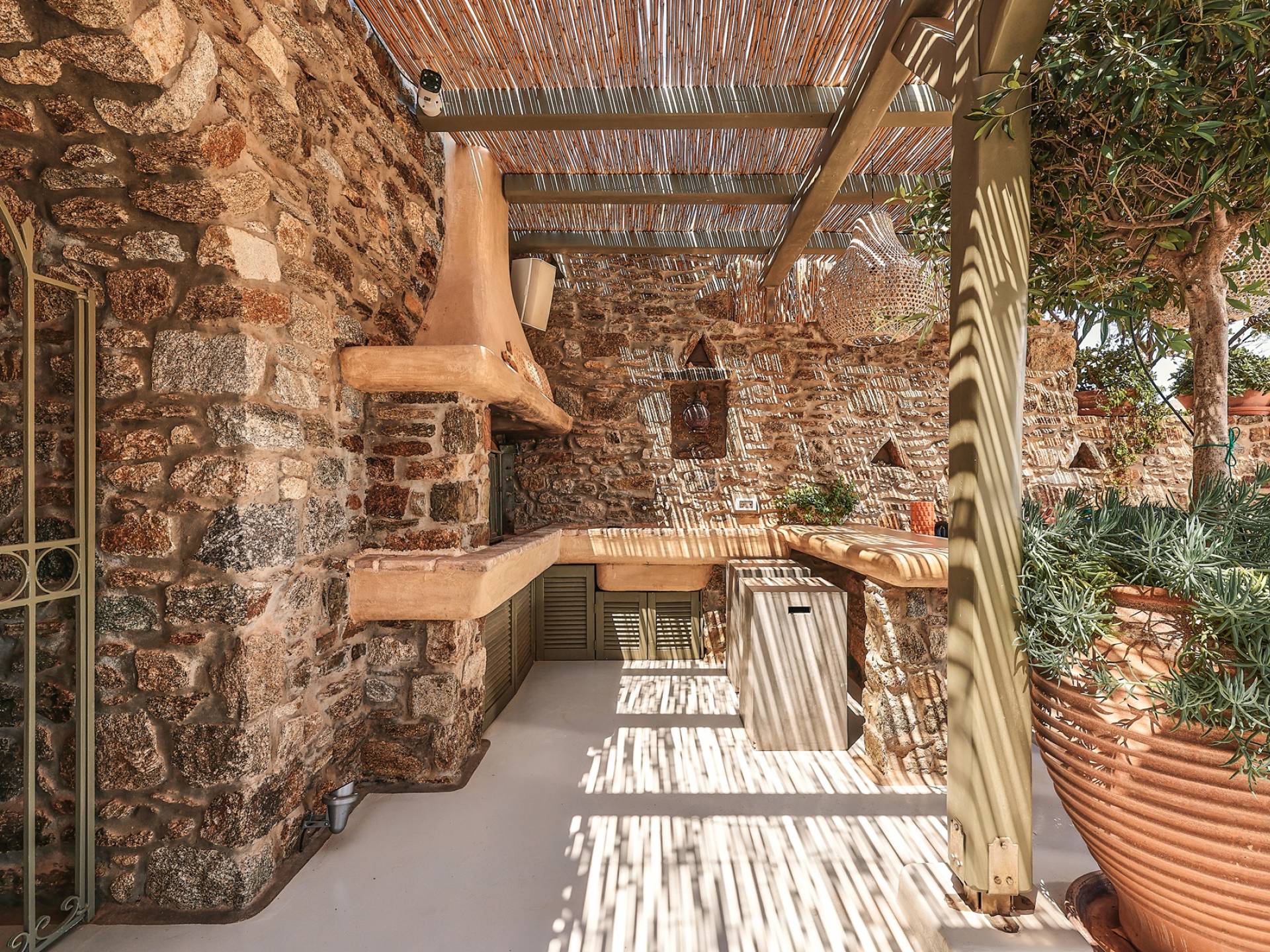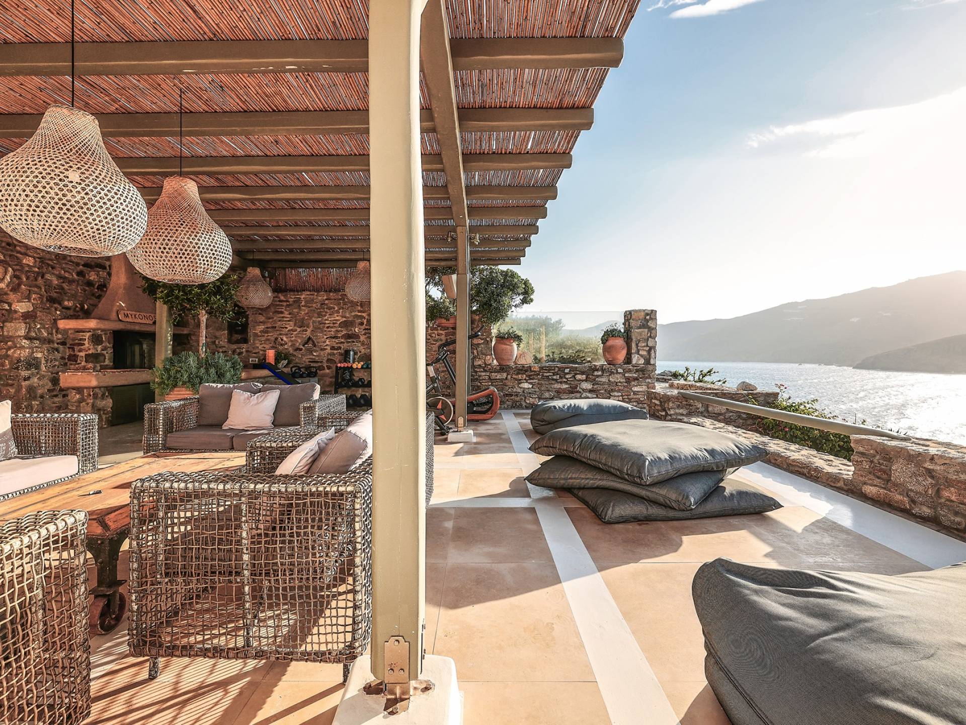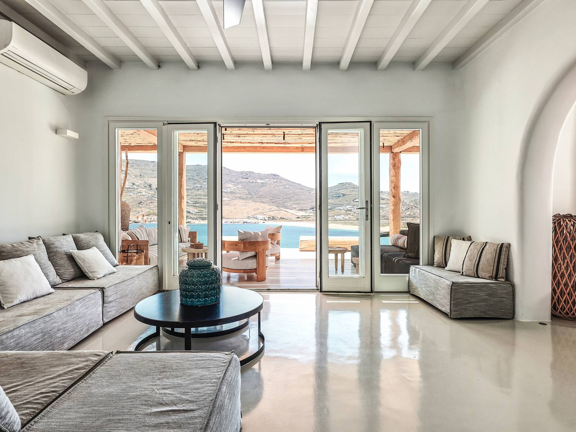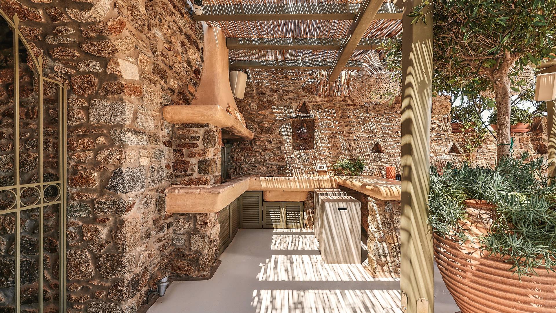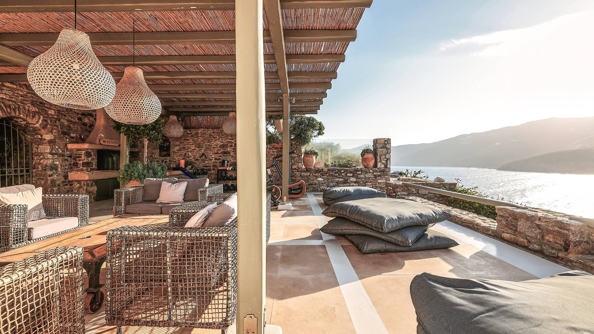 The villa praises traditional architecture, incorporating a mixture of stone and concrete, and is tastefully decorated with warm colors. At the same time, it invites guests to unwind in the multiple lounge areas and the BBQ/dining area of the expansive terrace and gives the opportunity to the most athletic ones to remain active at the outdoor gym area, while gazing at the crystal-clear Aegean waters.