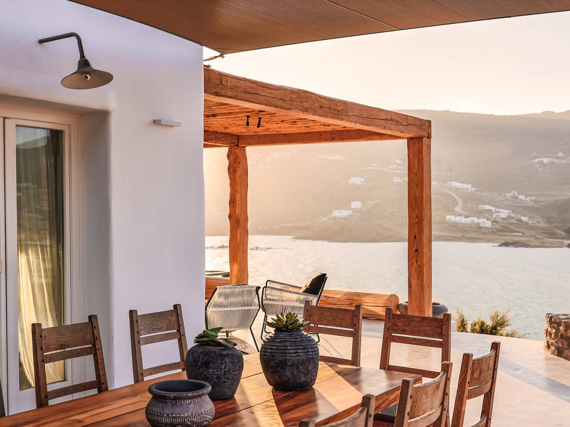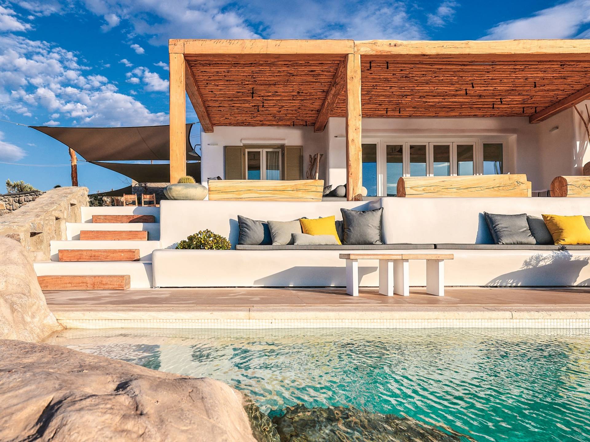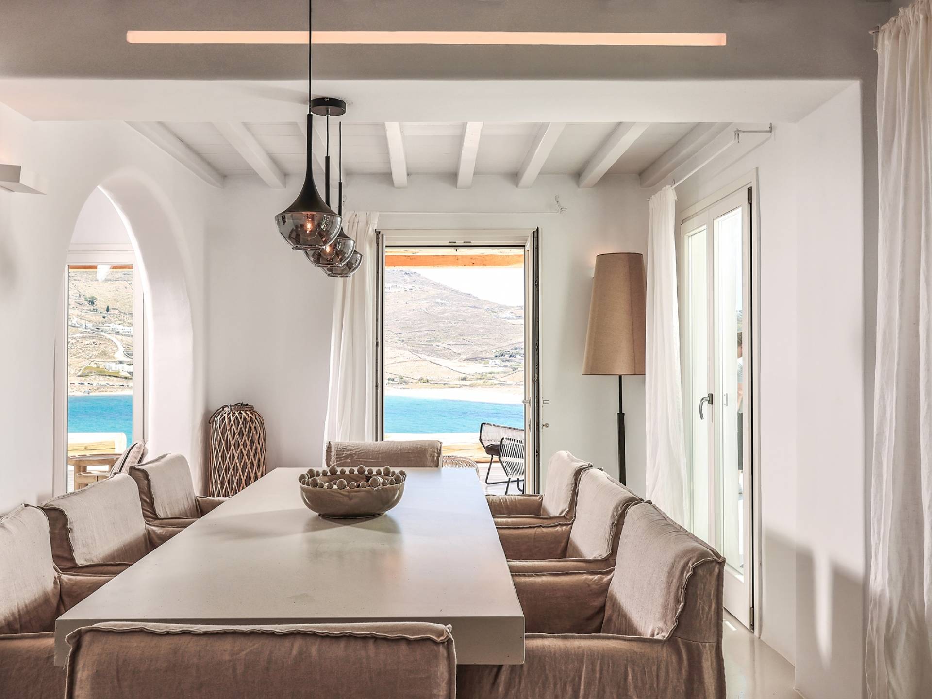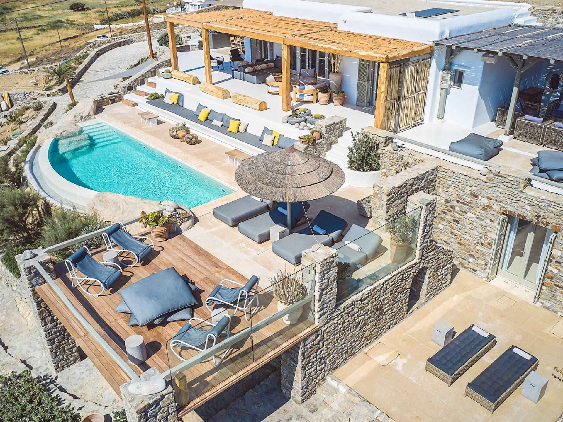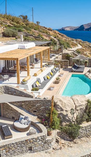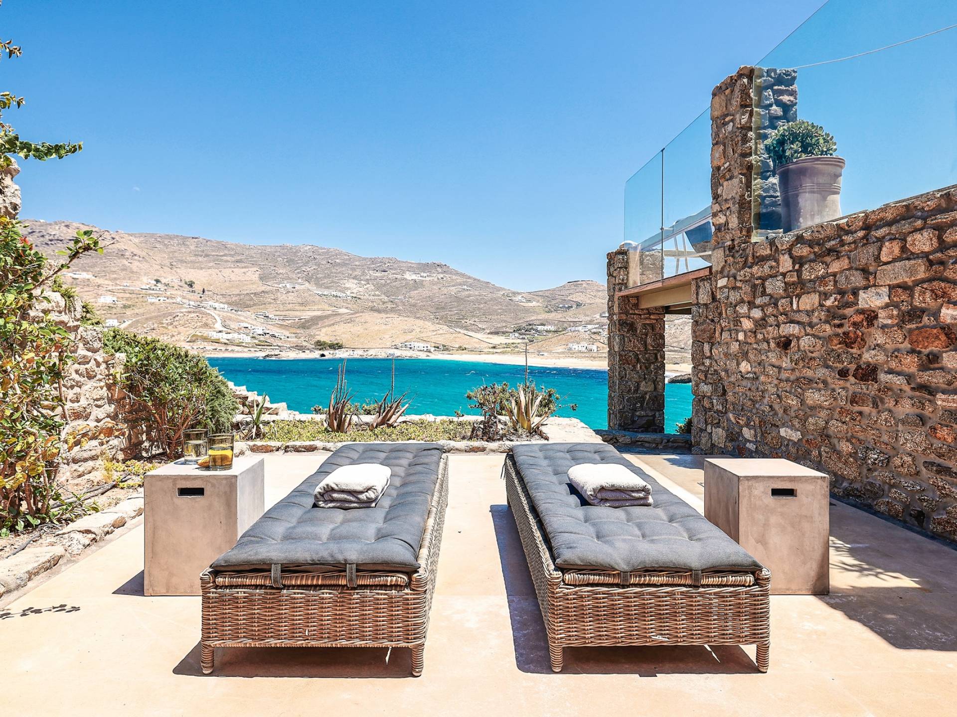 The villa praises traditional architecture, incorporating a mixture of stone and concrete, and is tastefully decorated with warm colors. At the same time, it invites guests to unwind in the multiple lounge areas and the BBQ/dining area of the expansive terrace and gives the opportunity to the most athletic ones to remain active at the outdoor gym area, while gazing at the crystal-clear Aegean waters.