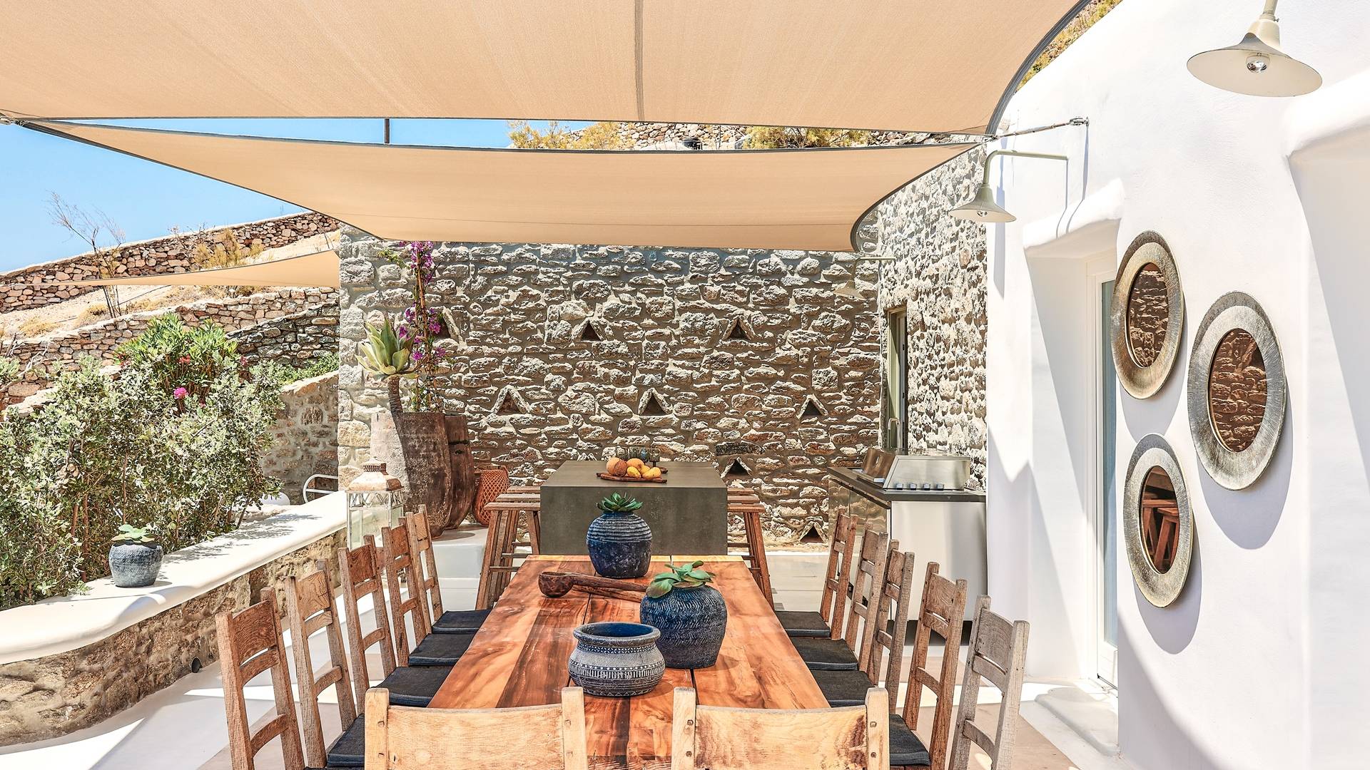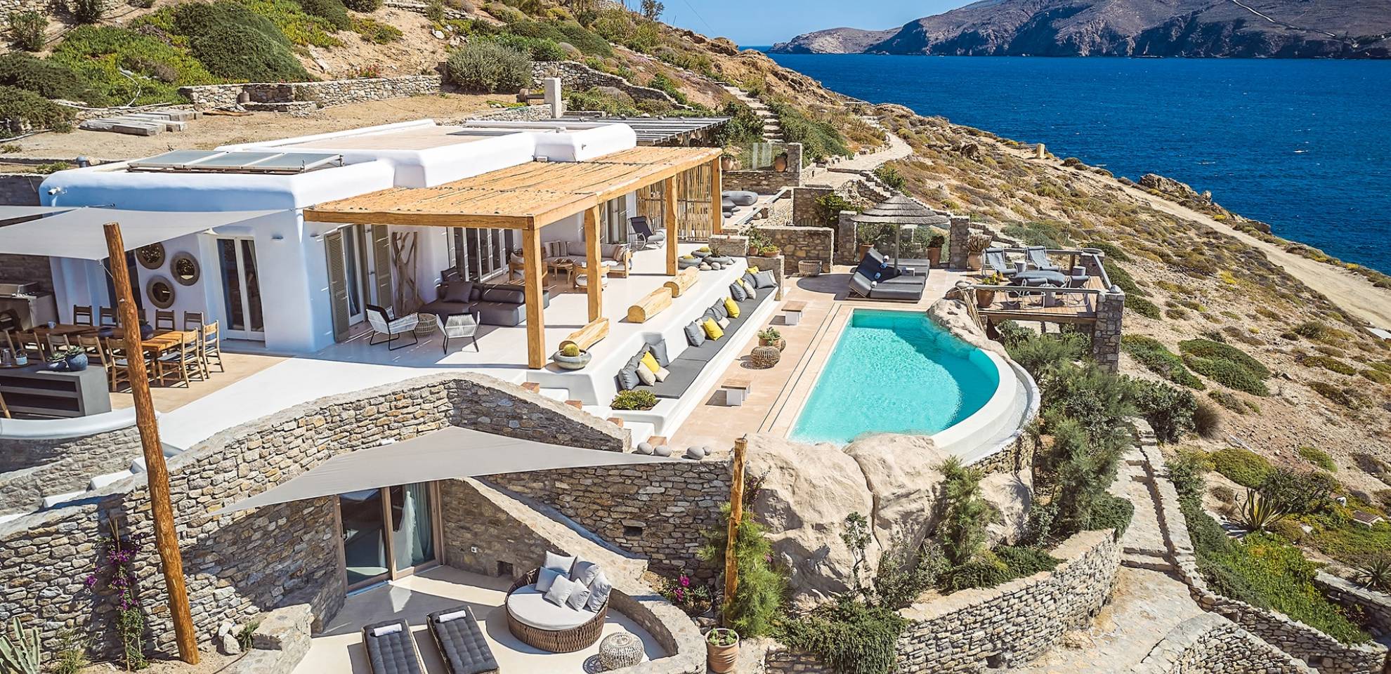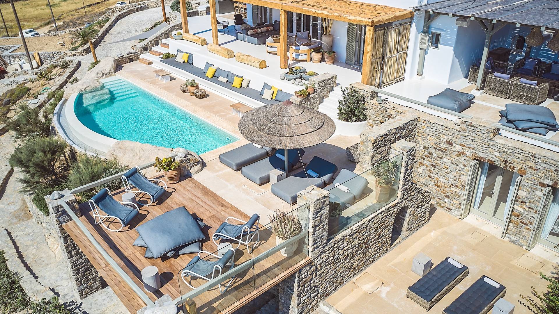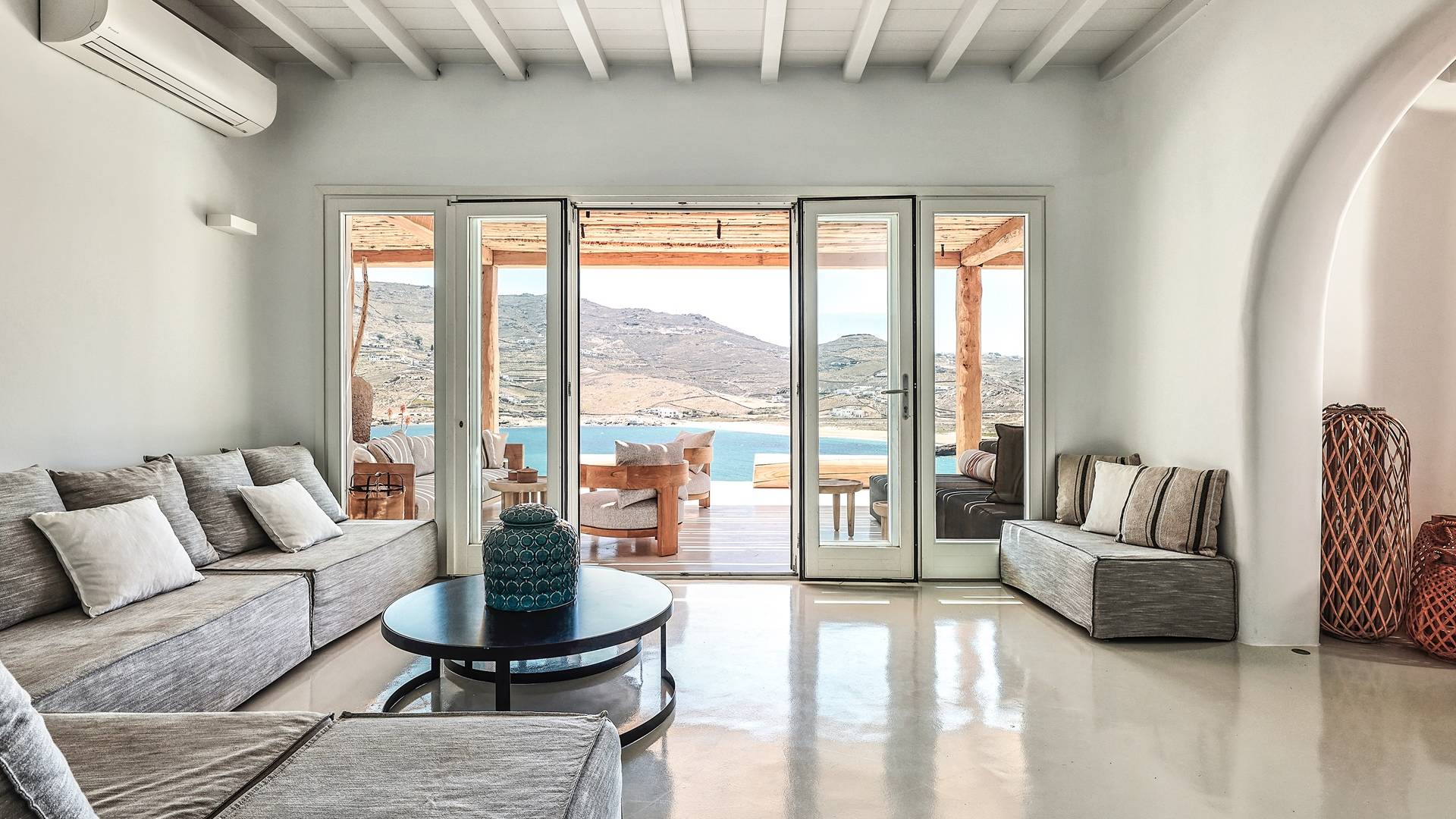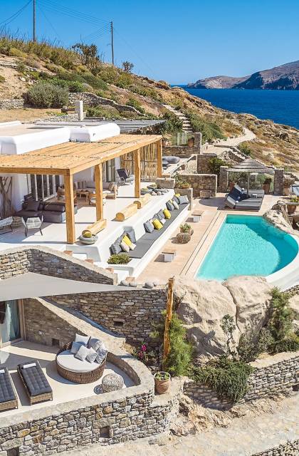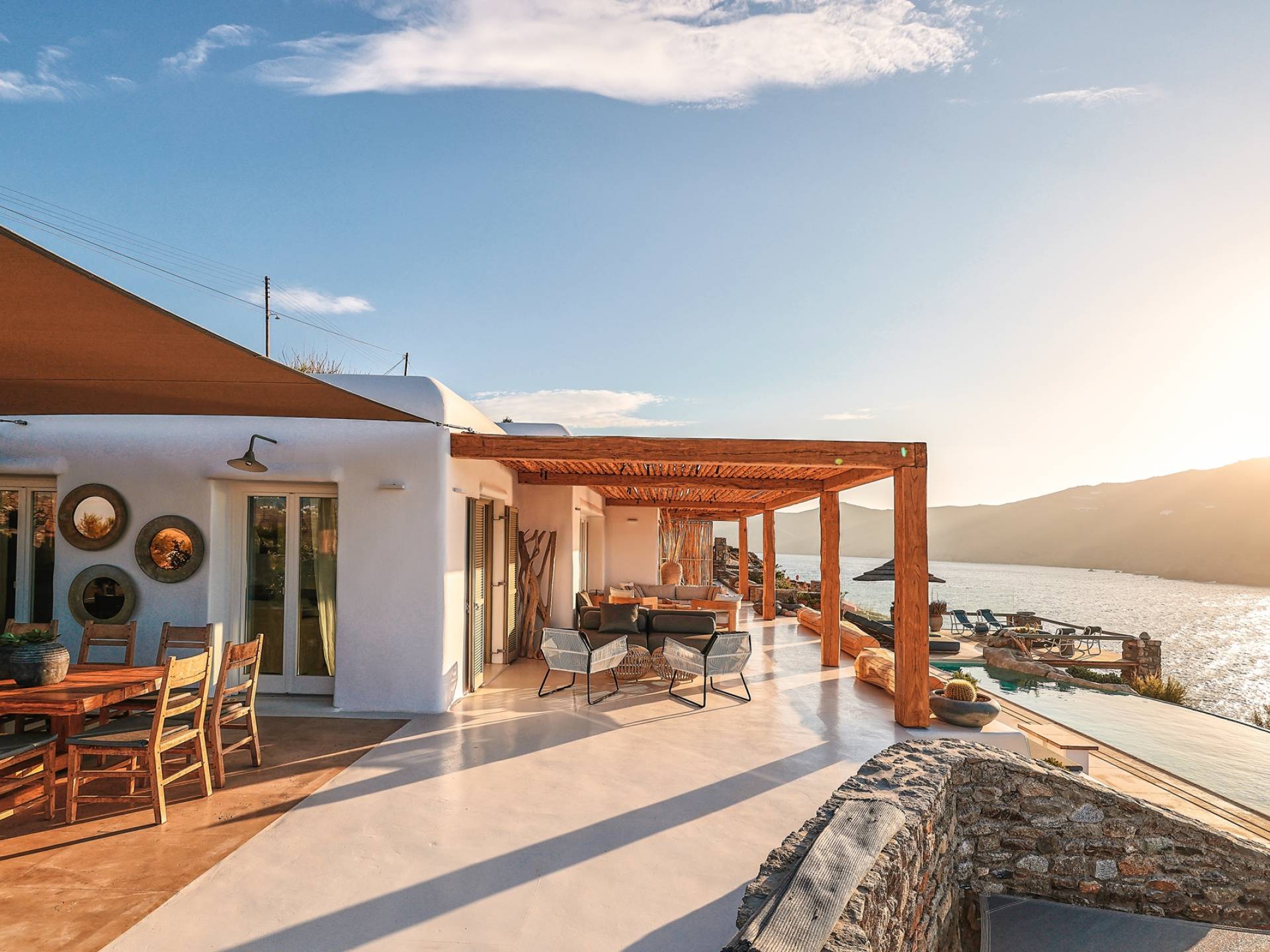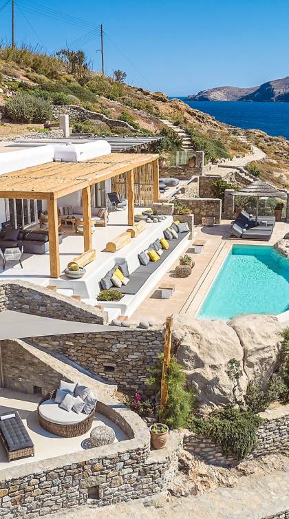 The villa praises traditional architecture, incorporating a mixture of stone and concrete, and is tastefully decorated with warm colors. At the same time, it invites guests to unwind in the multiple lounge areas and the BBQ/dining area of the expansive terrace and gives the opportunity to the most athletic ones to remain active at the outdoor gym area, while gazing at the crystal-clear Aegean waters.