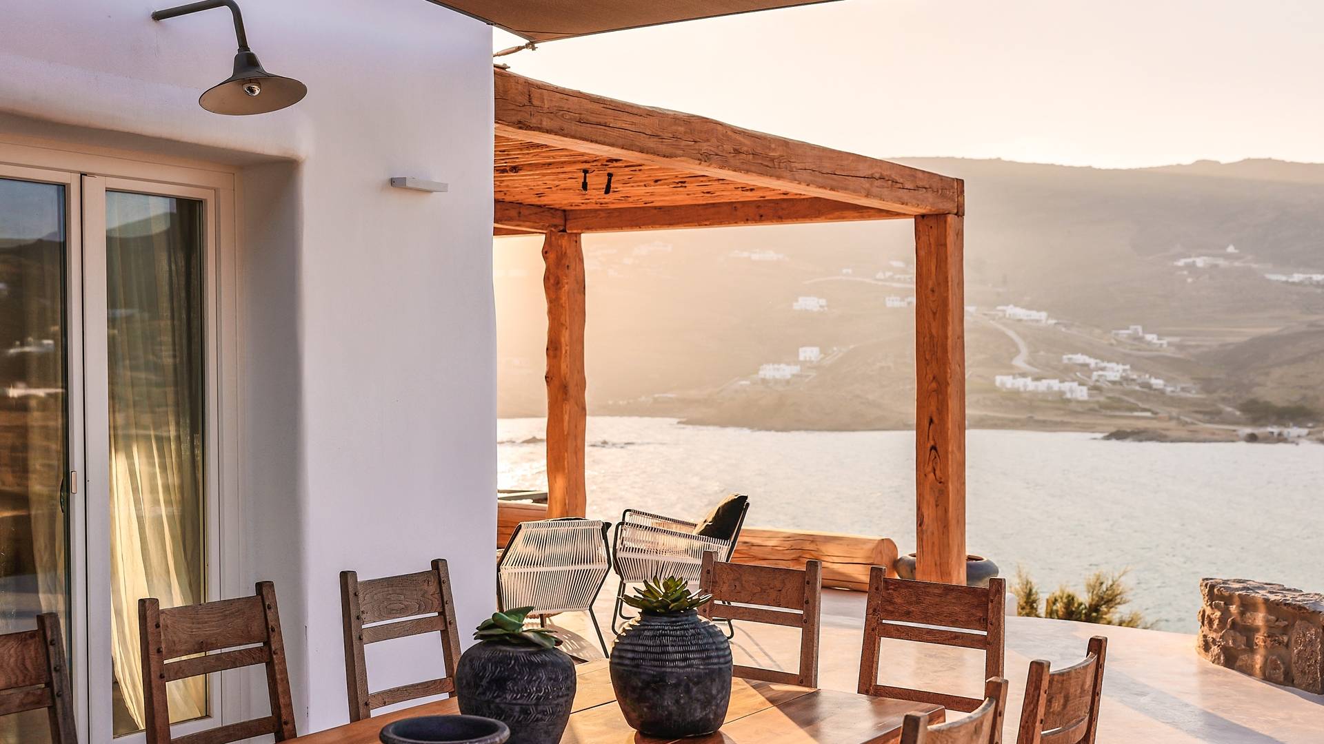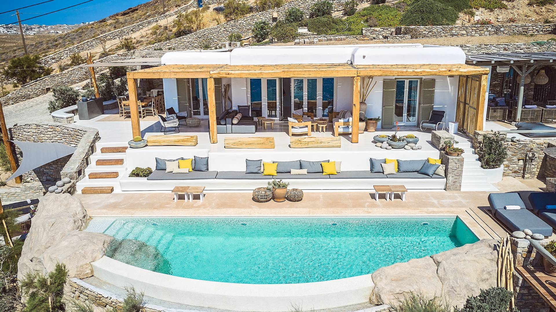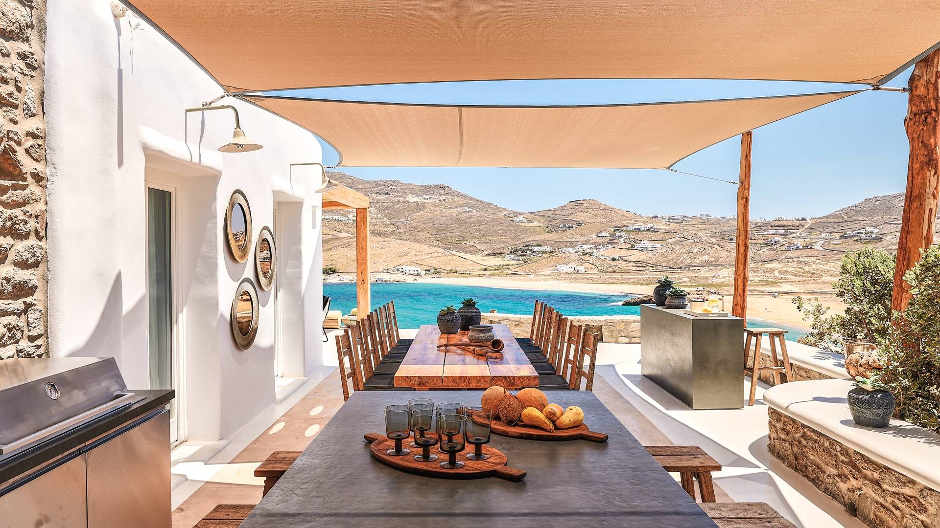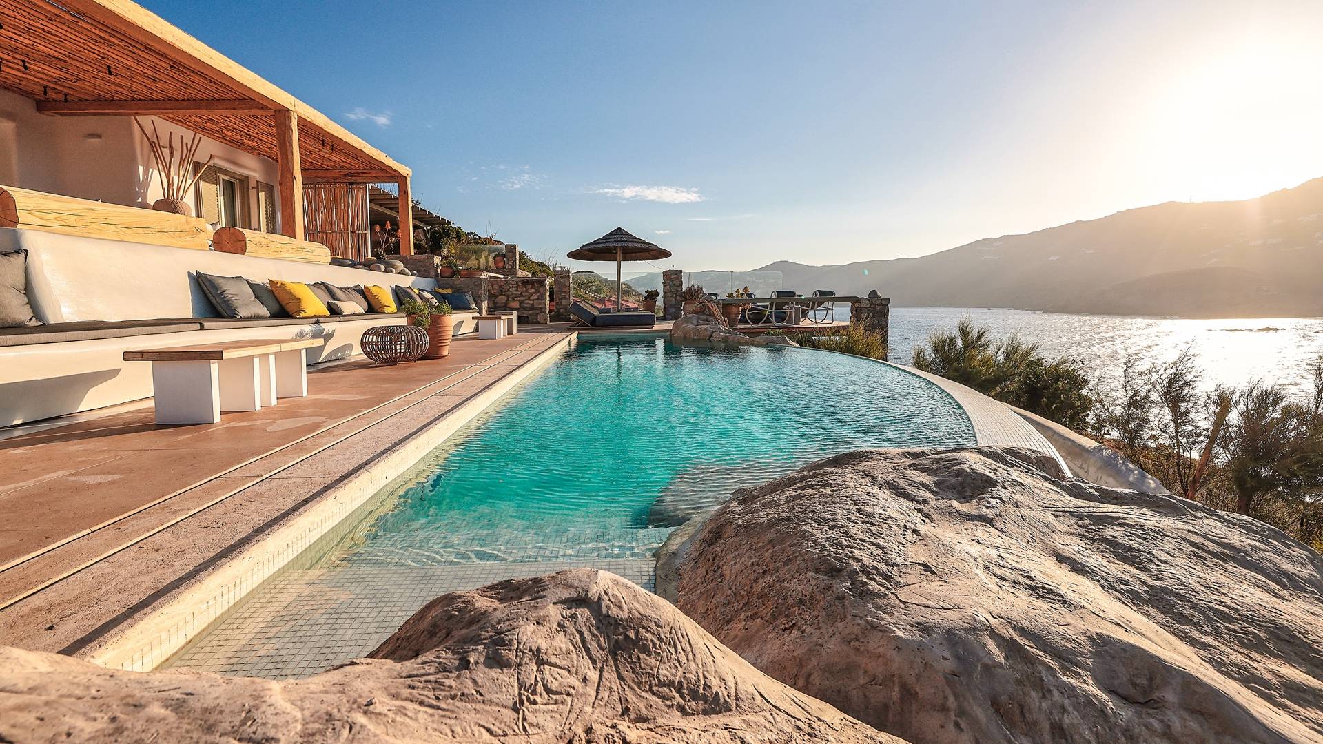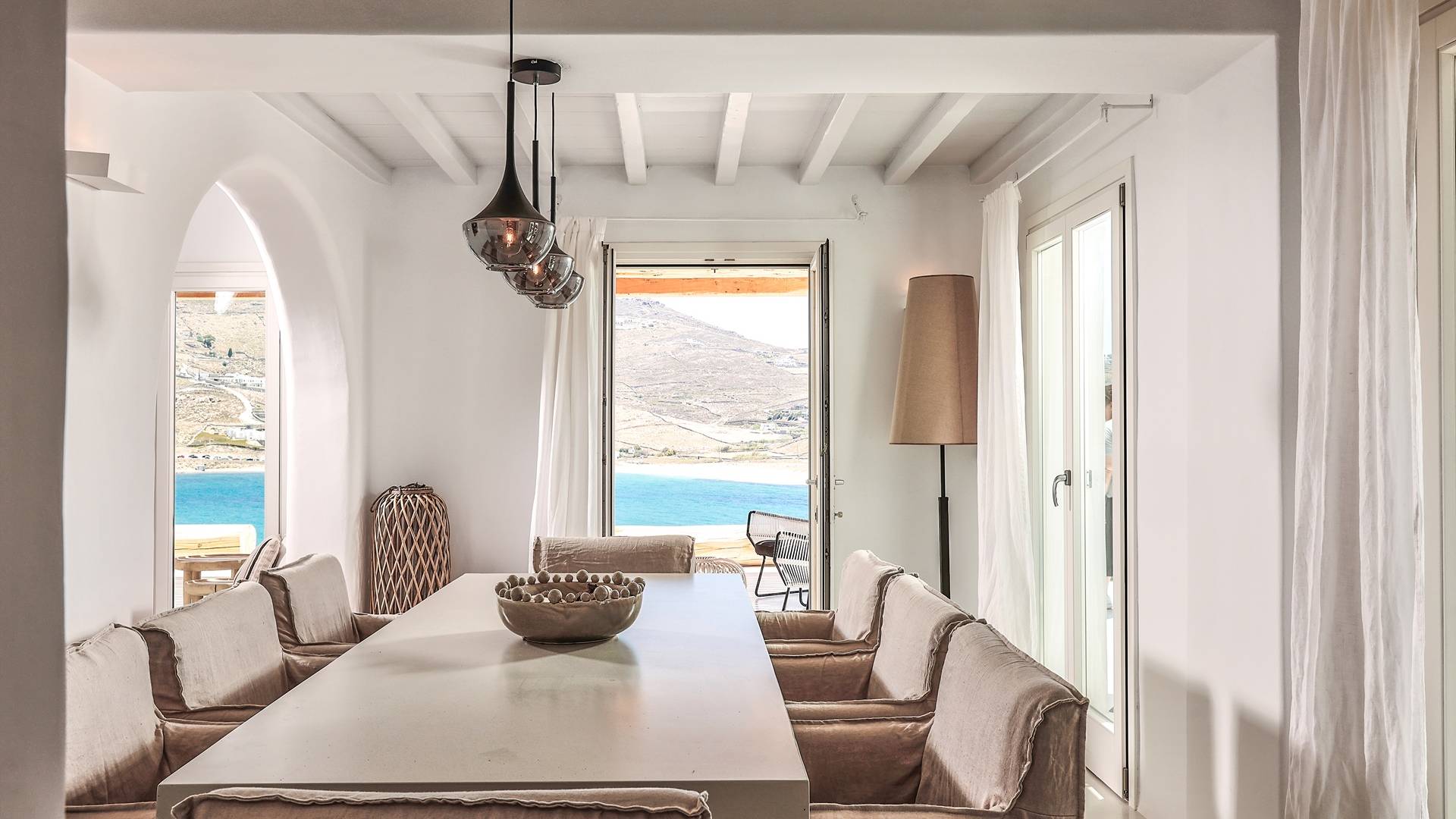 The villa praises traditional architecture, incorporating a mixture of stone and concrete, and is tastefully decorated with warm colors. At the same time, it invites guests to unwind in the multiple lounge areas and the BBQ/dining area of the expansive terrace and gives the opportunity to the most athletic ones to remain active at the outdoor gym area, while gazing at the crystal-clear Aegean waters.