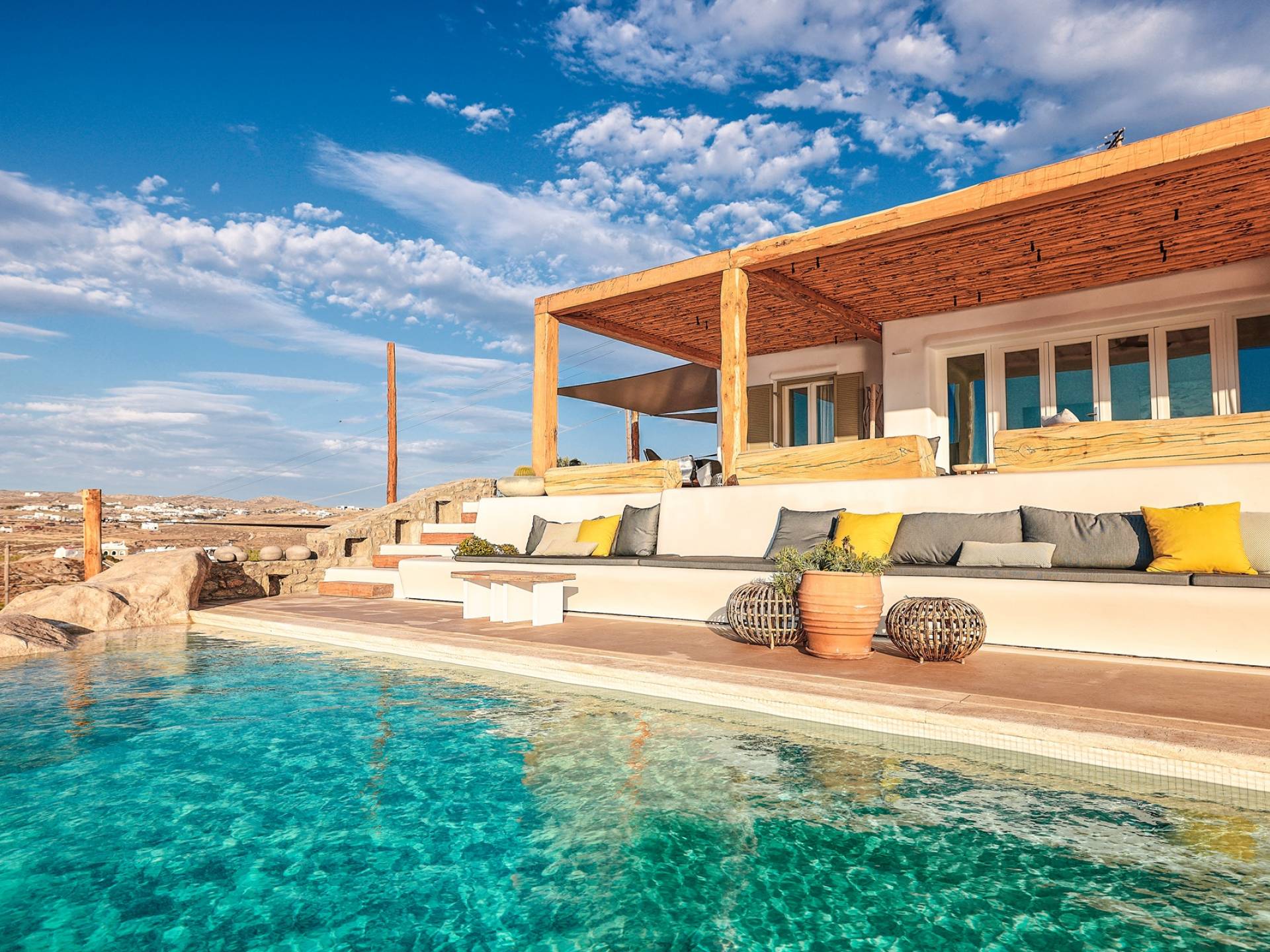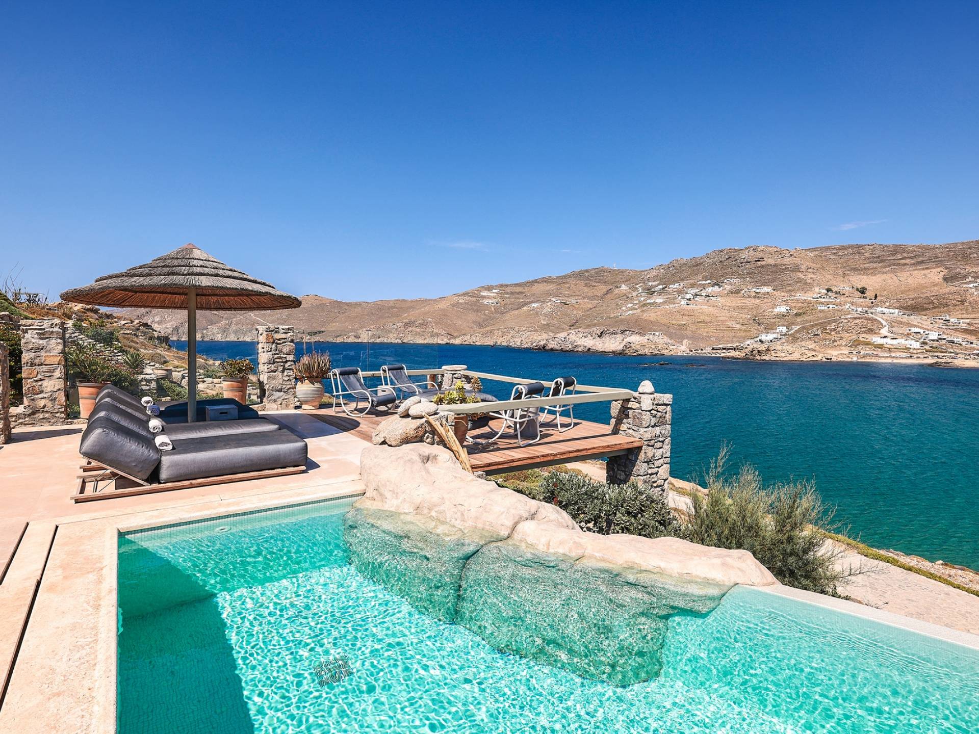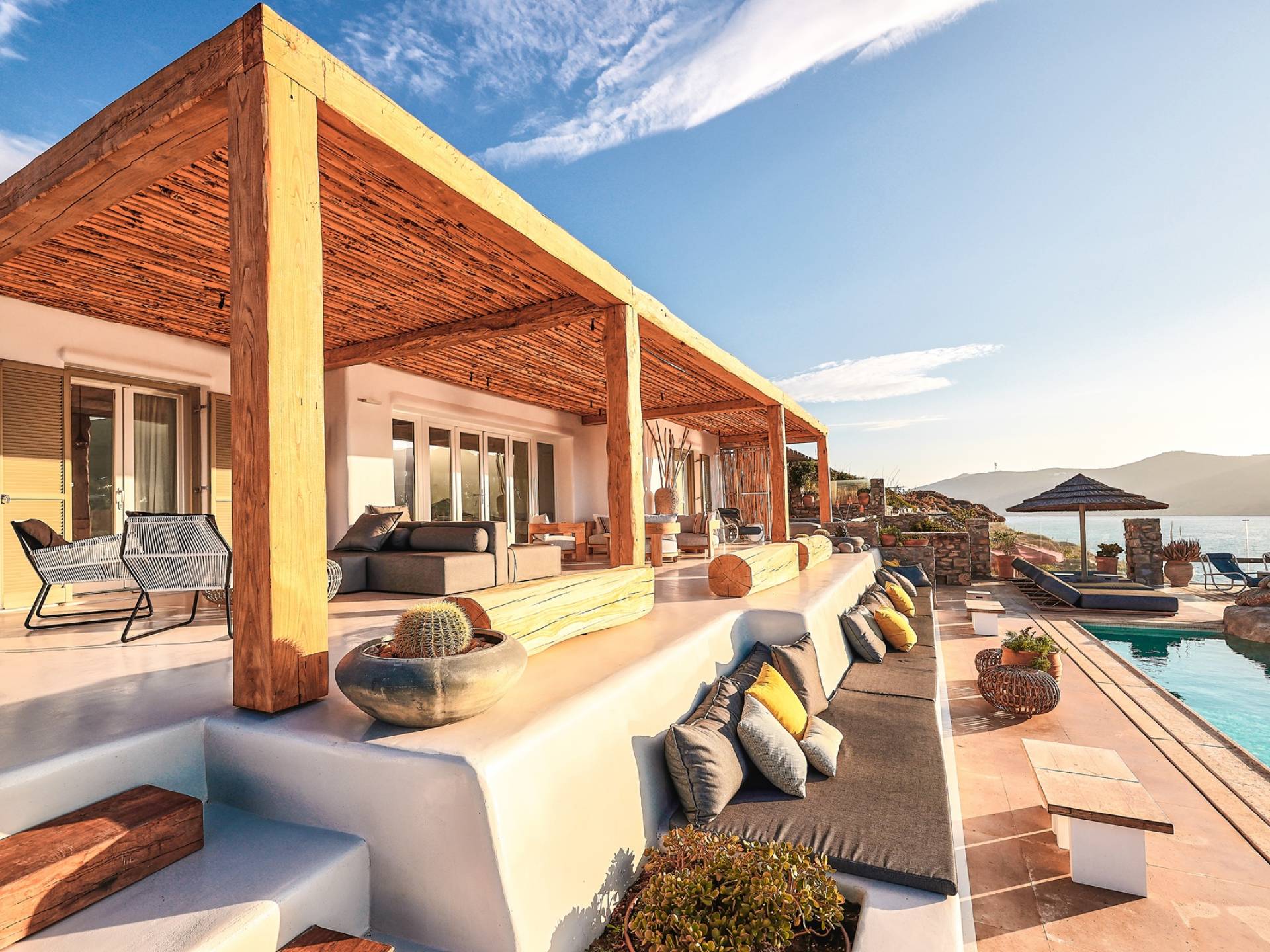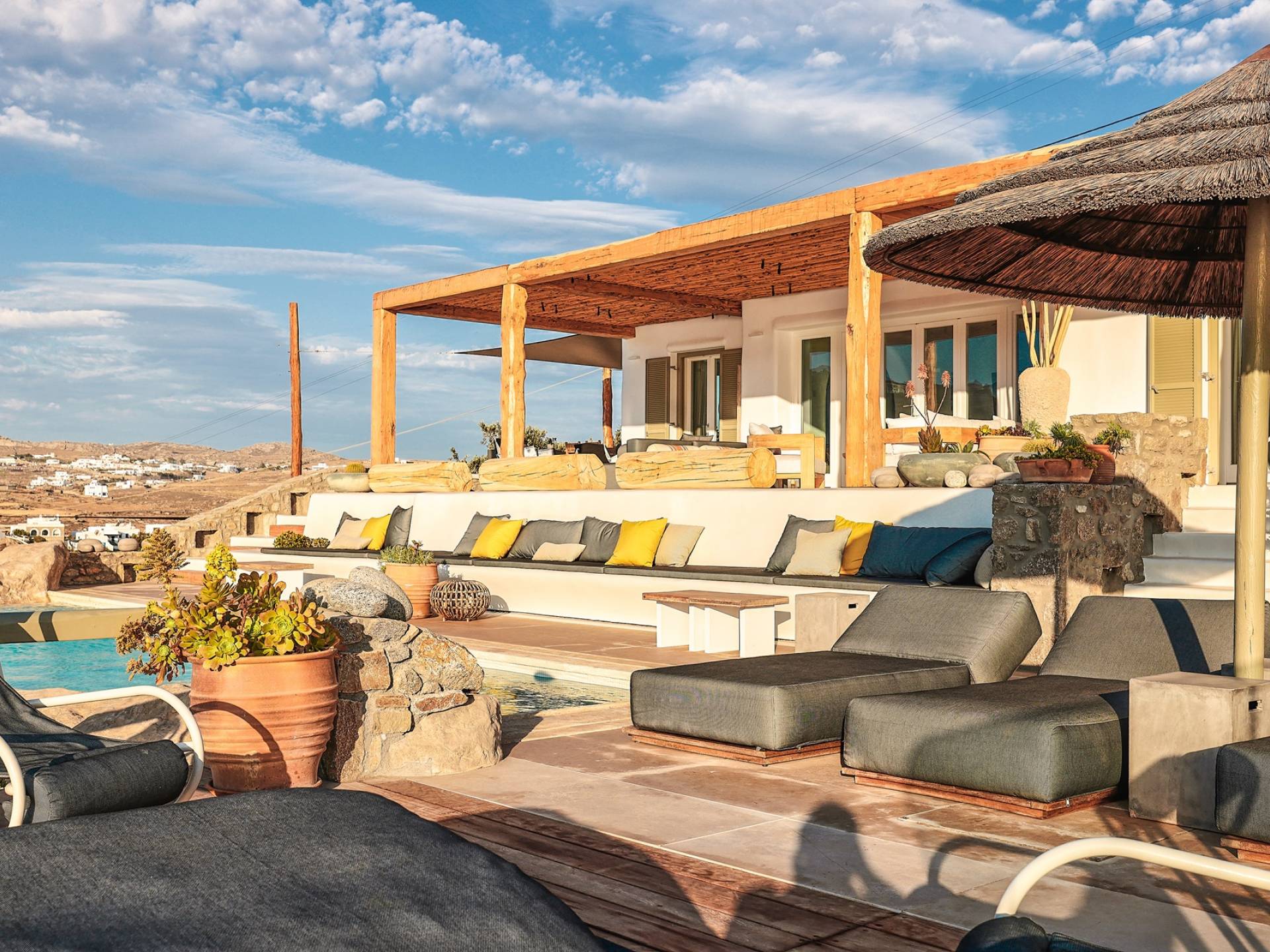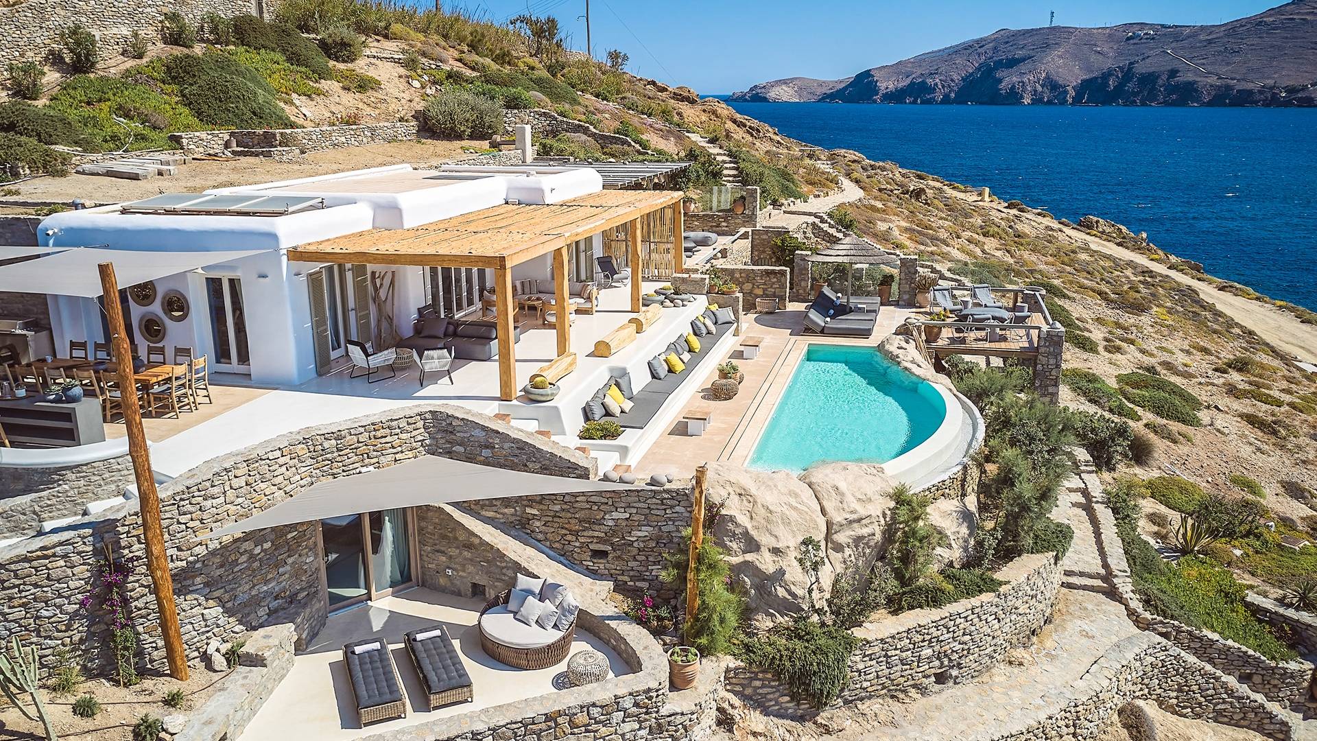 The villa praises traditional architecture, incorporating a mixture of stone and concrete, and is tastefully decorated with warm colors. At the same time, it invites guests to unwind in the multiple lounge areas and the BBQ/dining area of the expansive terrace and gives the opportunity to the most athletic ones to remain active at the outdoor gym area, while gazing at the crystal-clear Aegean waters.
