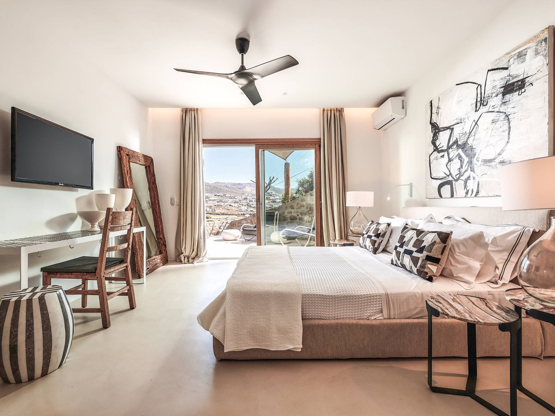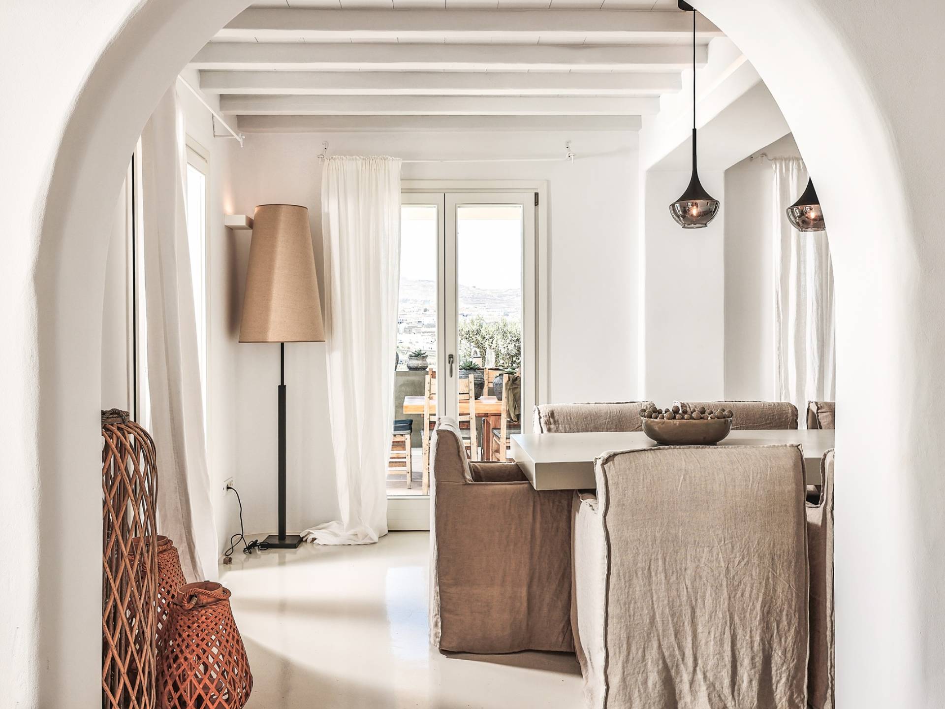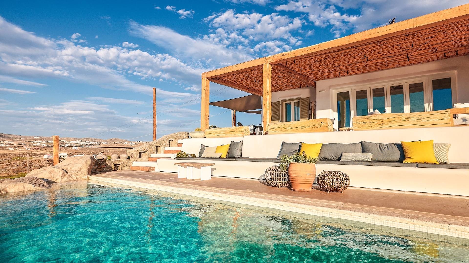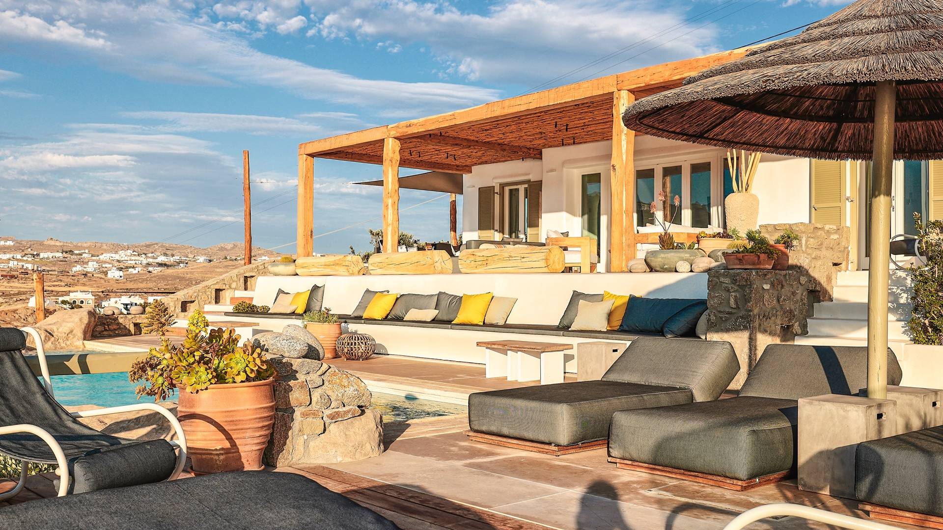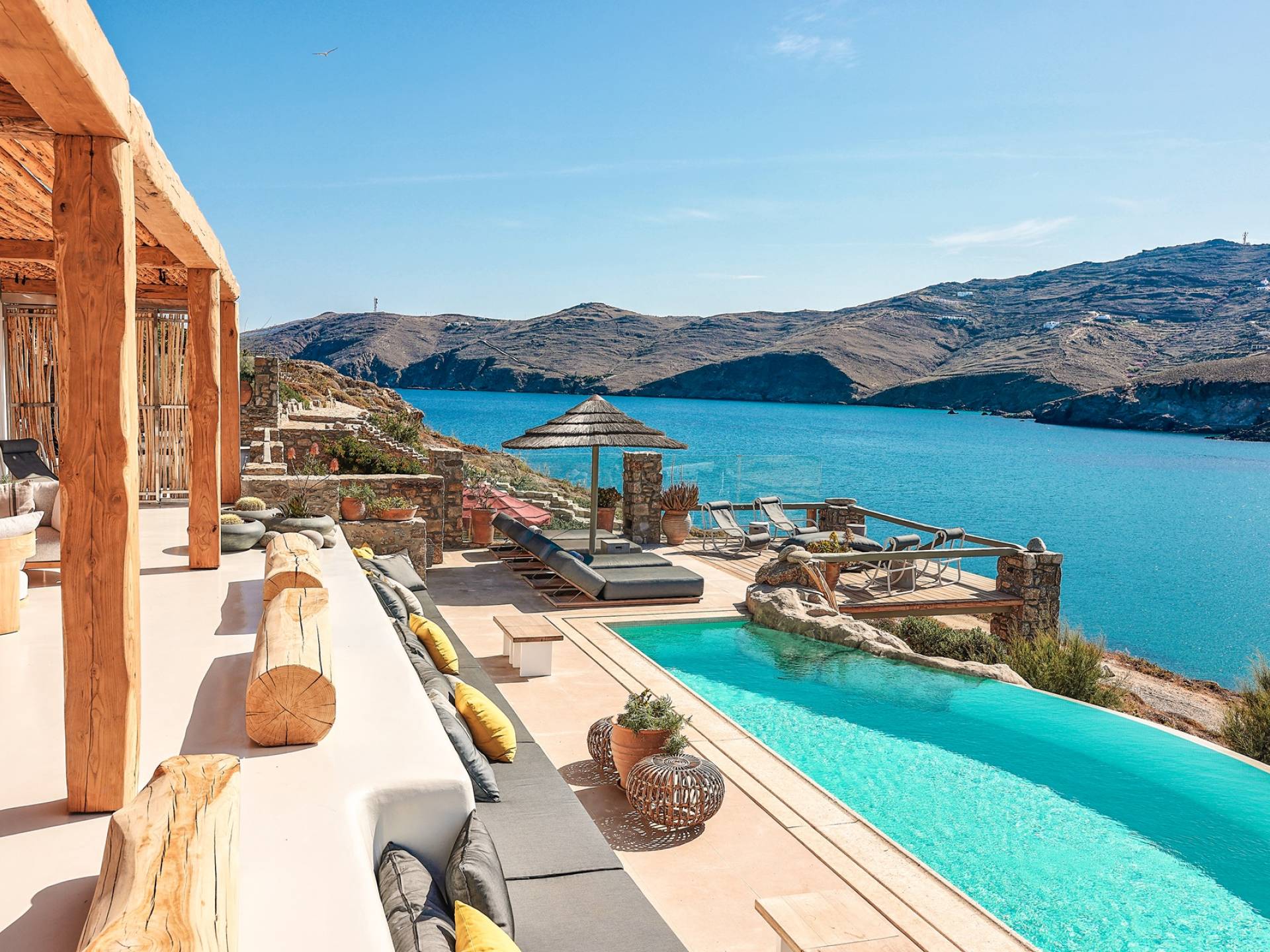 The villa praises traditional architecture, incorporating a mixture of stone and concrete, and is tastefully decorated with warm colors. At the same time, it invites guests to unwind in the multiple lounge areas and the BBQ/dining area of the expansive terrace and gives the opportunity to the most athletic ones to remain active at the outdoor gym area, while gazing at the crystal-clear Aegean waters.