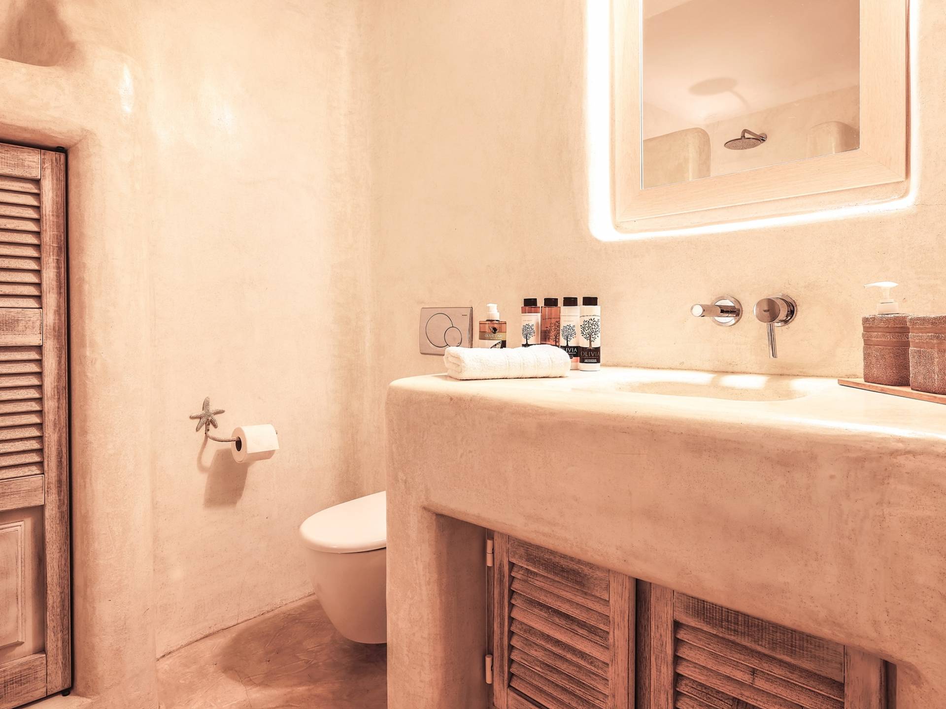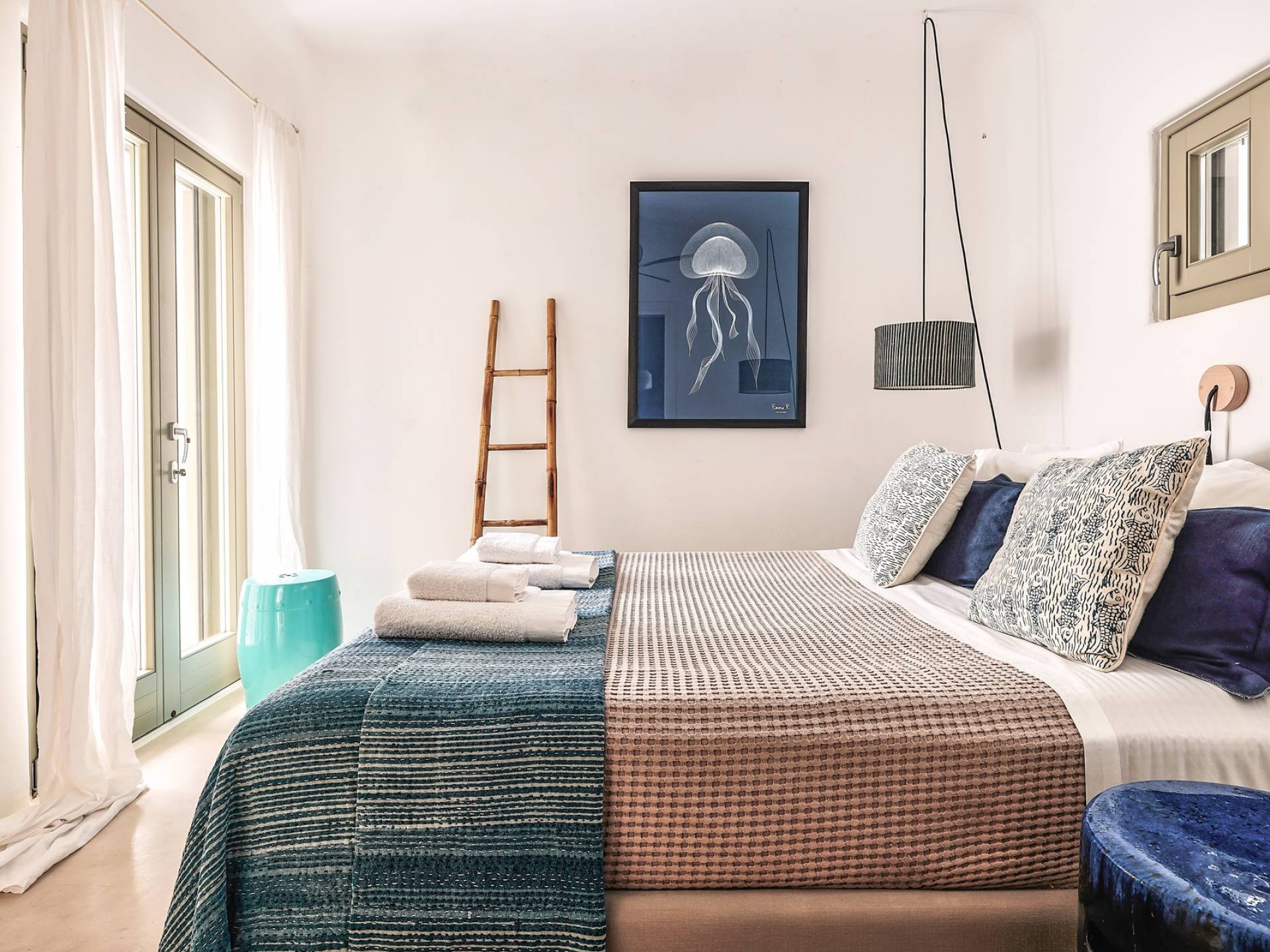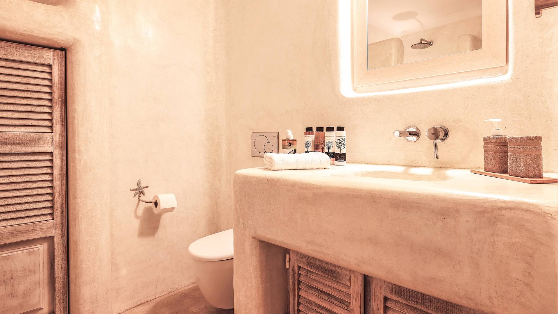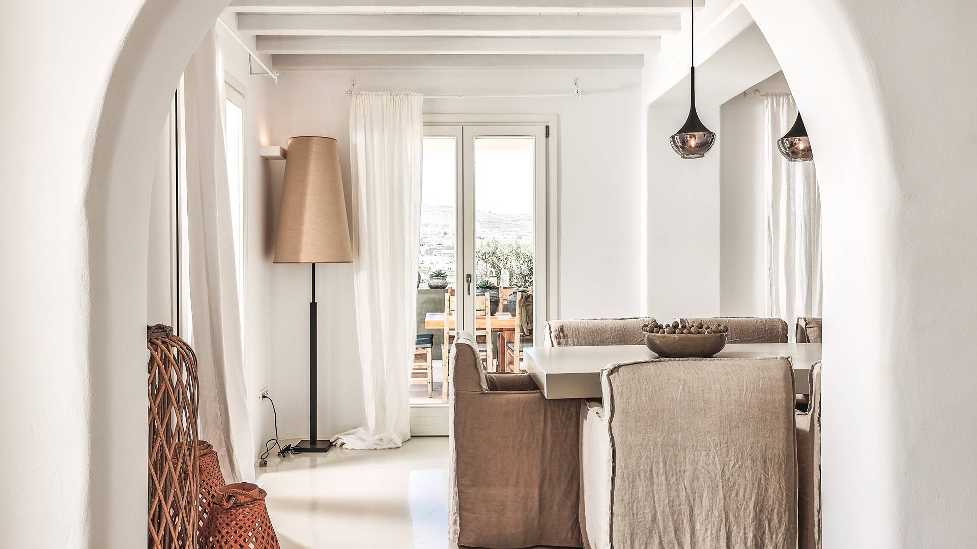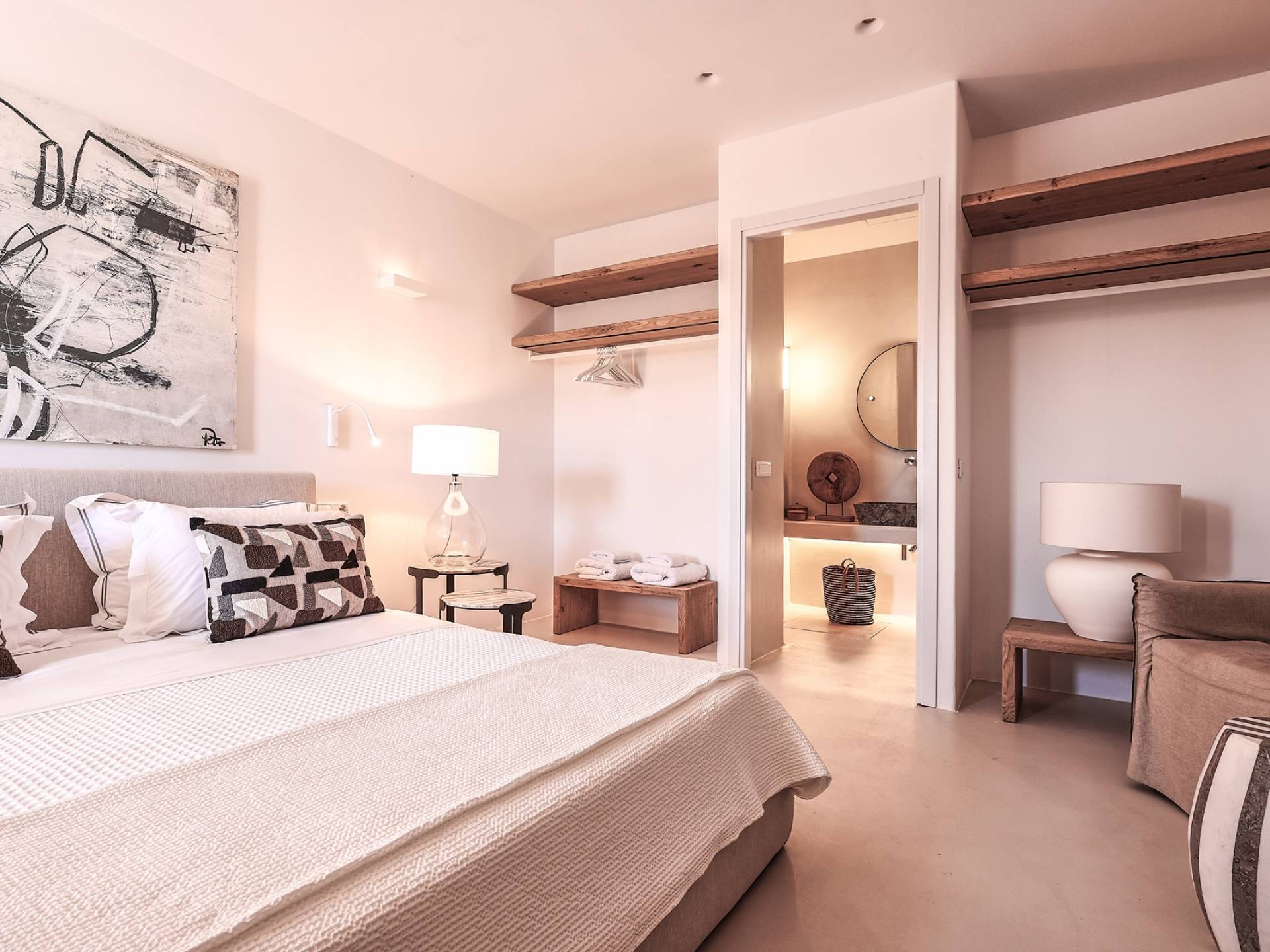 The villa praises traditional architecture, incorporating a mixture of stone and concrete, and is tastefully decorated with warm colors. At the same time, it invites guests to unwind in the multiple lounge areas and the BBQ/dining area of the expansive terrace and gives the opportunity to the most athletic ones to remain active at the outdoor gym area, while gazing at the crystal-clear Aegean waters.