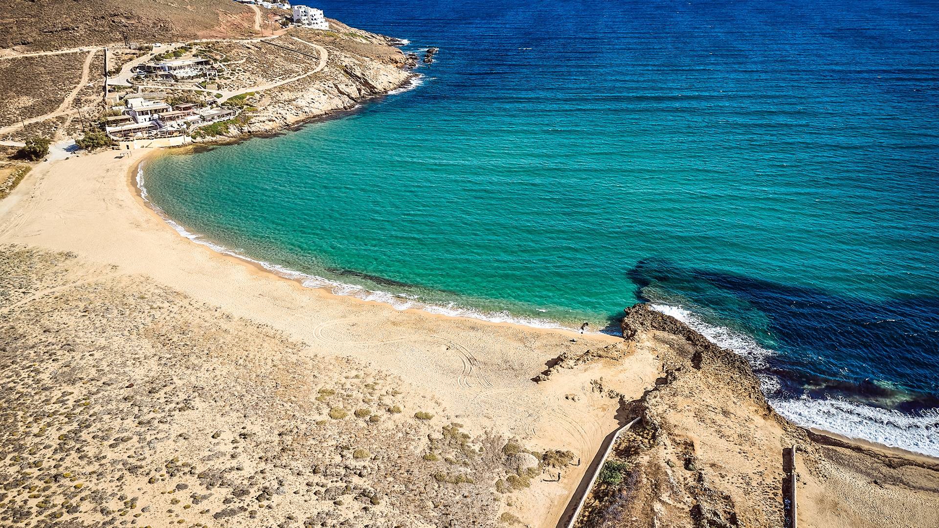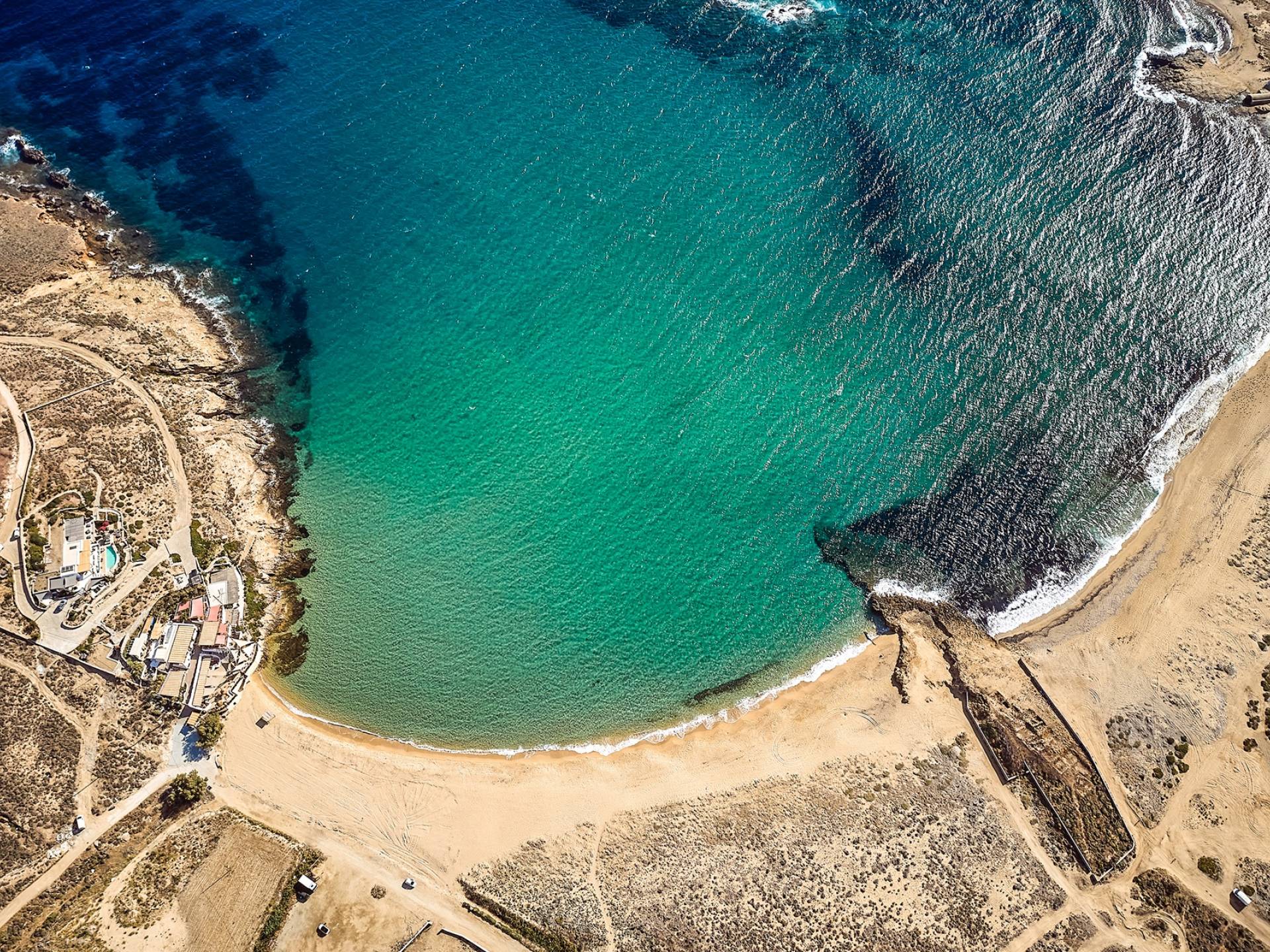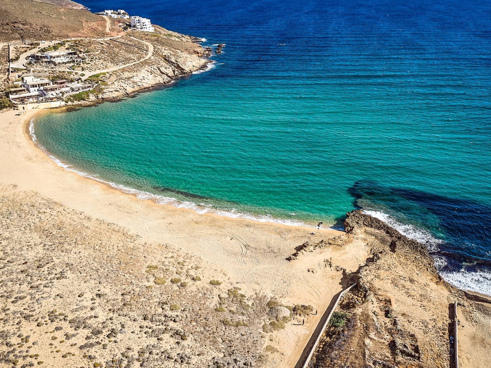 show more detailsFtelia Mykonos is a beautiful turquoise water beach on the north part, particularly famous among the windsurfers since it is caressed by the Meltemi north Cycladic wind that creates the ideal conditions for this sport. Even if you are not a windsurfing lover you will enjoy the serenity feeling this beach gives out. The road descending to the beach is paved with asphalt up to a certain point and then there is a walking distance within the sand. Within a few steps, you will come across a very peaceful and uncrowded beach, which is somewhat surprising because it is quite accessible from the Chora.