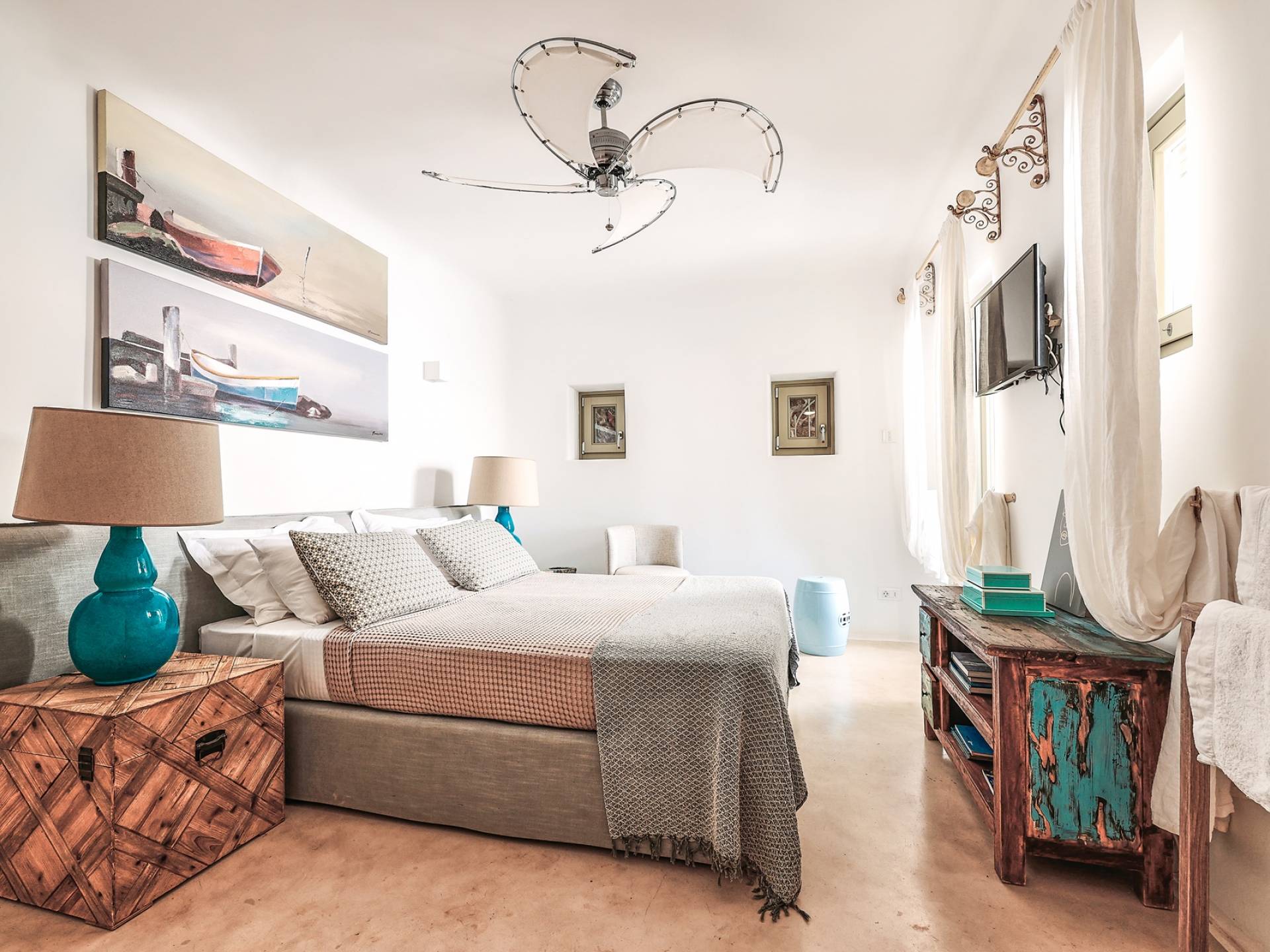 The beach is only 1 minute walk time away thanks to the direct beach access that the property offers. The exterior comprises an outdoor lounge and a dining area, a private heated pool with a direct sea view, parking space for several cars, and a pathway that leads straight to the water, offering direct beach access. The interior is divided into two levels and combines tasteful decor with traditional architecture. The upper level includes the living room, kitchen, dining area, and 3 en suite bedrooms, out of which one is the master. Laundry and children’s playroom are also found on this level. Two spacious suites are situated on the lower level, overlooking Ftelia Bay with a shared balcony.