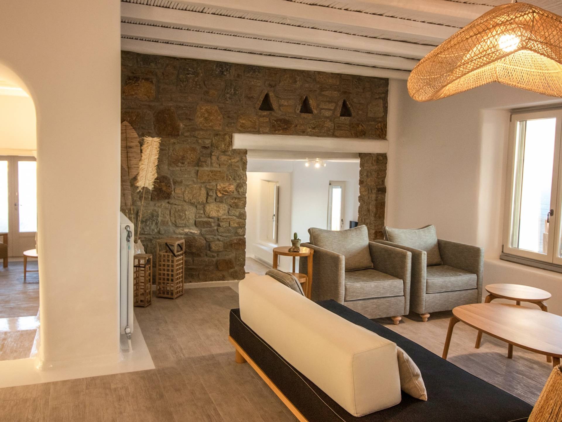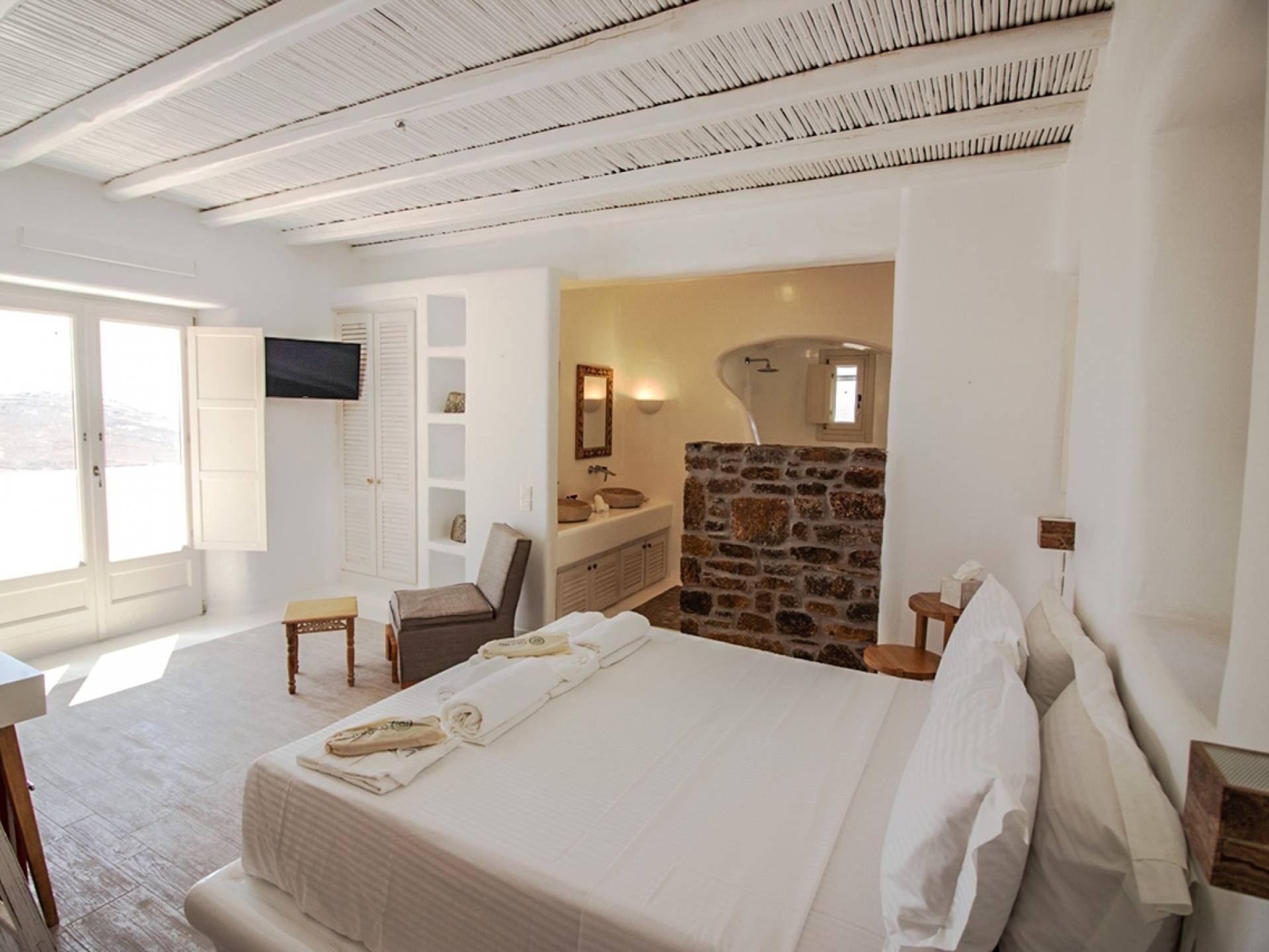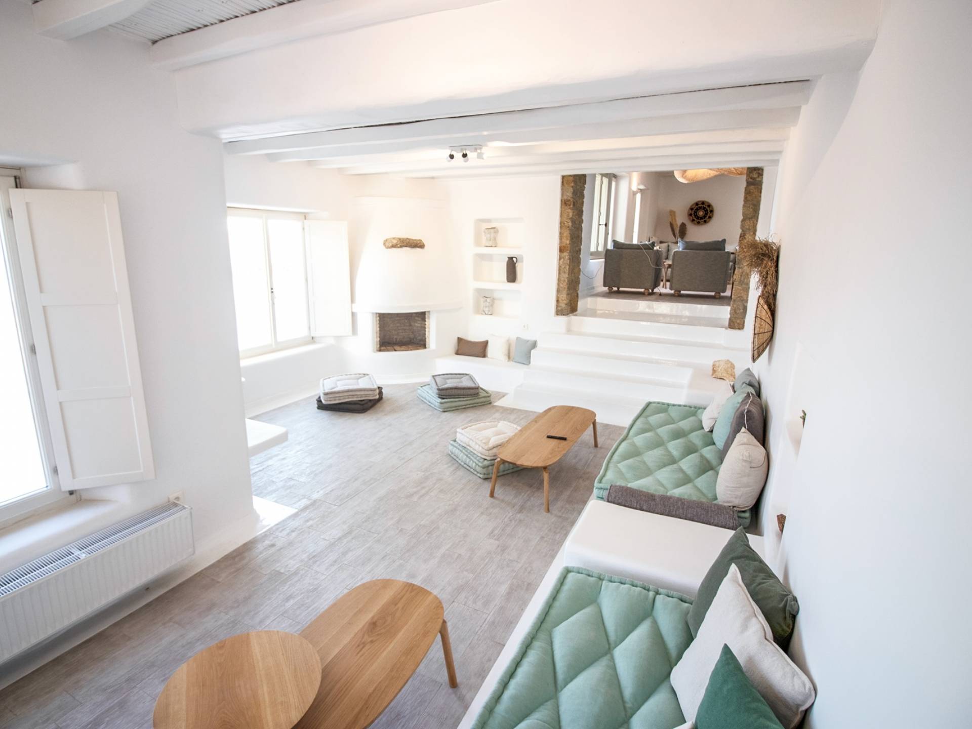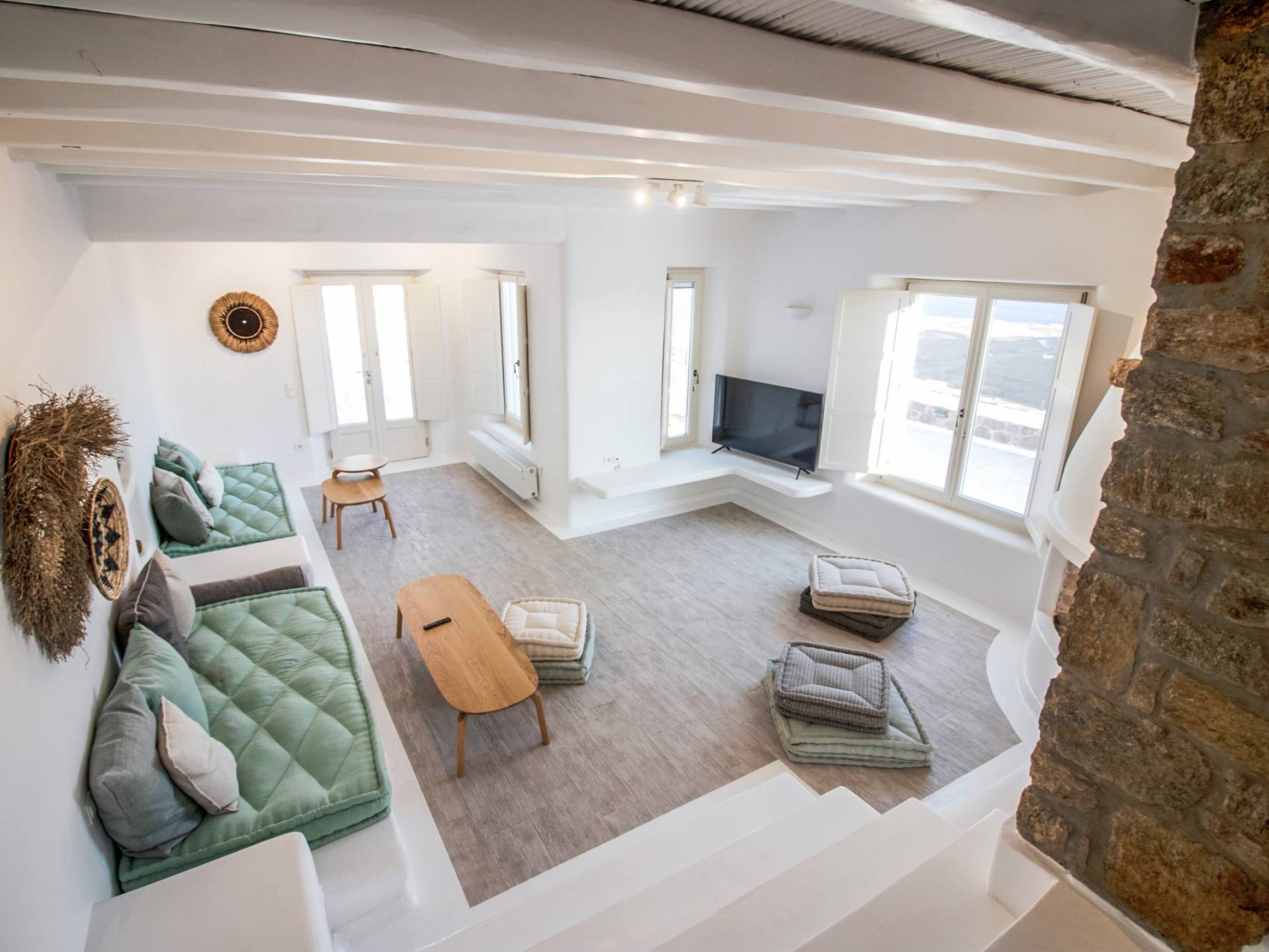 Mykonian Icon Villa consists of 6 bedrooms with a queen bed each and ensuite bathrooms with shower. The villa has a fully equipped kitchen and a spacious living-dining room with a fireplace. It has a special and very comfortable terrace with a beautiful and unobstructed view of the Aegean Sea. It is great for families or couples seeking a luxury retreat offering a cozy environment and magnificent sea view.