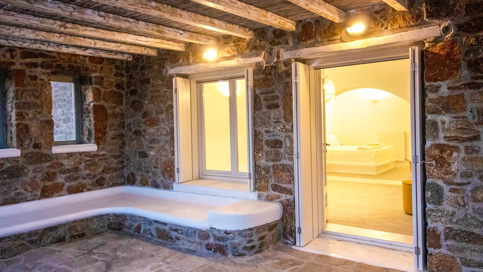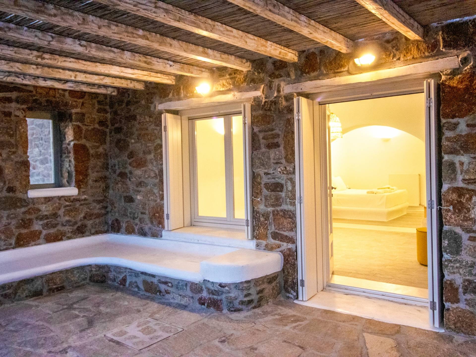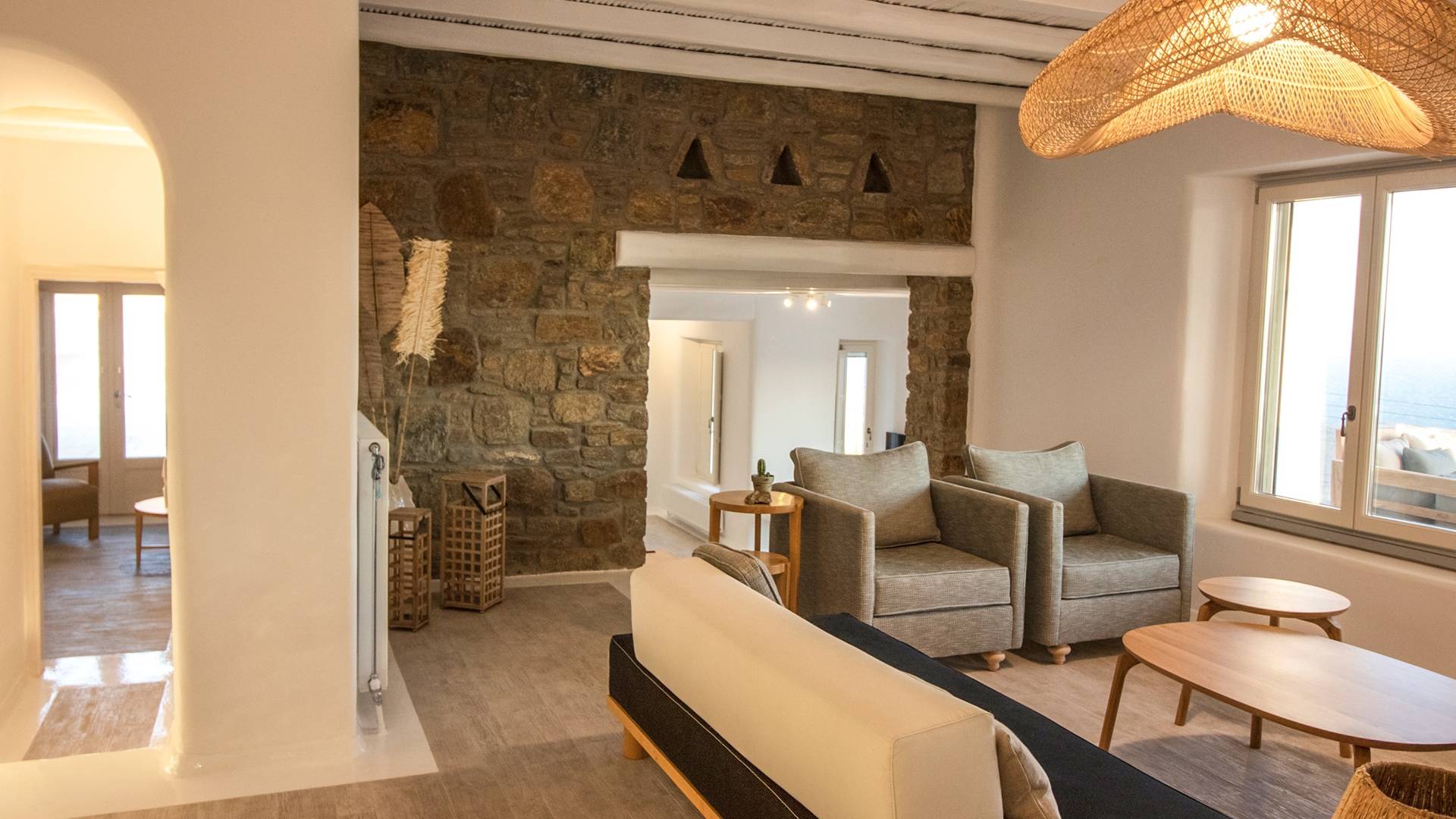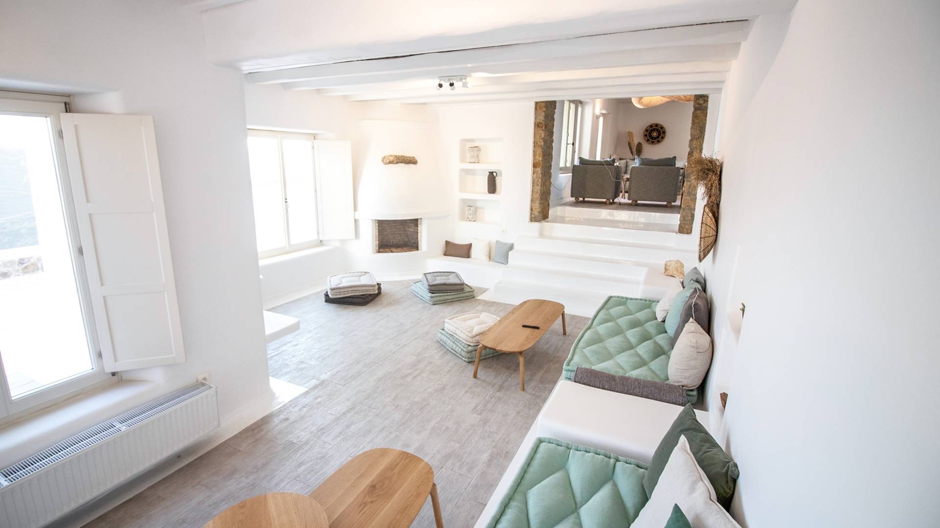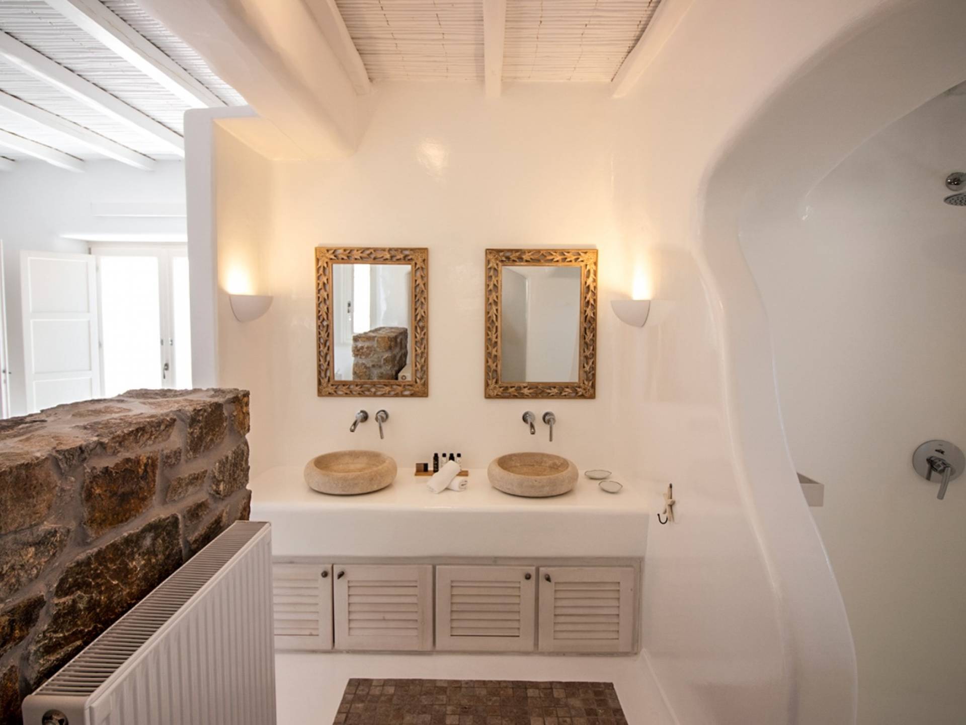Mykonian Icon Villa consists of 6 bedrooms with a queen bed each and ensuite bathrooms with shower. The villa has a fully equipped kitchen and a spacious living-dining room with a fireplace. It has a special and very comfortable terrace with a beautiful and unobstructed view of the Aegean Sea. It is great for families or couples seeking a luxury retreat offering a cozy environment and magnificent sea view.