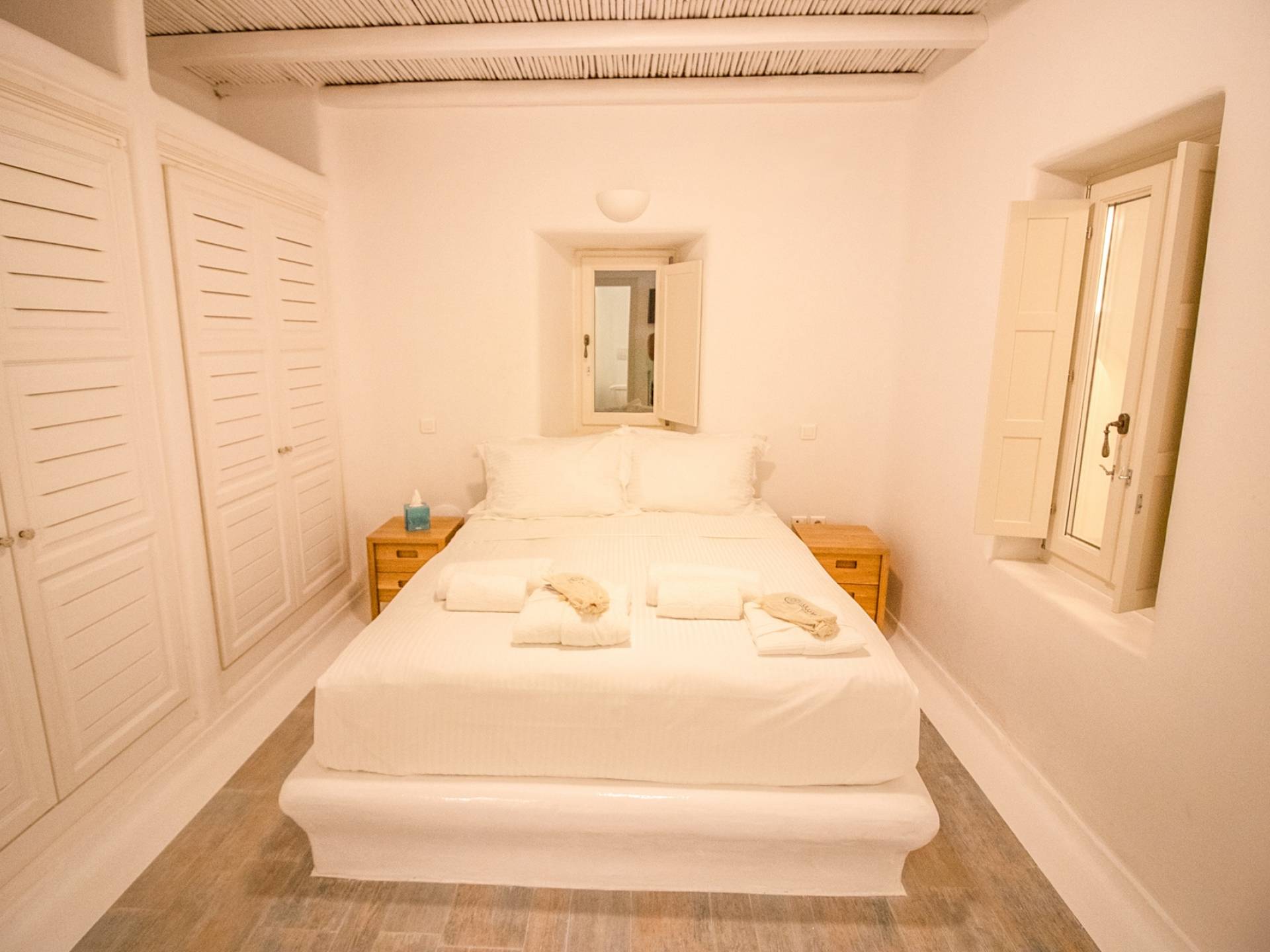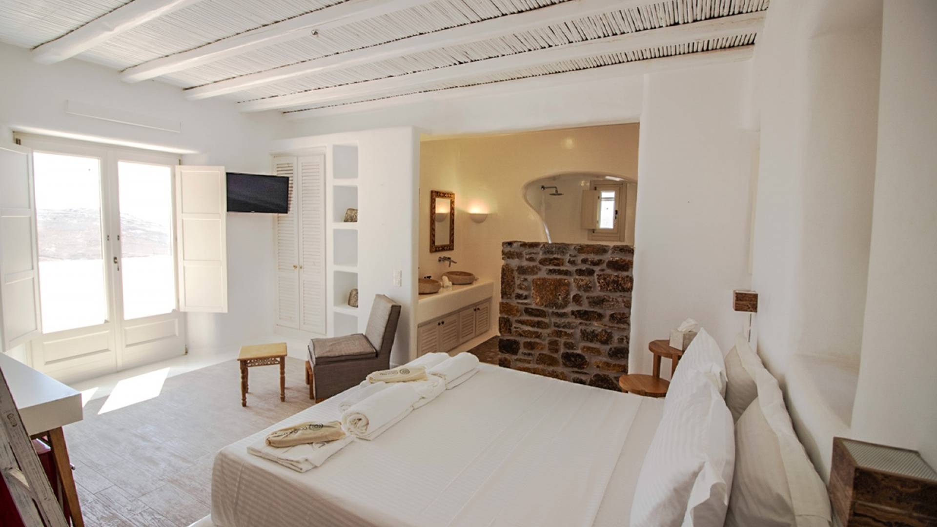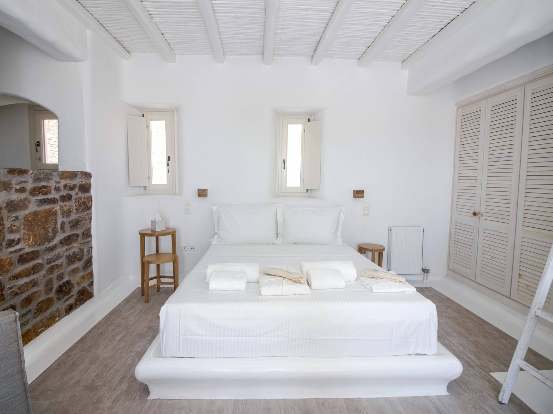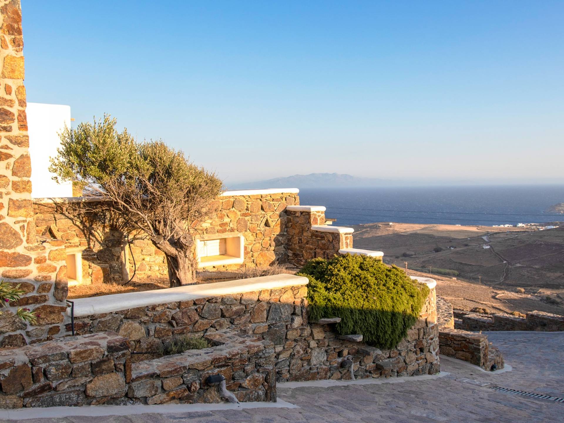 Mykonian Icon Villa consists of 6 bedrooms with a queen bed each and ensuite bathrooms with shower. The villa has a fully equipped kitchen and a spacious living-dining room with a fireplace. It has a special and very comfortable terrace with a beautiful and unobstructed view of the Aegean Sea. It is great for families or couples seeking a luxury retreat offering a cozy environment and magnificent sea view.