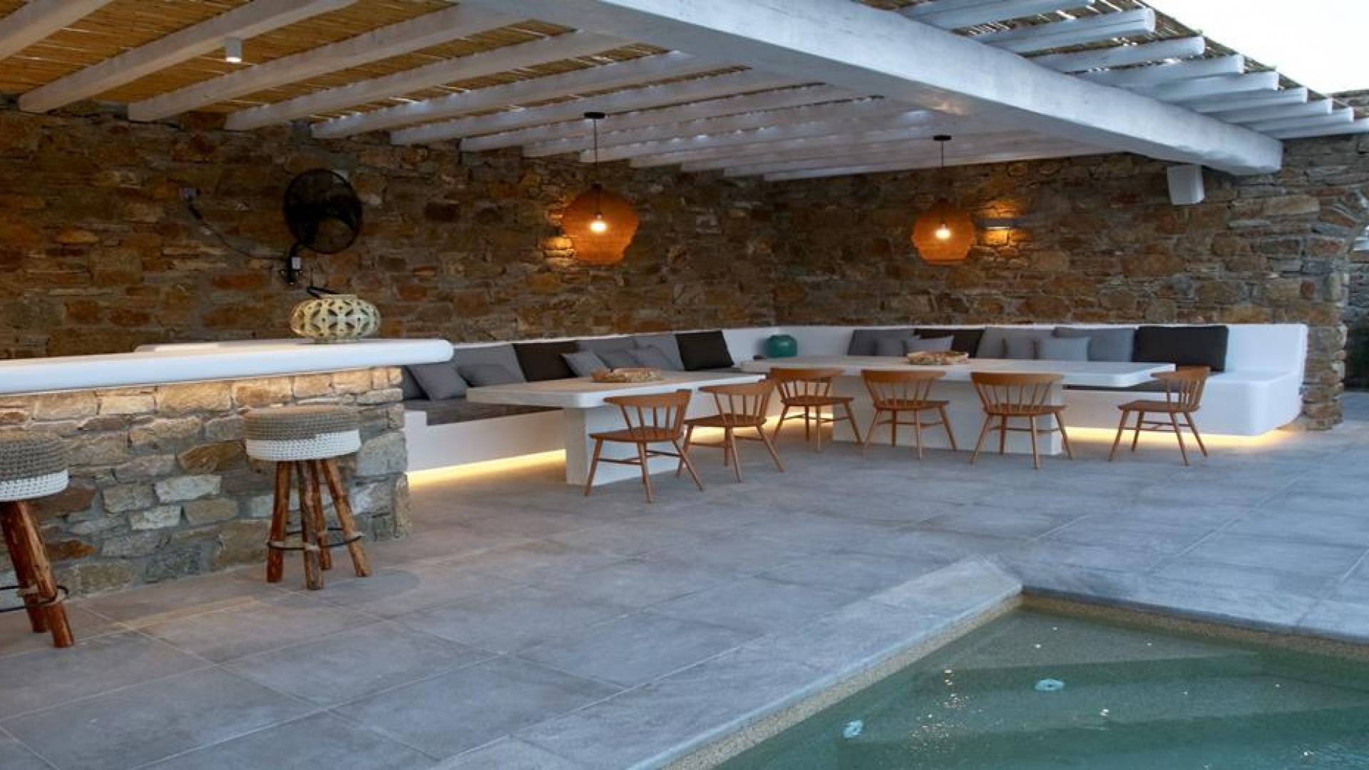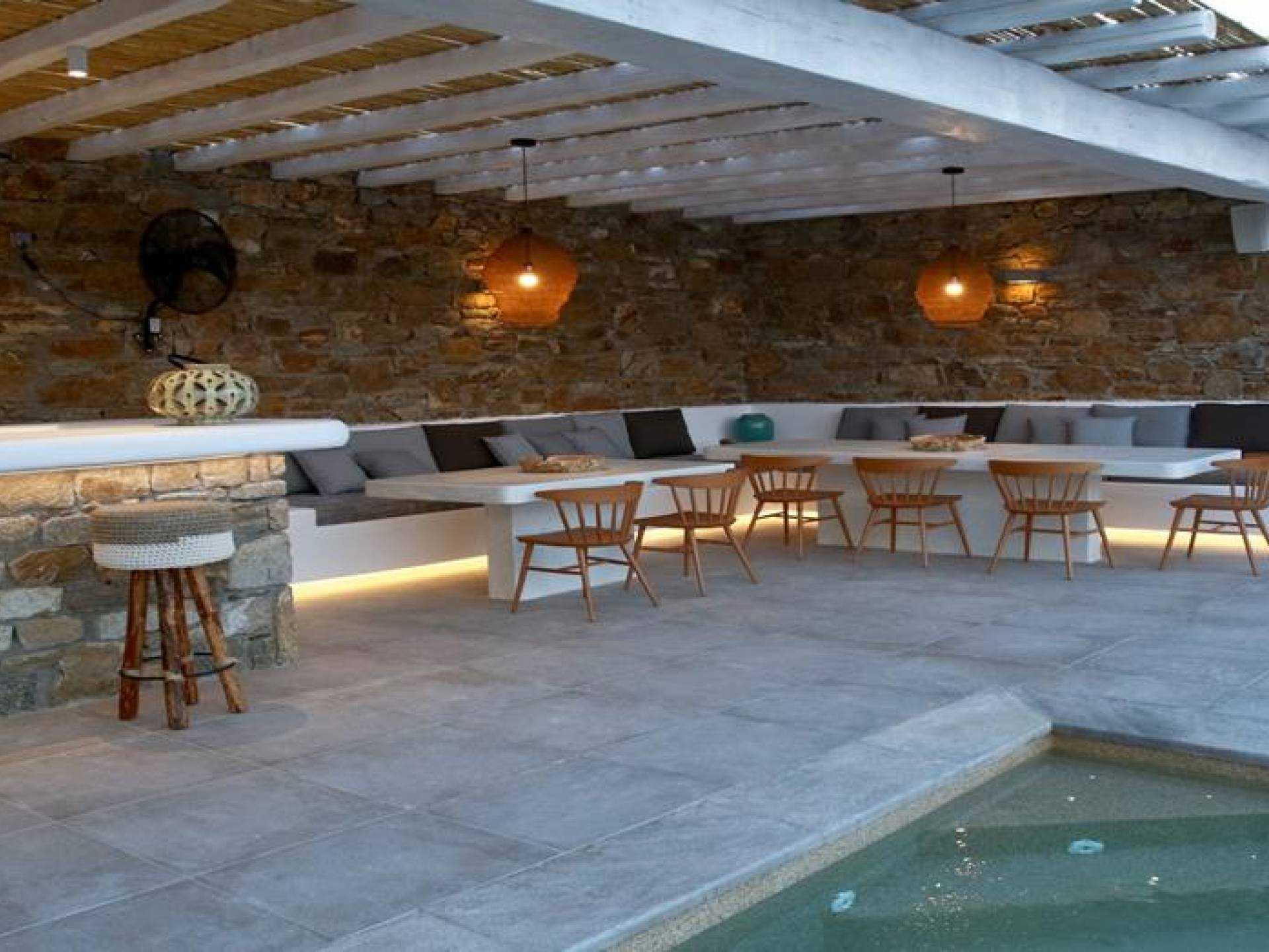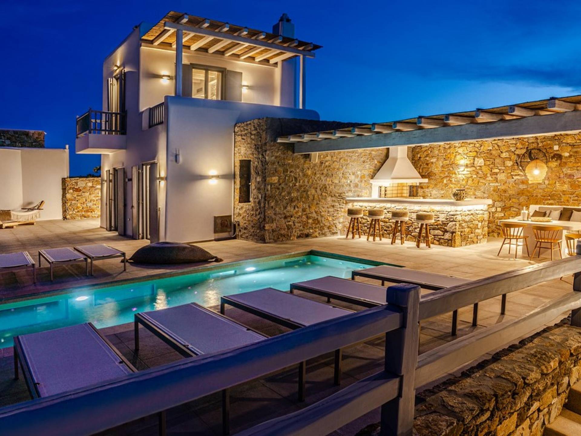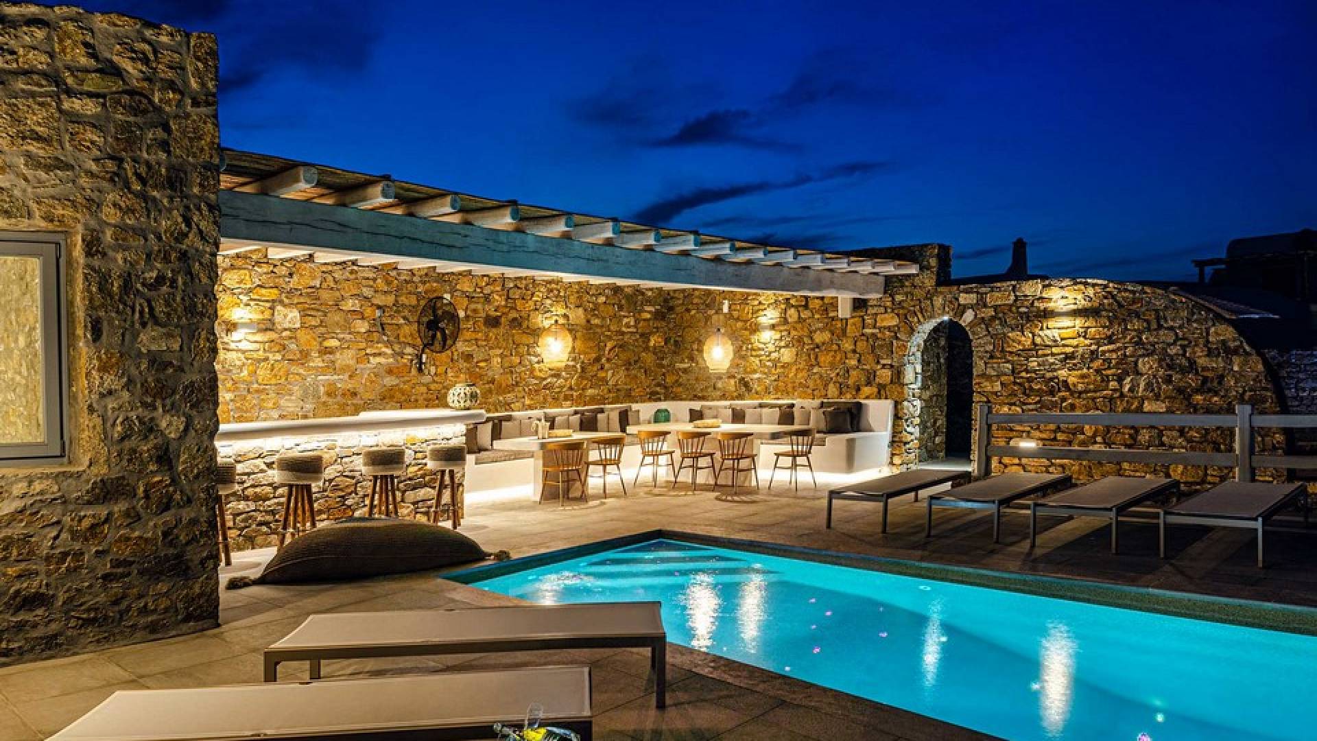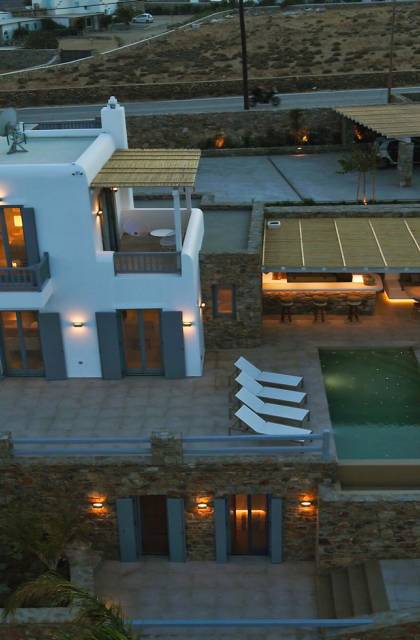 This luxury rental is around 250 sq.m., formed in 3 levels and comfortably accommodates 14 guests at 7 double bedrooms. All outdoor areas of the villa are surrounded by pergolas and stone pedestals that protect the house from the northern winds. The guests can enjoy top facilities: infinity private swimming pool (20 sq.m.), heated Jacuzzi, pool bar & lounge area with BBQ.