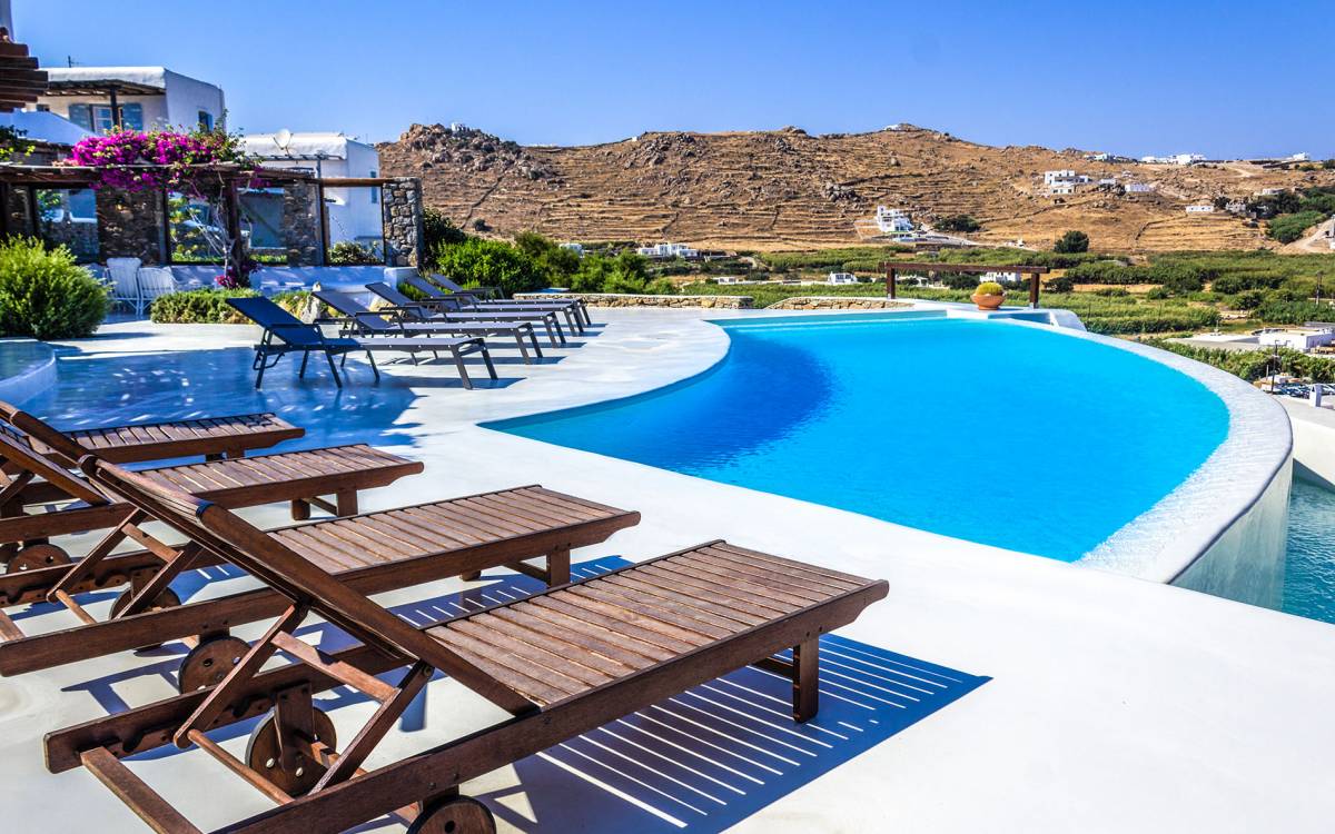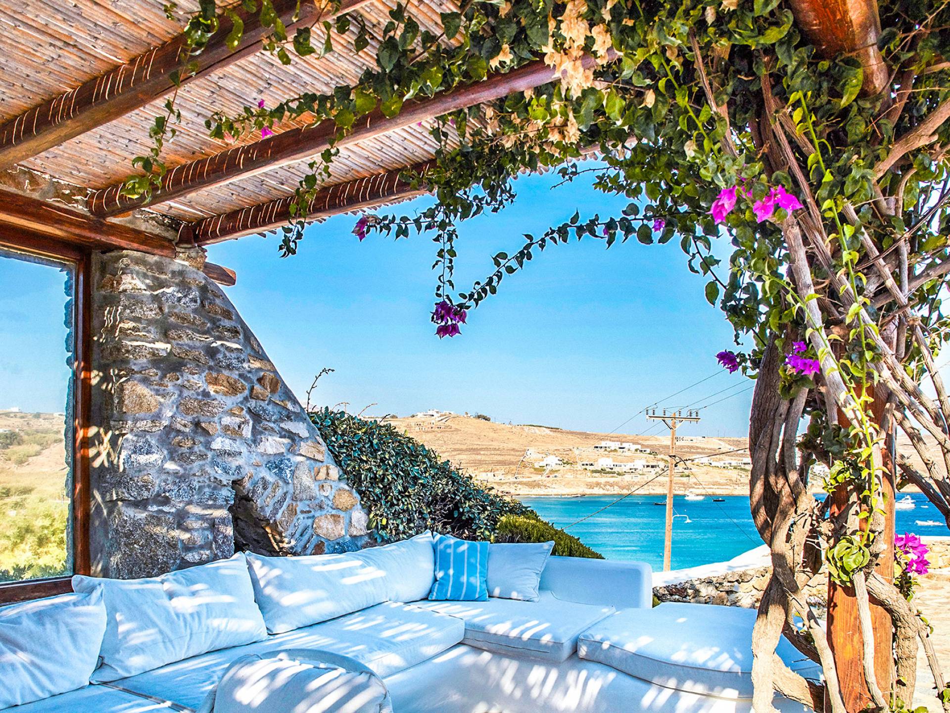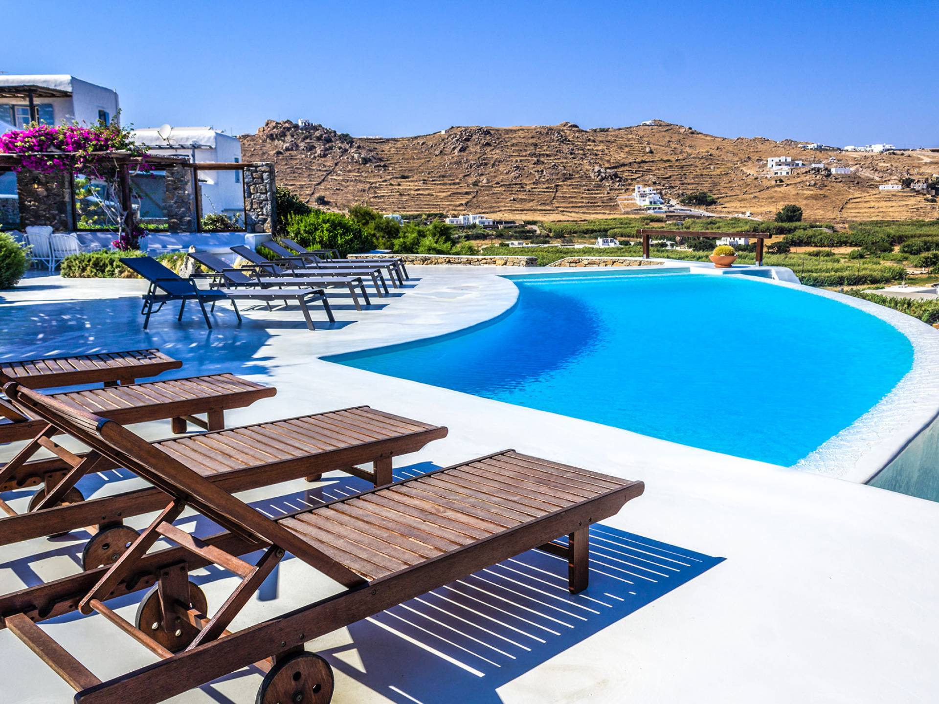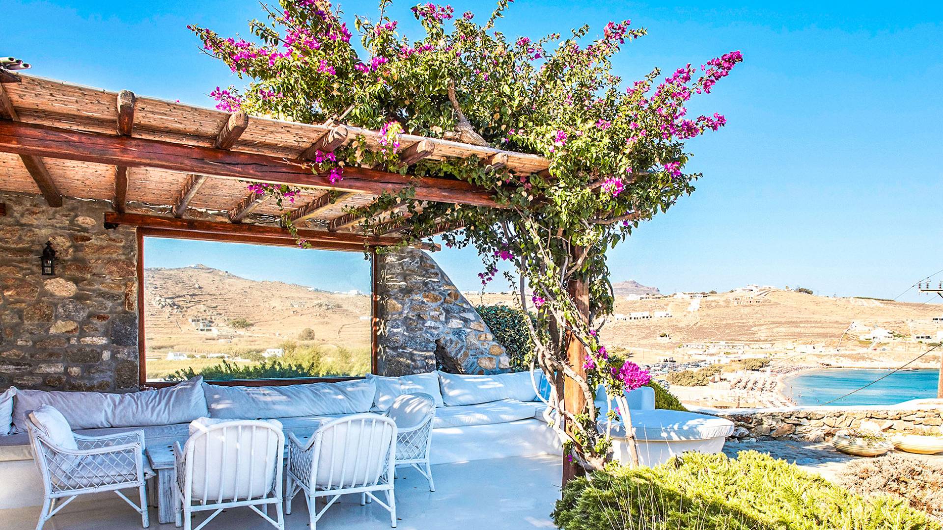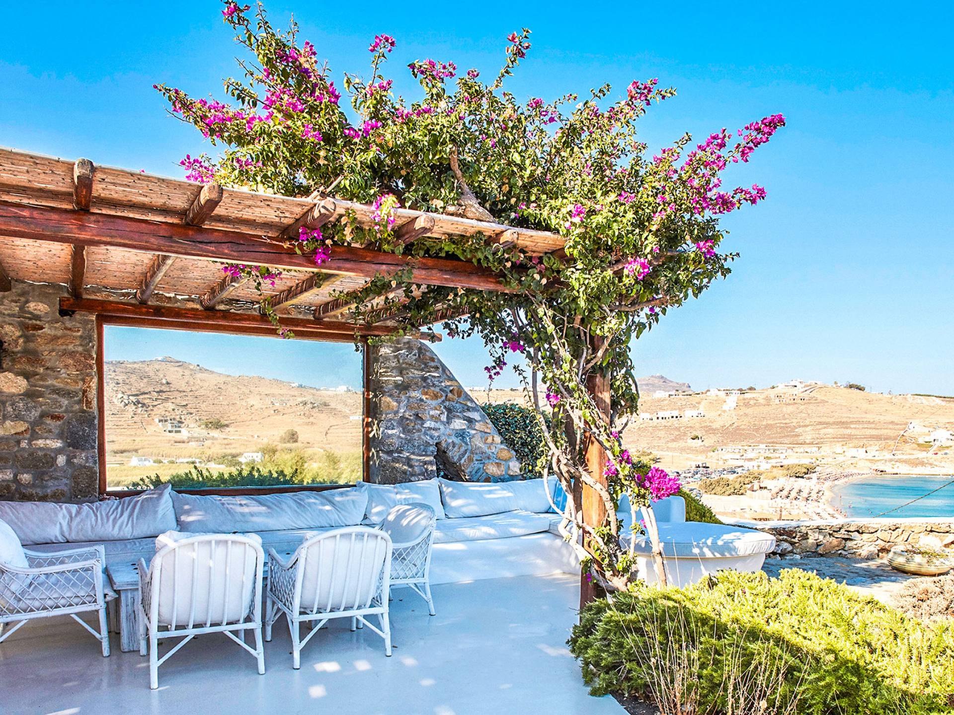 Villa Alcyone Mykonos is a luxury villa rental with 5 bedrooms and a private pool. Standing on a small hill on the edge of Kalo Livadi bay, villa Alcyone is a luxurious property that offers jaw-dropping views above the Aegean sea and elegant outdoor spaces. Just a breath away from the magnificent Kalo Livadi beach, Alcyone is the ideal choice for those looking to enjoy the natural beauty of Mykonos and unwind by the seafront.