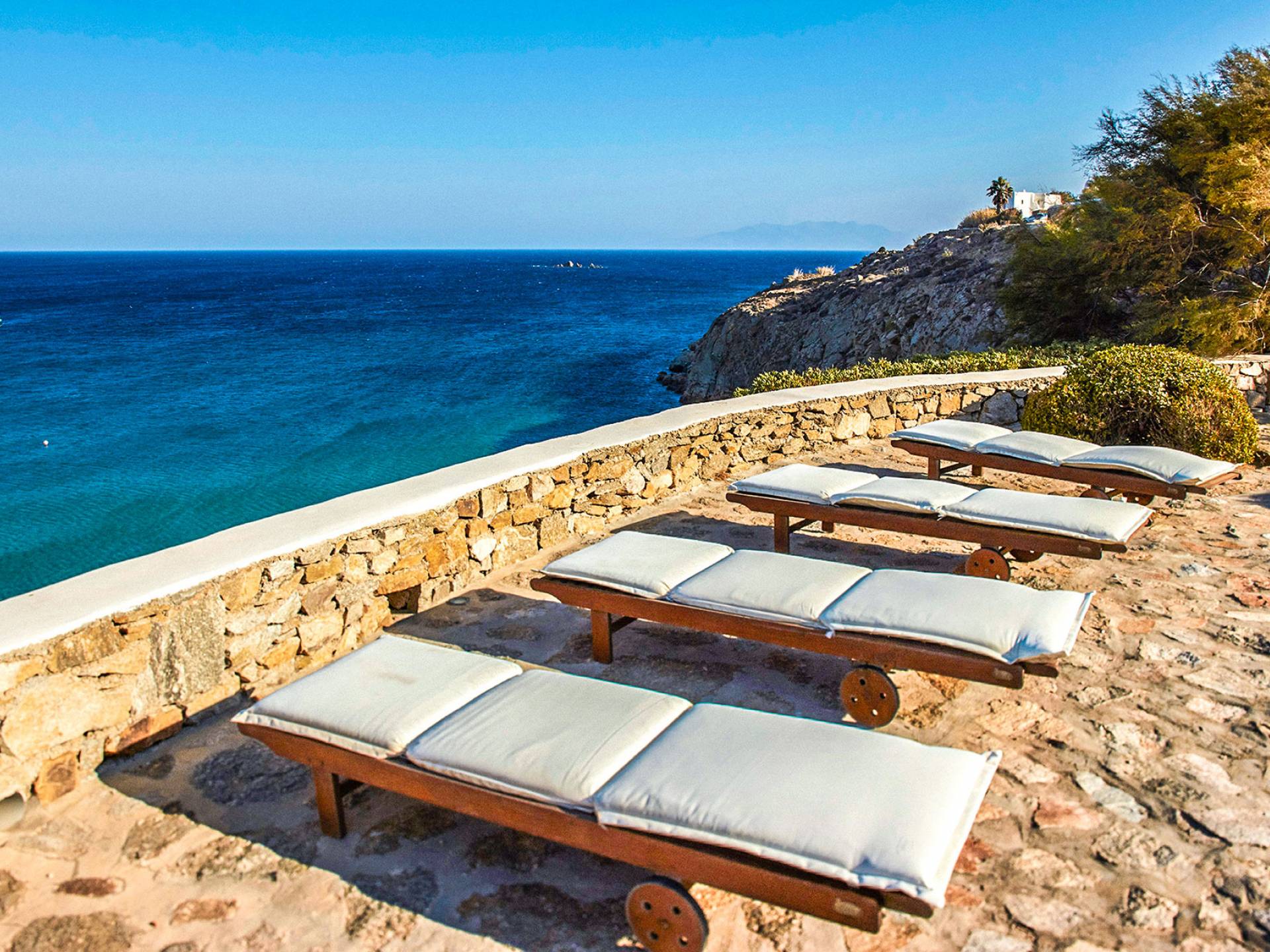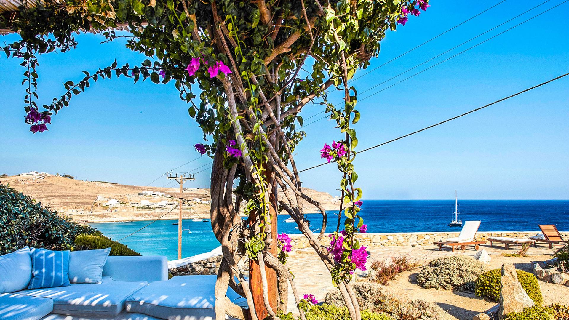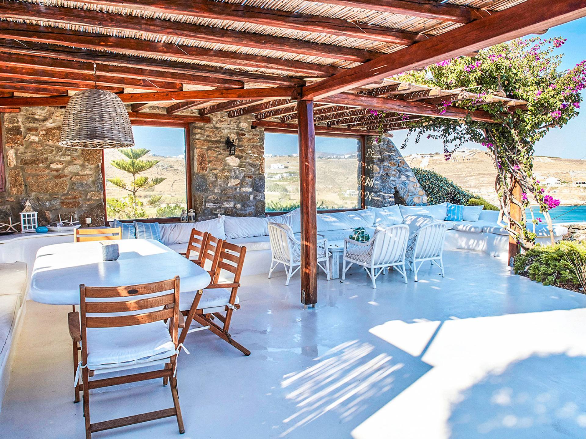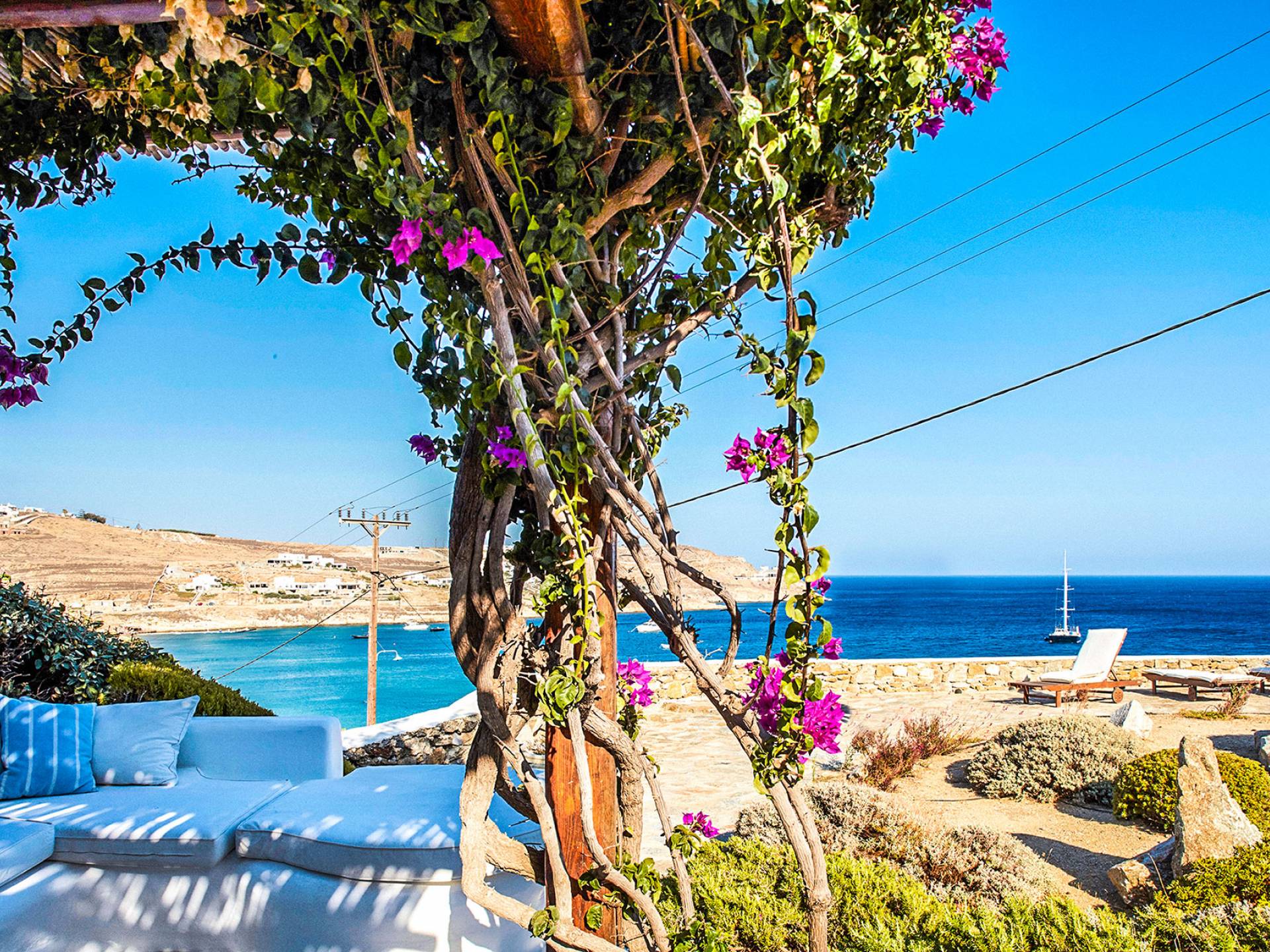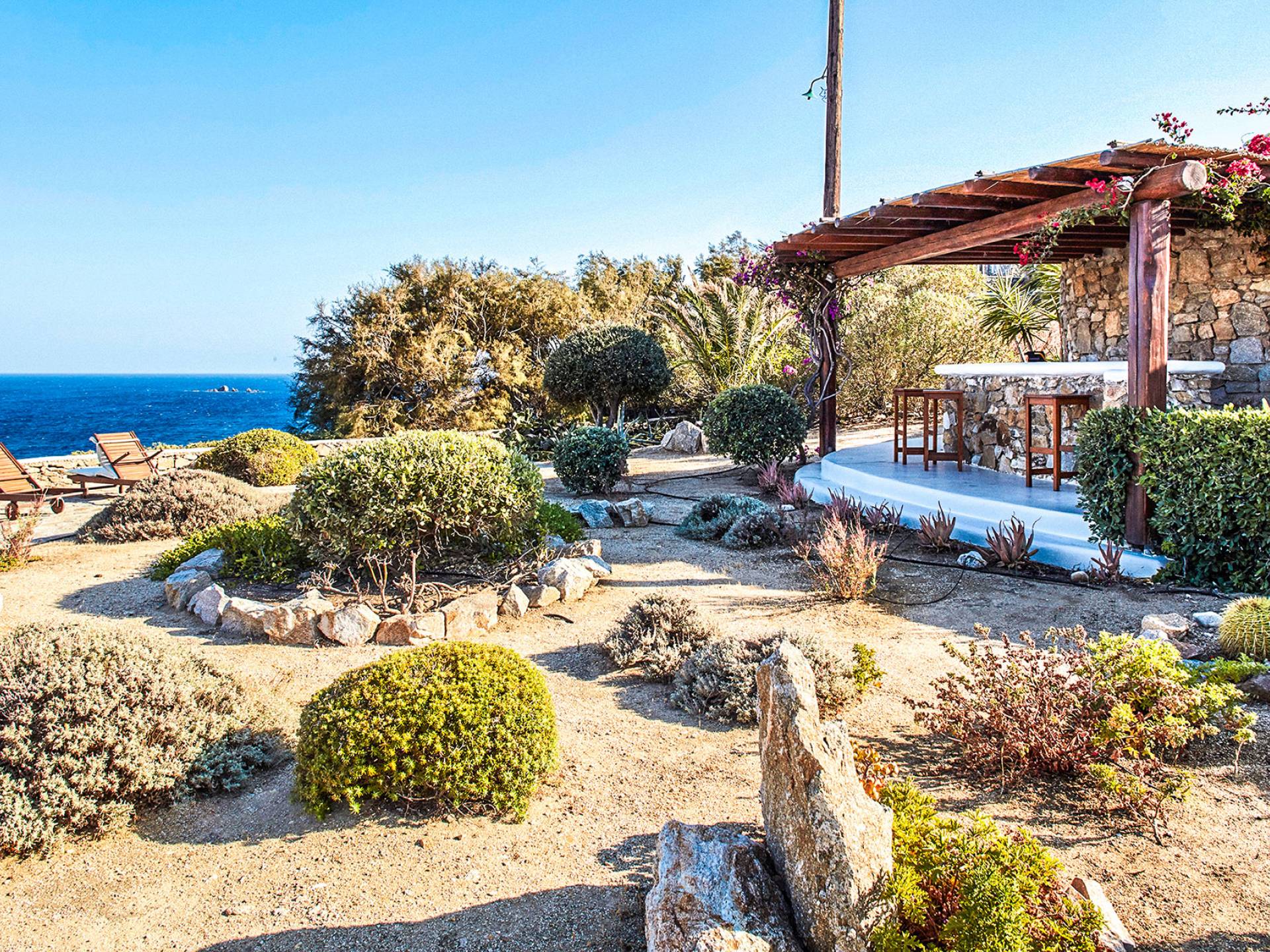 Villa Alcyone Mykonos is a luxury villa rental with 5 bedrooms and a private pool. Standing on a small hill on the edge of Kalo Livadi bay, villa Alcyone is a luxurious property that offers jaw-dropping views above the Aegean sea and elegant outdoor spaces. Just a breath away from the magnificent Kalo Livadi beach, Alcyone is the ideal choice for those looking to enjoy the natural beauty of Mykonos and unwind by the seafront.