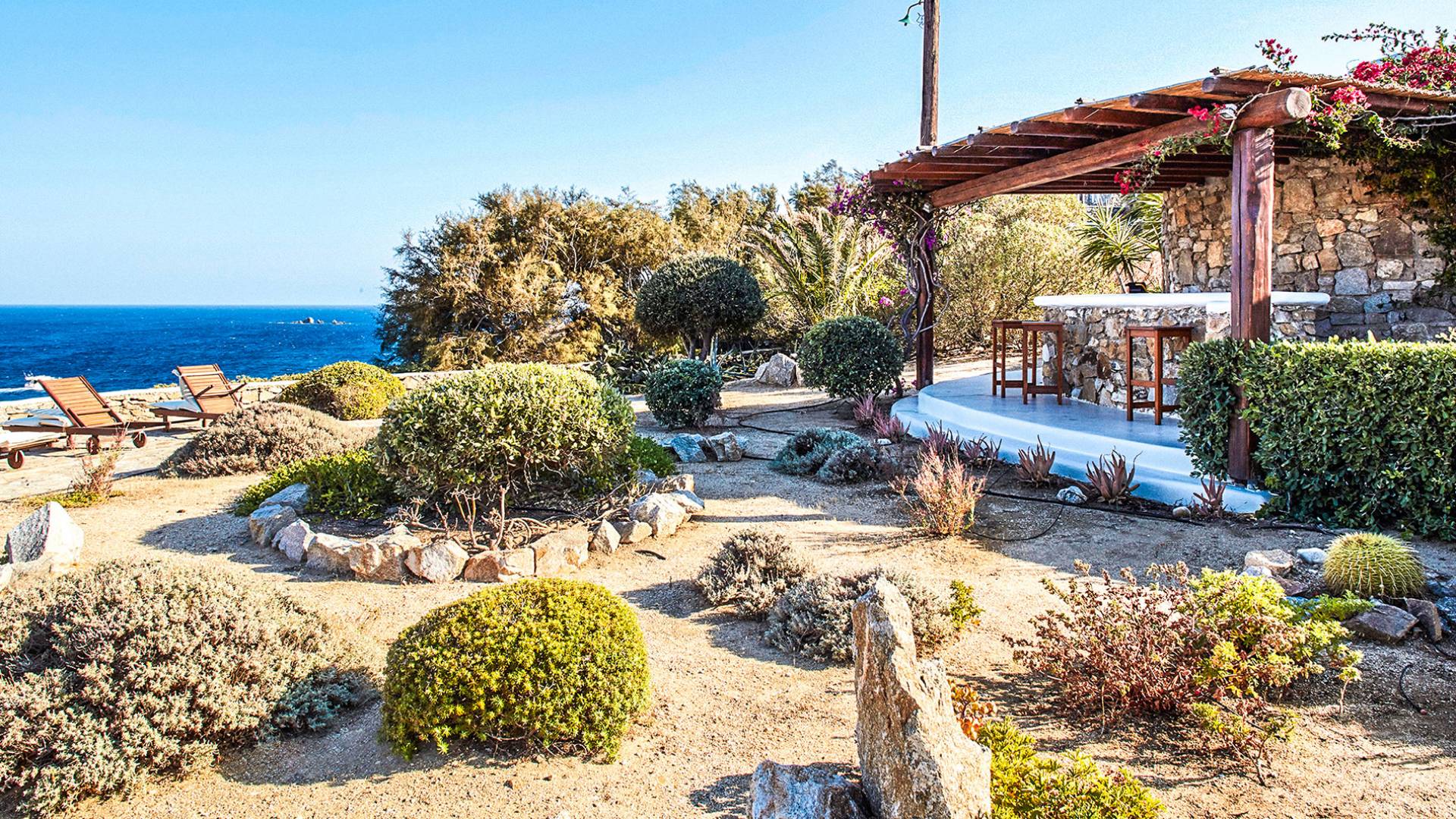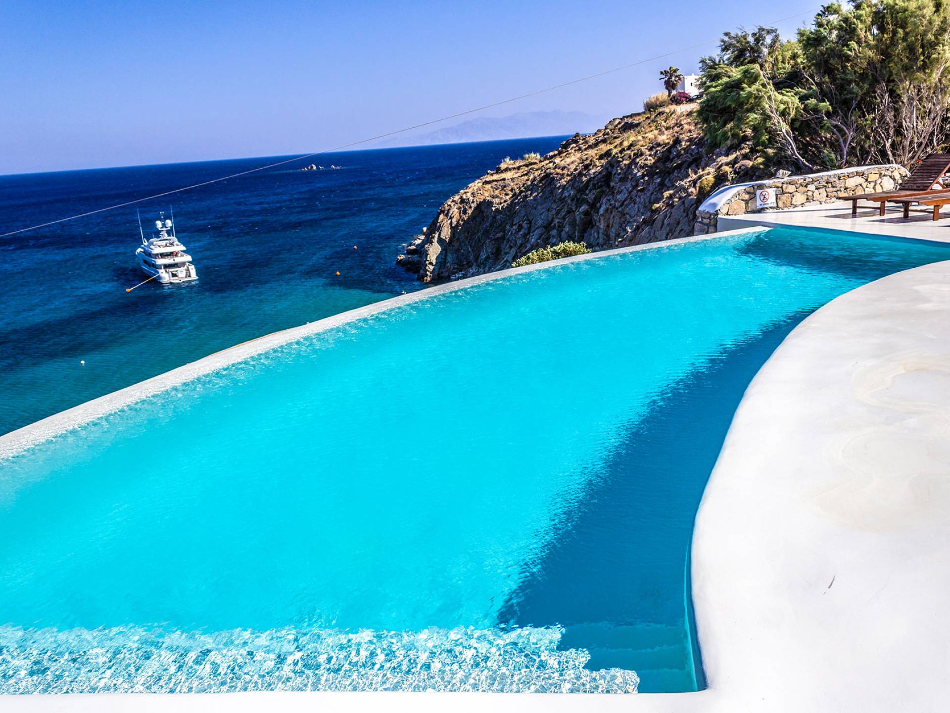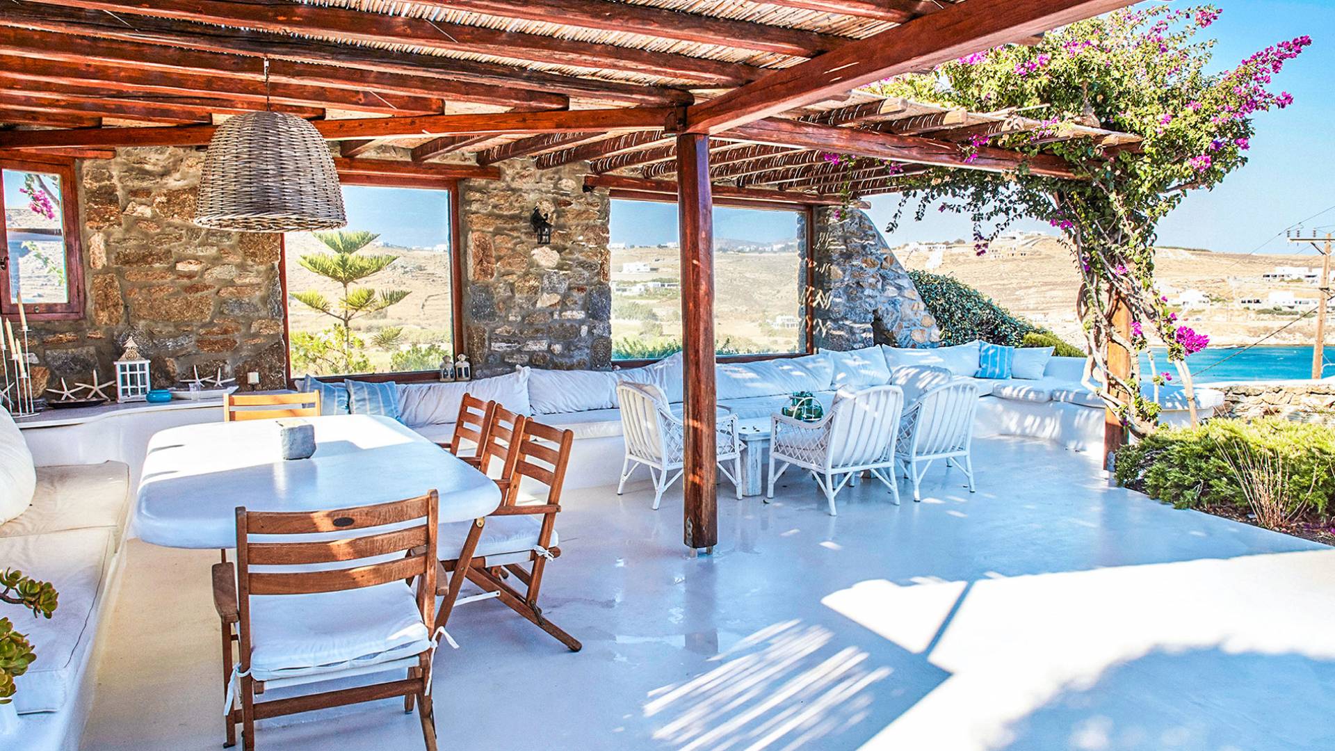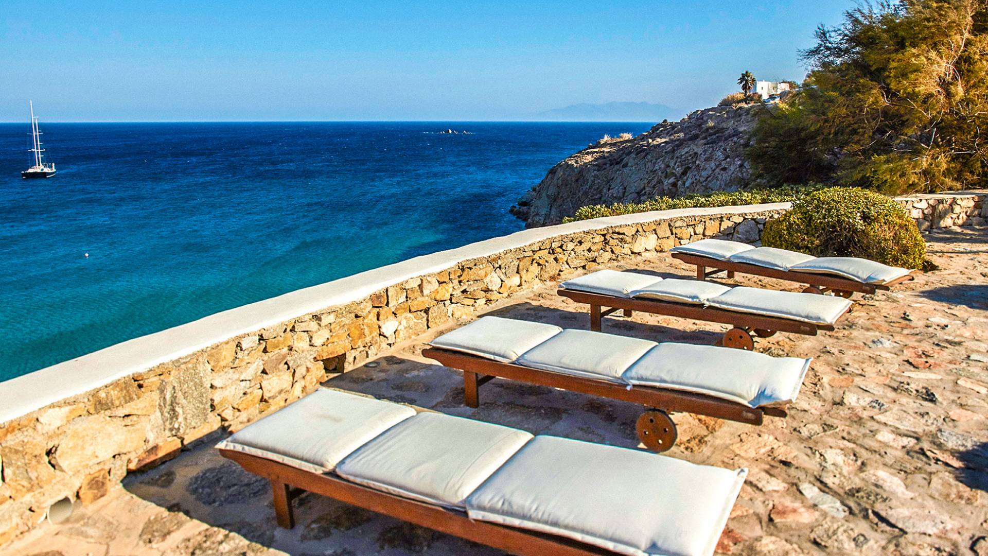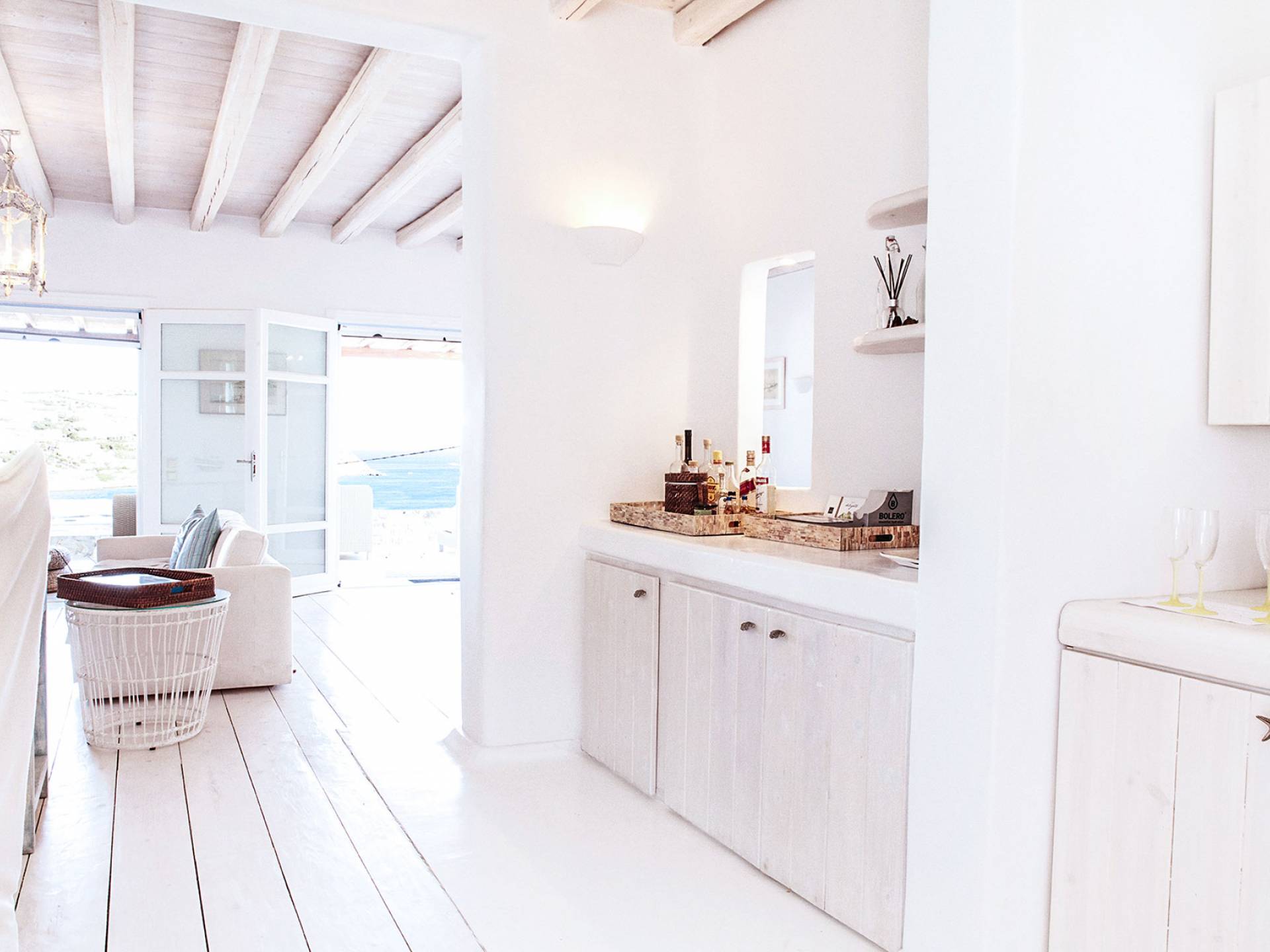 Villa Alcyone Mykonos is a luxury villa rental with 5 bedrooms and a private pool. Standing on a small hill on the edge of Kalo Livadi bay, villa Alcyone is a luxurious property that offers jaw-dropping views above the Aegean sea and elegant outdoor spaces. Just a breath away from the magnificent Kalo Livadi beach, Alcyone is the ideal choice for those looking to enjoy the natural beauty of Mykonos and unwind by the seafront.