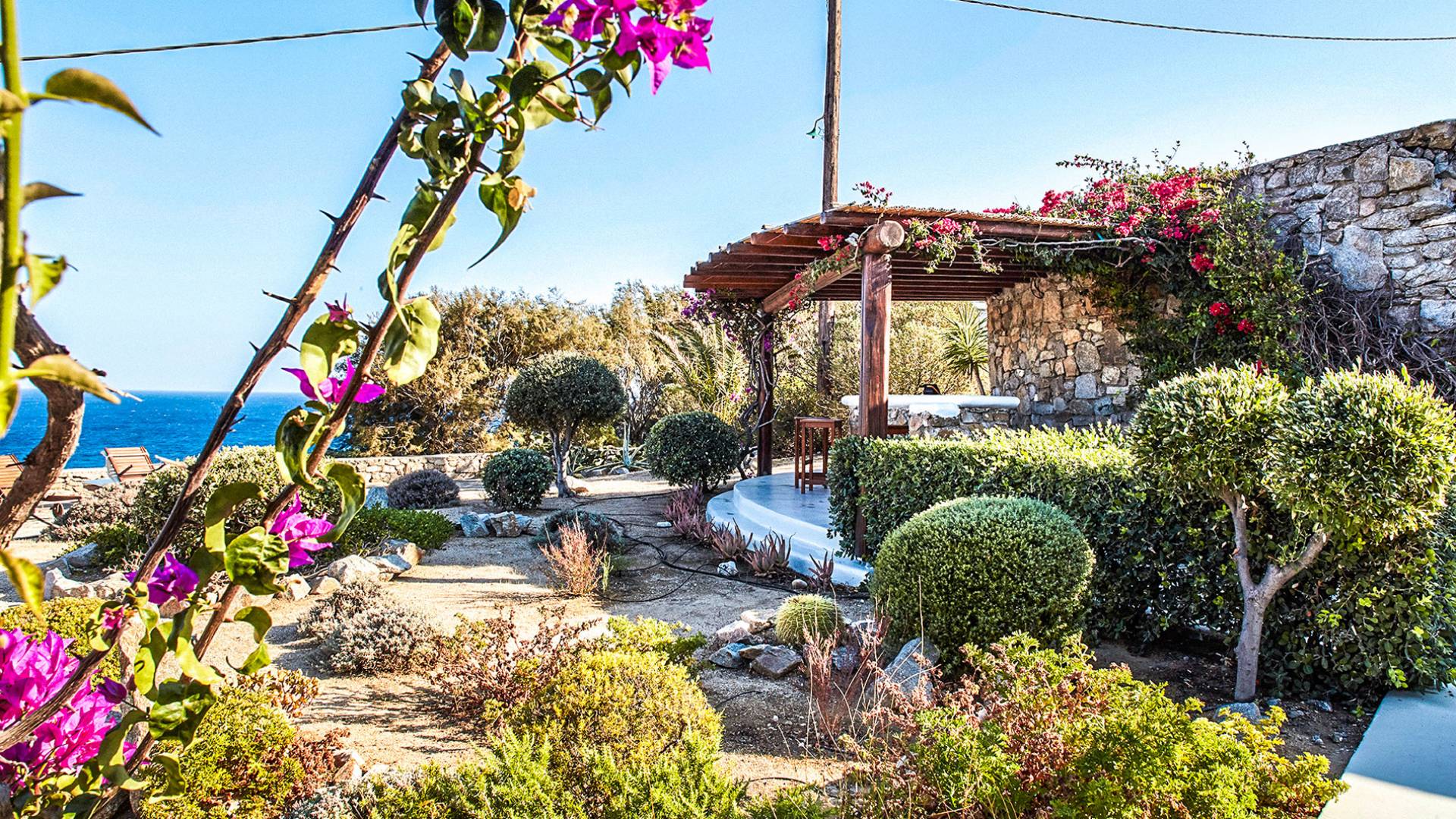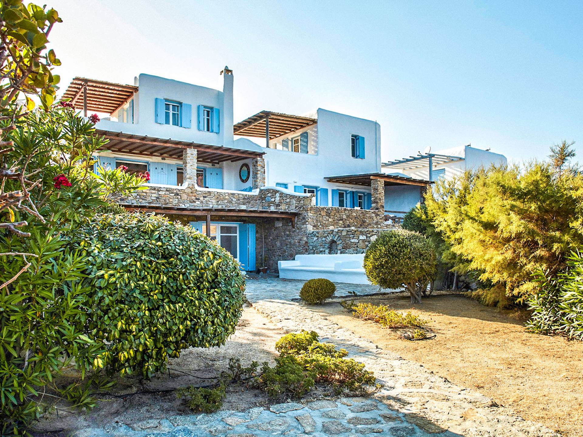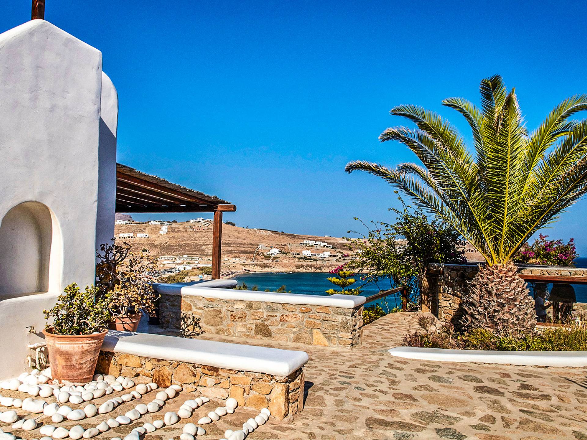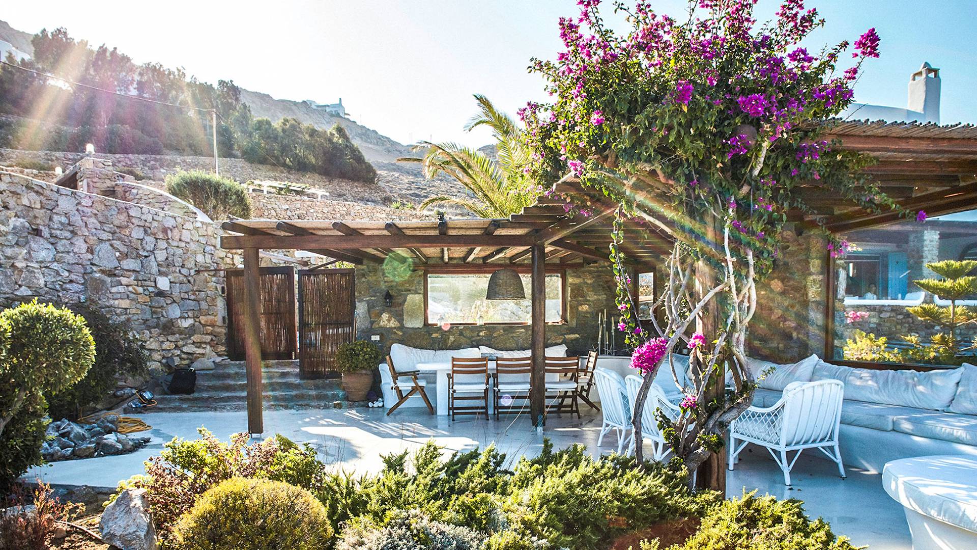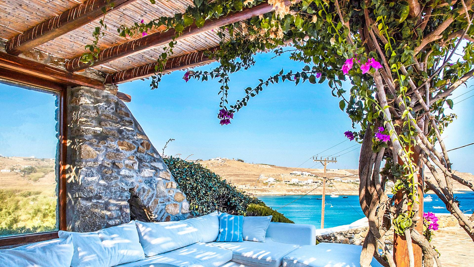 Villa Alcyone Mykonos is a luxury villa rental with 5 bedrooms and a private pool. Standing on a small hill on the edge of Kalo Livadi bay, villa Alcyone is a luxurious property that offers jaw-dropping views above the Aegean sea and elegant outdoor spaces. Just a breath away from the magnificent Kalo Livadi beach, Alcyone is the ideal choice for those looking to enjoy the natural beauty of Mykonos and unwind by the seafront.