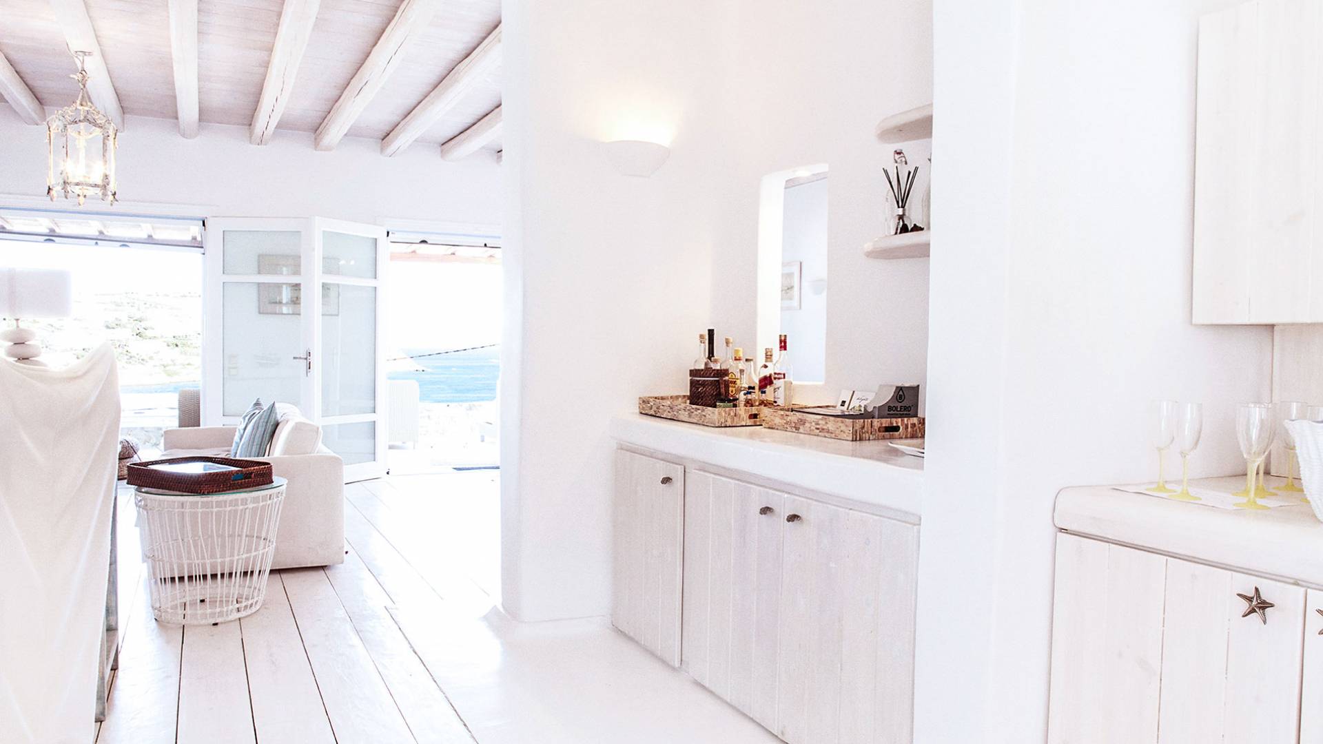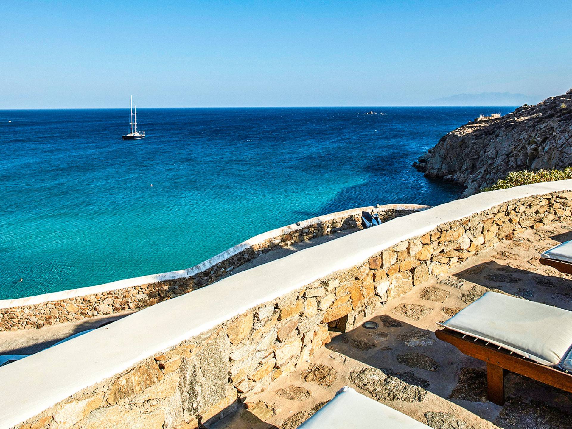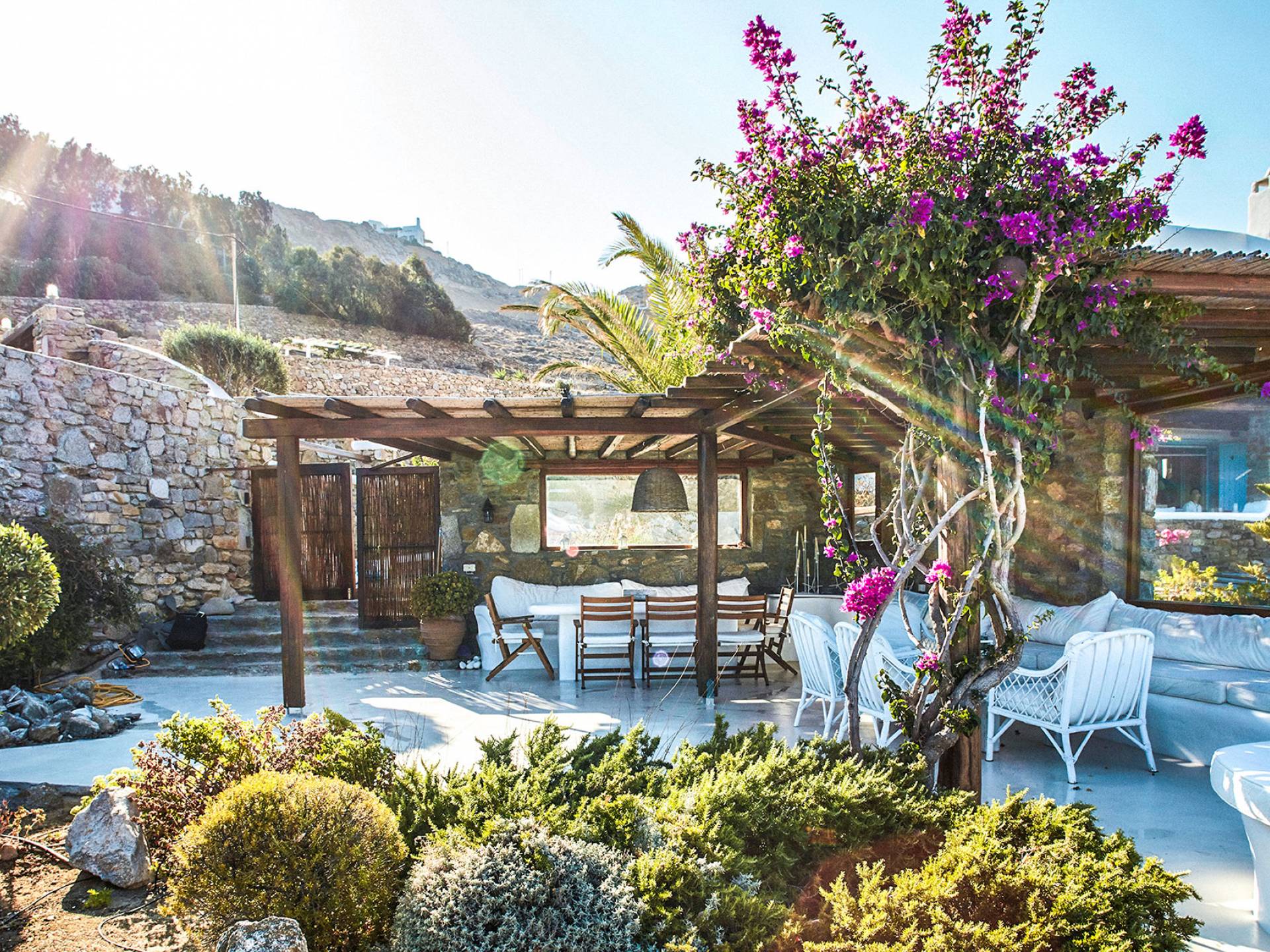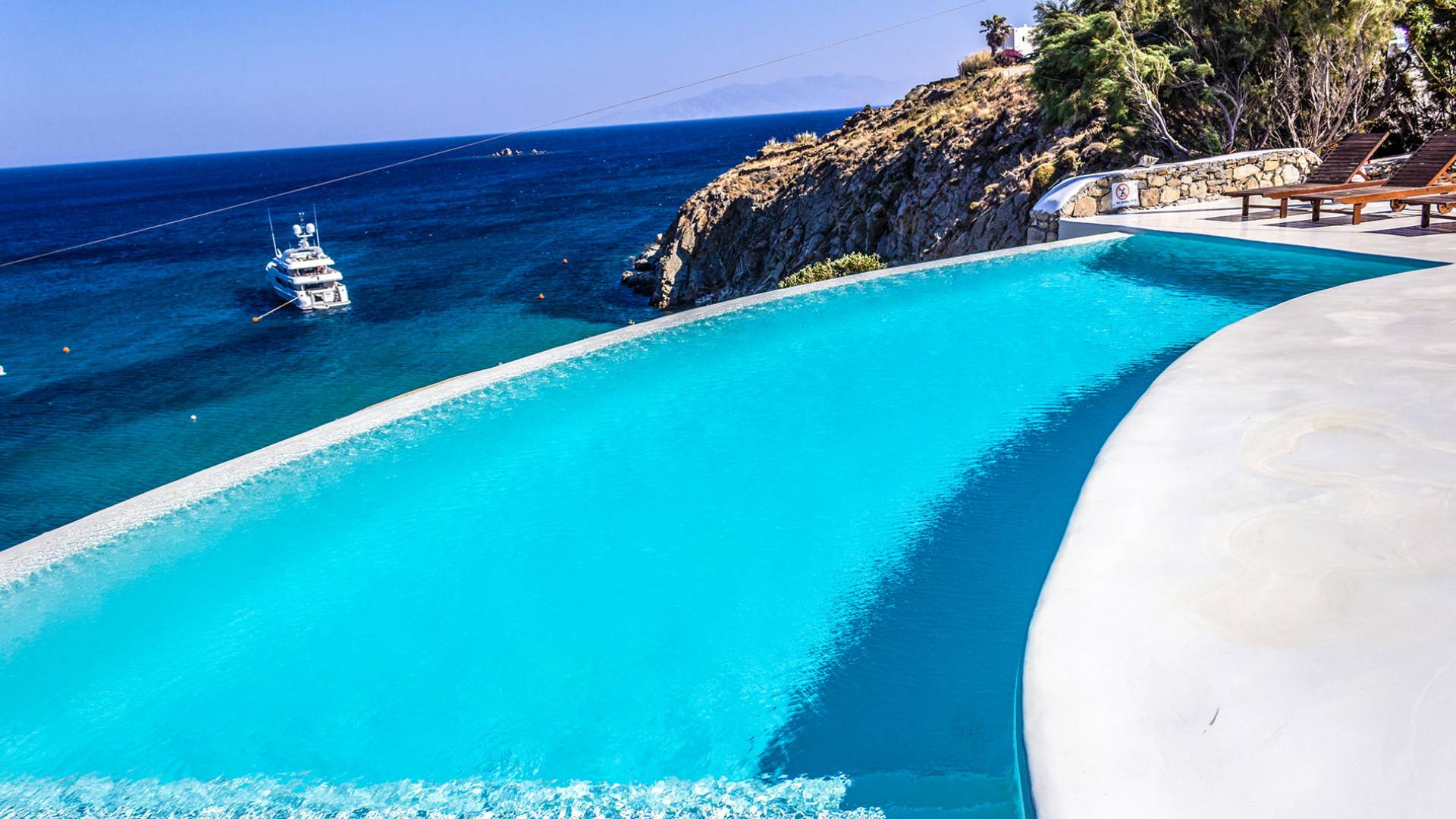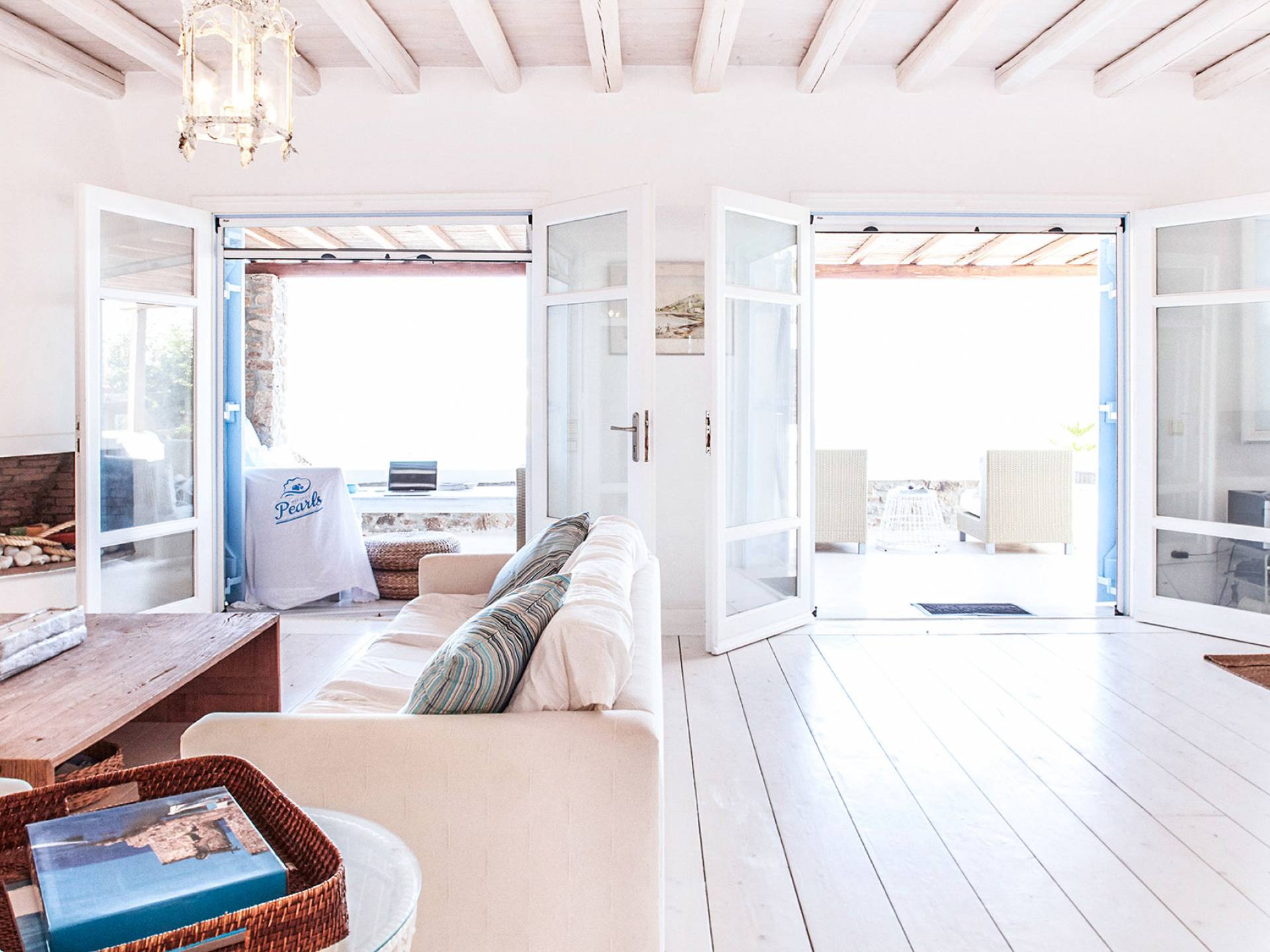 Villa Alcyone Mykonos is a luxury villa rental with 5 bedrooms and a private pool. Standing on a small hill on the edge of Kalo Livadi bay, villa Alcyone is a luxurious property that offers jaw-dropping views above the Aegean sea and elegant outdoor spaces. Just a breath away from the magnificent Kalo Livadi beach, Alcyone is the ideal choice for those looking to enjoy the natural beauty of Mykonos and unwind by the seafront.