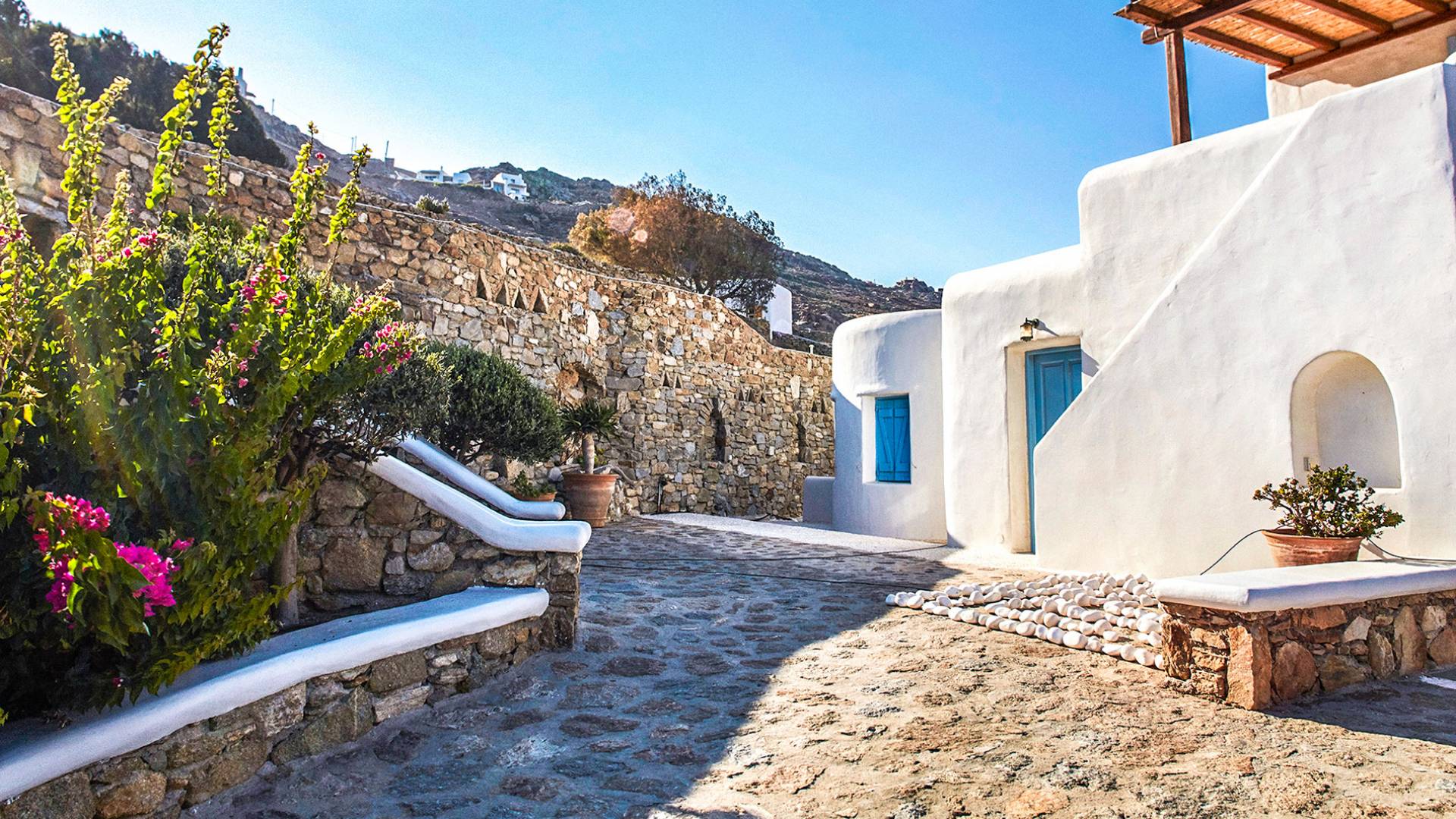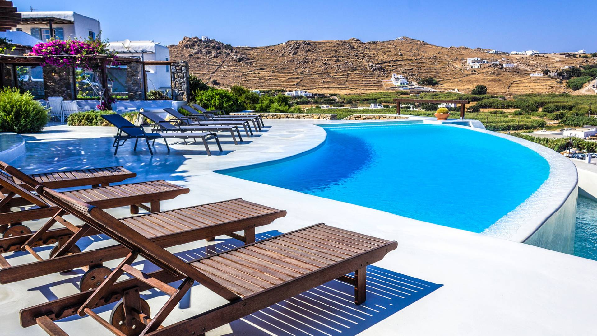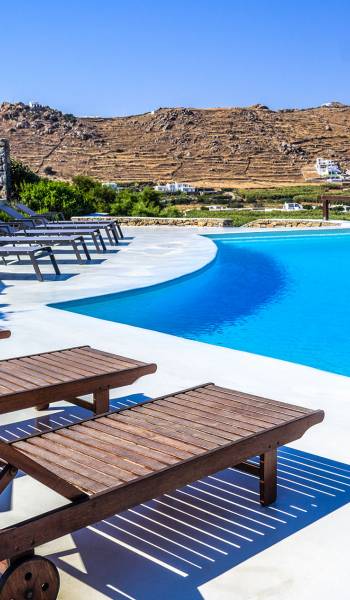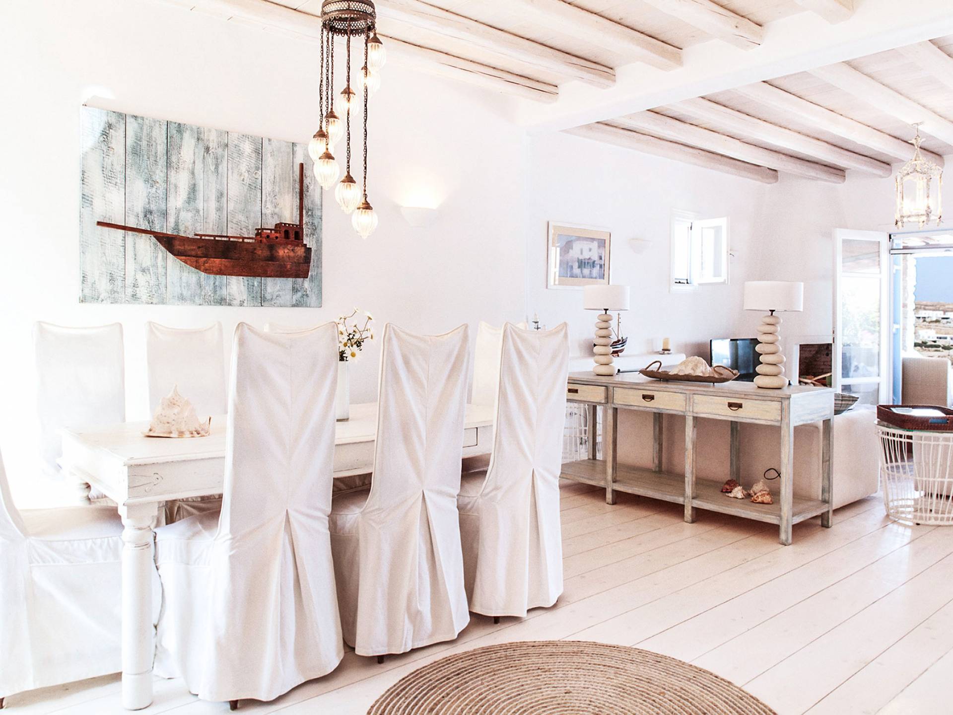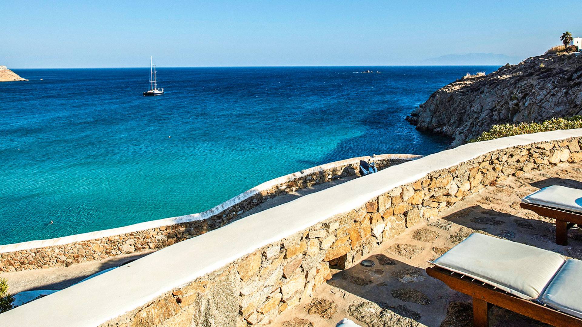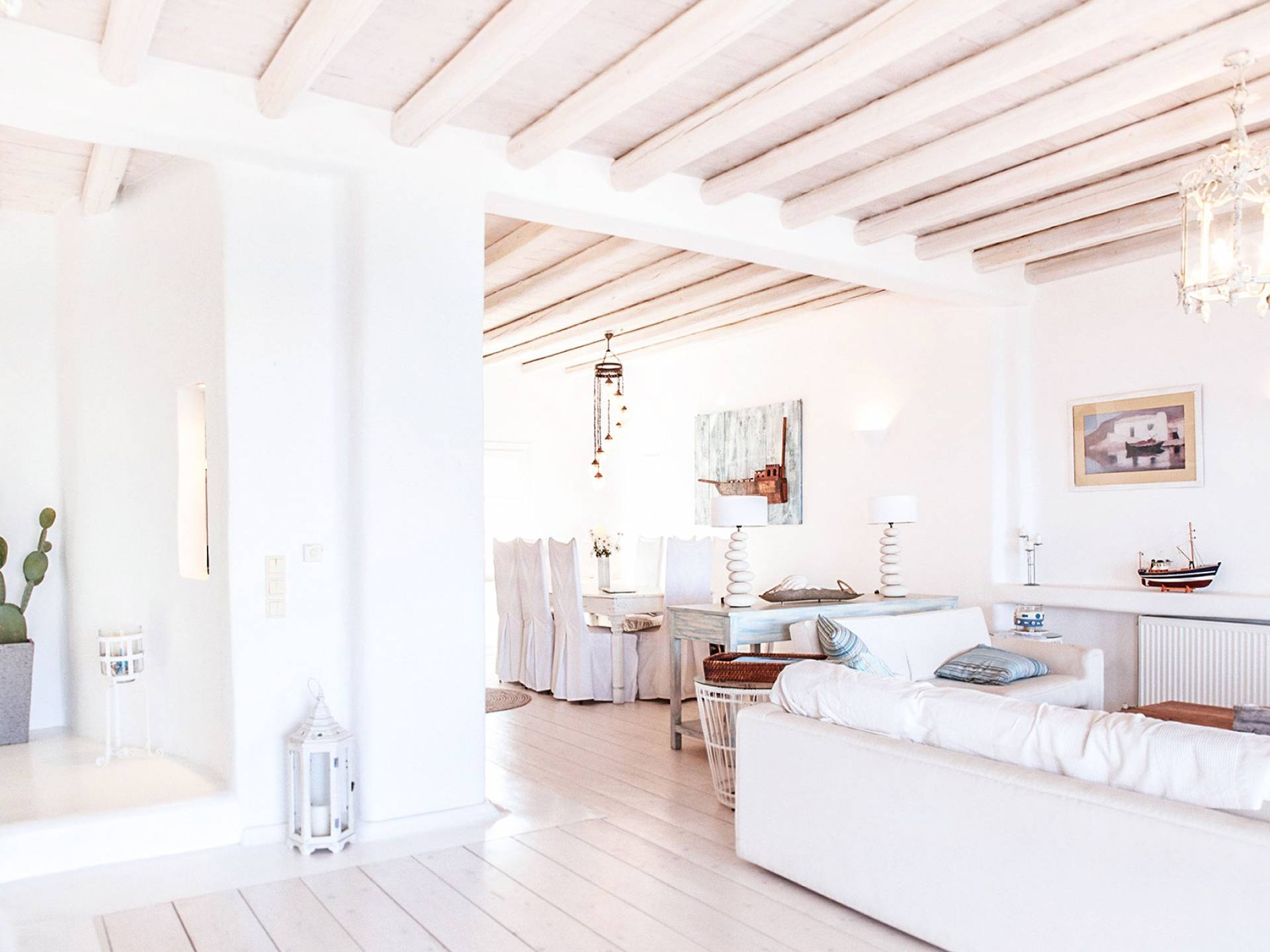 Villa Alcyone Mykonos is a luxury villa rental with 5 bedrooms and a private pool. Standing on a small hill on the edge of Kalo Livadi bay, villa Alcyone is a luxurious property that offers jaw-dropping views above the Aegean sea and elegant outdoor spaces. Just a breath away from the magnificent Kalo Livadi beach, Alcyone is the ideal choice for those looking to enjoy the natural beauty of Mykonos and unwind by the seafront.