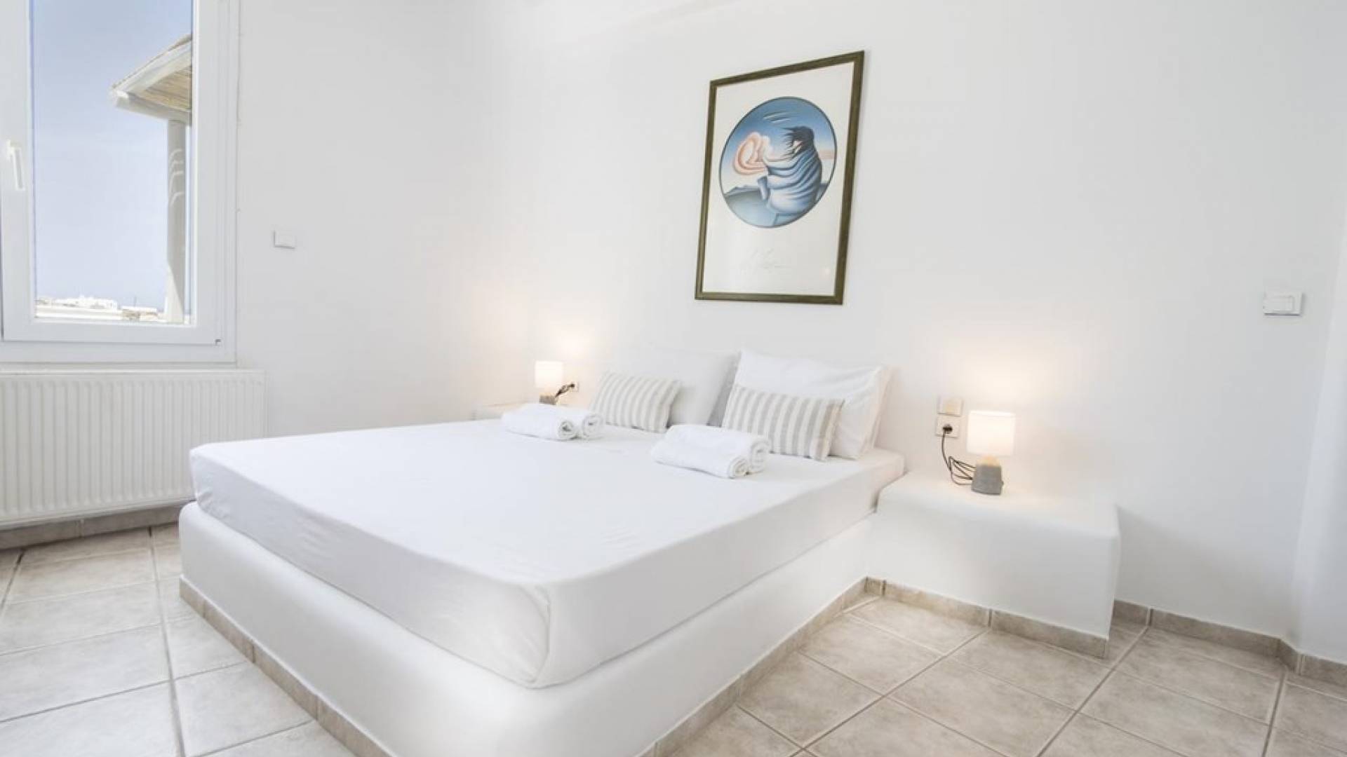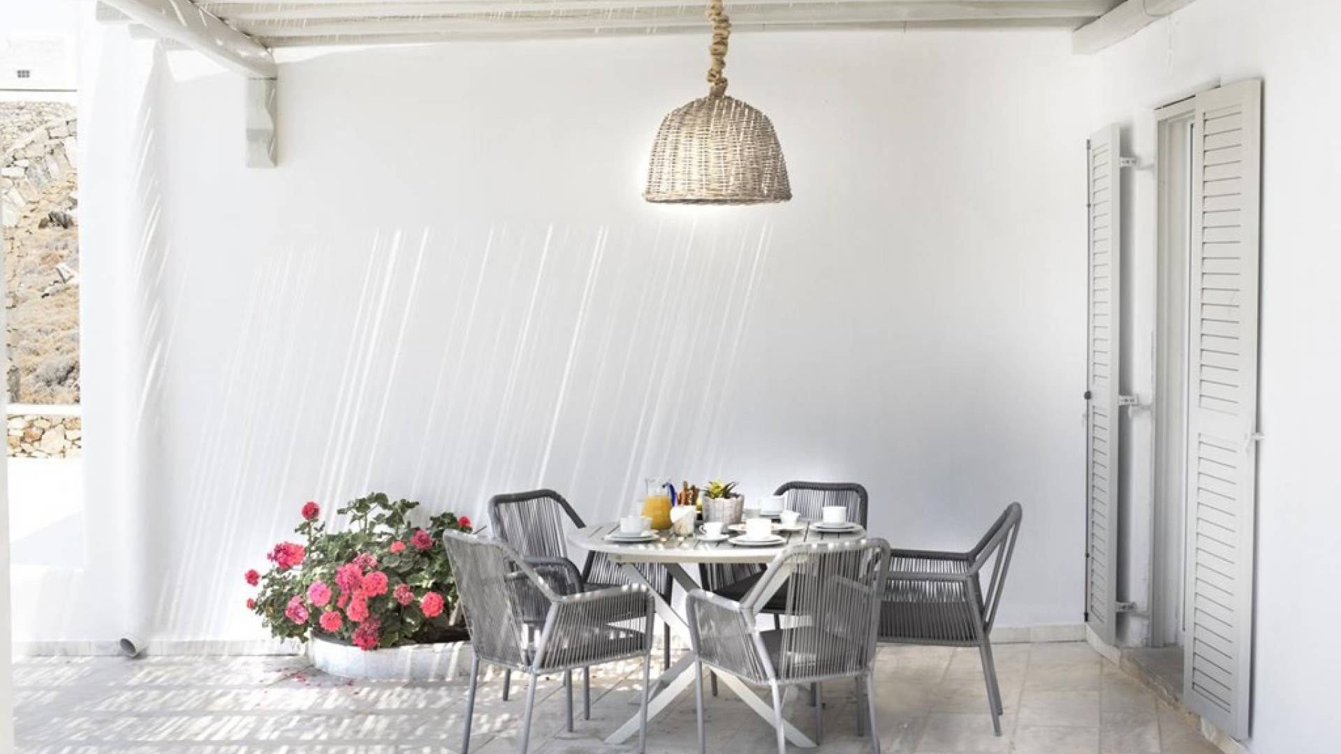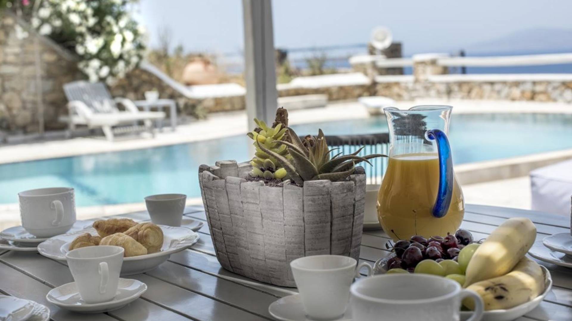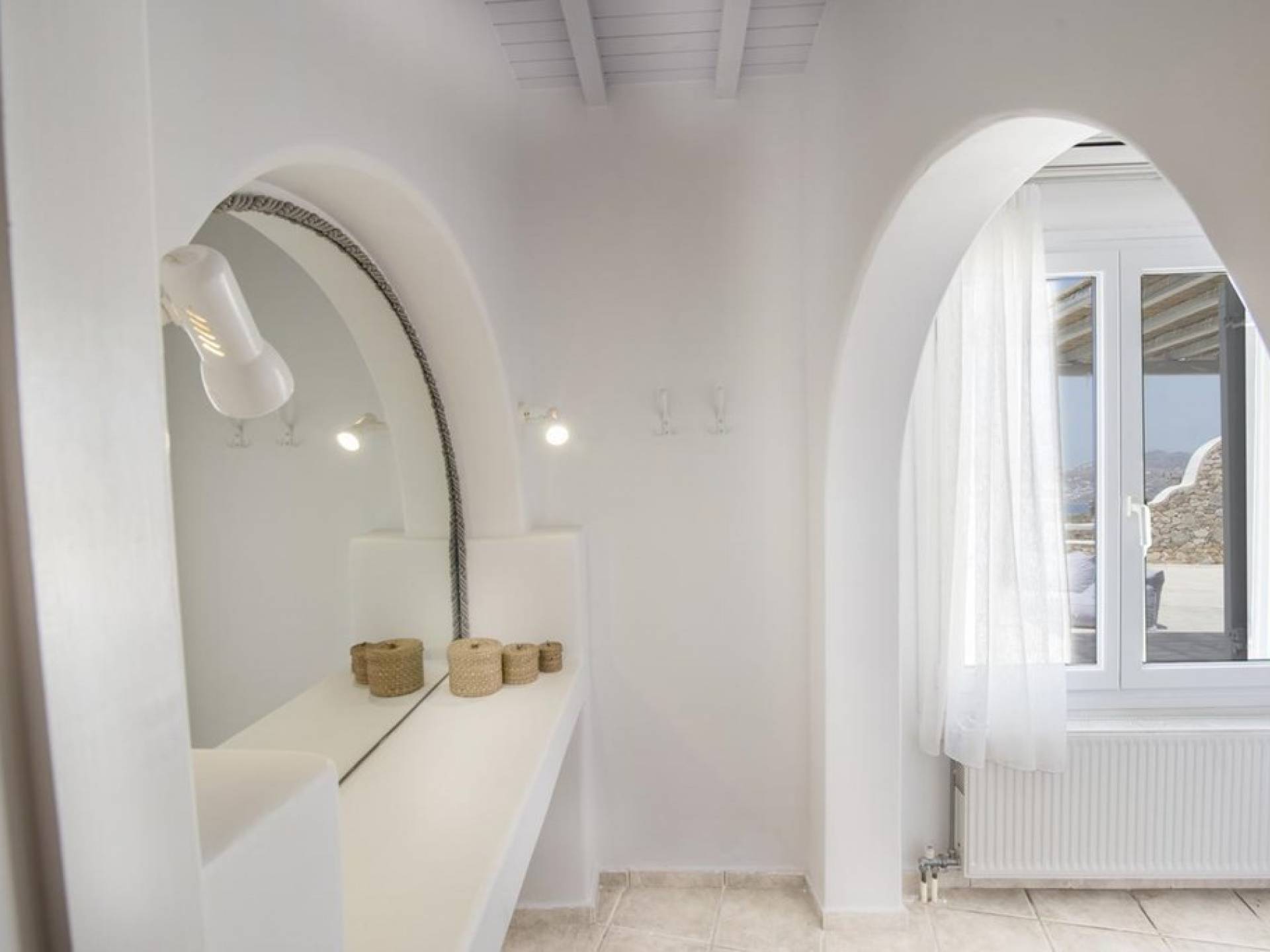 The ground level with flawless white walls and stylish furnishing has one double bedroom with ensuite bathroom and an open plan living and dining area and modern kitchen. On the first floor, you can enjoy three bedrooms all with amazing views. The meeting point in this villa is the vast exterior with its private swimming pool and delightful shaded dining and lounge area, all inclusive of a breathtaking view of the Aegean Sea. Spacious, simply but elegantly decorated, and full of things to do, Dolfino Villa Mykonos is definitely a choice to consider if you are looking to spend quality time with your loved ones.