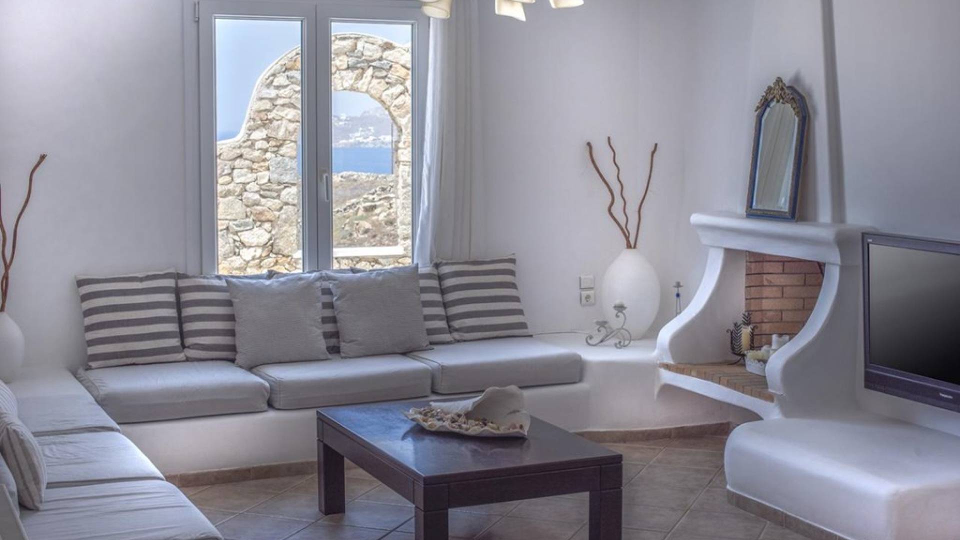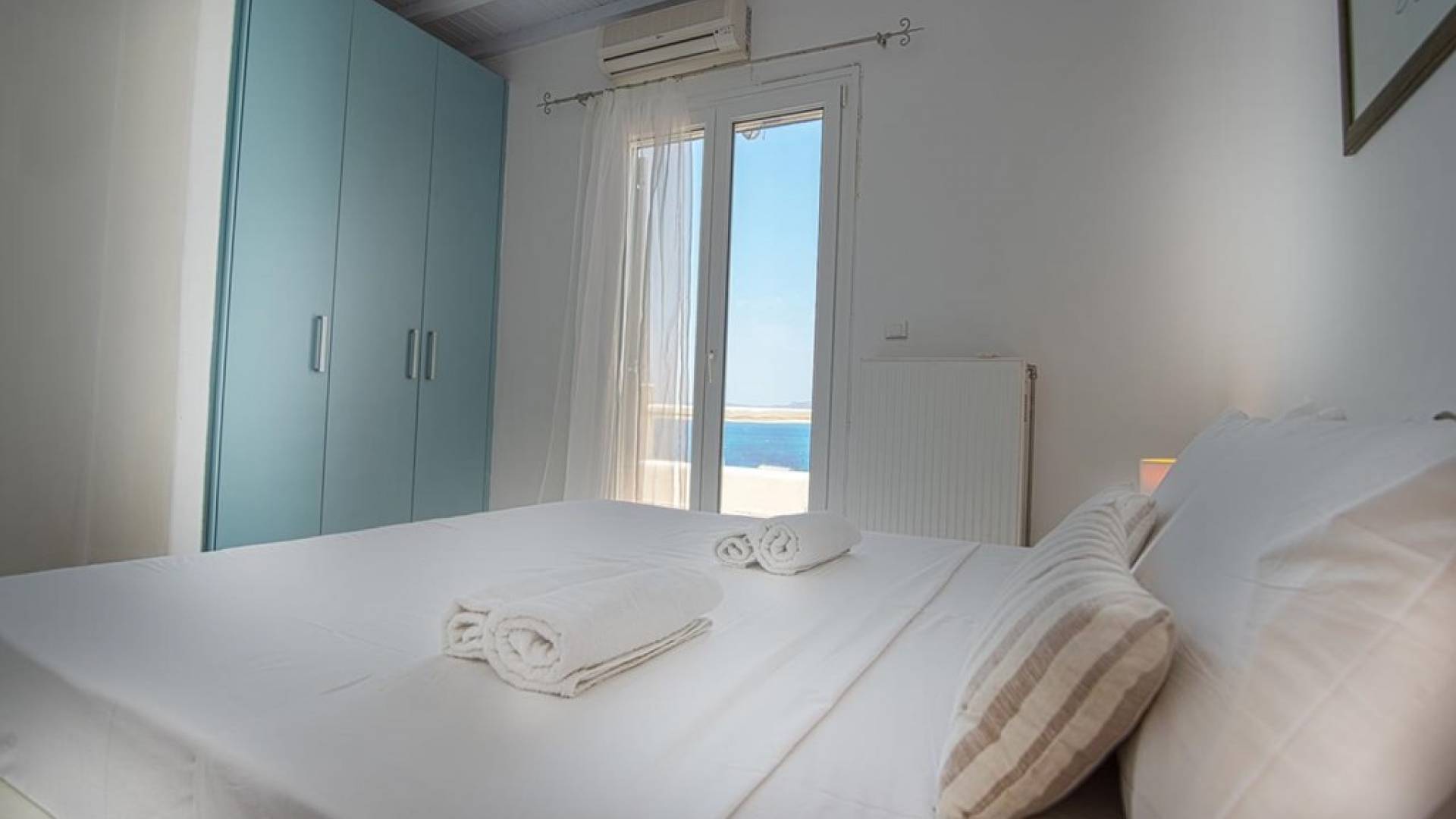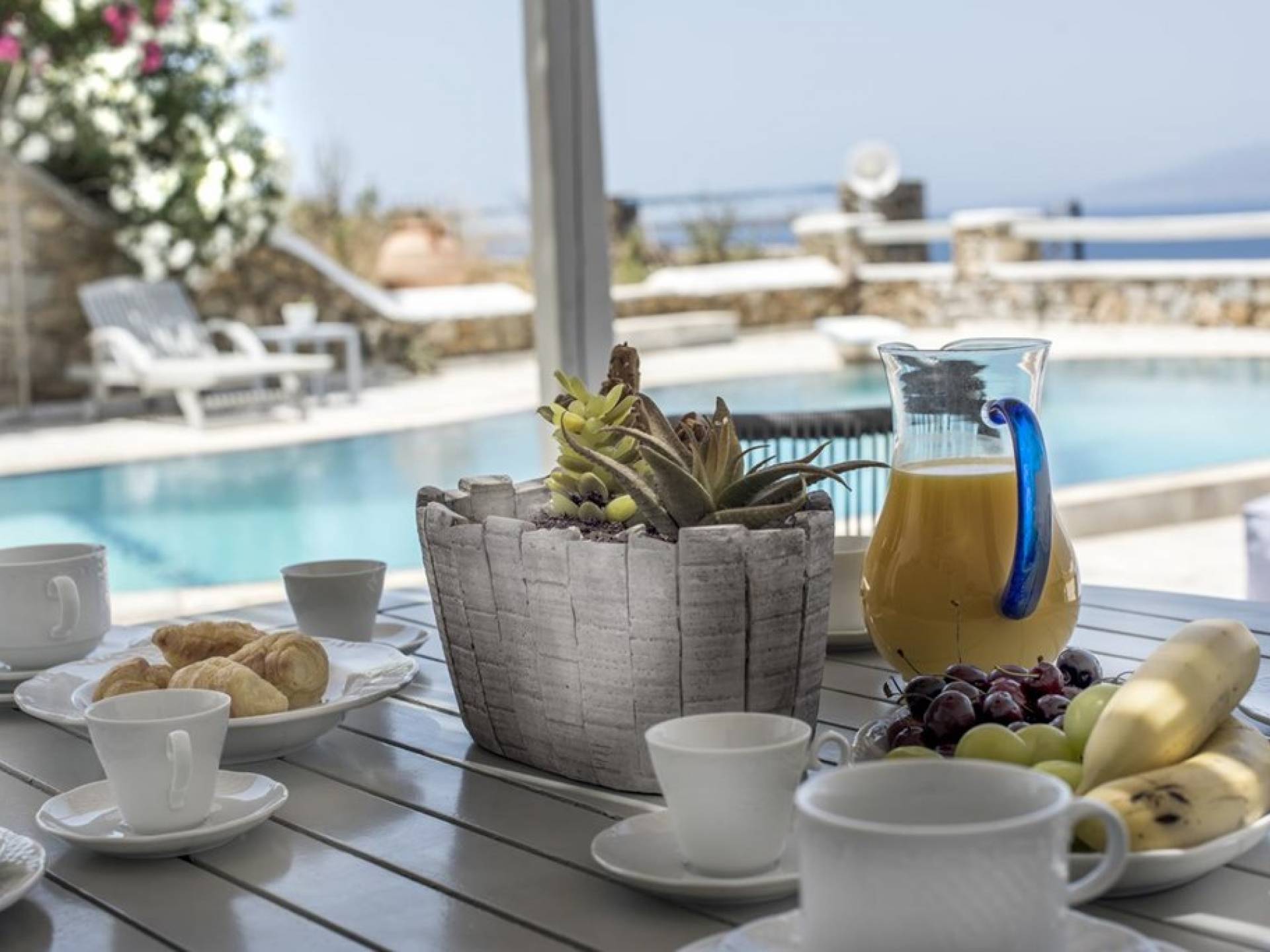 The ground level with flawless white walls and stylish furnishing has one double bedroom with ensuite bathroom and an open plan living and dining area and modern kitchen. On the first floor, you can enjoy three bedrooms all with amazing views. The meeting point in this villa is the vast exterior with its private swimming pool and delightful shaded dining and lounge area, all inclusive of a breathtaking view of the Aegean Sea. Spacious, simply but elegantly decorated, and full of things to do, Dolfino Villa Mykonos is definitely a choice to consider if you are looking to spend quality time with your loved ones.