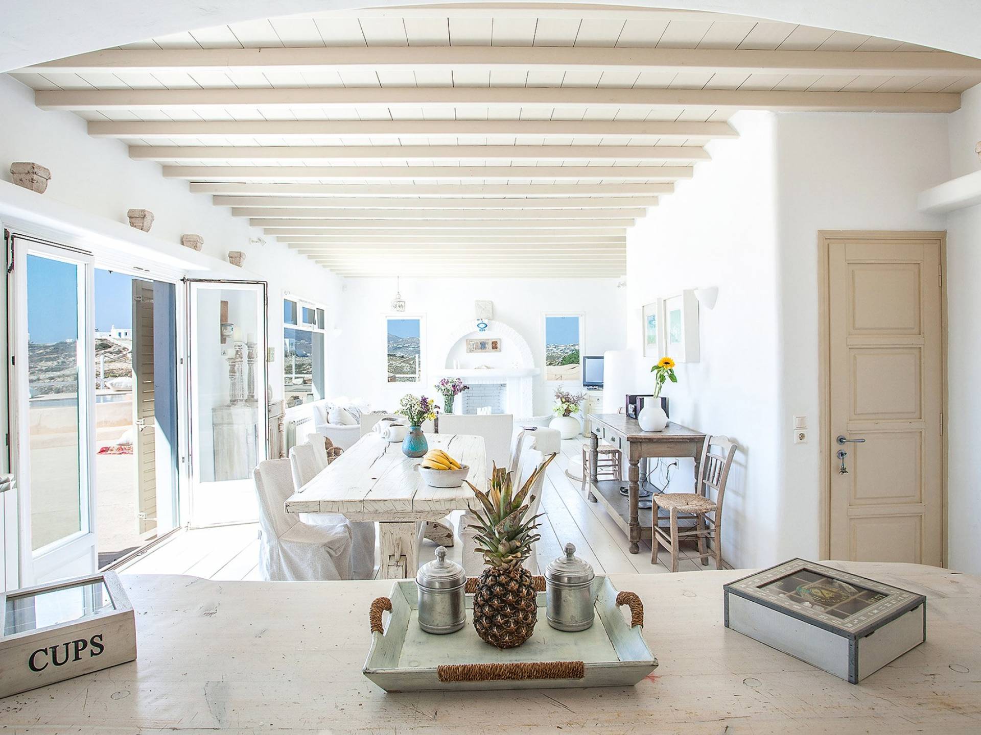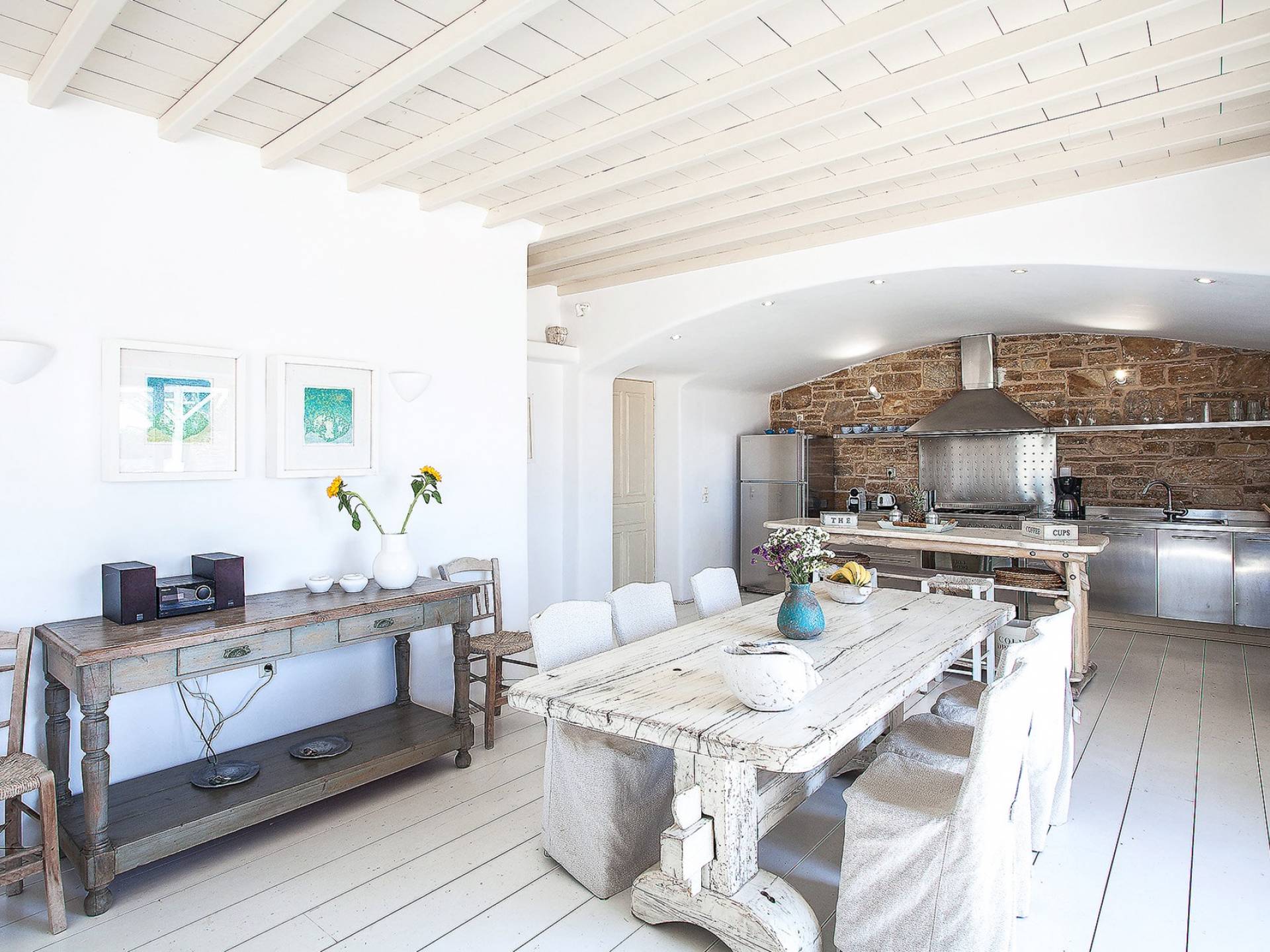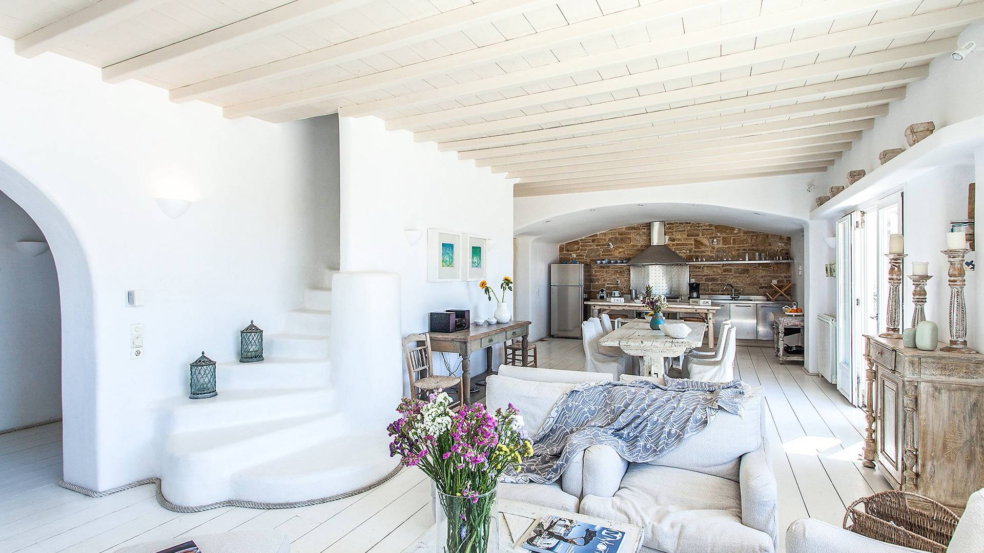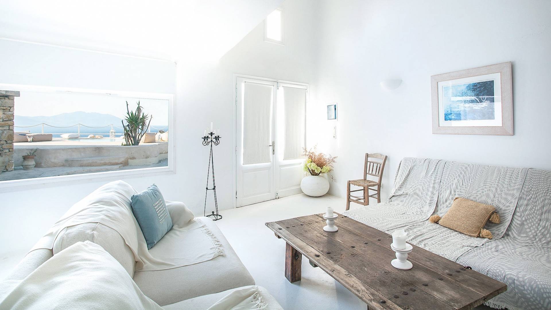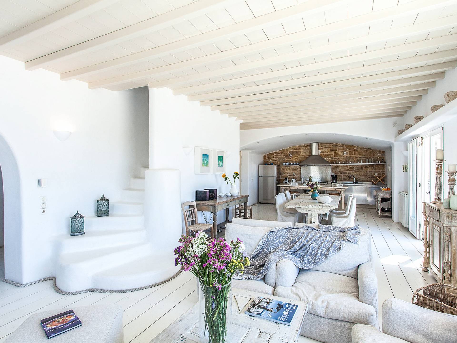 Villa Galena Mykonos is beautiful, modern, and striking, yet also adopting the marvelous, traditional chalk-white curvy and honey-colored stone Myconian features seen all over Mykonos. A beautifully ambient seaside theme floats through the villa, and the fabulous first-class furniture and accessories make your heart sing. Neutral tones are offset by brief vivid bursts of color or texture.