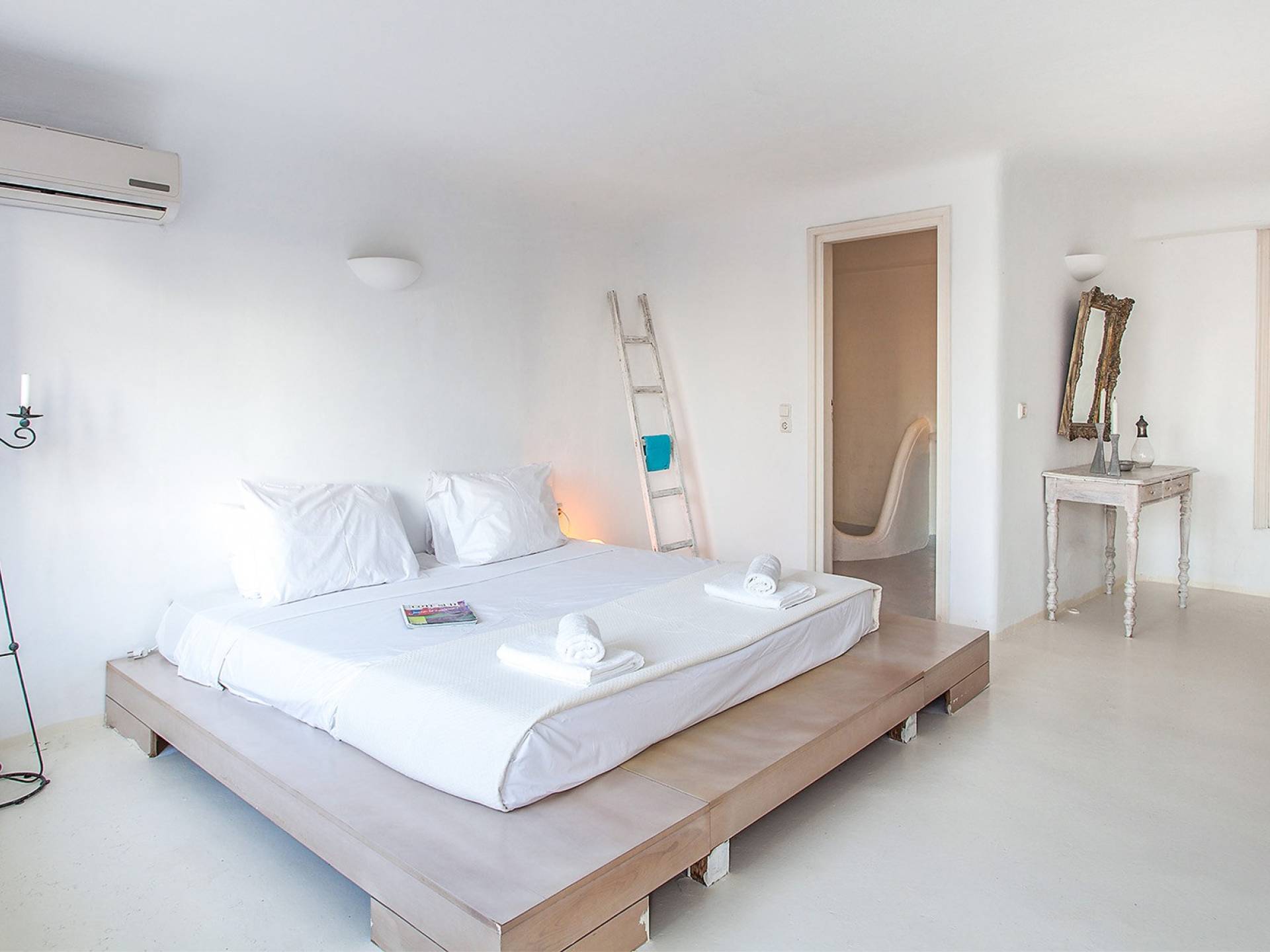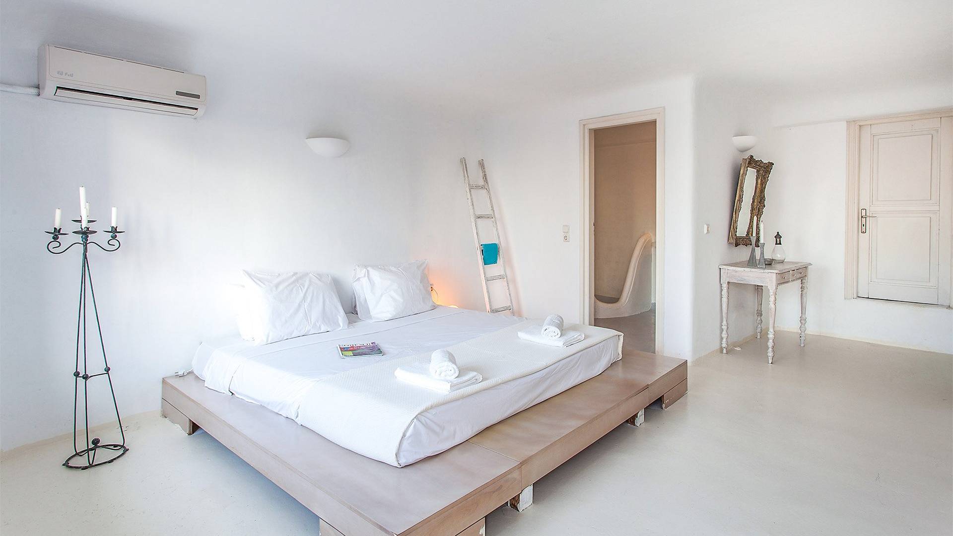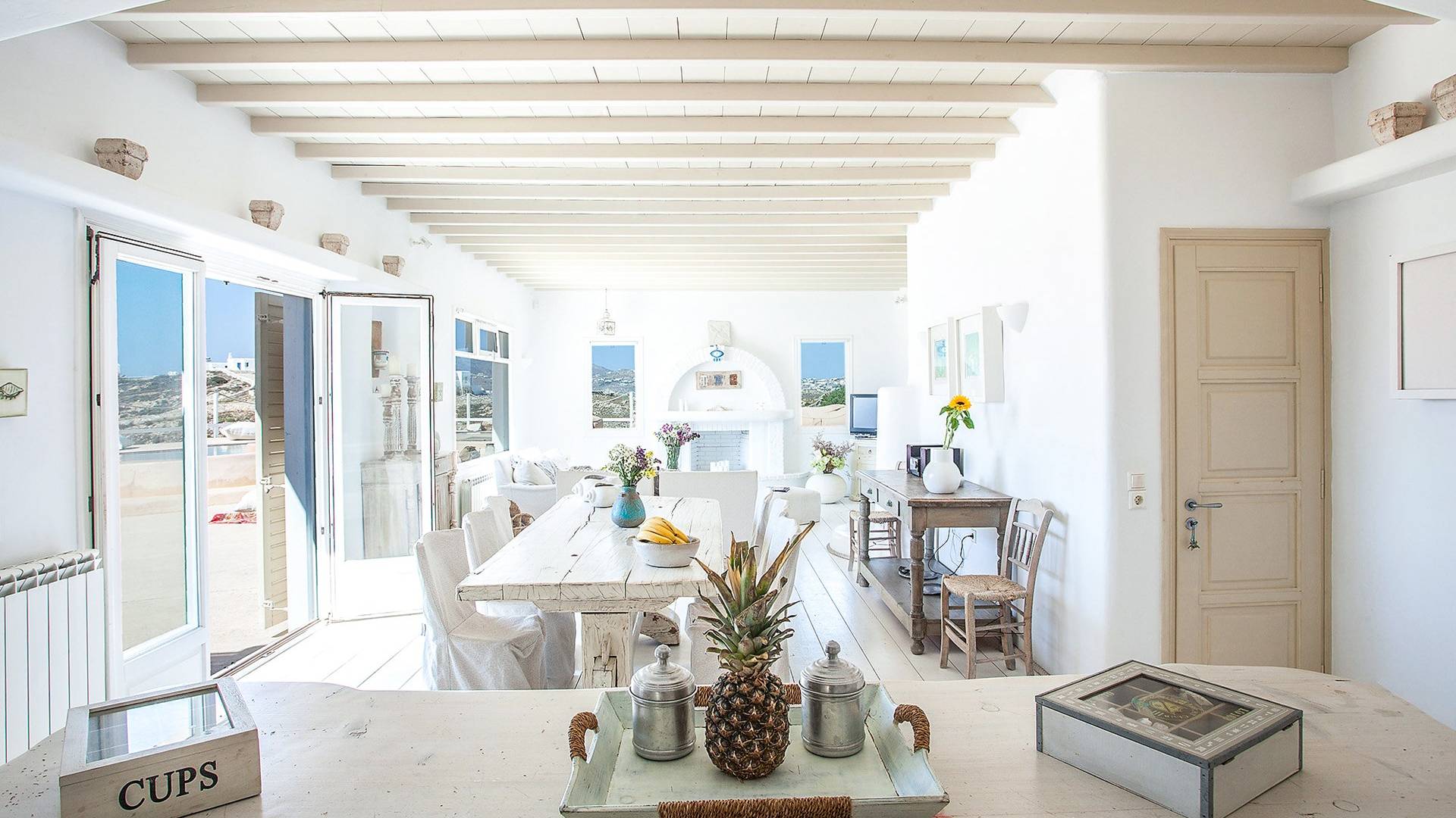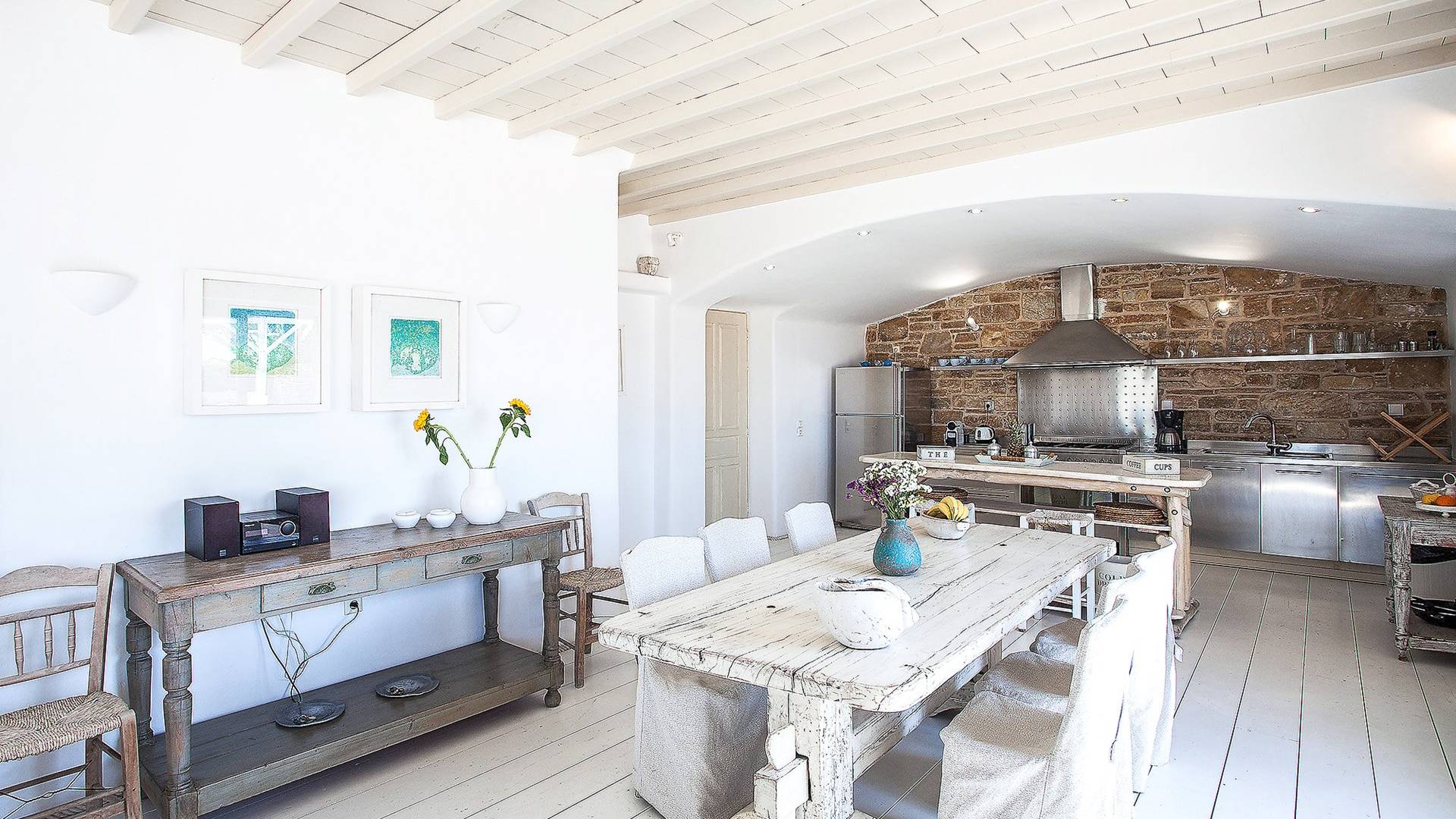 Villa Galena Mykonos is beautiful, modern, and striking, yet also adopting the marvelous, traditional chalk-white curvy and honey-colored stone Myconian features seen all over Mykonos. A beautifully ambient seaside theme floats through the villa, and the fabulous first-class furniture and accessories make your heart sing. Neutral tones are offset by brief vivid bursts of color or texture.