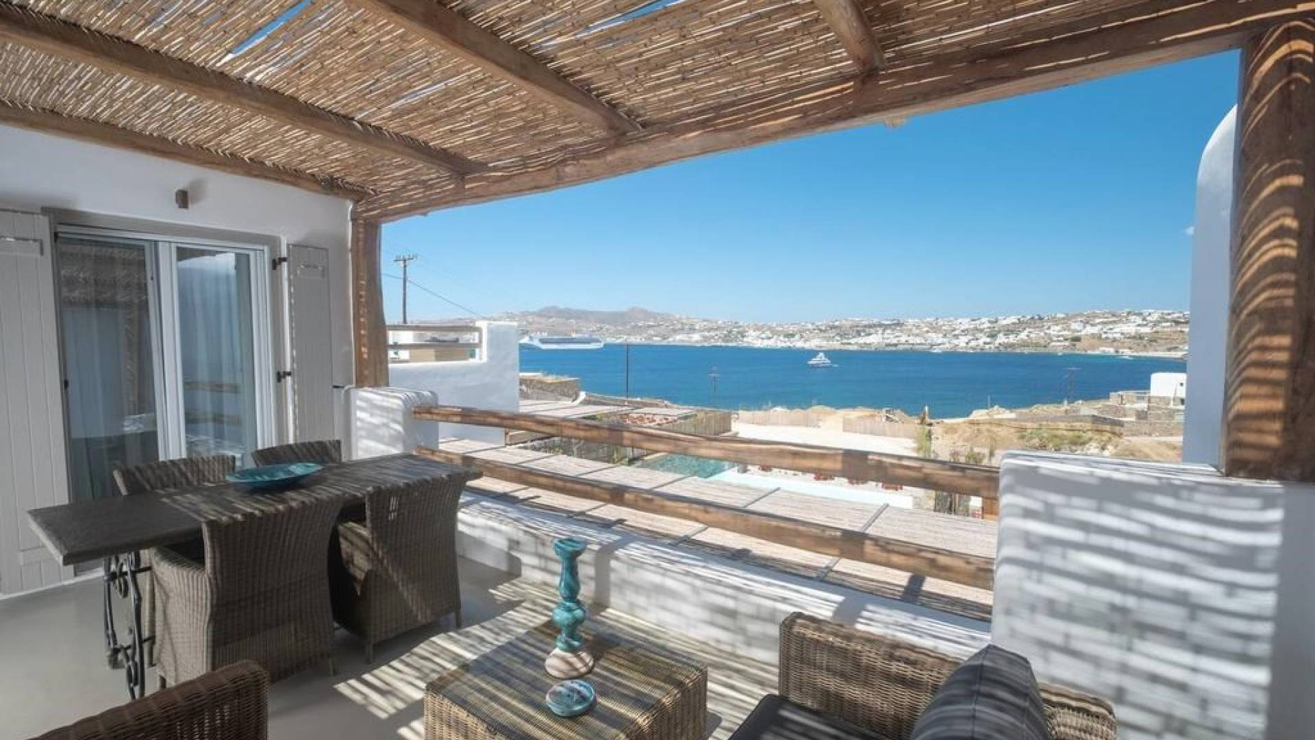 Villa Maroon VI Mykonos is a luxury villa rental with 1 bedroom. Villa Maroon VI is a luxurious property that is part of a brand new complex located in the famous area of Kanalia, just a few minutes away from Mykonos Town. It features a shared swimming pool and an alluring private veranda with captivating views of the famous windmills and Little Venice of Mykonos Town over the bay below.