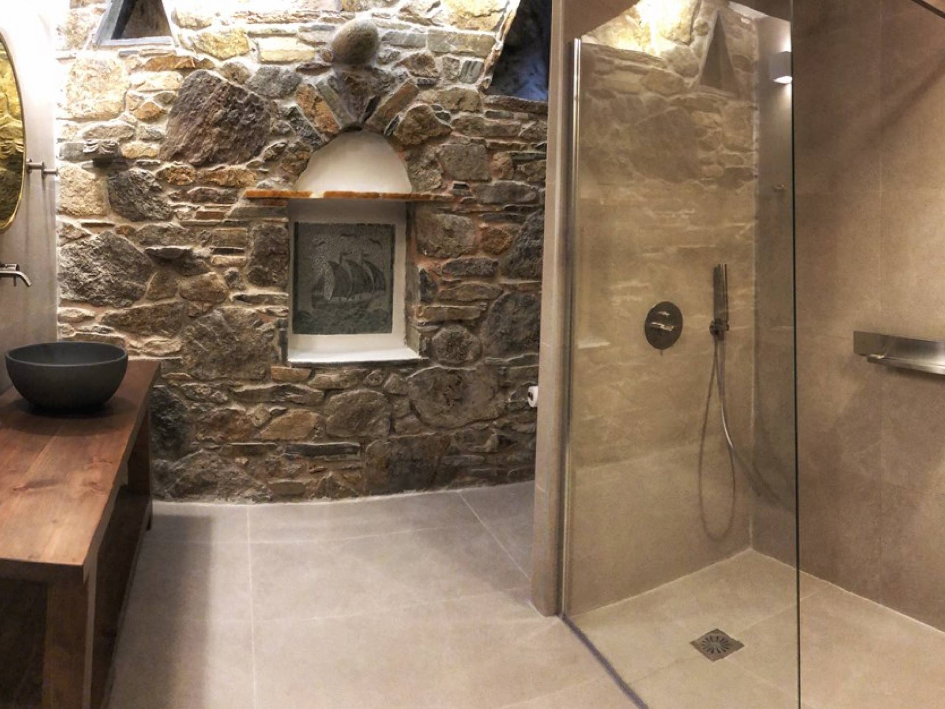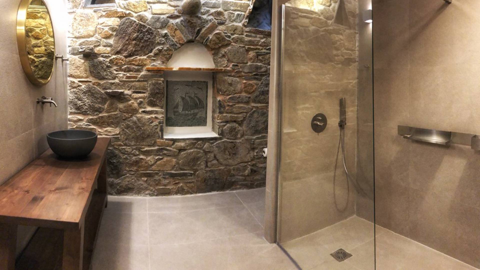 #4 is the villa, which provides a whole new level of comfort in its 120 m2. It hosts 4 persons and is divided into two levels. In the ground floor, you will find the living room with a fireplace, a dining room, a fully equipped kitchen, a bedroom, an impressive bathroom that is built into the mountain and a storage room. The upper level contains the master bedroom with a double bed and its own private bathroom. There are two verandas, one on each level, with a breathtaking view to the pool and the sea. Warning: you might decide not to set foot outside of Leonis, just to get the most out of the unforgettable experience that the villa offers.