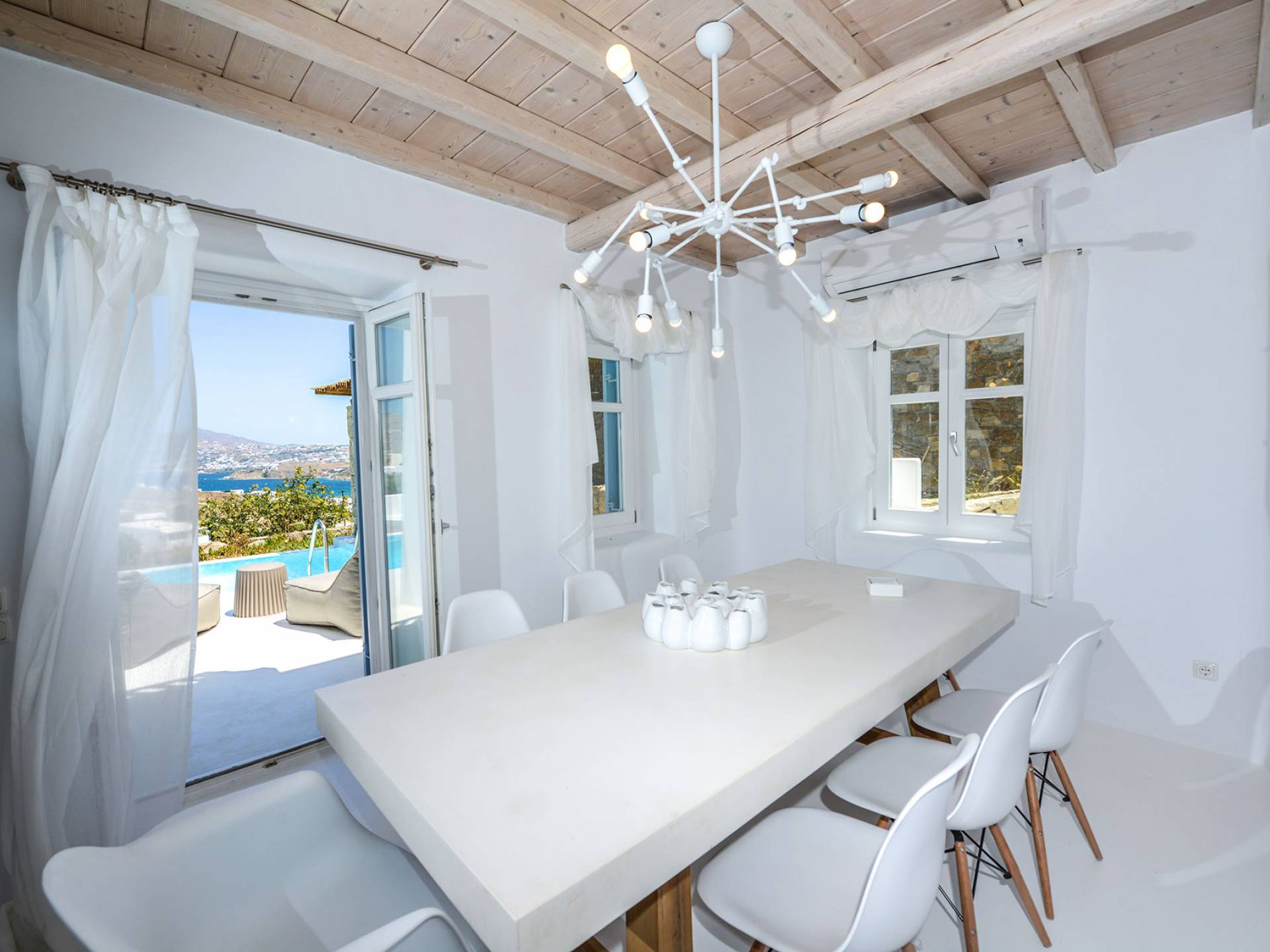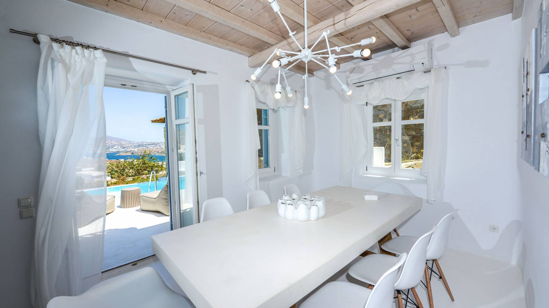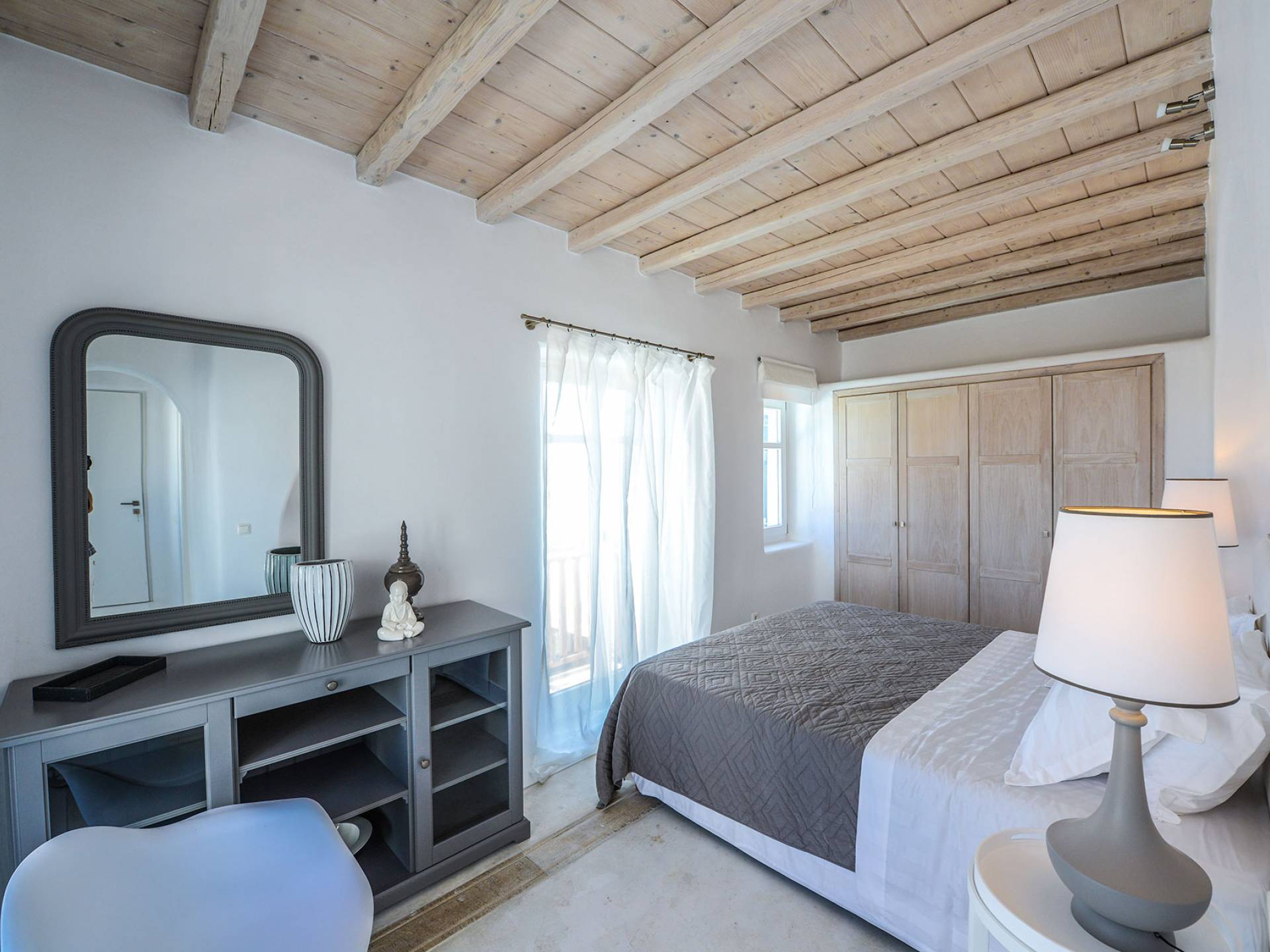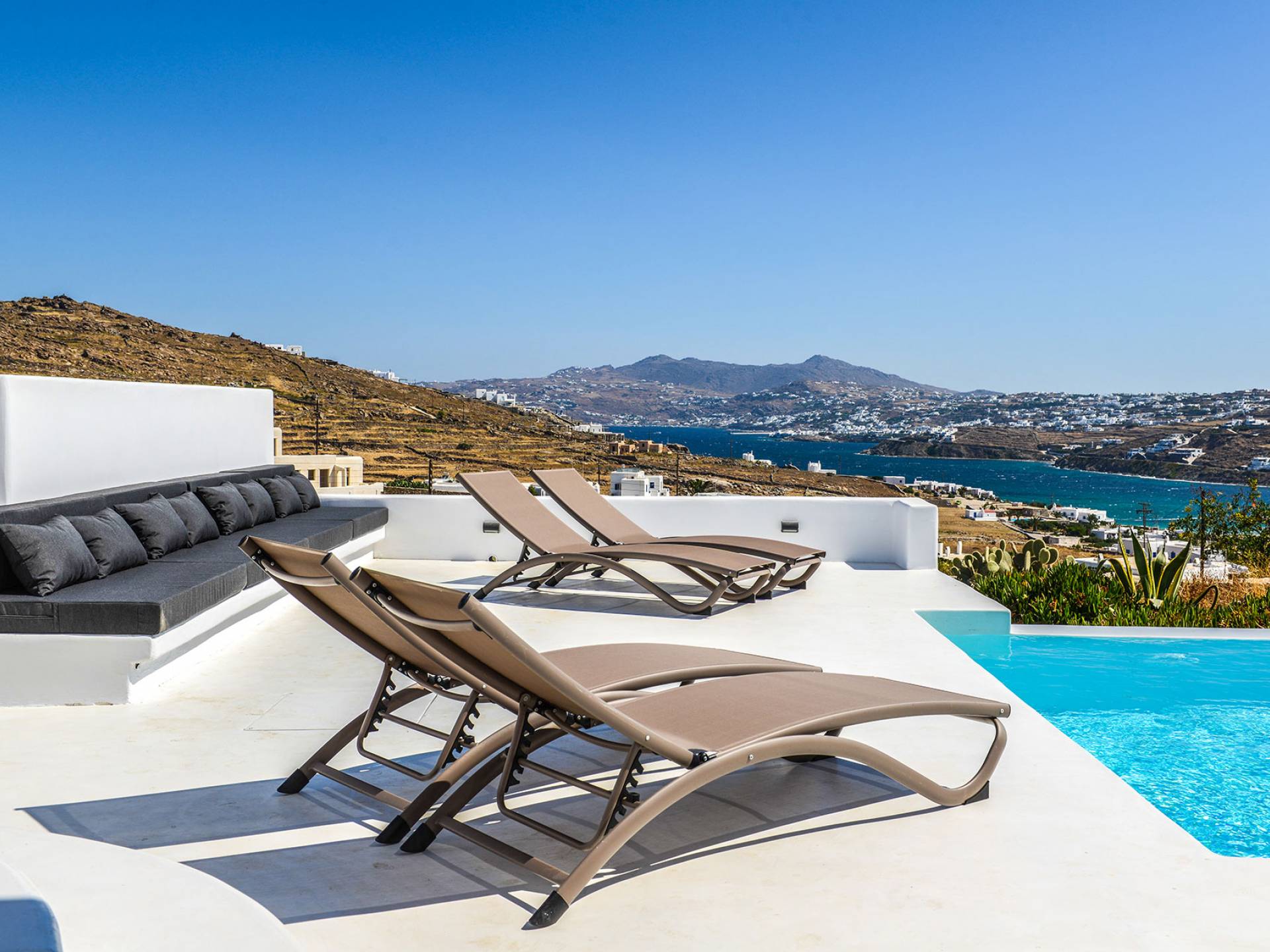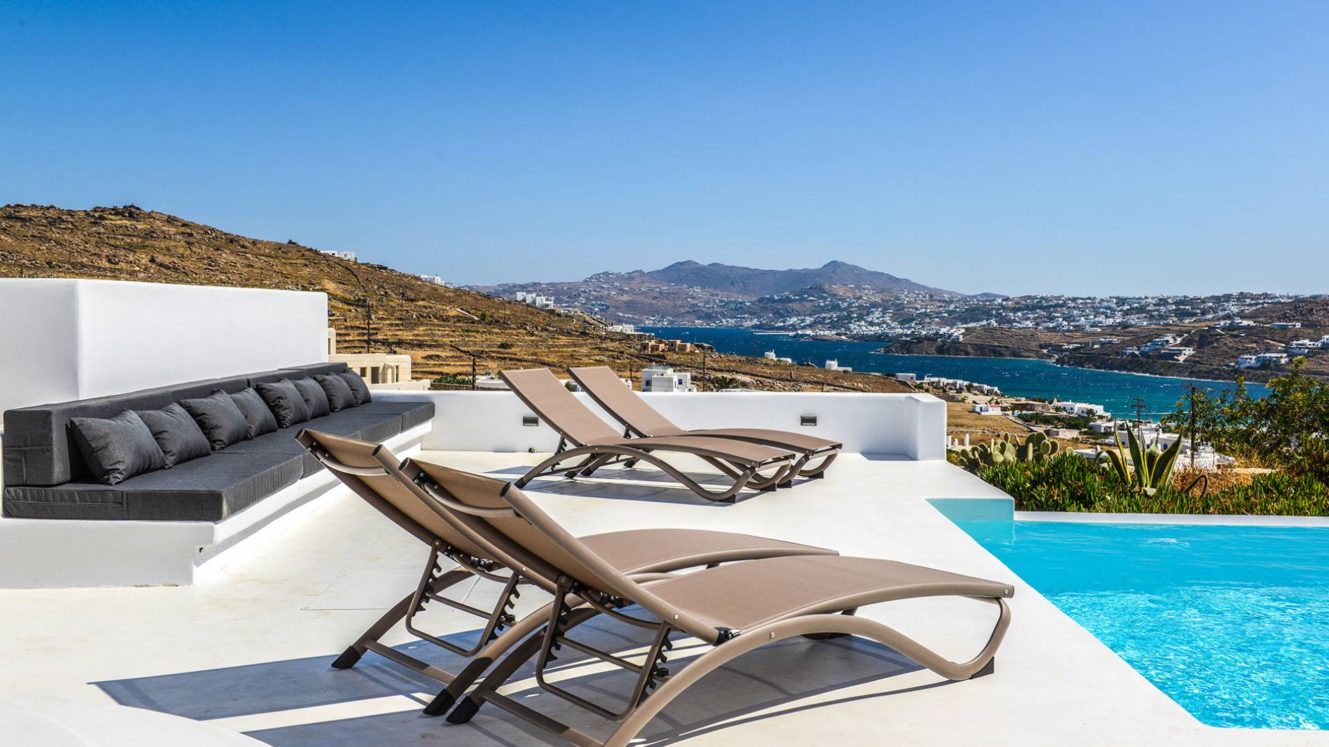 Stylishly contemporary interiors are well-matched with the stunning outside area, where the swimming pool stands as a point of reference, lined with trendy sun-chairs and a shaded dining area provides a cool spot from the heated sun at this amazing Villa in Ornos. We offer daily cleaning and twice a week change of linen, to all our villas in Mykonos. Dive right in – Villa Pearl Mykonos is only a 5-minute walk from a golden-sand beach (Agios Ioannis Beach). Located in Ornos Bay of Mykonos, the Cycladic-style Villa Pearl features a private pool and a sun terrace with panoramic views over the Aegean Sea. Free WiFi access is available throughout and free parking is possible on site. Combining modern and traditional elements, Villa Pearl is elegantly decorated with well-chosen furnishings, beamed ceilings, and white tones. It consists of 3 master bedrooms, a living and dining area, and a modern fully equipped kitchen.