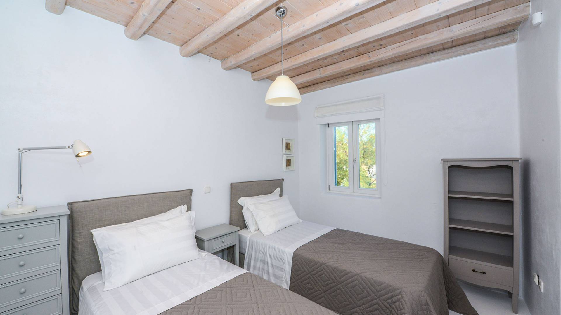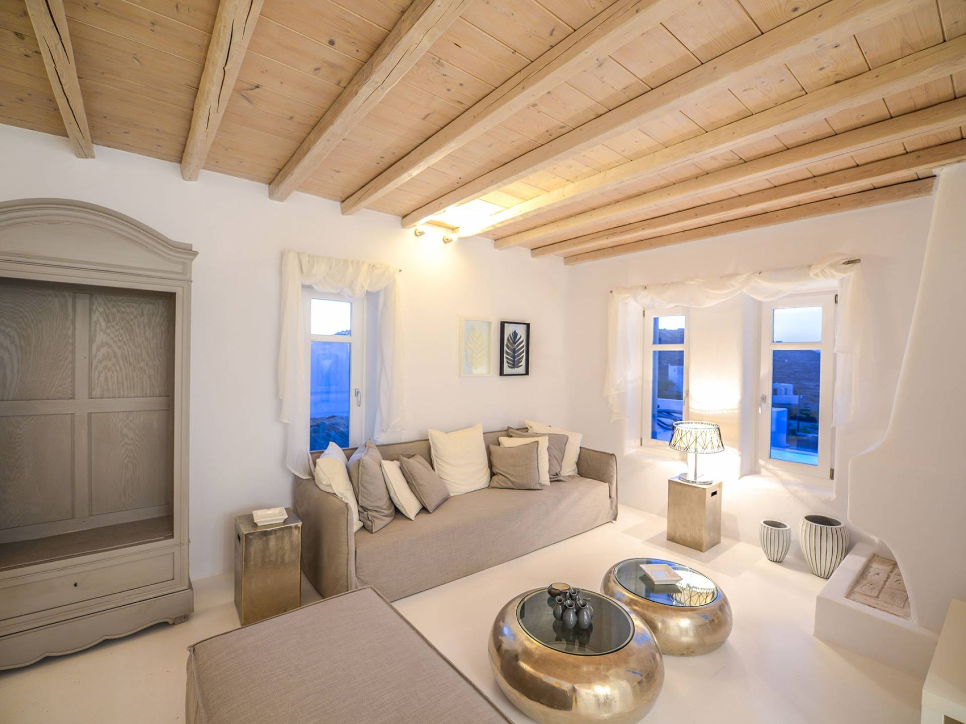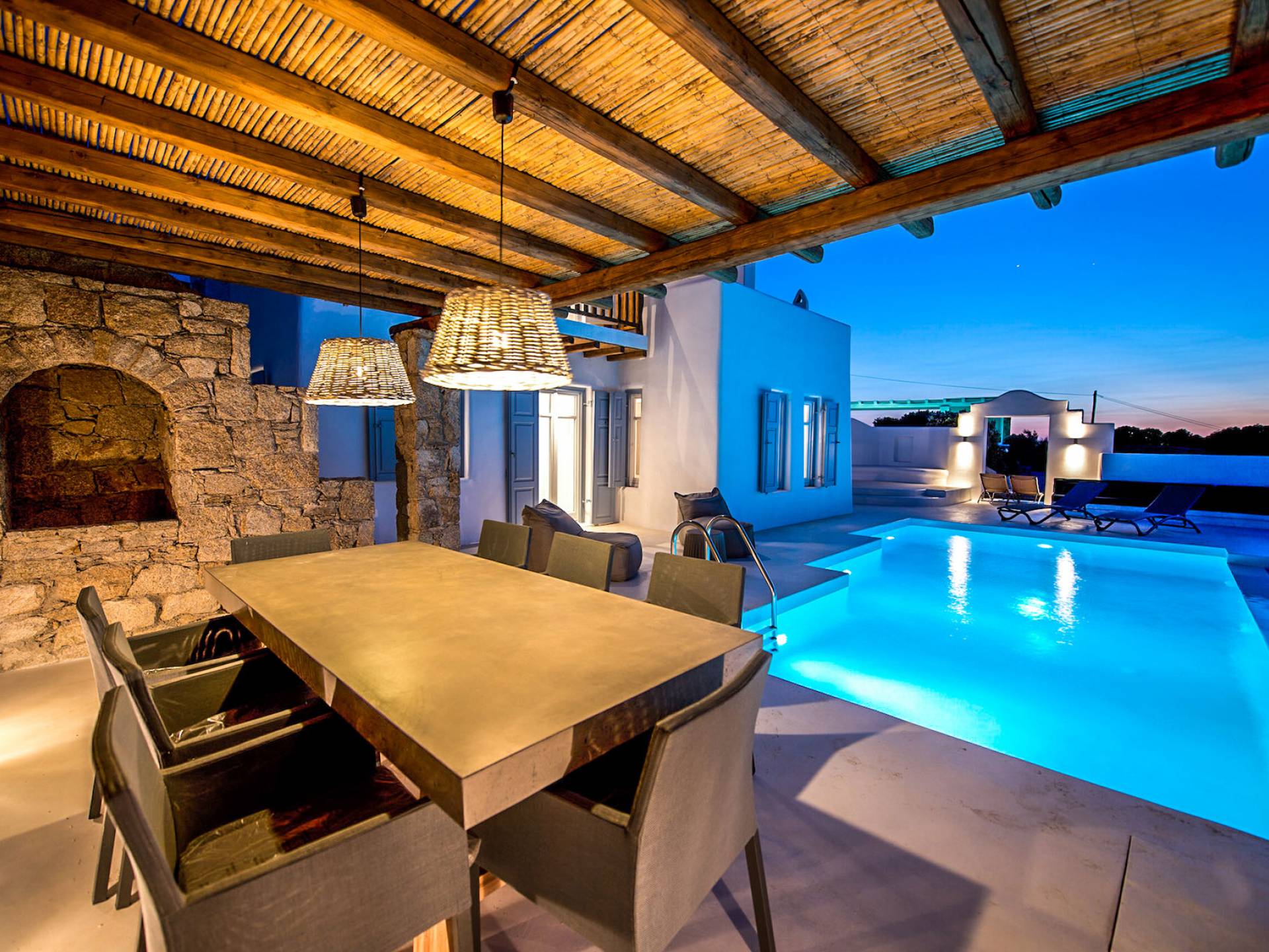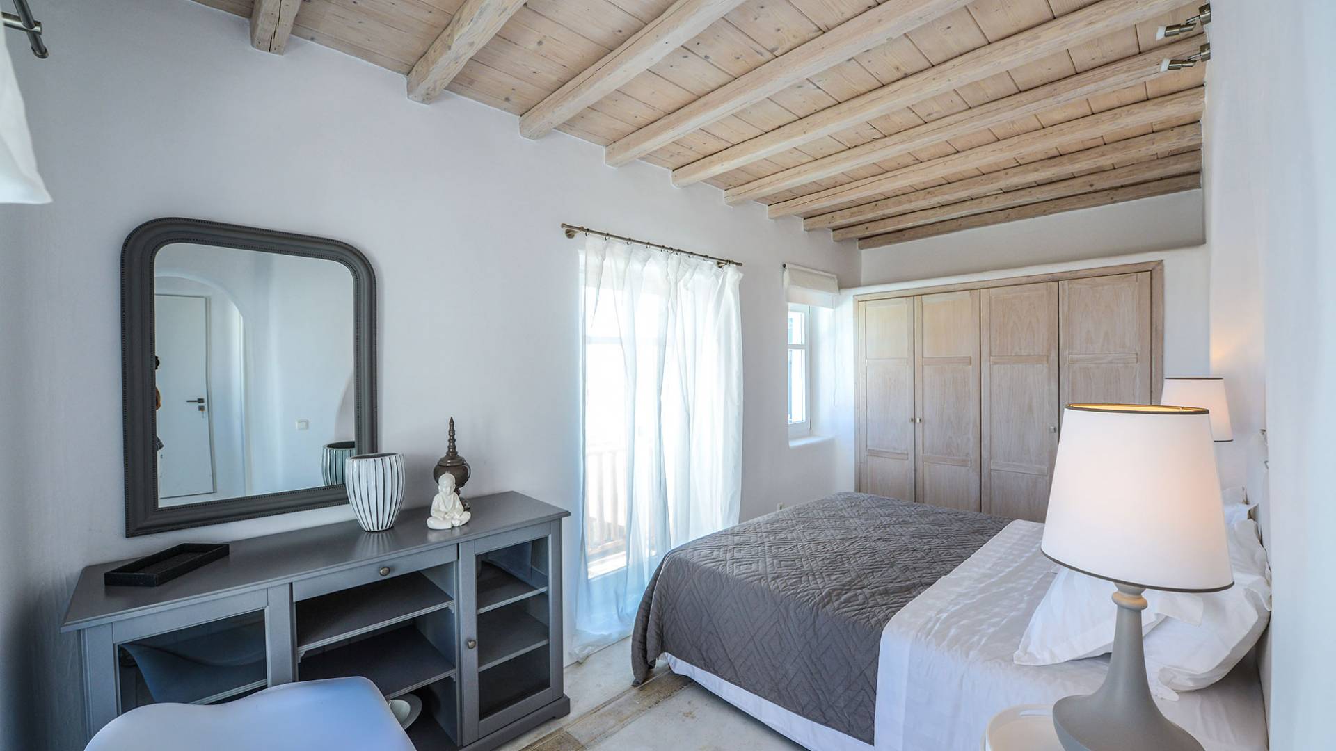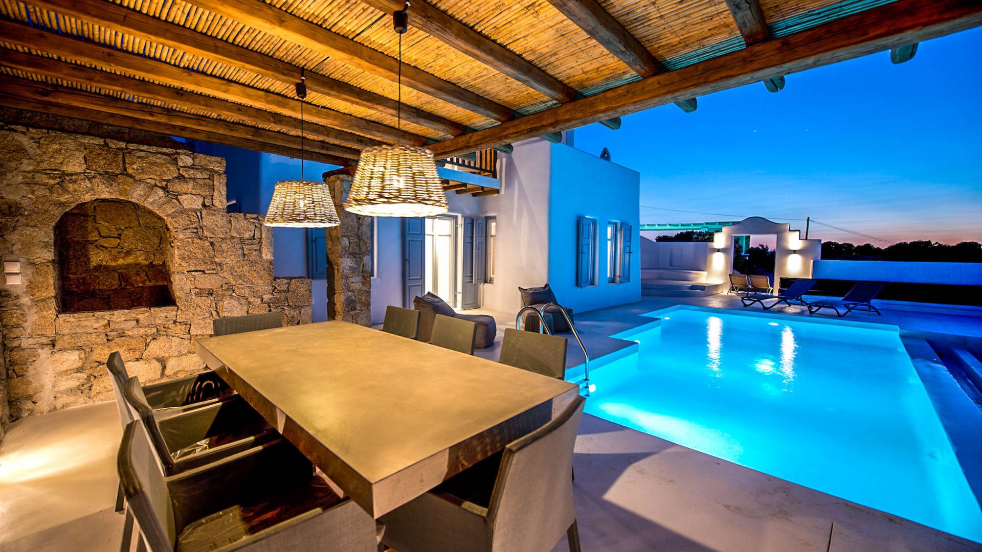 Stylishly contemporary interiors are well-matched with the stunning outside area, where the swimming pool stands as a point of reference, lined with trendy sun-chairs and a shaded dining area provides a cool spot from the heated sun at this amazing Villa in Ornos. We offer daily cleaning and twice a week change of linen, to all our villas in Mykonos. Dive right in – Villa Pearl Mykonos is only a 5-minute walk from a golden-sand beach (Agios Ioannis Beach). Located in Ornos Bay of Mykonos, the Cycladic-style Villa Pearl features a private pool and a sun terrace with panoramic views over the Aegean Sea. Free WiFi access is available throughout and free parking is possible on site. Combining modern and traditional elements, Villa Pearl is elegantly decorated with well-chosen furnishings, beamed ceilings, and white tones. It consists of 3 master bedrooms, a living and dining area, and a modern fully equipped kitchen.