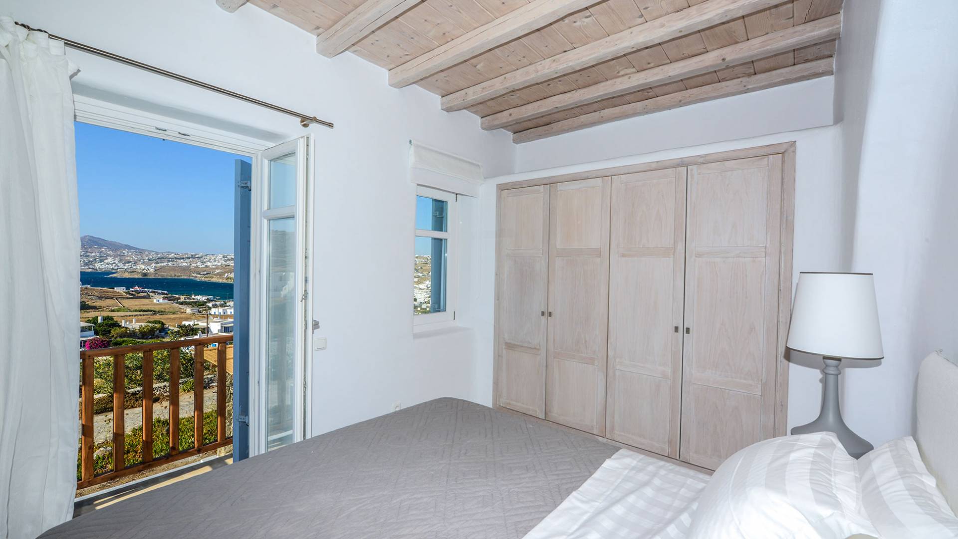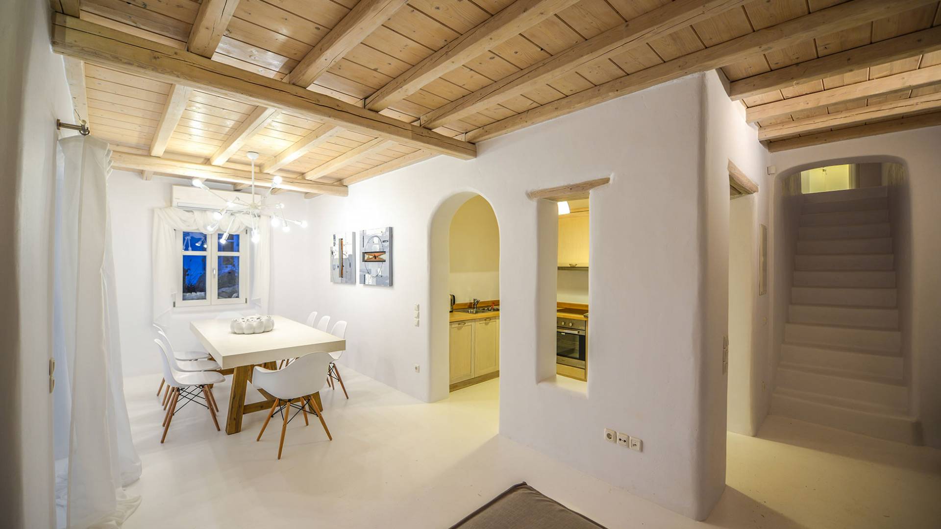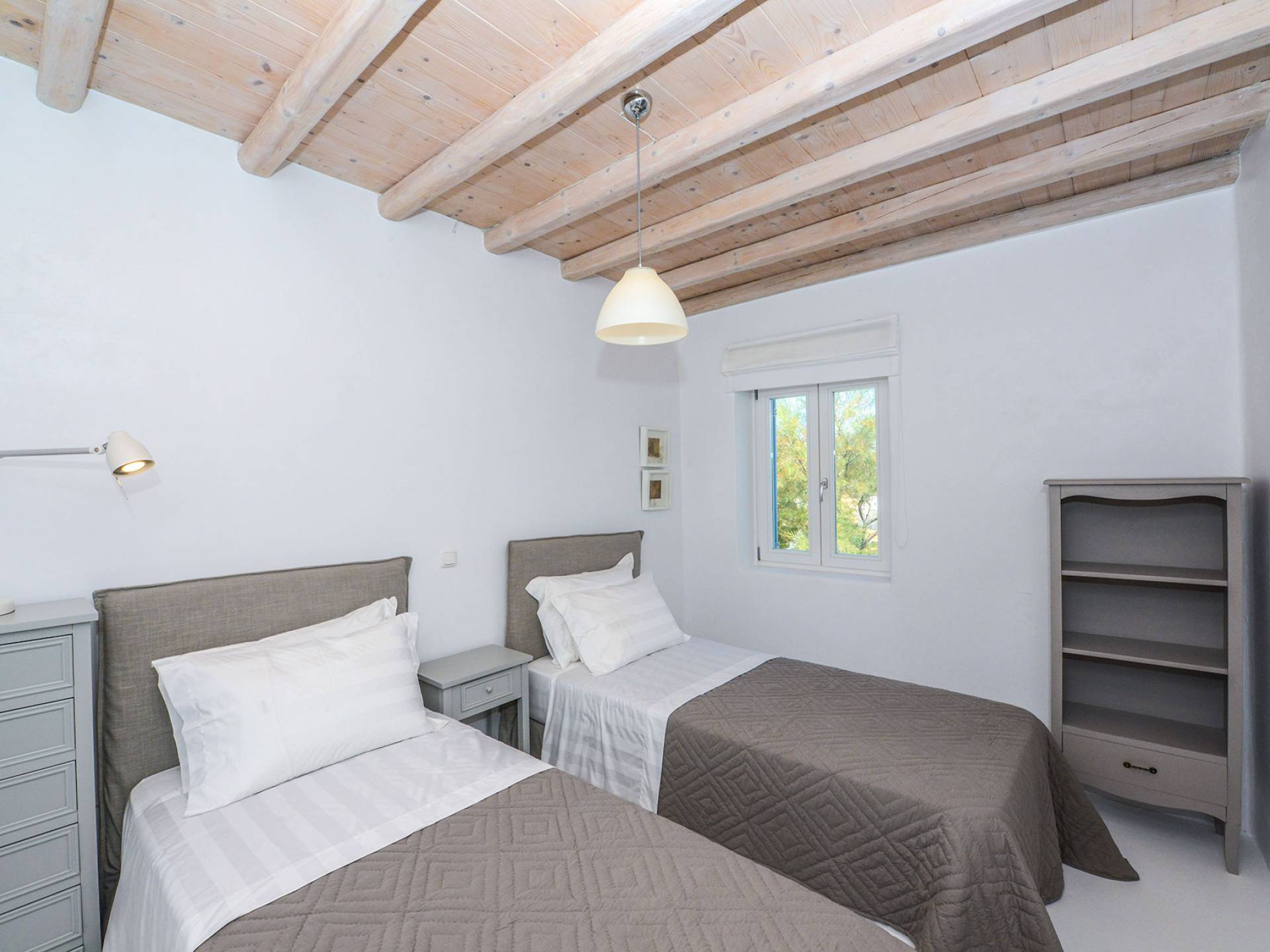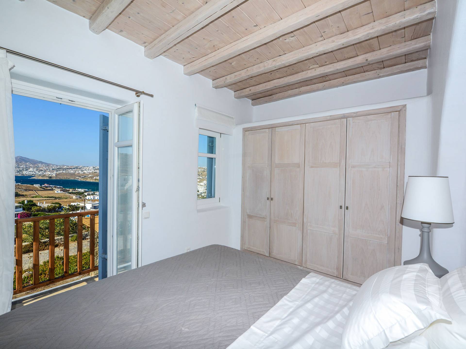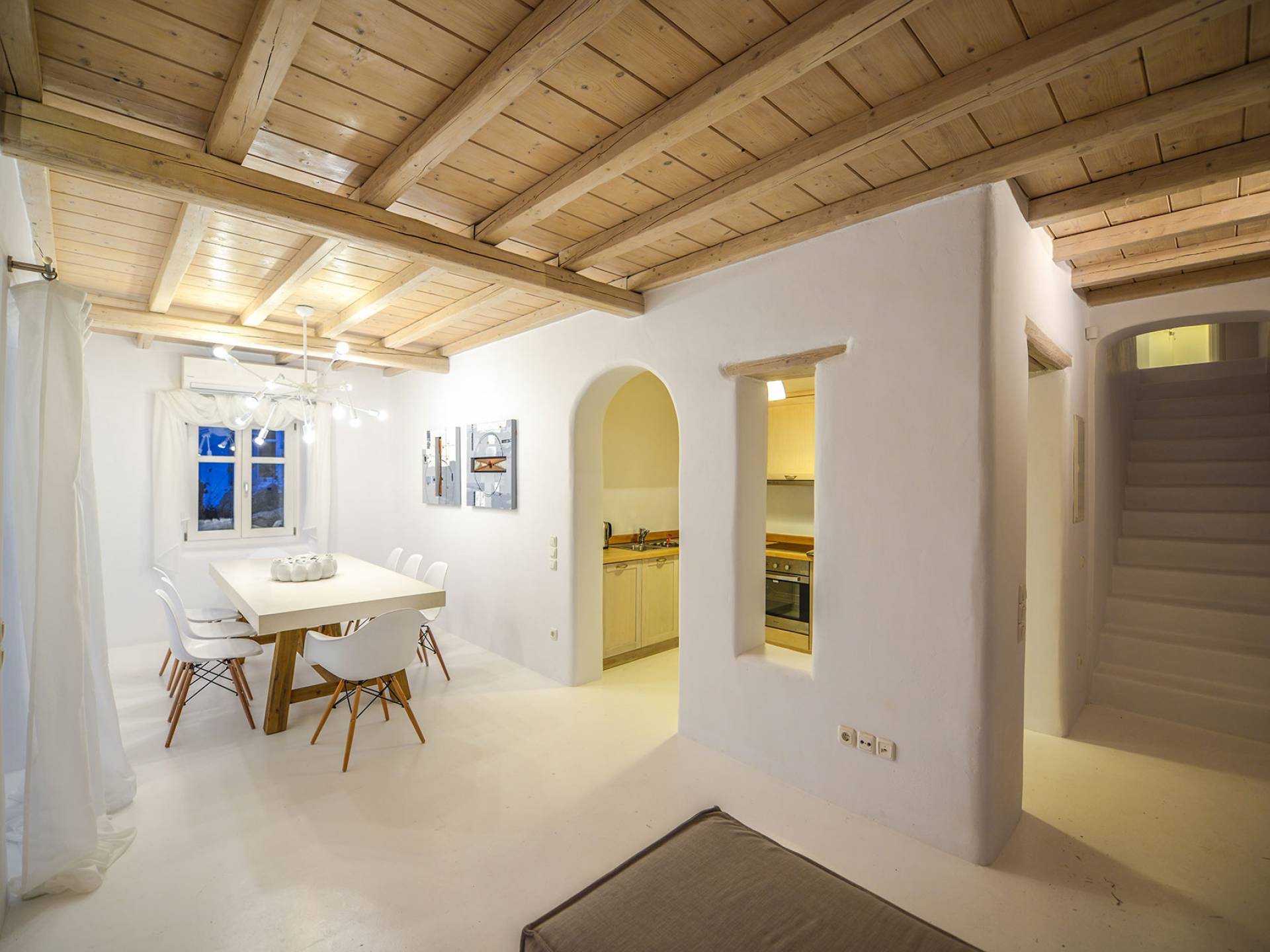 Stylishly contemporary interiors are well-matched with the stunning outside area, where the swimming pool stands as a point of reference, lined with trendy sun-chairs and a shaded dining area provides a cool spot from the heated sun at this amazing Villa in Ornos. We offer daily cleaning and twice a week change of linen, to all our villas in Mykonos. Dive right in – Villa Pearl Mykonos is only a 5-minute walk from a golden-sand beach (Agios Ioannis Beach). Located in Ornos Bay of Mykonos, the Cycladic-style Villa Pearl features a private pool and a sun terrace with panoramic views over the Aegean Sea. Free WiFi access is available throughout and free parking is possible on site. Combining modern and traditional elements, Villa Pearl is elegantly decorated with well-chosen furnishings, beamed ceilings, and white tones. It consists of 3 master bedrooms, a living and dining area, and a modern fully equipped kitchen.