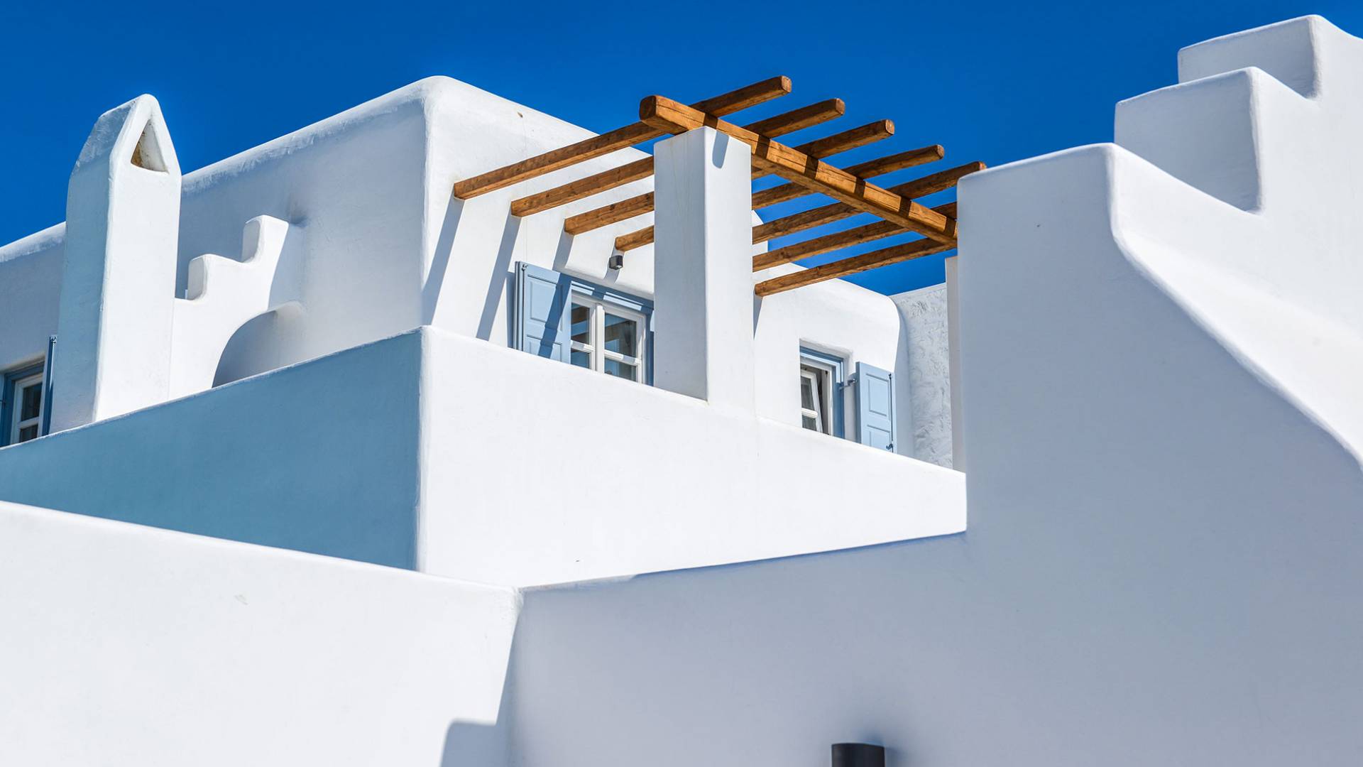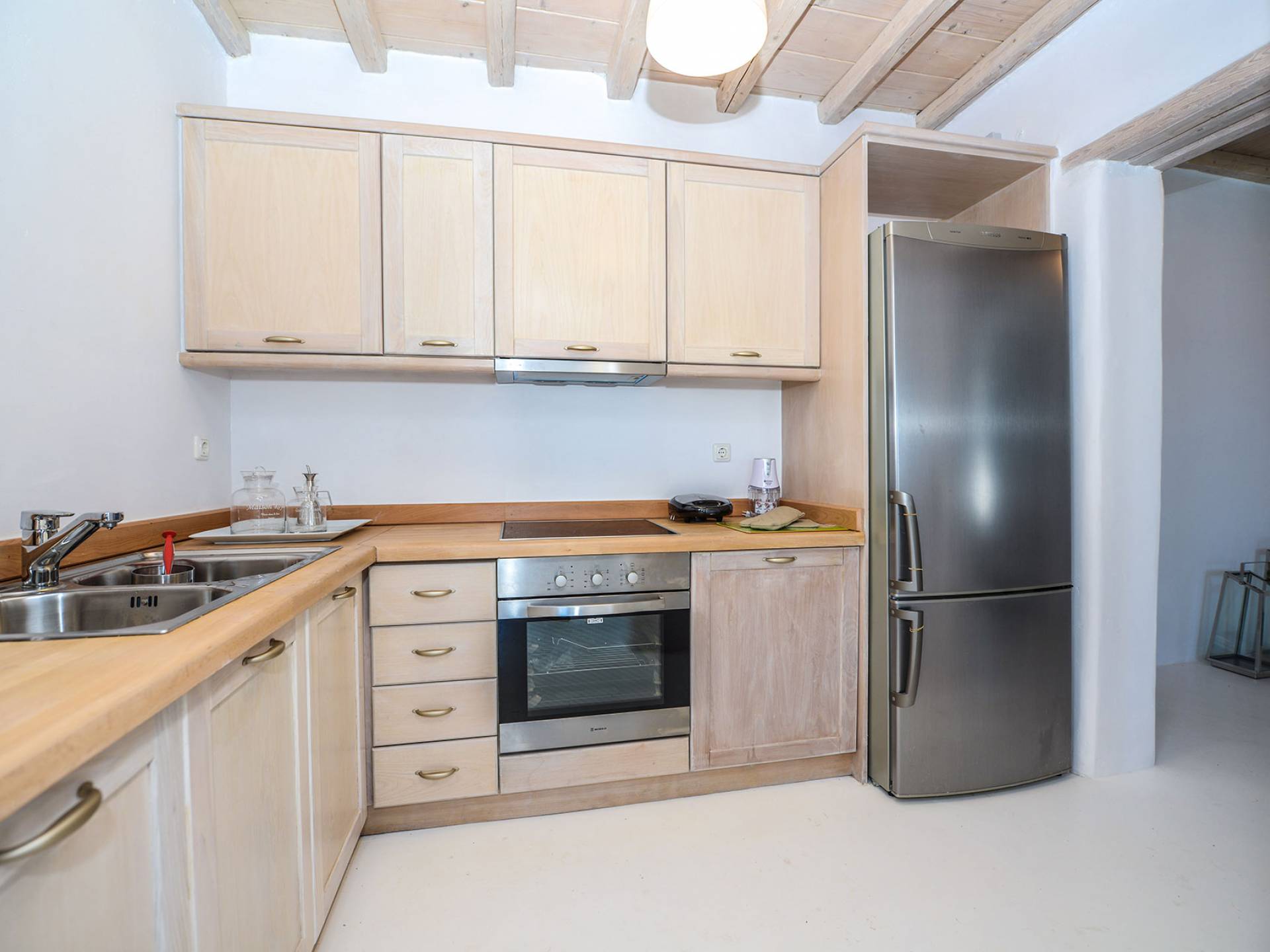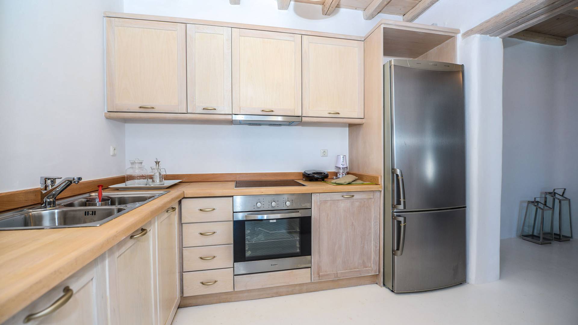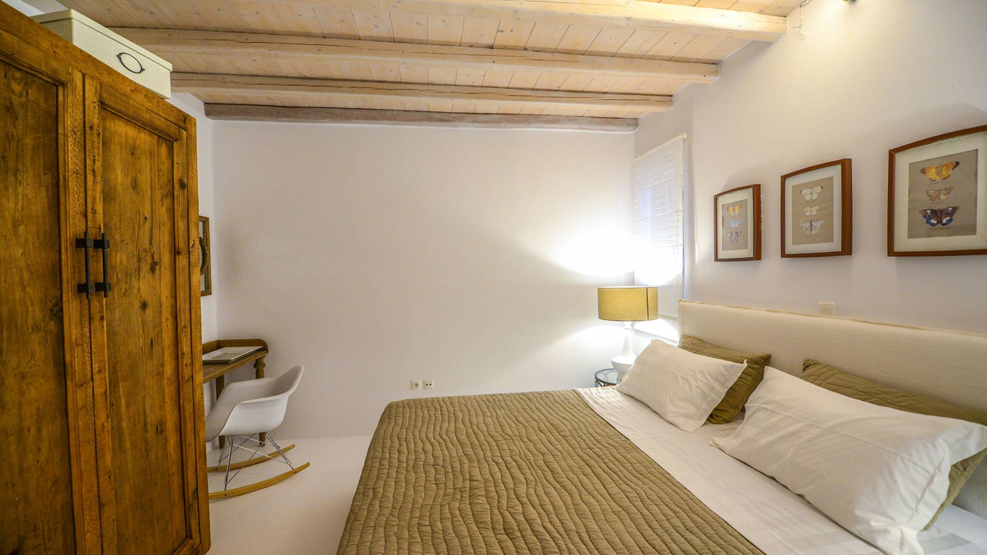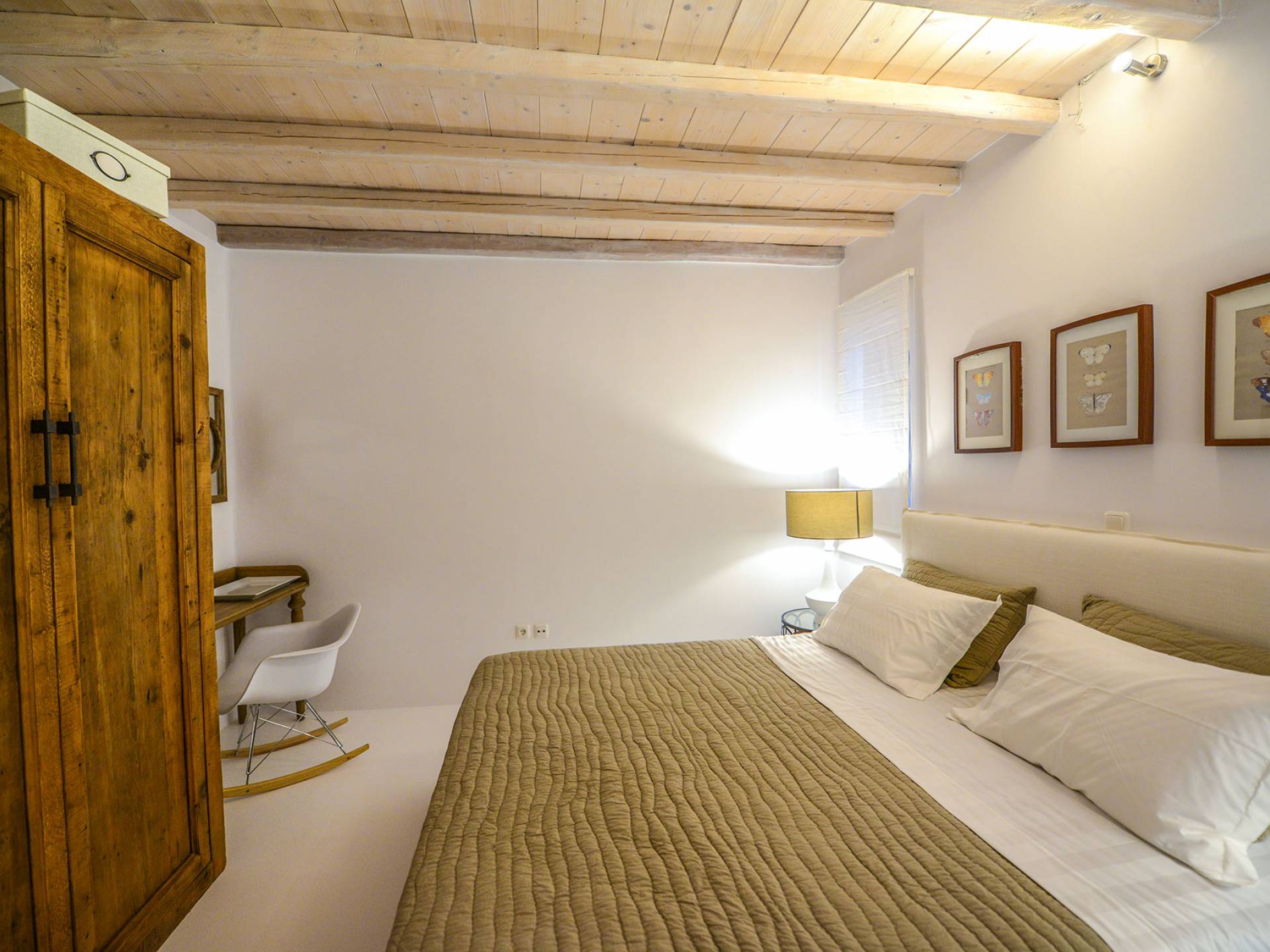 Stylishly contemporary interiors are well-matched with the stunning outside area, where the swimming pool stands as a point of reference, lined with trendy sun-chairs and a shaded dining area provides a cool spot from the heated sun at this amazing Villa in Ornos. We offer daily cleaning and twice a week change of linen, to all our villas in Mykonos. Dive right in – Villa Pearl Mykonos is only a 5-minute walk from a golden-sand beach (Agios Ioannis Beach). Located in Ornos Bay of Mykonos, the Cycladic-style Villa Pearl features a private pool and a sun terrace with panoramic views over the Aegean Sea. Free WiFi access is available throughout and free parking is possible on site. Combining modern and traditional elements, Villa Pearl is elegantly decorated with well-chosen furnishings, beamed ceilings, and white tones. It consists of 3 master bedrooms, a living and dining area, and a modern fully equipped kitchen.