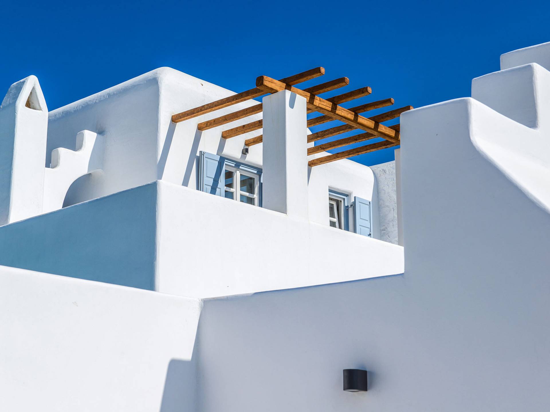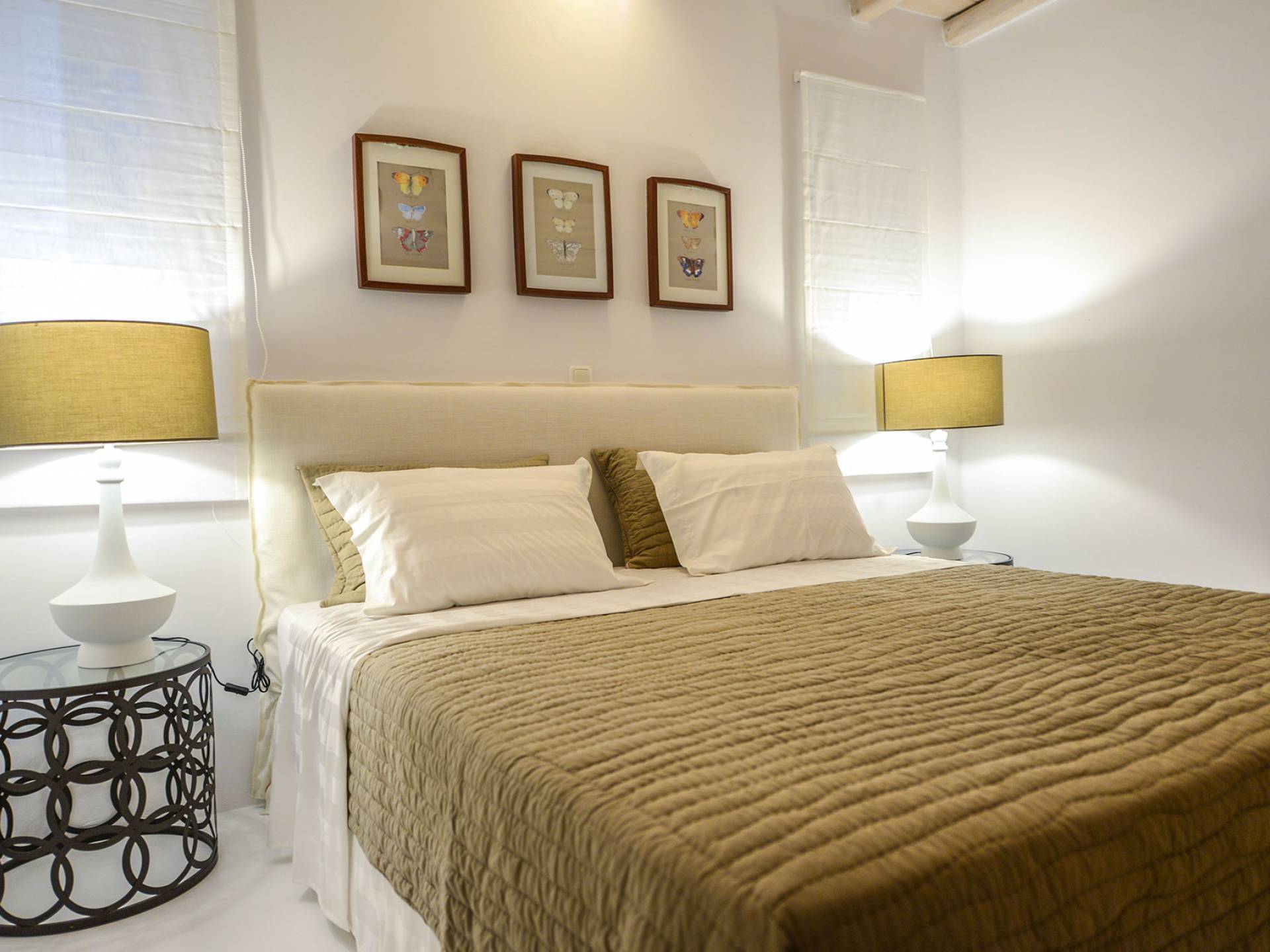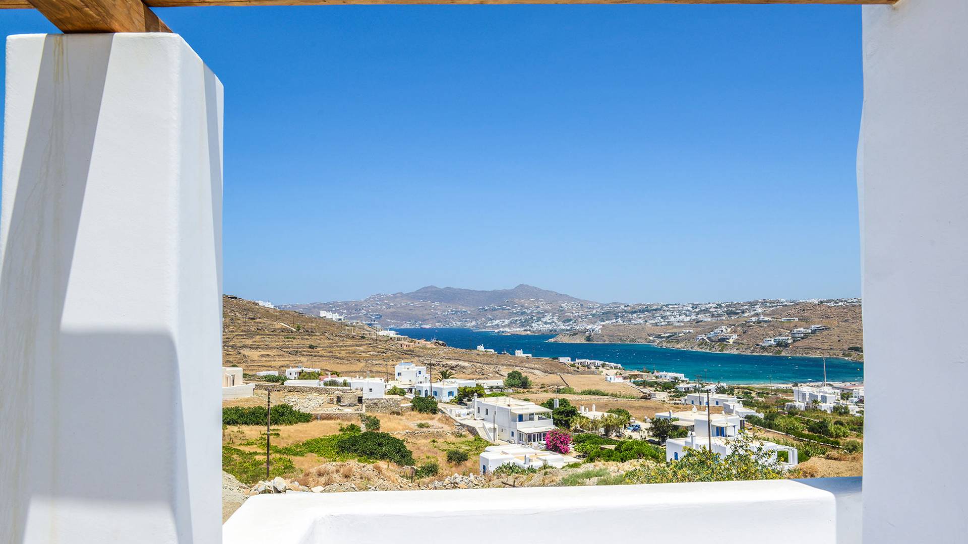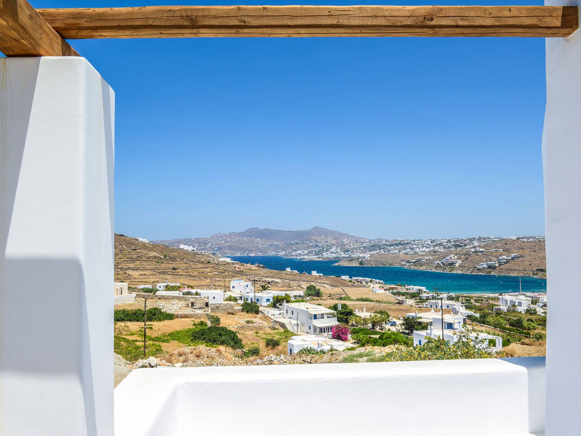 Located ideally between Ornos and St. John, with views of Mykonos Town windmills, the three-bedroom Villa Pearl Mykonos is just a 5-min driving distance perspectively, from both beaches. An open plan fully equipped kitchen, a living and dining room take the entrance level, whereas two master bedrooms with en-suite bathrooms along with an extra bedroom with twin beds are found in the upper floor level.
