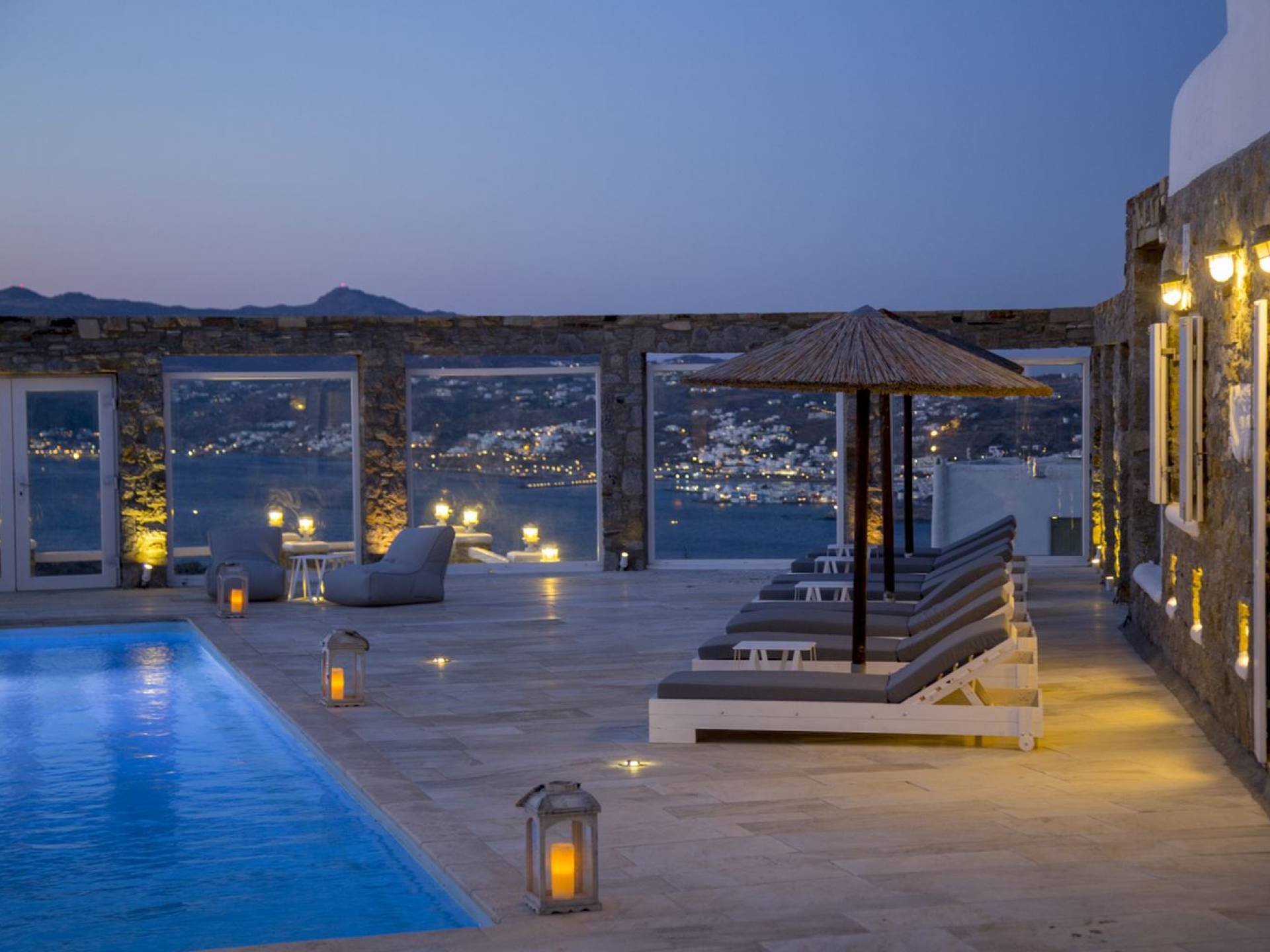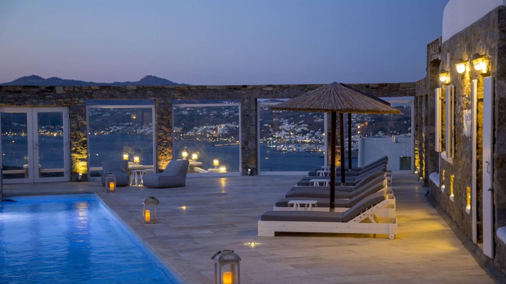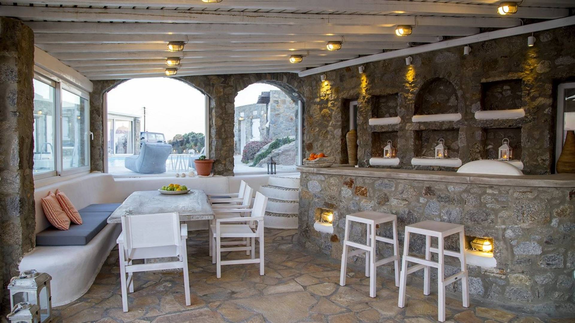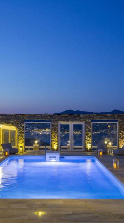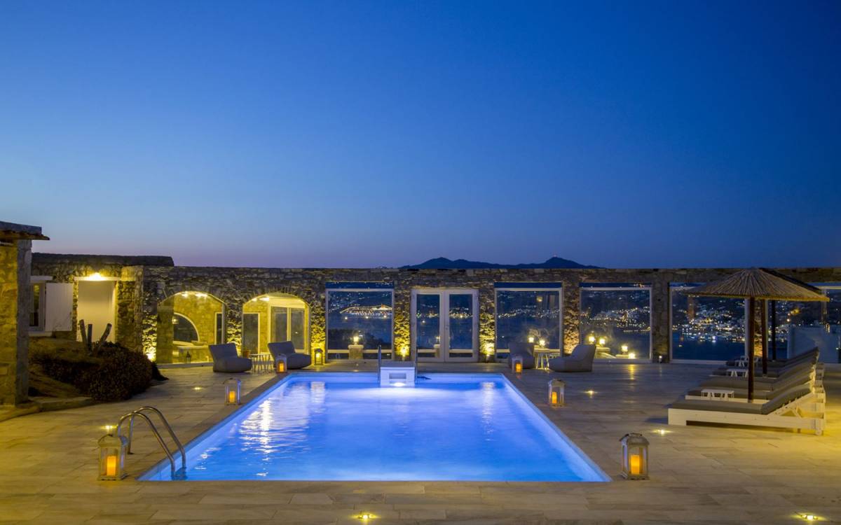 Villa Petrolefko offers a fully equipped kitchen & large living room with unique pieces of Cycladic art. Also, 4 bathrooms traditionally built with local materials & 2 WC. Wide terraces surround the house, overlooking magnificent views of Chora, Mykonos town & the bay area. Breathtaking beauty, elegant decoration & well-designed spaces position Ornos villa as the perfect option for your holidays in Mykonos! Wide terraces surround the house, overlooking magnificent views of Chora, Mykonos town & the bay area. Breathtaking beauty, elegant decoration & well-designed spaces position Ornos villa as the perfect option for your holidays in the “island of the winds”!