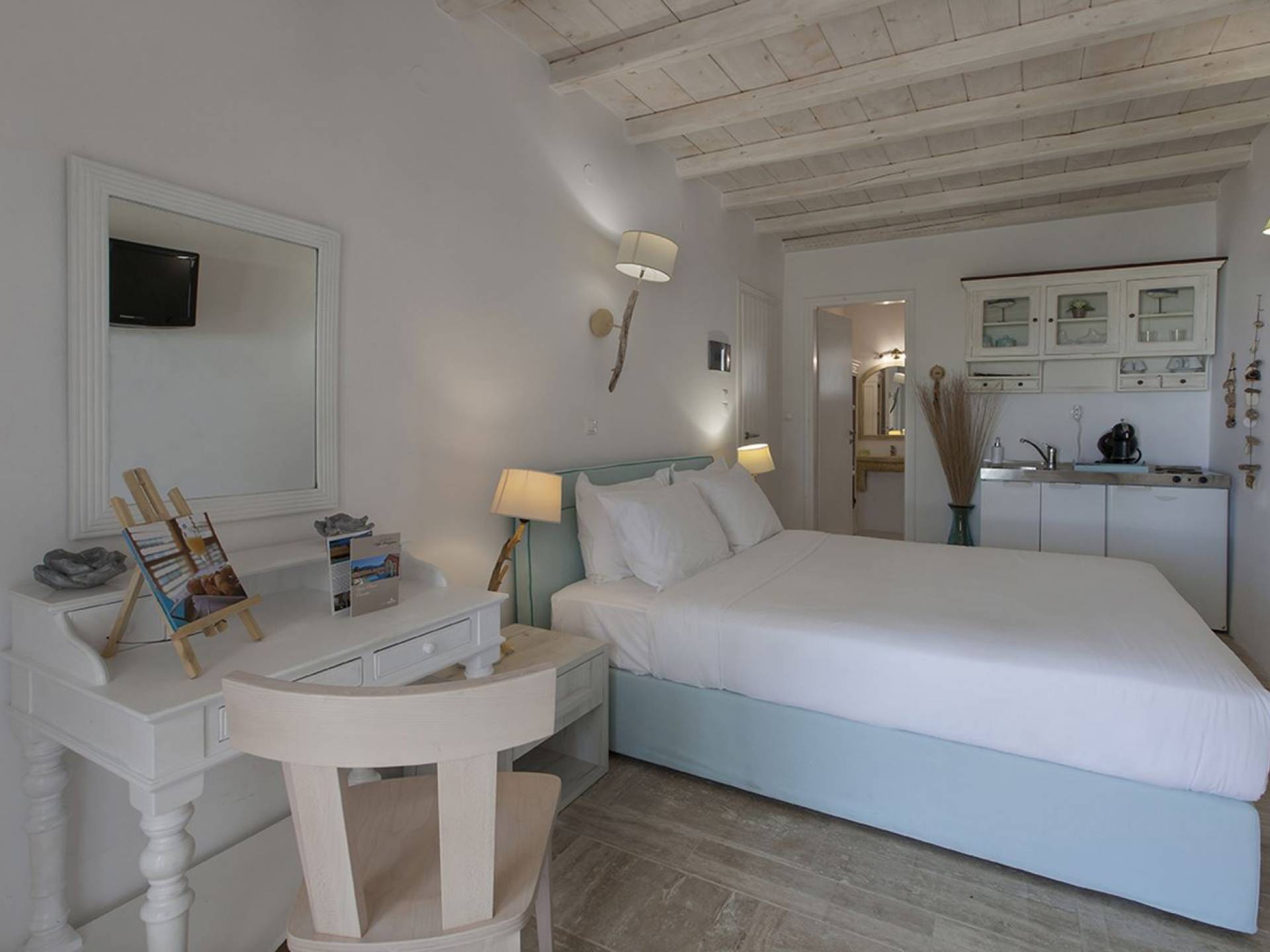 Ornos beach Mykonos is located 2.5 km close to Chora Mykonos and this makes it the closest beach to the capital, with fine sand and sunbeds/umbrellas for rent; it is a really beautiful beach but, unfortunately, it is often overcrowded due to its proximity to the Town. A diving school, as well as schools for sea-skiing and windsurfing, are found on the beach for lovers of water sports. It is quite an active beach. On the shore of the bay, you will find a big hotel complex which includes a variety of restaurants and bars. Ornos is reachable by local bus, leaving from the capital. Its location gives it a privileged view of the amphitheatrically whitewashed houses built on the hill.