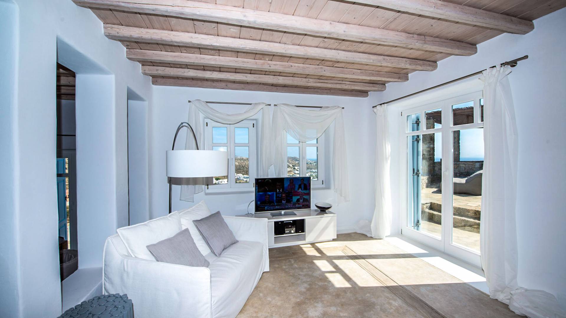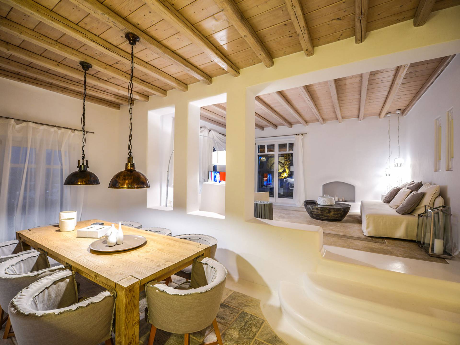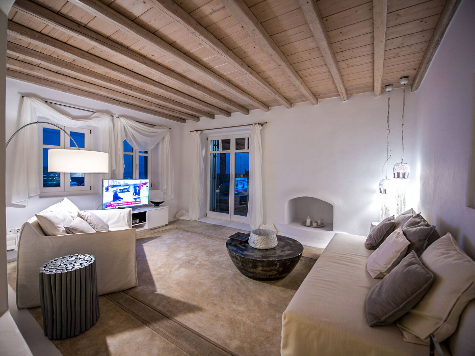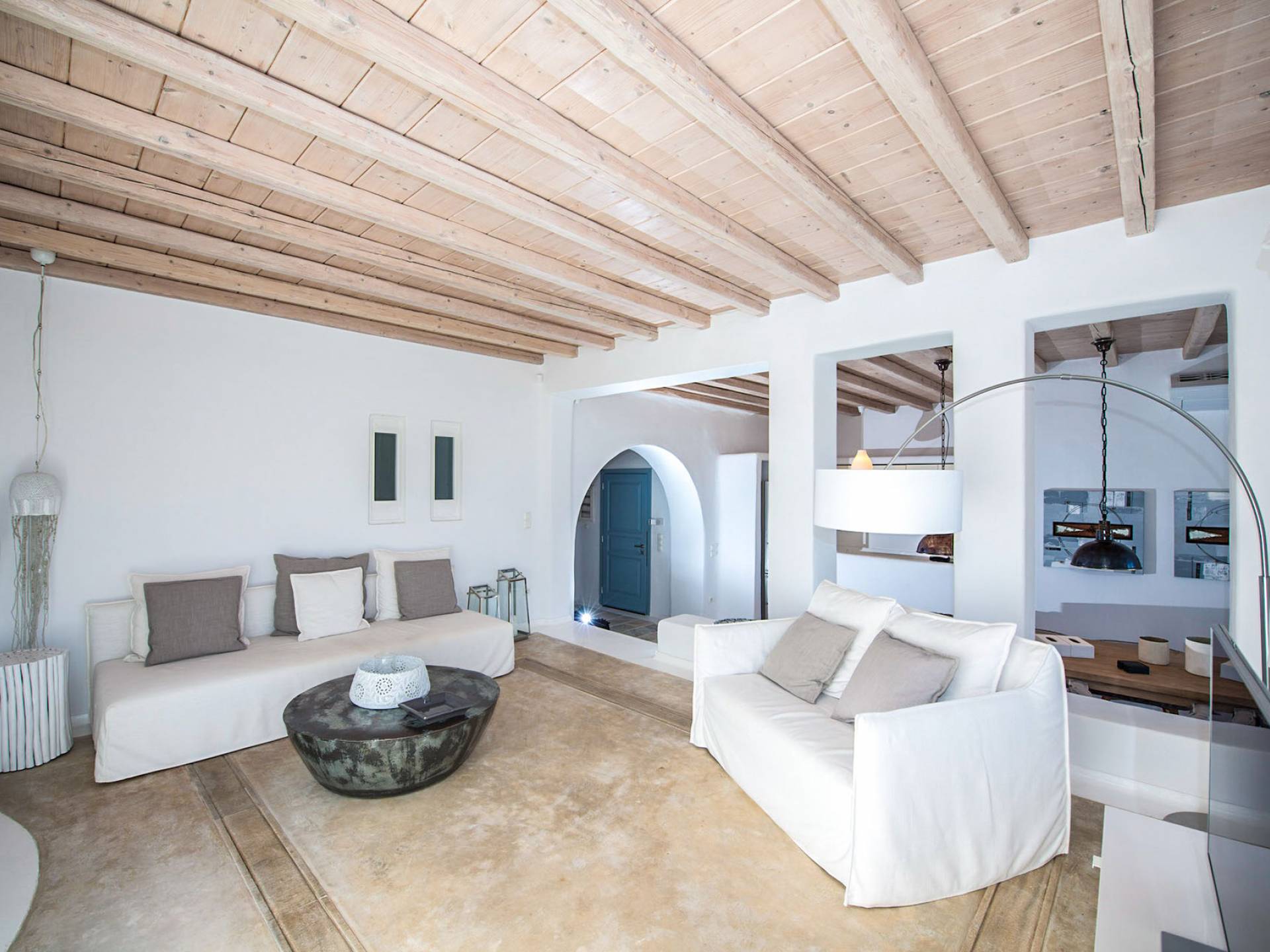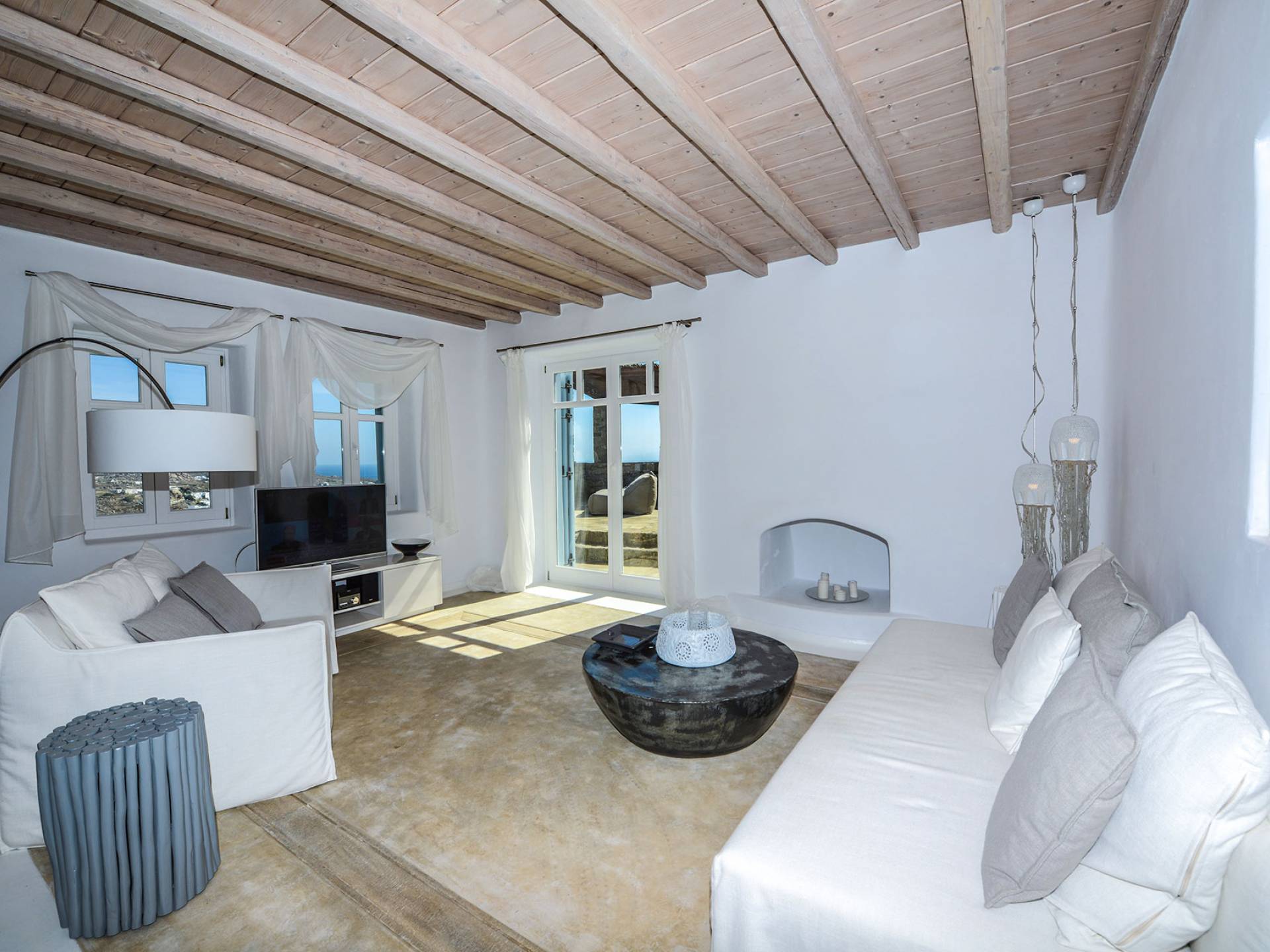 The spacious living room (with a fireplace) and dining room adjacent to the kitchen, are equipped with all modern appliances. Azurite Villa Mykonos features full air conditioning, WIFI, flat-screen tv, and an alarm system. The villa was built for true outdoor living and that can be easily acknowledged once you lay your eyes on the expansive infinity-edge pool and the amazing outdoor dining table that offers impeccable views of Psarou Beach. The picturesque views combined with Cycladic aesthetics and contemporary interiors make Villa Azurite a perfect getaway on Mykonos island. We offer daily cleaning and twice a week change of linen, to all our villas in Mykonos.
