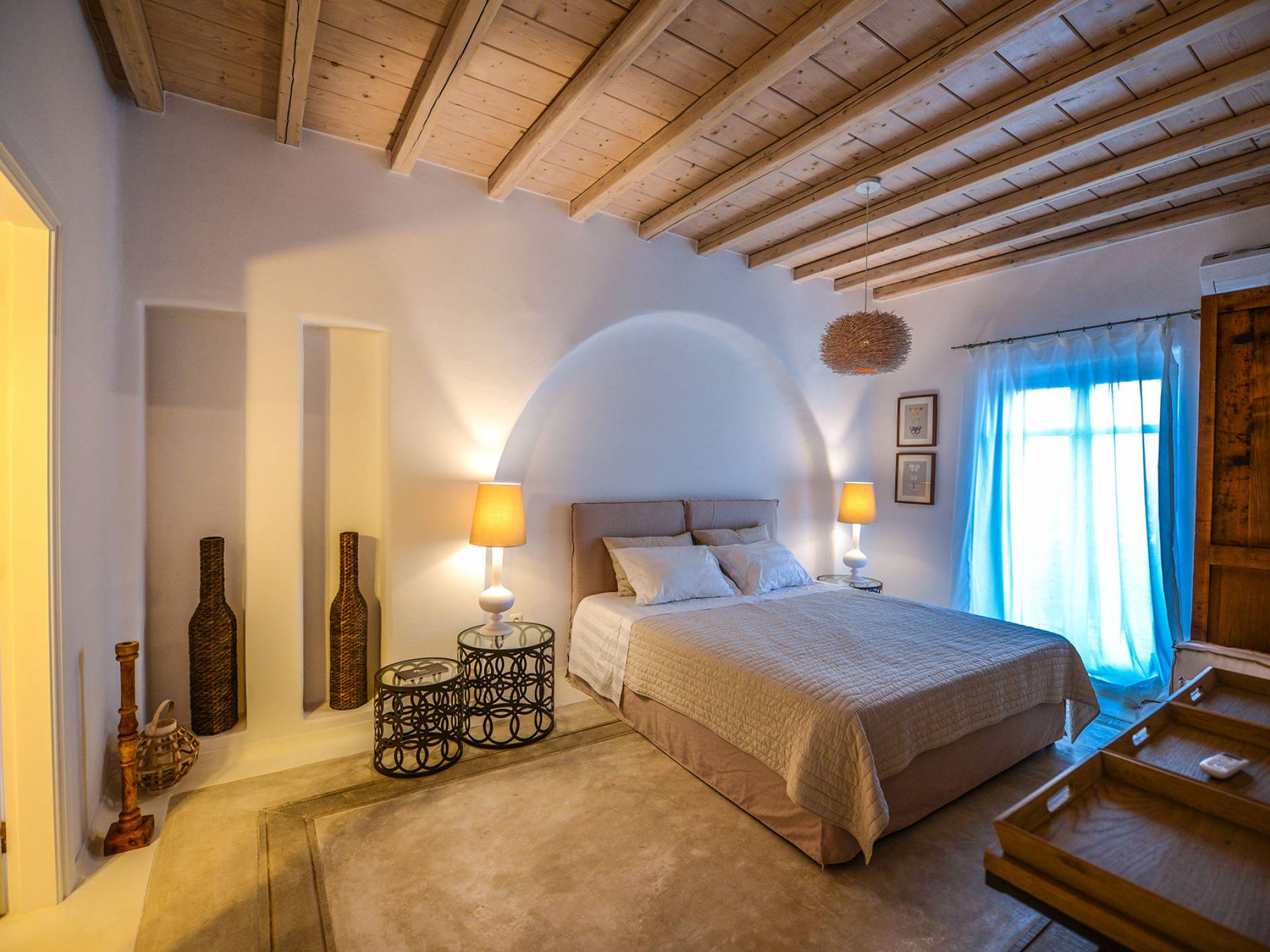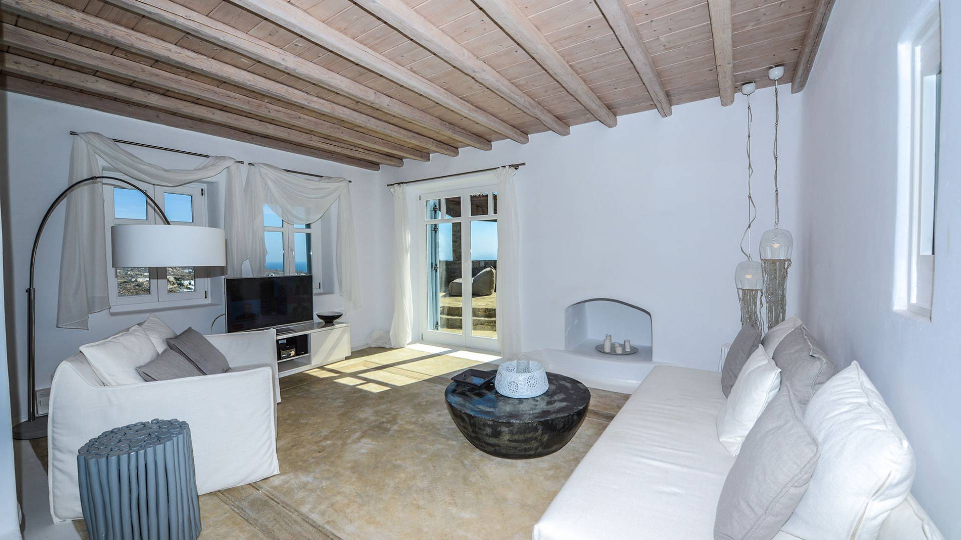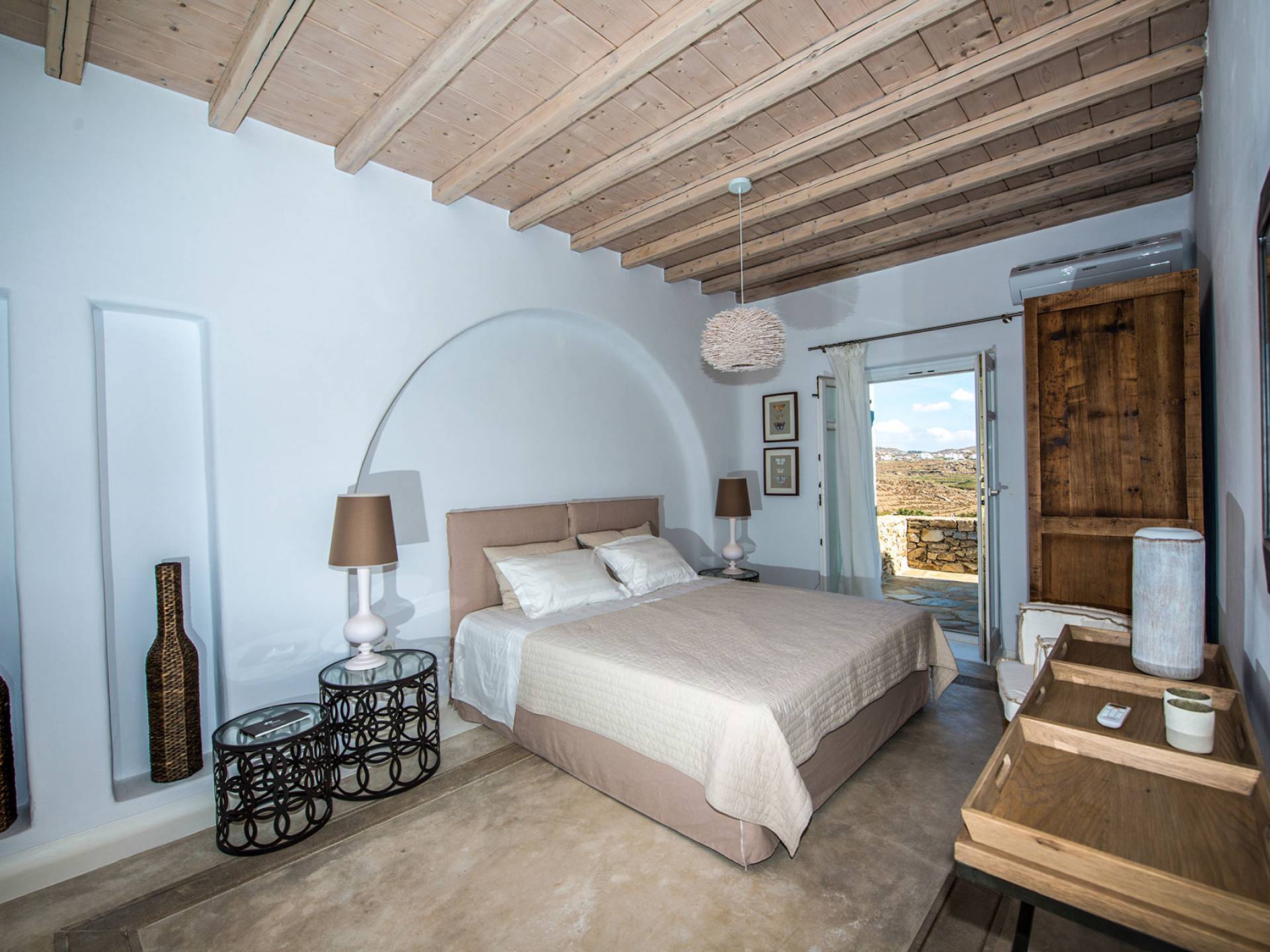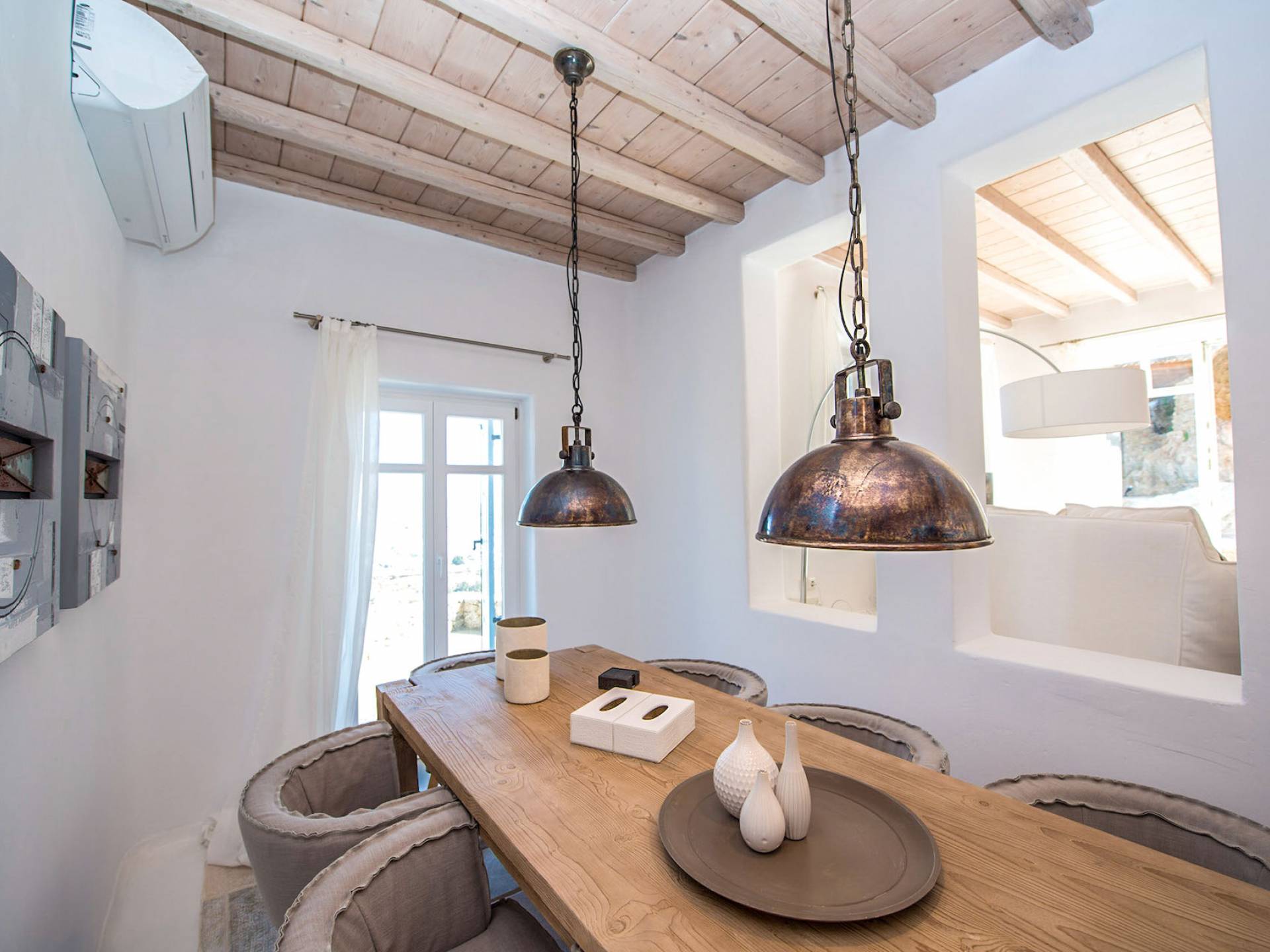 The spacious living room (with a fireplace) and dining room adjacent to the kitchen, are equipped with all modern appliances. Azurite Villa Mykonos features full air conditioning, WIFI, flat-screen tv, and an alarm system. The villa was built for true outdoor living and that can be easily acknowledged once you lay your eyes on the expansive infinity-edge pool and the amazing outdoor dining table that offers impeccable views of Psarou Beach. The picturesque views combined with Cycladic aesthetics and contemporary interiors make Villa Azurite a perfect getaway on Mykonos island. We offer daily cleaning and twice a week change of linen, to all our villas in Mykonos.