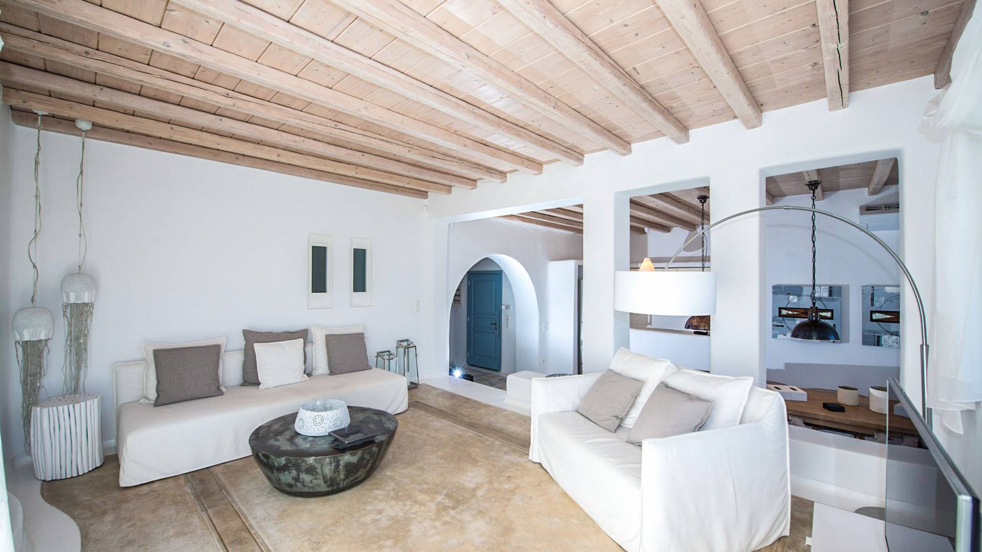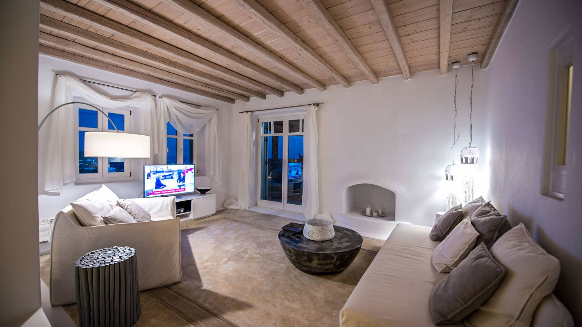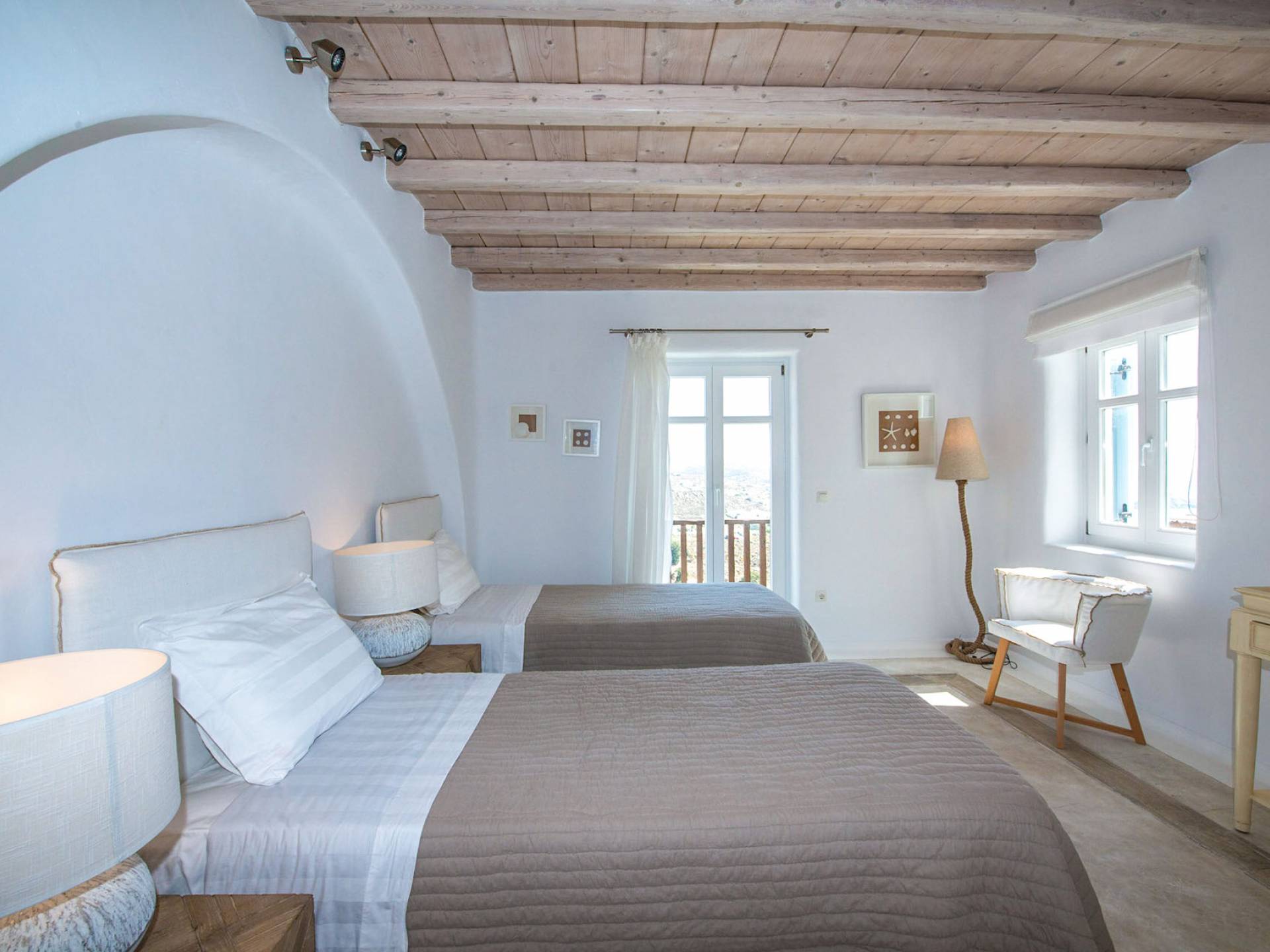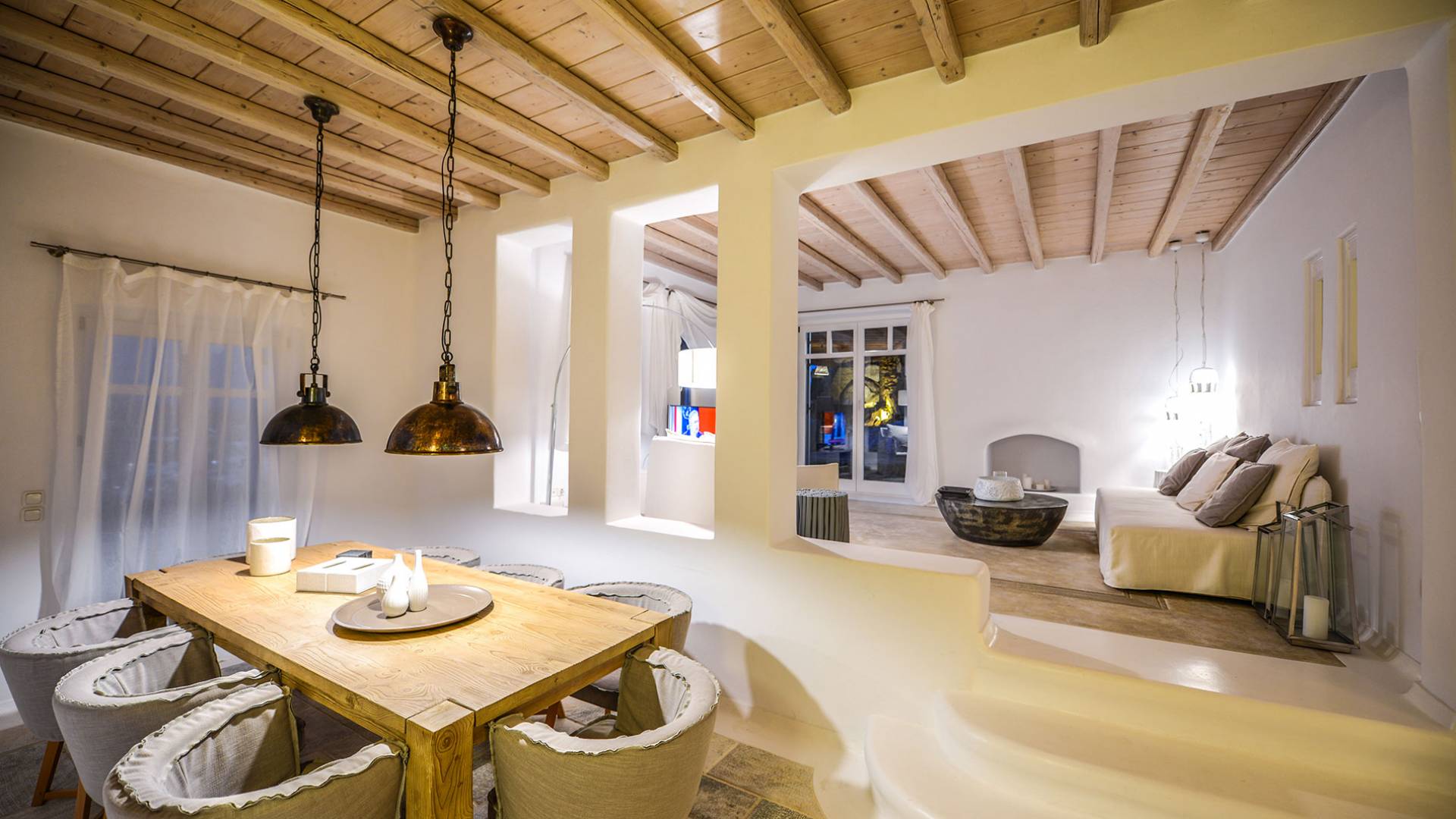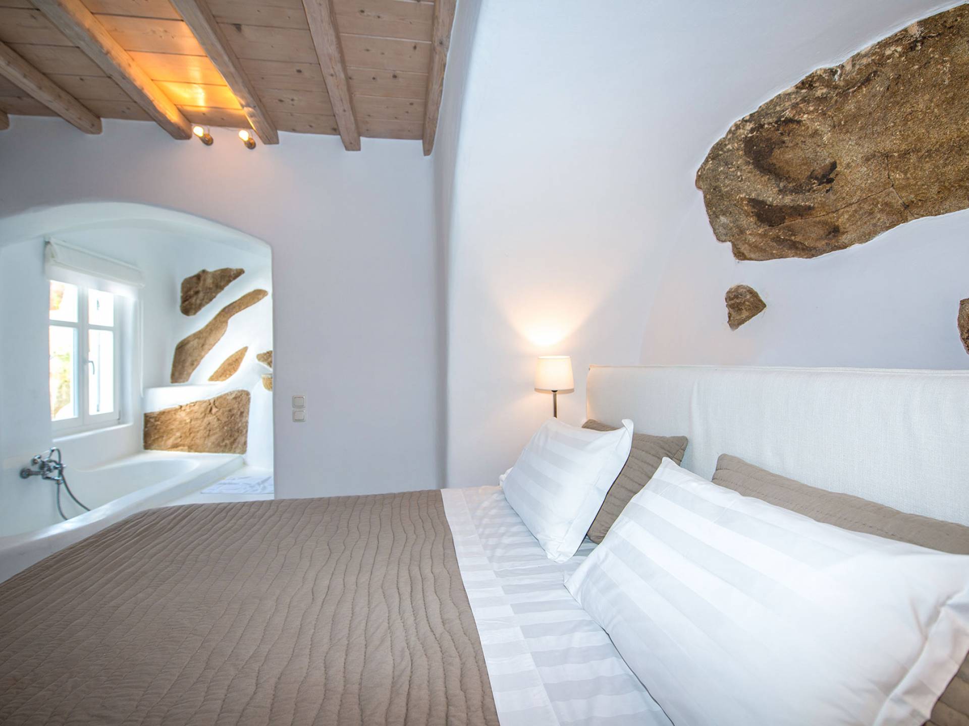 The spacious living room (with a fireplace) and dining room adjacent to the kitchen, are equipped with all modern appliances. Azurite Villa Mykonos features full air conditioning, WIFI, flat-screen tv, and an alarm system. The villa was built for true outdoor living and that can be easily acknowledged once you lay your eyes on the expansive infinity-edge pool and the amazing outdoor dining table that offers impeccable views of Psarou Beach. The picturesque views combined with Cycladic aesthetics and contemporary interiors make Villa Azurite a perfect getaway on Mykonos island. We offer daily cleaning and twice a week change of linen, to all our villas in Mykonos.