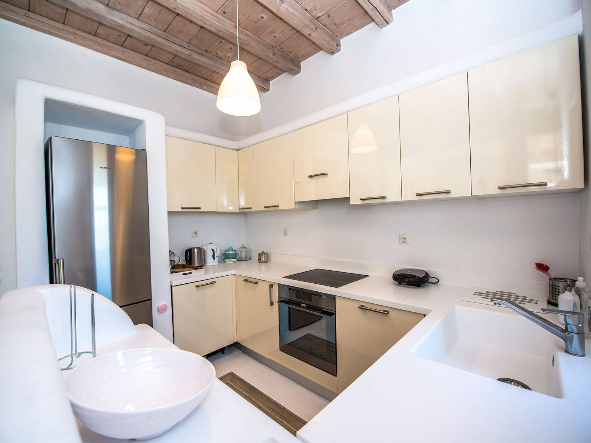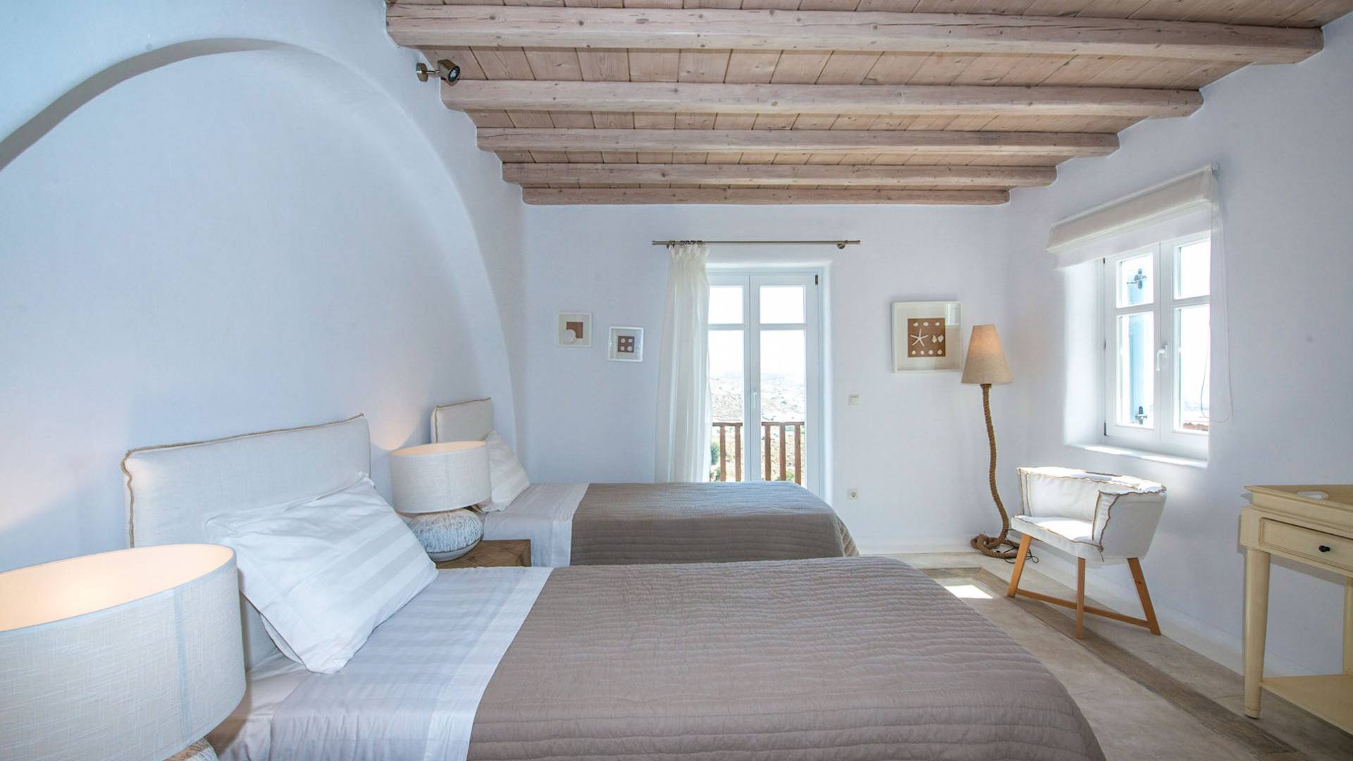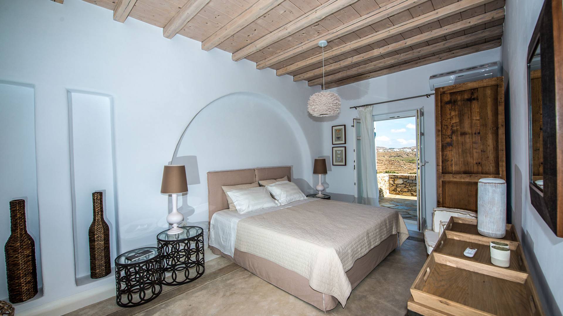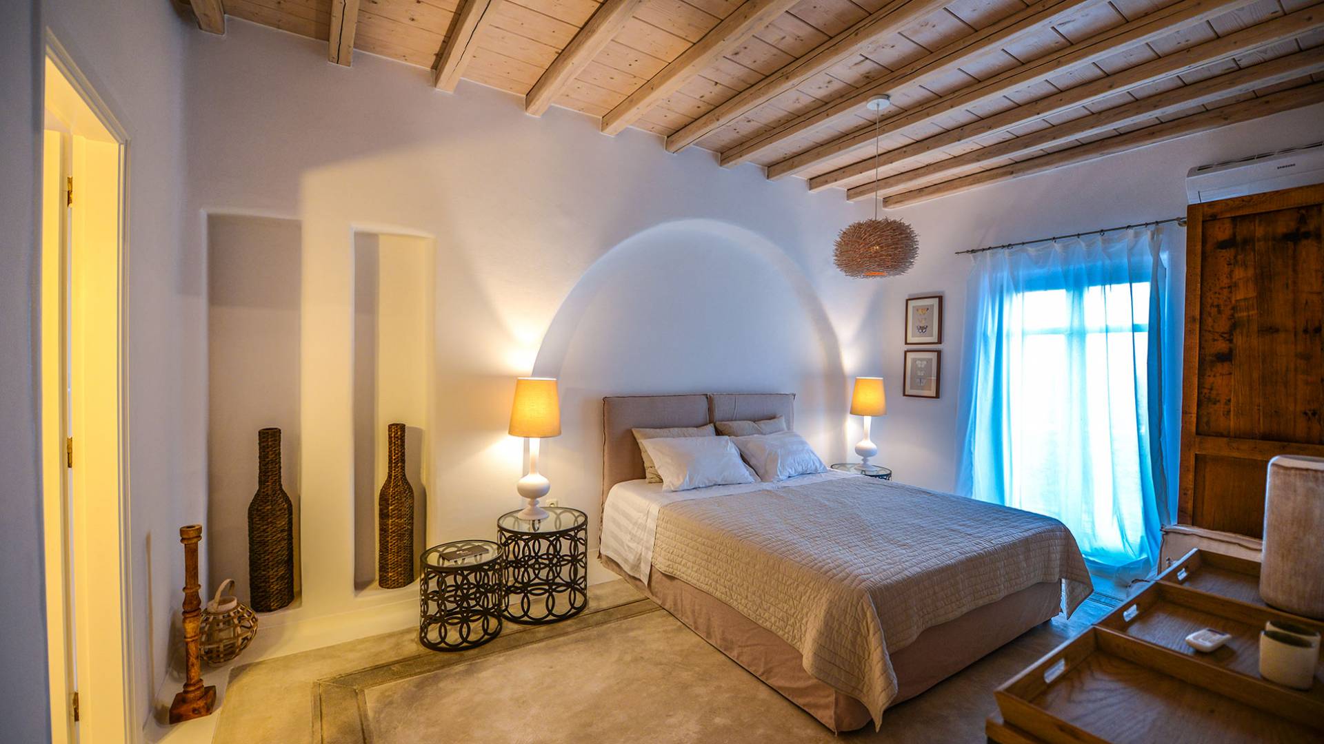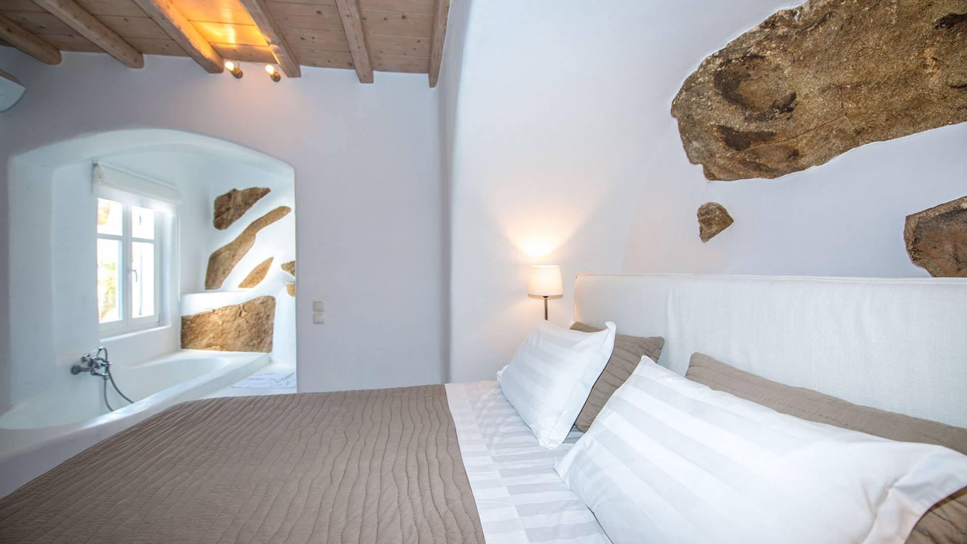 The spacious living room (with a fireplace) and dining room adjacent to the kitchen, are equipped with all modern appliances. Azurite Villa Mykonos features full air conditioning, WIFI, flat-screen tv, and an alarm system. The villa was built for true outdoor living and that can be easily acknowledged once you lay your eyes on the expansive infinity-edge pool and the amazing outdoor dining table that offers impeccable views of Psarou Beach. The picturesque views combined with Cycladic aesthetics and contemporary interiors make Villa Azurite a perfect getaway on Mykonos island. We offer daily cleaning and twice a week change of linen, to all our villas in Mykonos.
