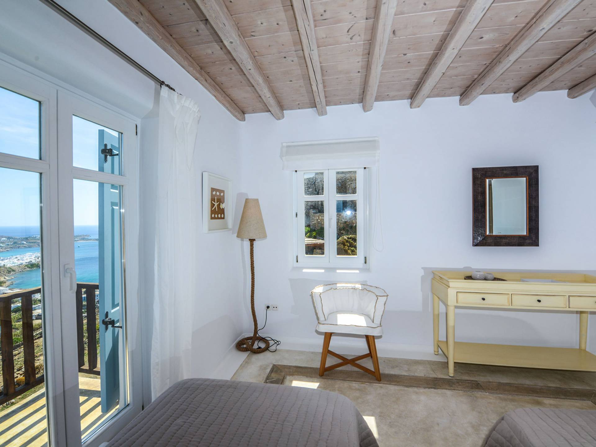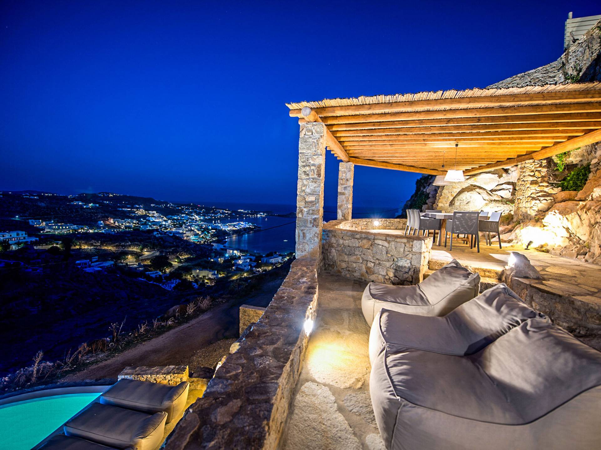 The 3 bedroom Azurite Villa Mykonos is located in the Agios Lazaros area of Mykonos island overlooking the renowned Psarou Bay. The Villa in Psarou is built on a plot of about 3,5 acres, in an amphitheater location, close to its sister Ammonite Villa in Psarou also, occupying a total area of approximately 200 sq.m on two levels, comprising of an open space living room, dining room, fully equipped kitchen, 3 master bedrooms, 1 WC for guests and 1 exterior studio ideal for service staff or guests.