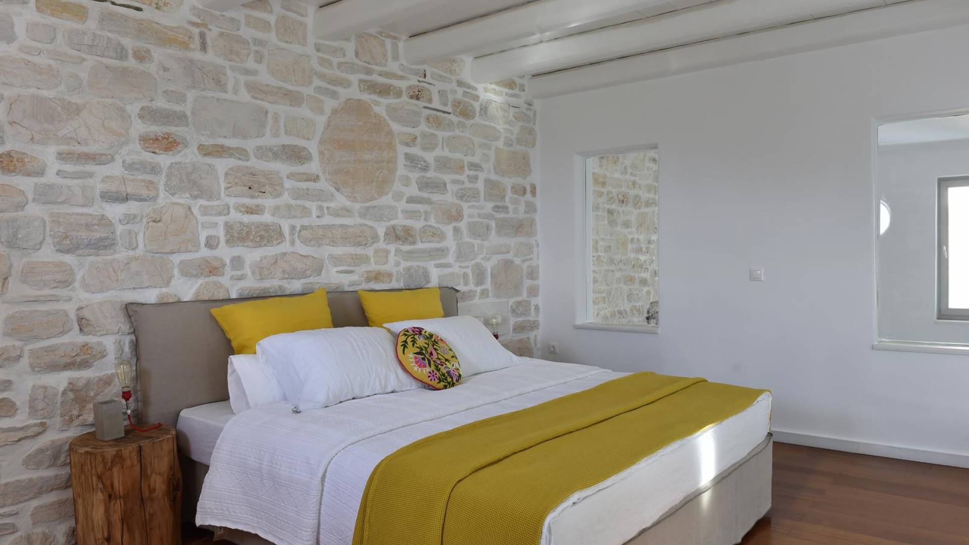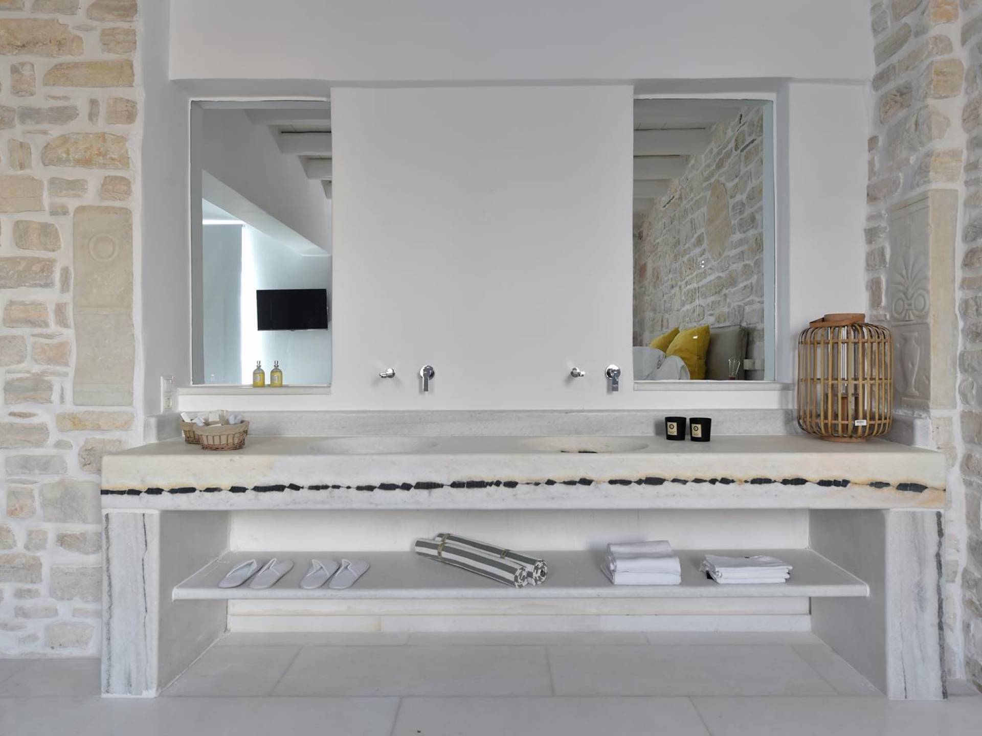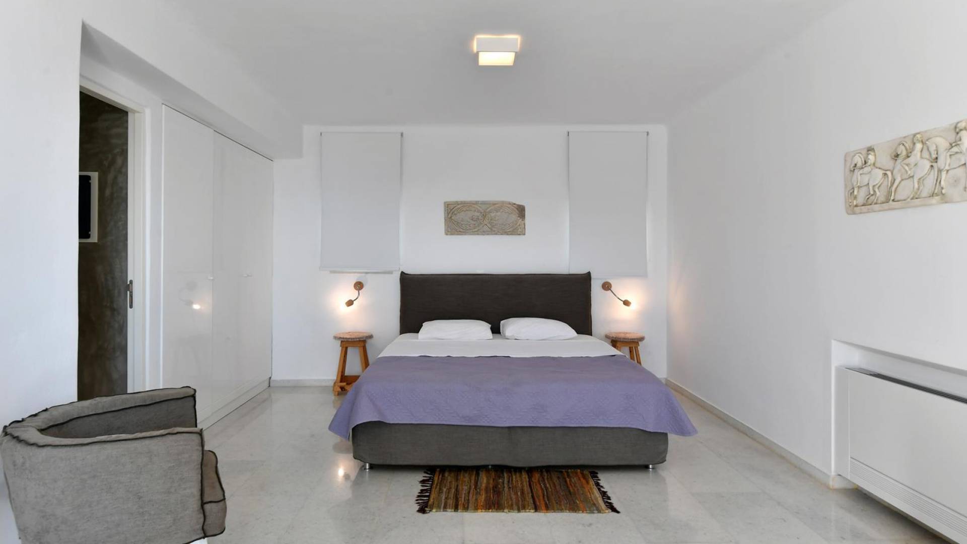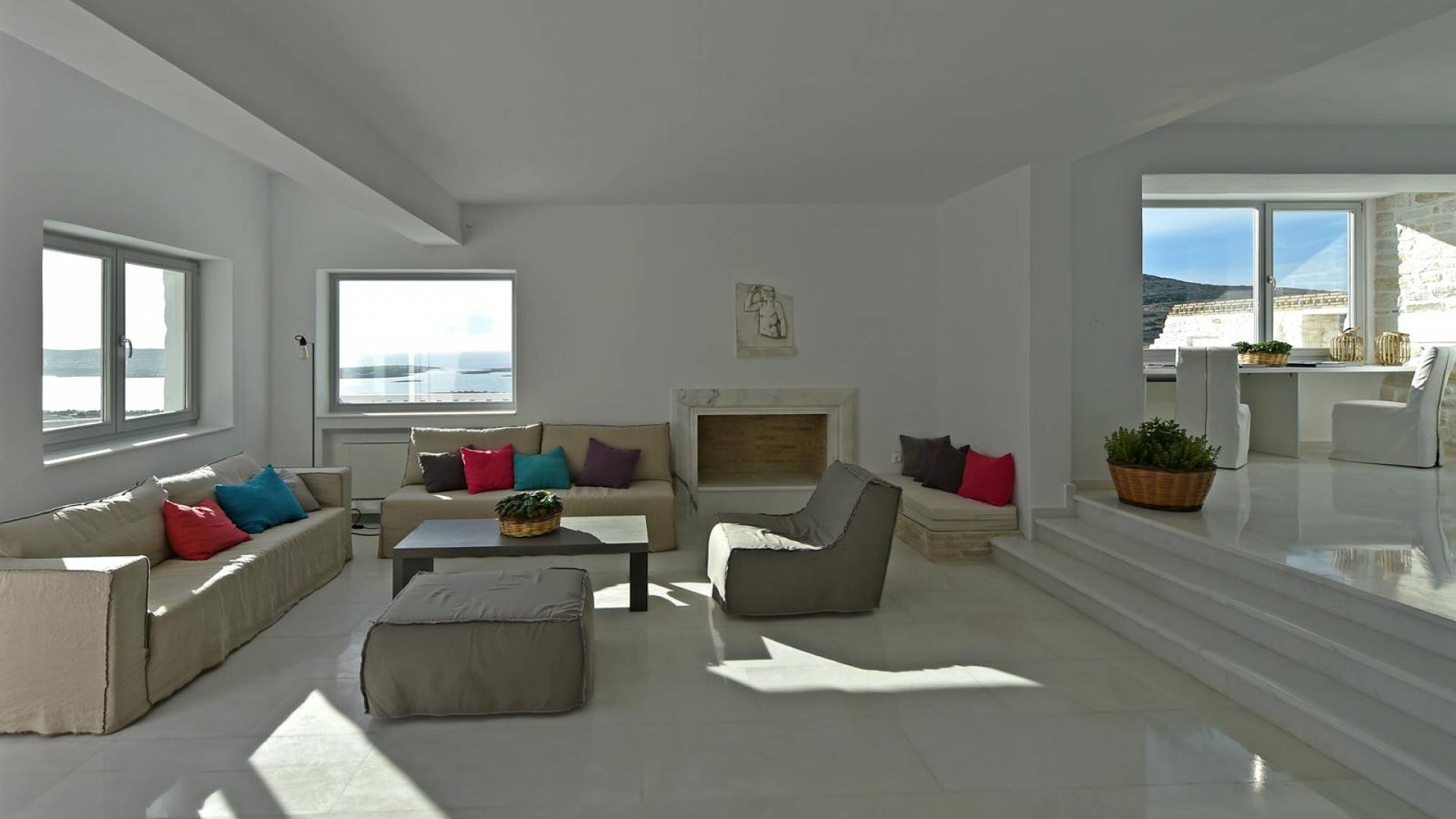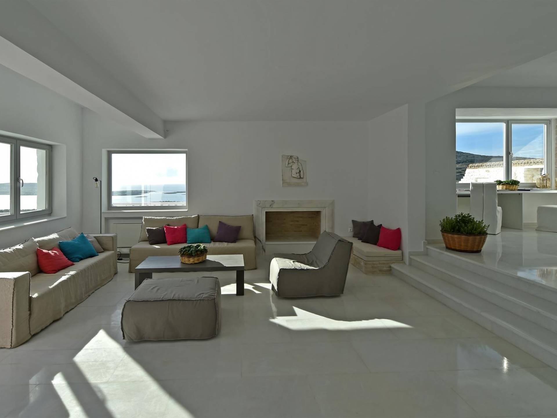 Enveloped by the aura of quiet and calm and the sounds of nature, Villa Aethra in Paros, in an enchanting area, boasts an unrivaled array of luxury facilities in Paros ensuring a pleasurable holiday experience for their elite guests. Main House Ground Level: Entrance hall, living room with direct access to terrace and pool area (TV, DVD, sound system, fireplace, dining area, a fully equipped kitchen, and a guest WC). Double room with en suite bathroom (shower, double bed, A/C, TV, safe box, sea view). Main House Upper Level: Master bedroom with en suite bathroom and sitting area (bathtub, shower cabin, toilet room, double vanity, king size bed, A/C, TV, safe box, private veranda with sea and Antiparos view.